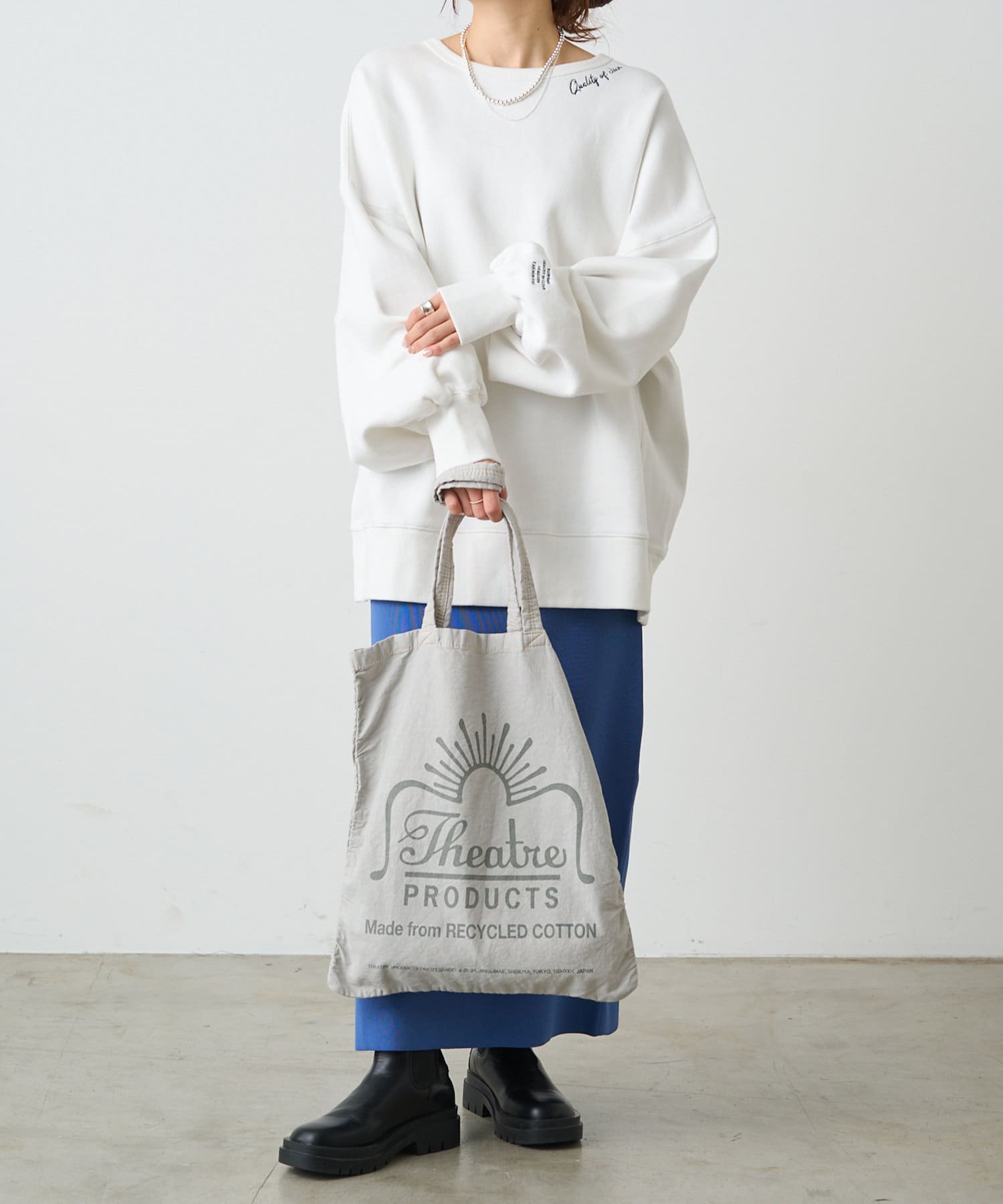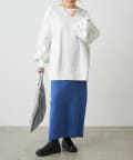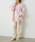 ビッグシルエットとドロップショルダーが華奢見えし、女性らしさをプラス。