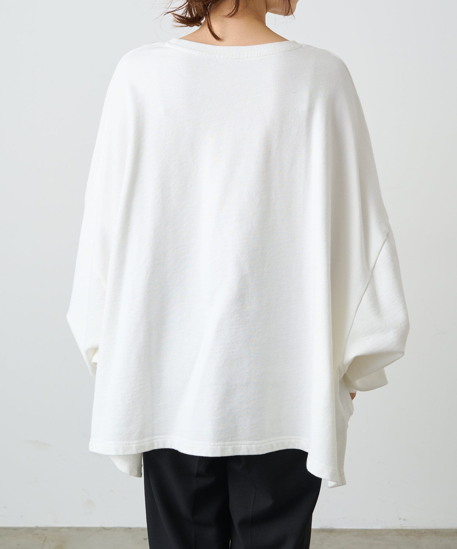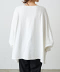 肩線を落としたドロップショルダーとアームホールにゆとりをたっぷり持たせたポンチョのようなデザインが、着用した時にニュアンスのある立体感を作り出し、一枚でサラッと着ても映えるアイテム。