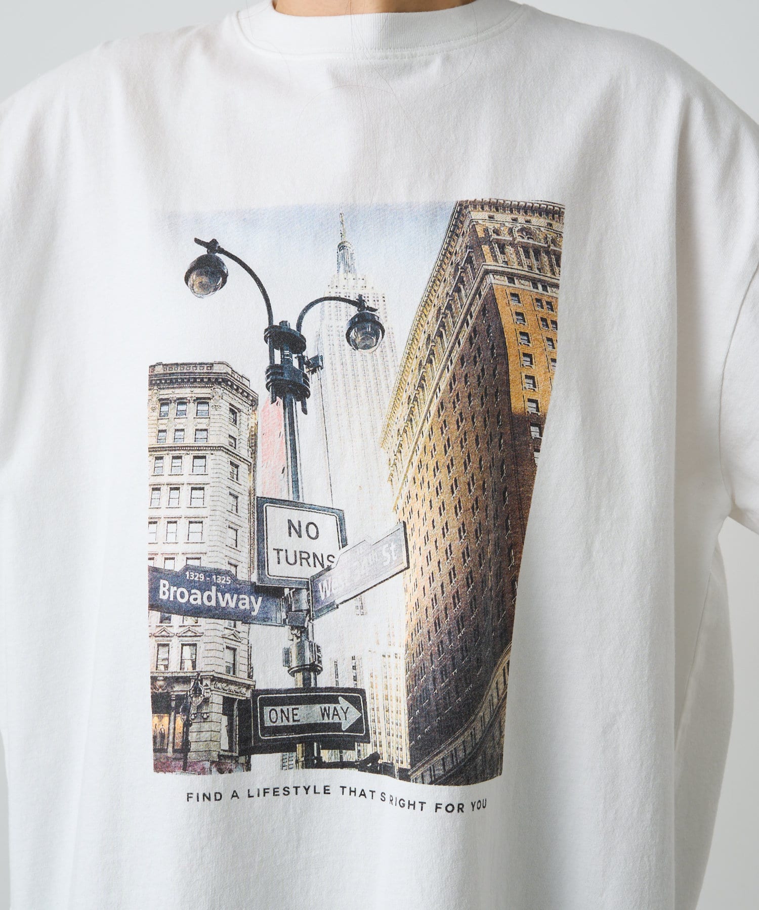 フロント部分のNEW YORKの街並みを連想させるフォトプリントが引き立つカットソー。