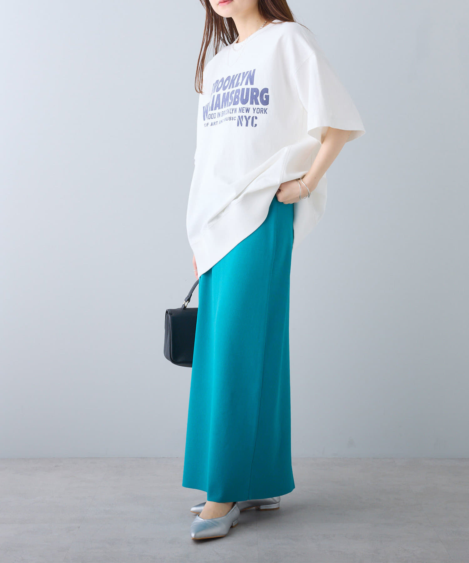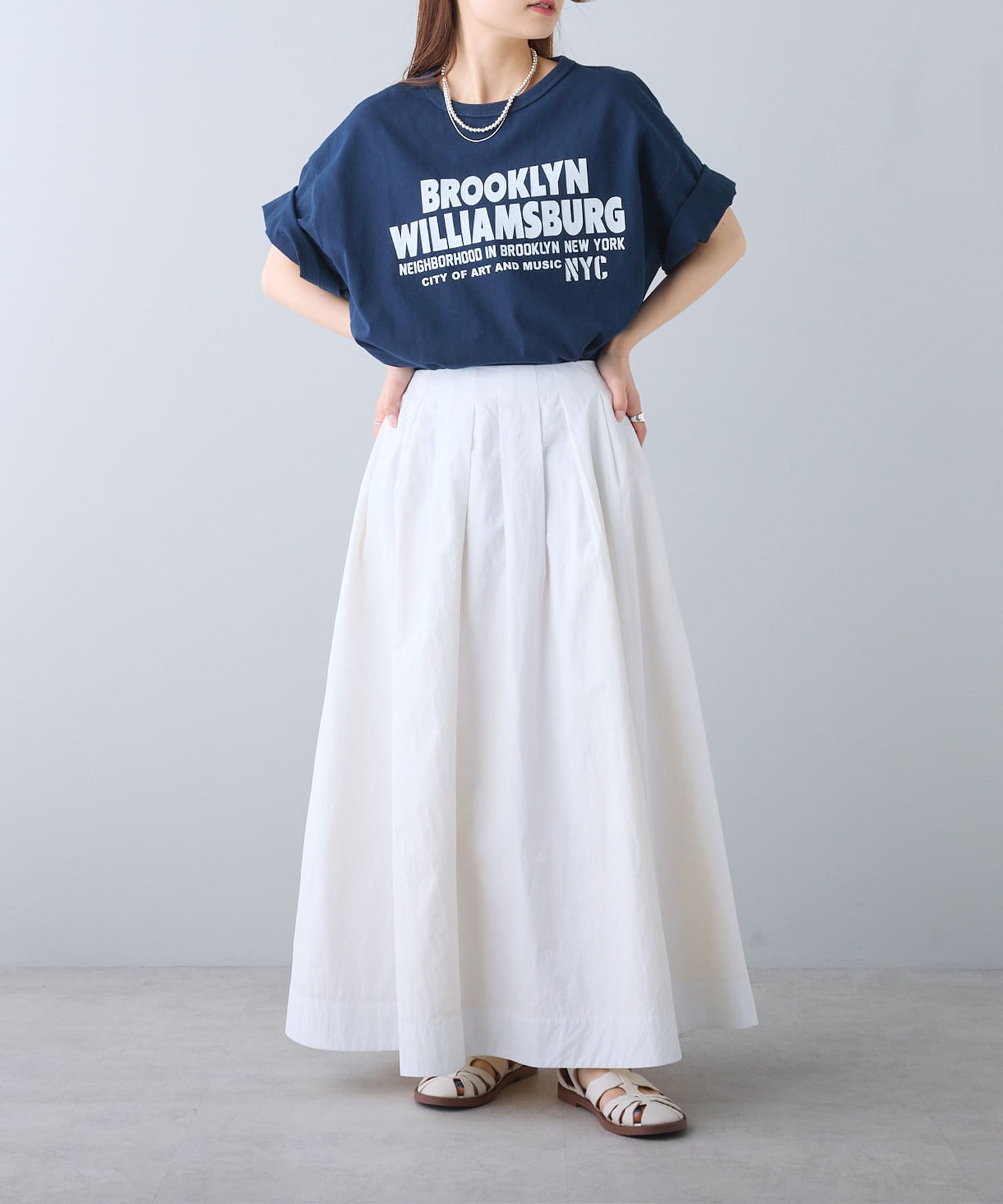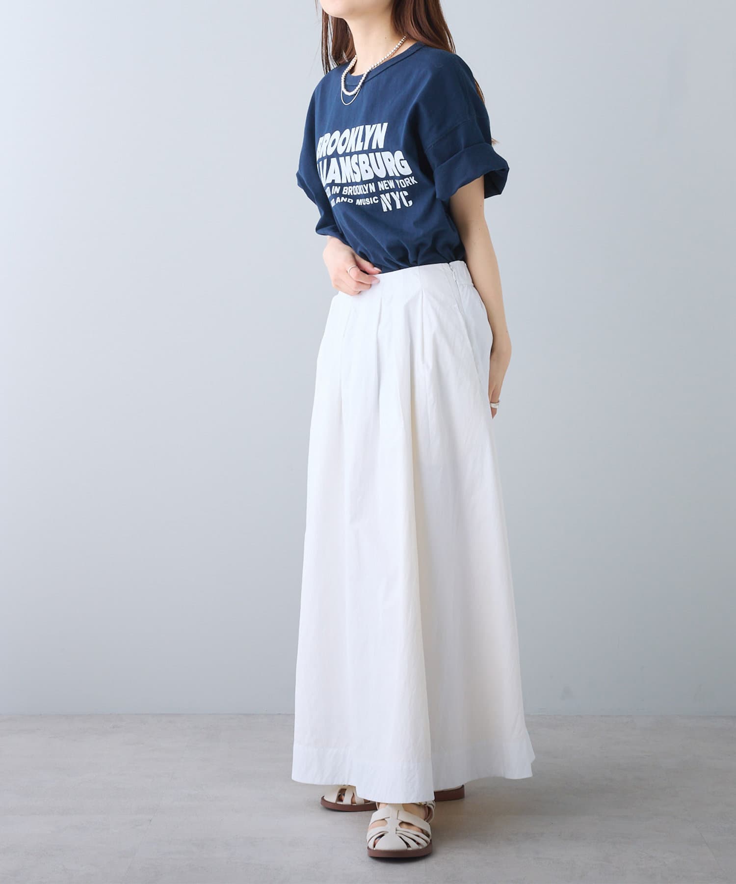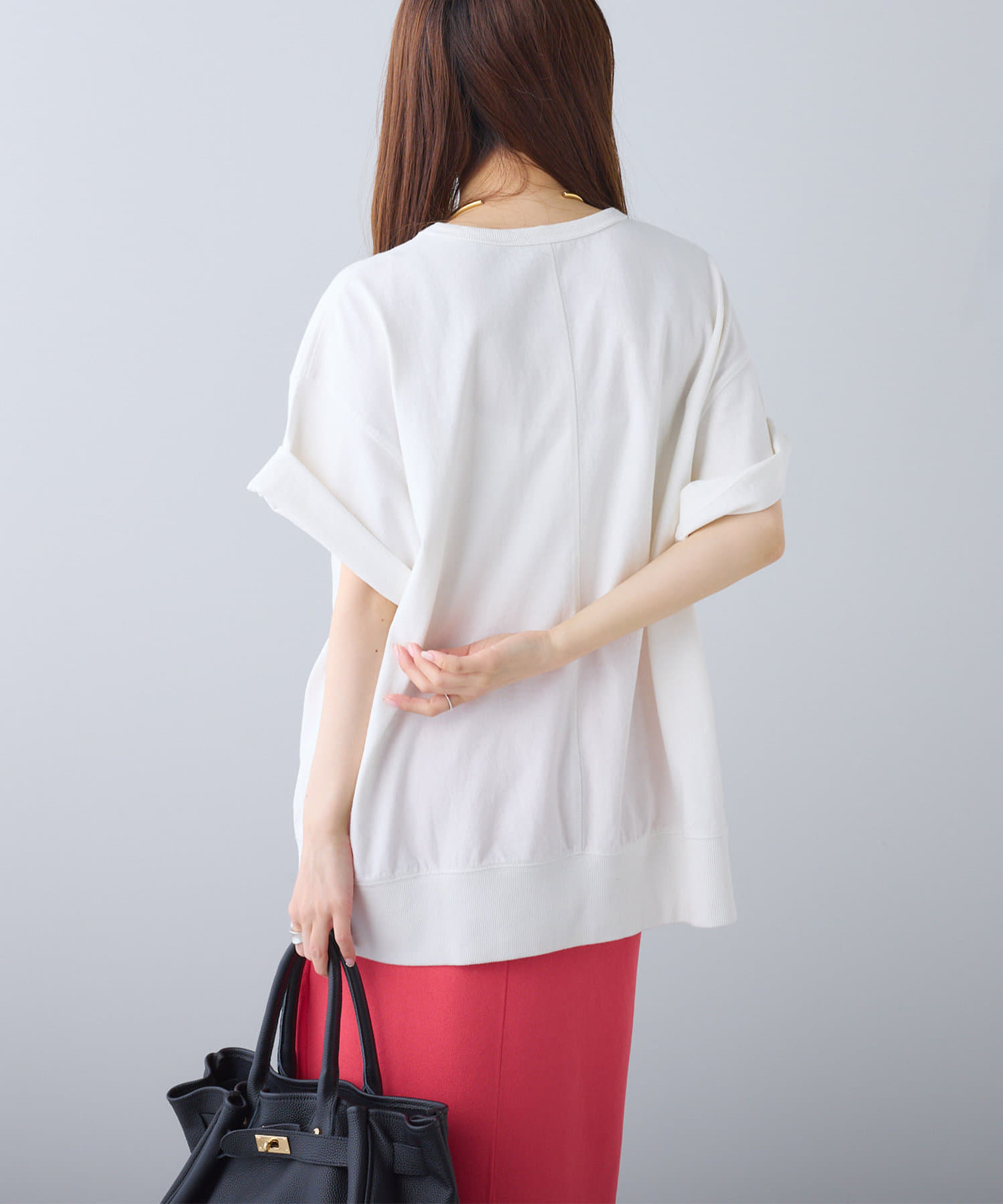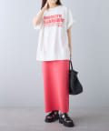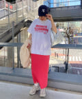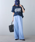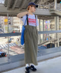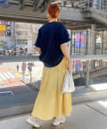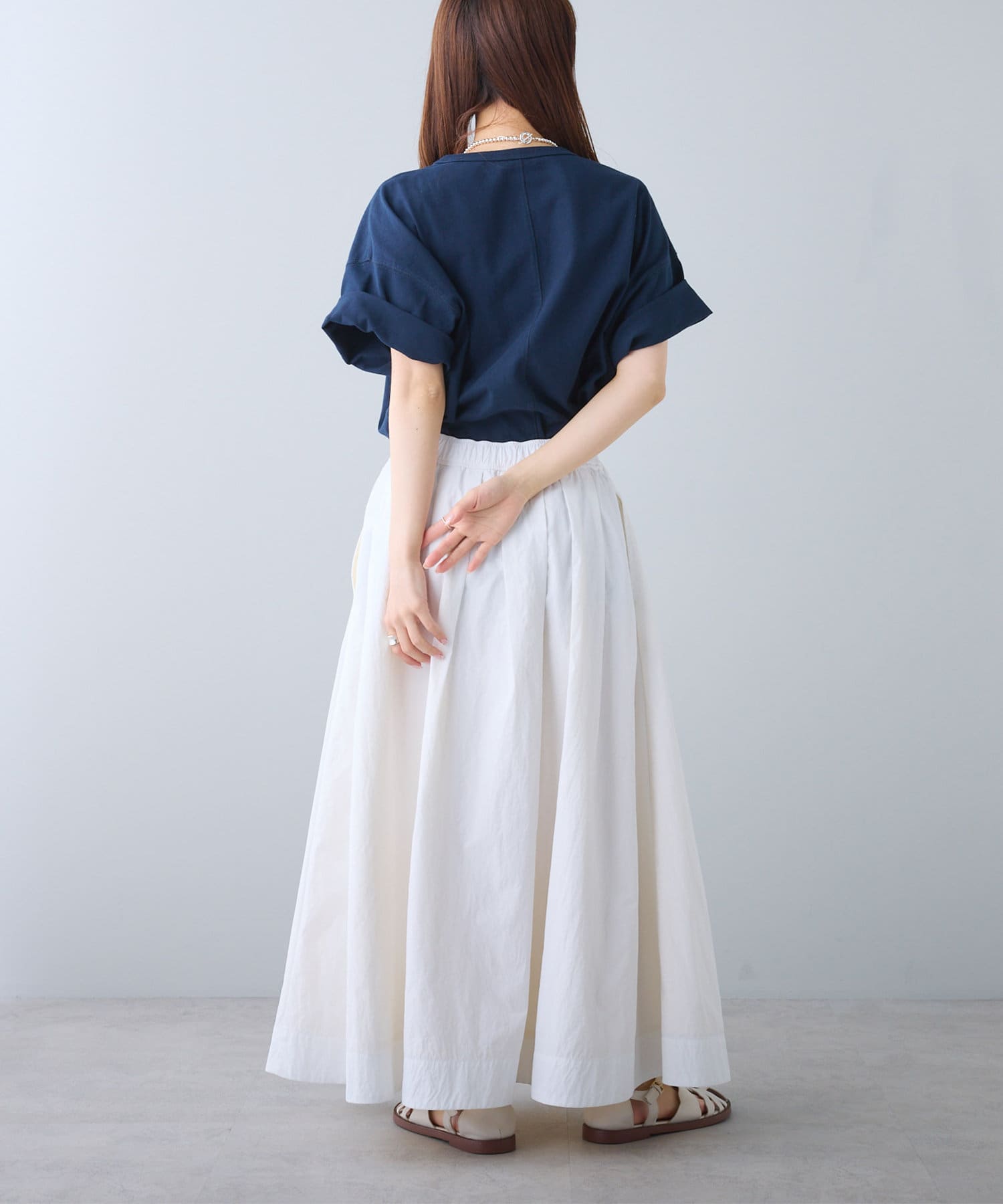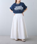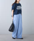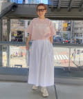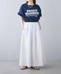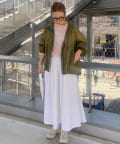 タックインからアウトまで対応するので、ナロースカートやフレアスカート、スラックスパンツまで、幅広いボトムスと好相性。
