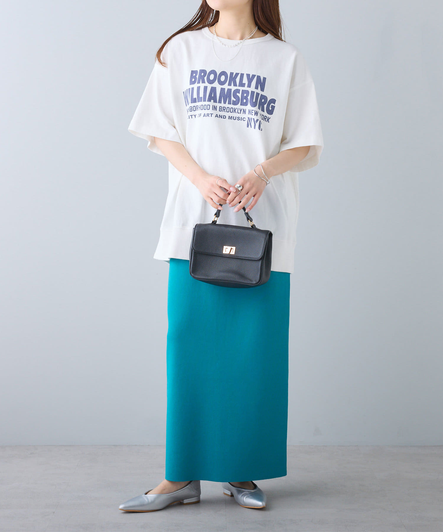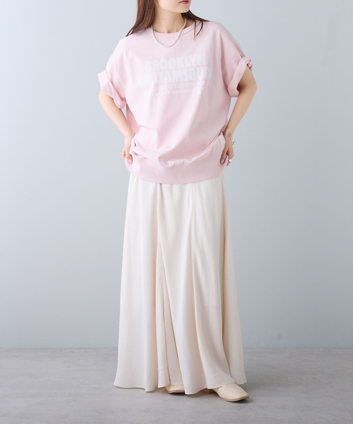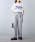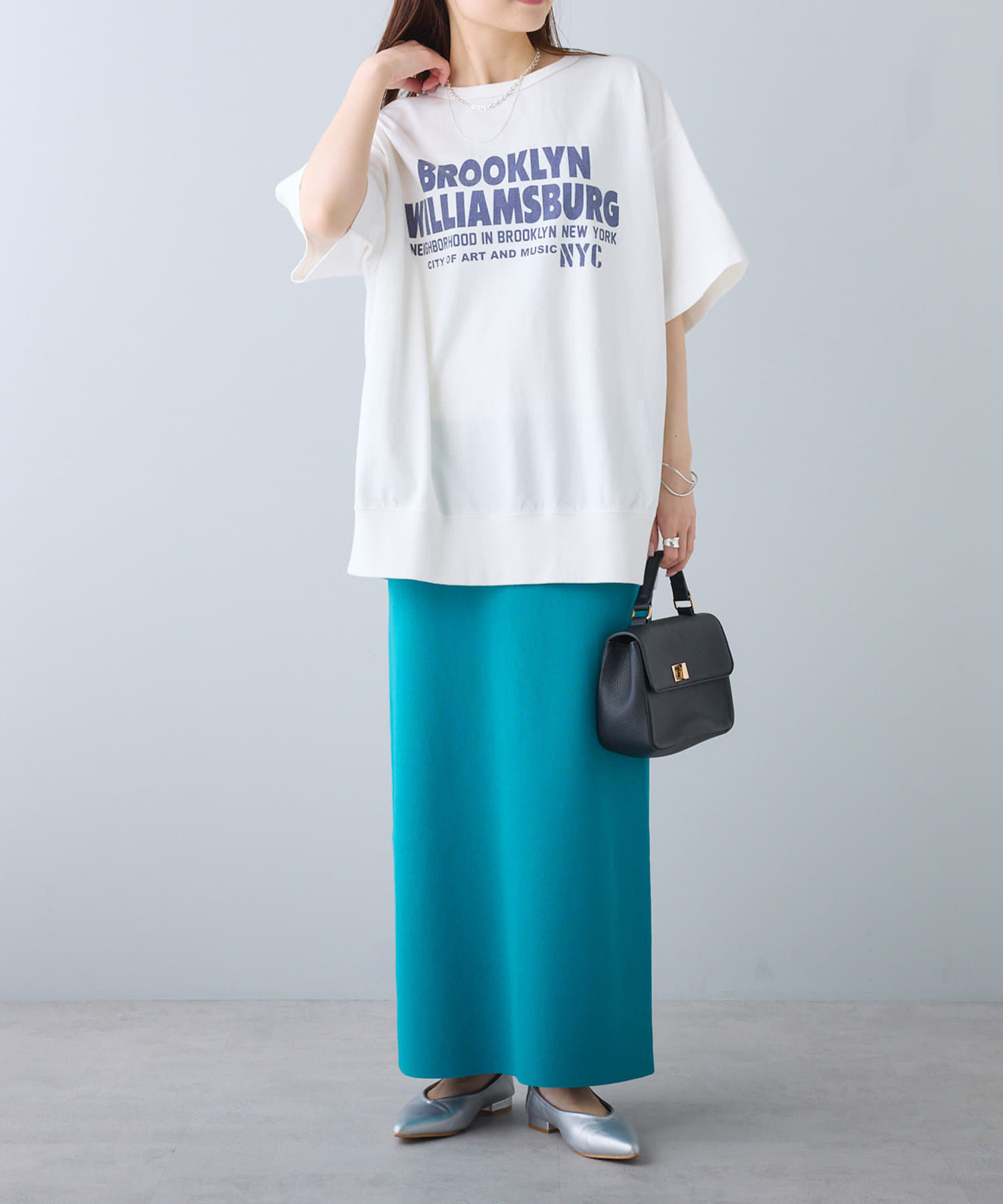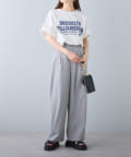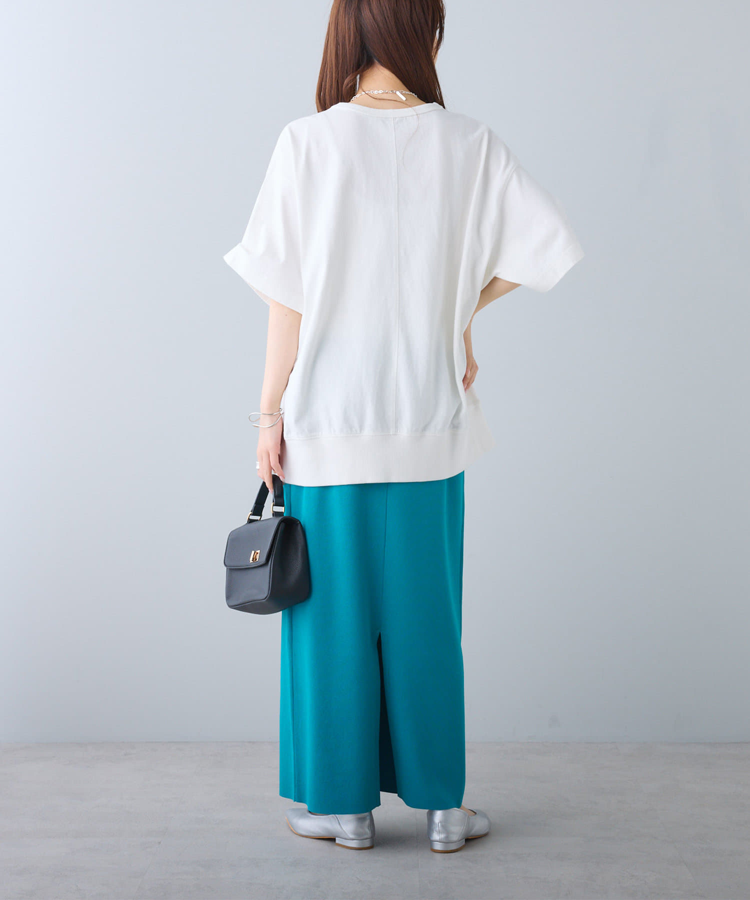 タックインからアウトまで対応するので、ナロースカートやフレアスカート、スラックスパンツまで、幅広いボトムスと好相性。