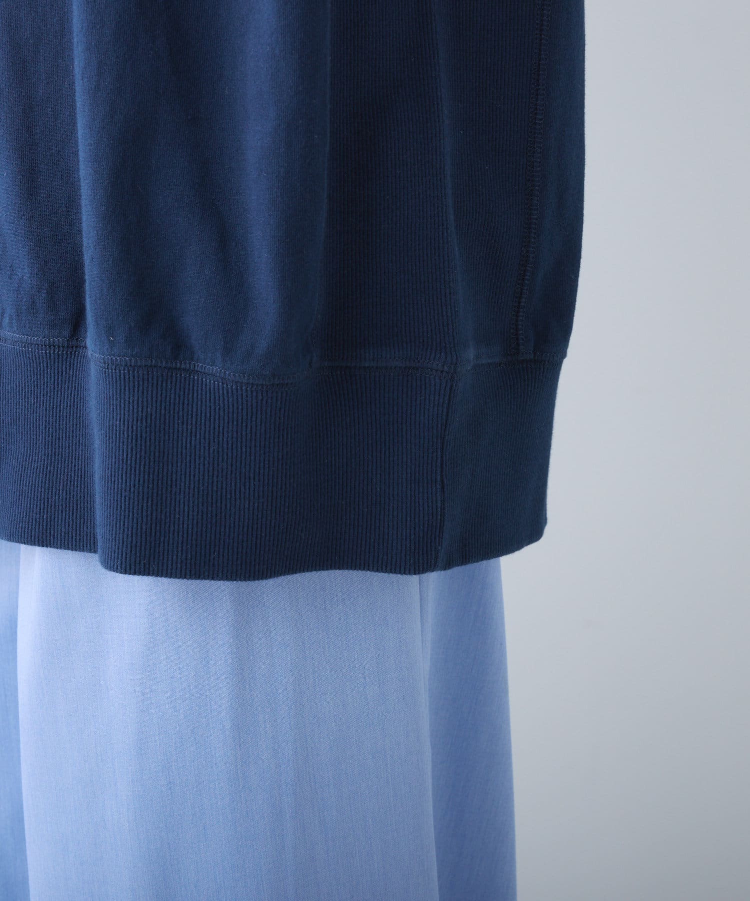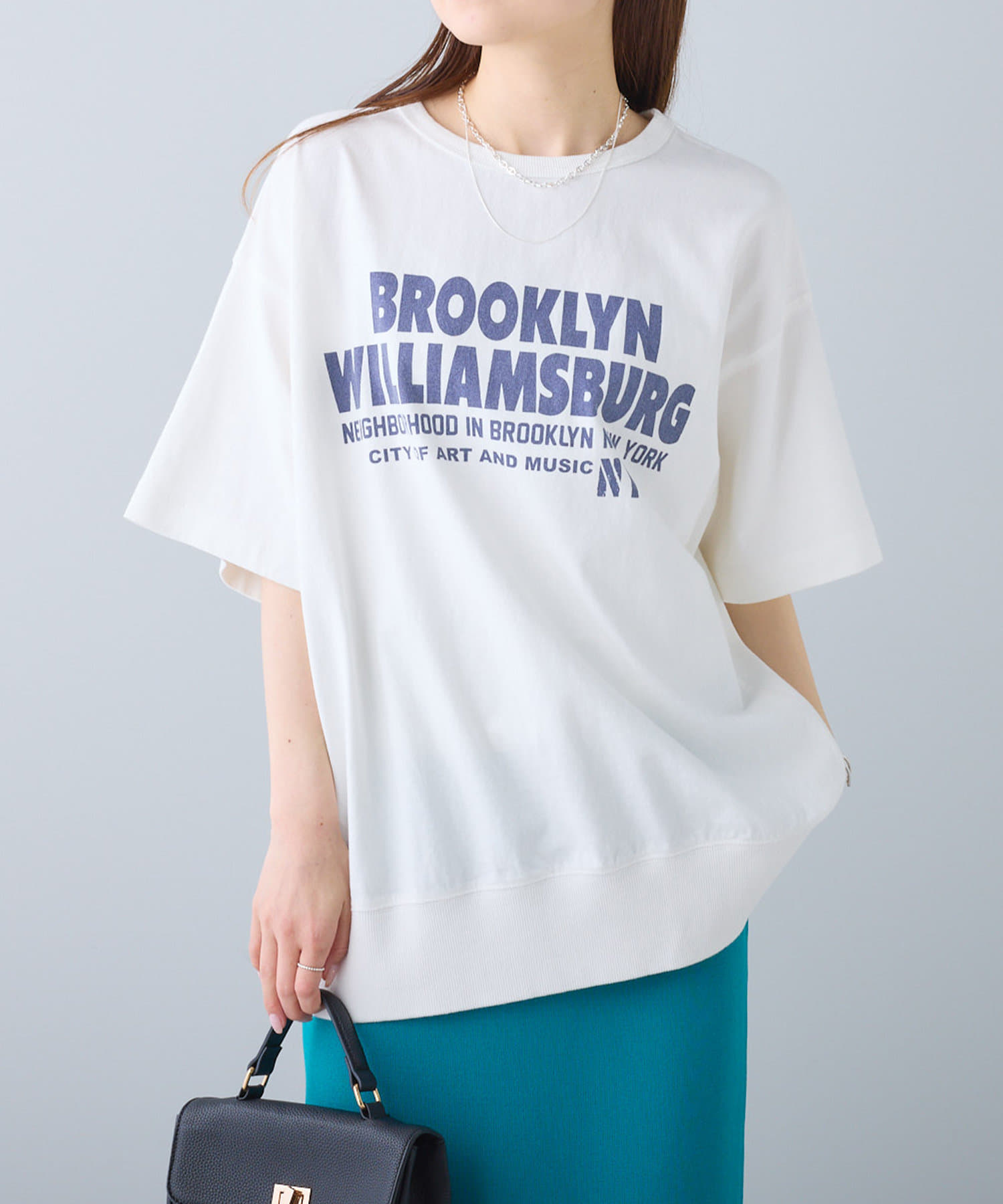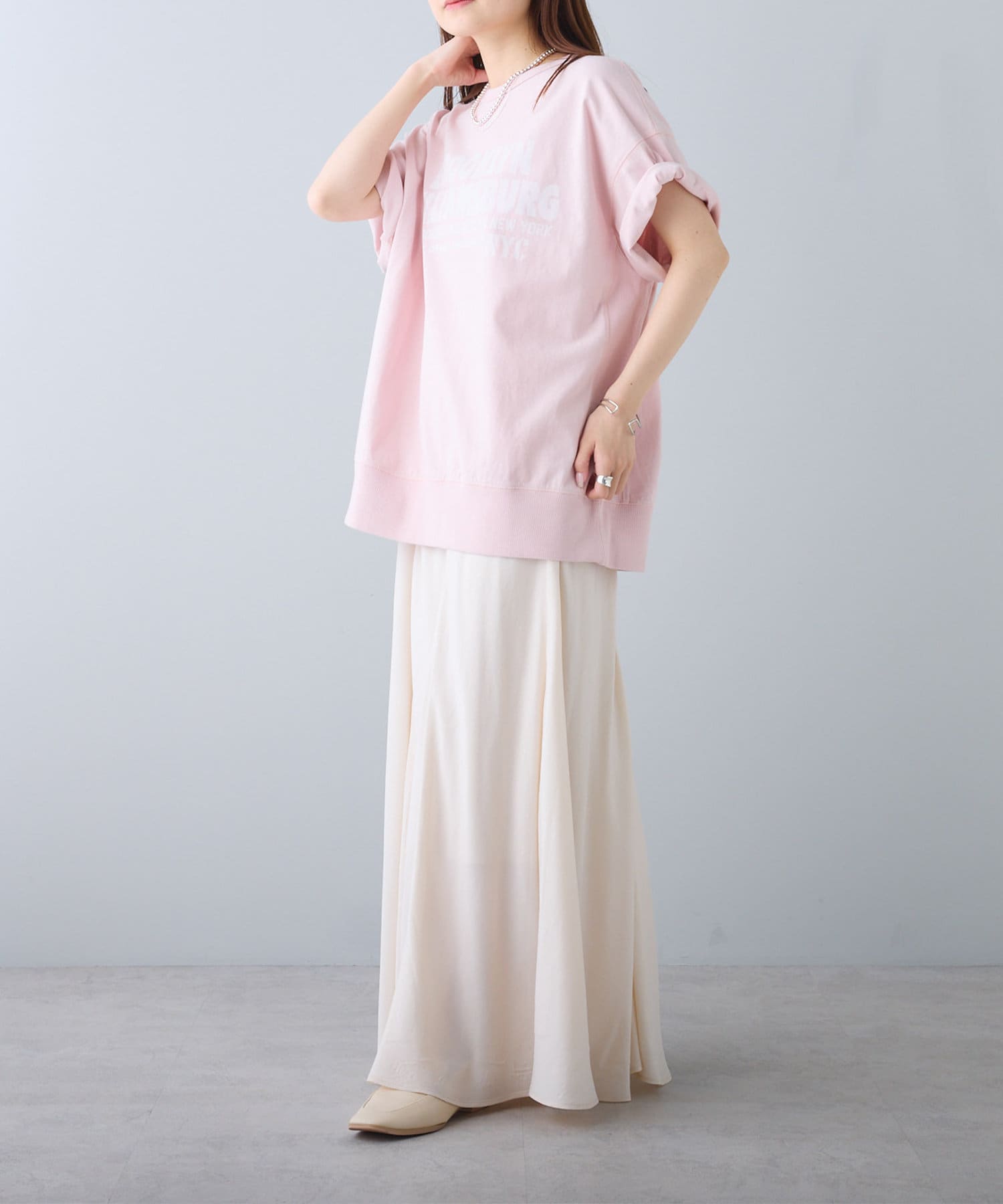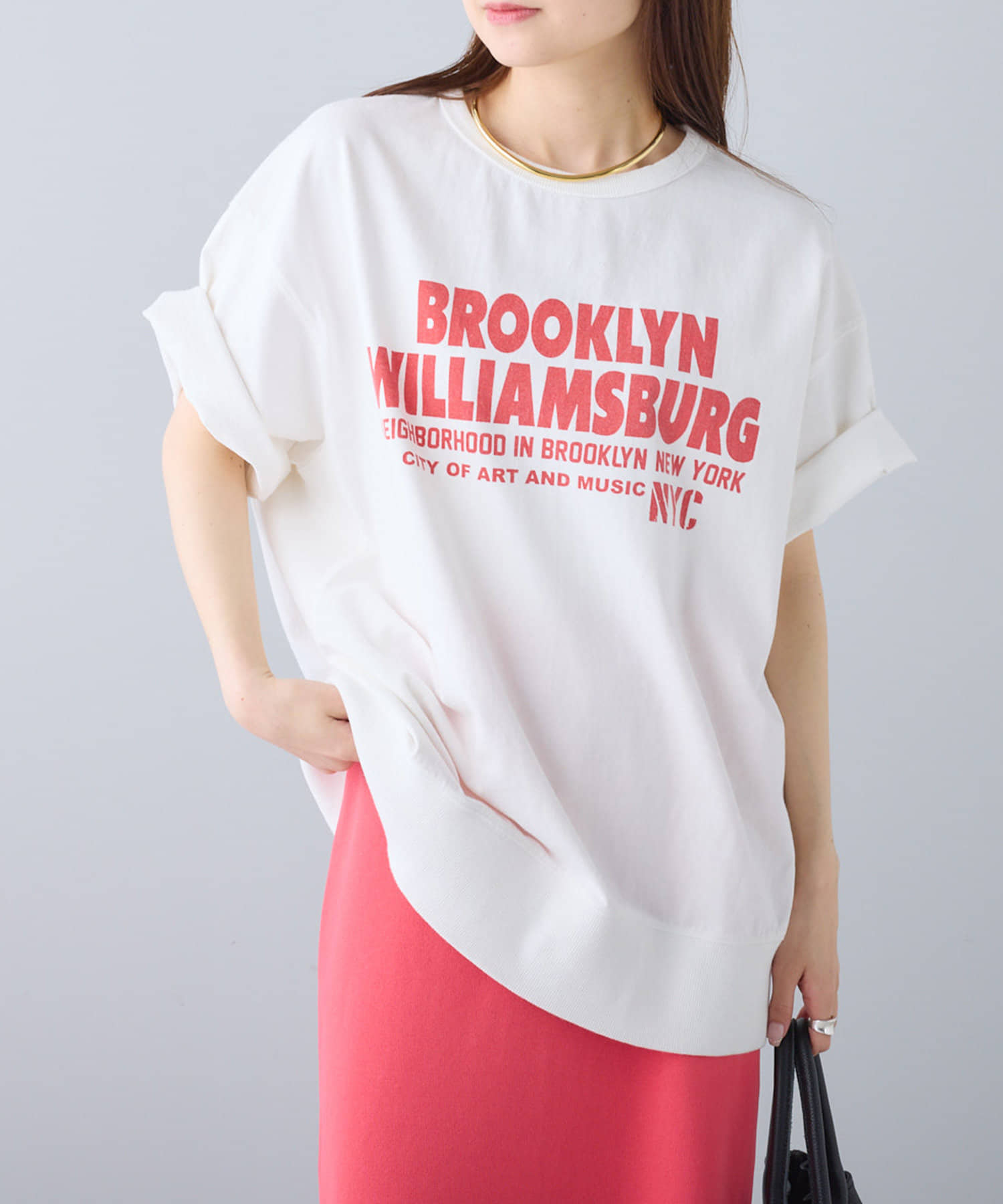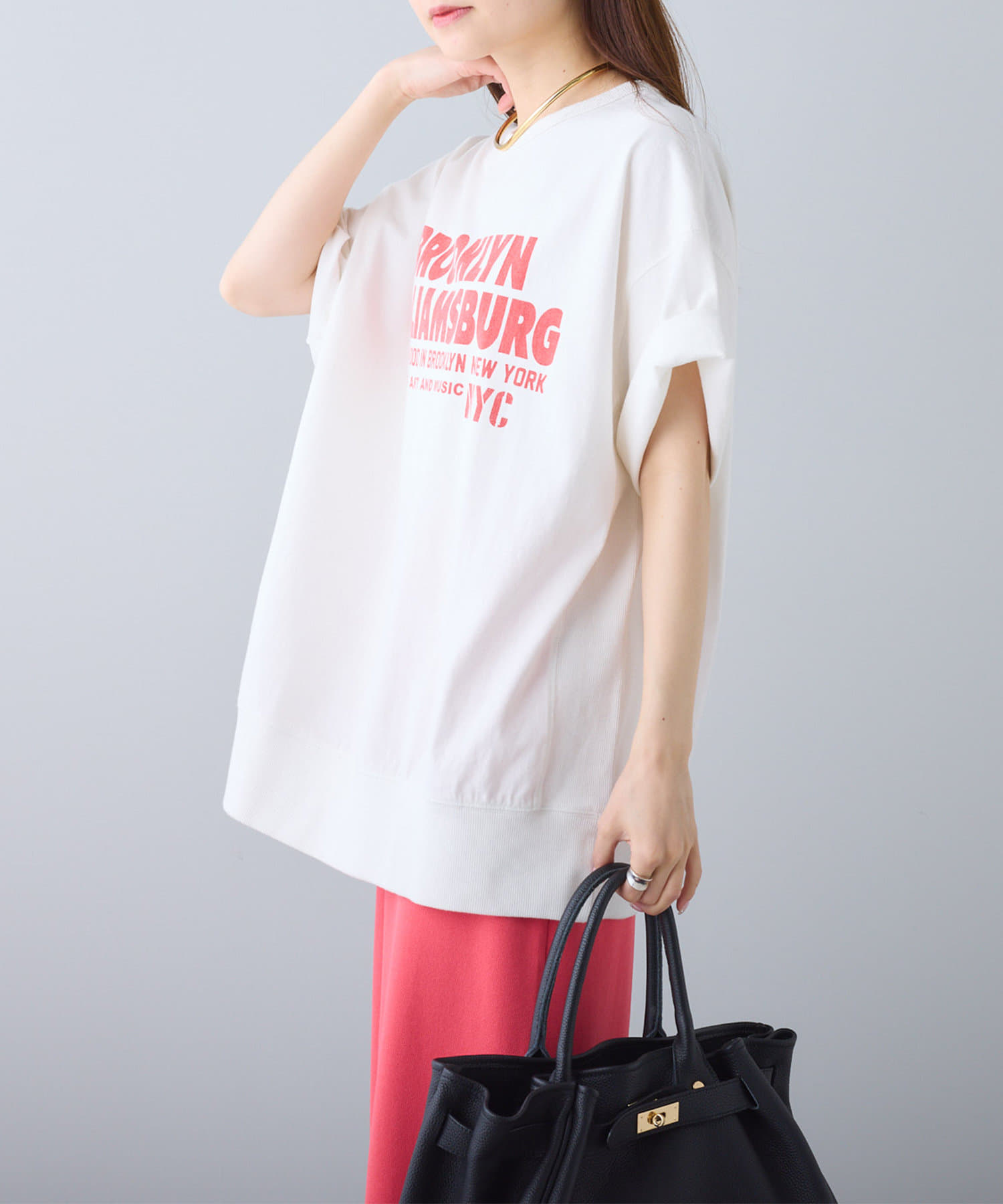 タックインからアウトまで対応するので、ナロースカートやフレアスカート、スラックスパンツまで、幅広いボトムスと好相性。