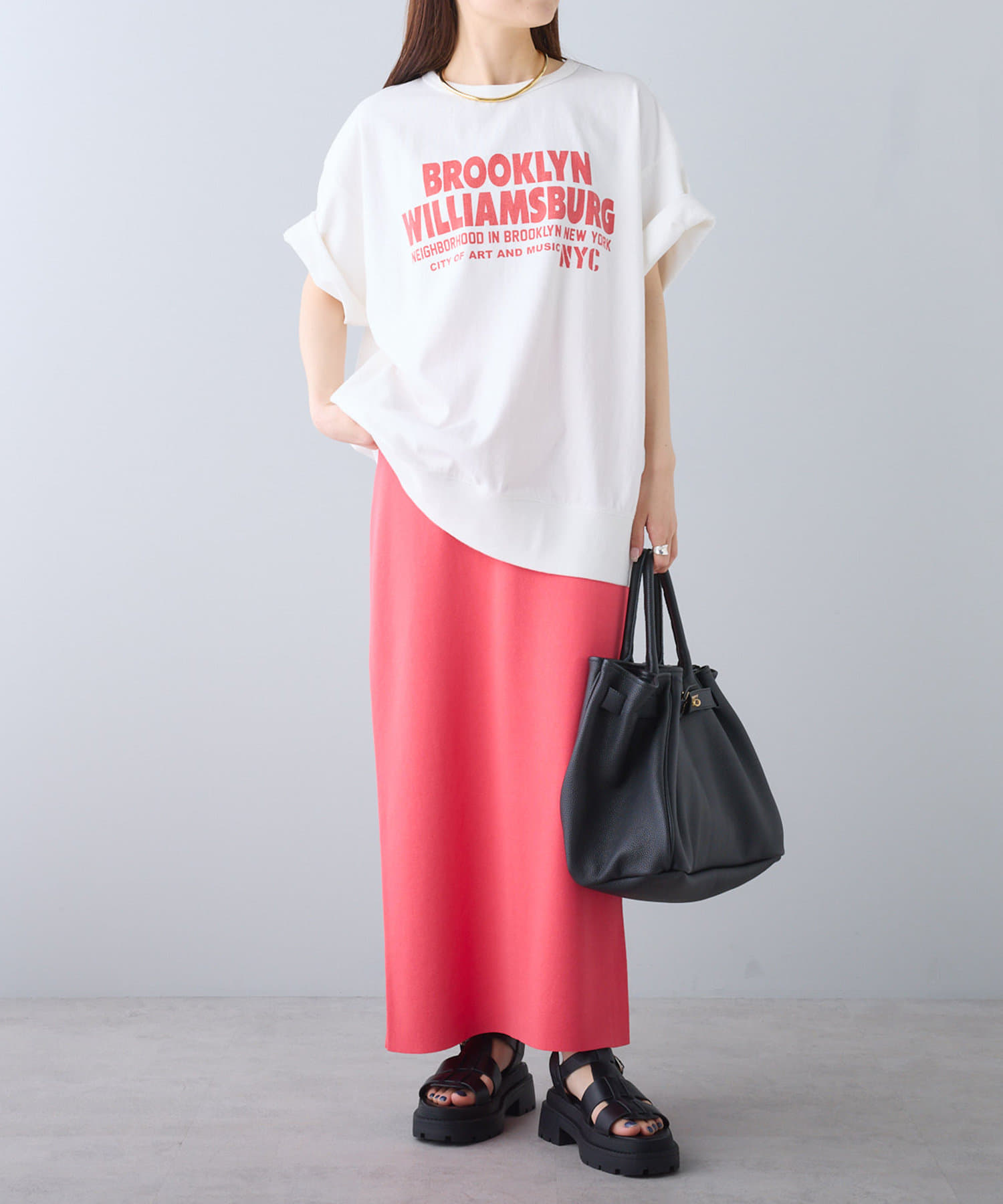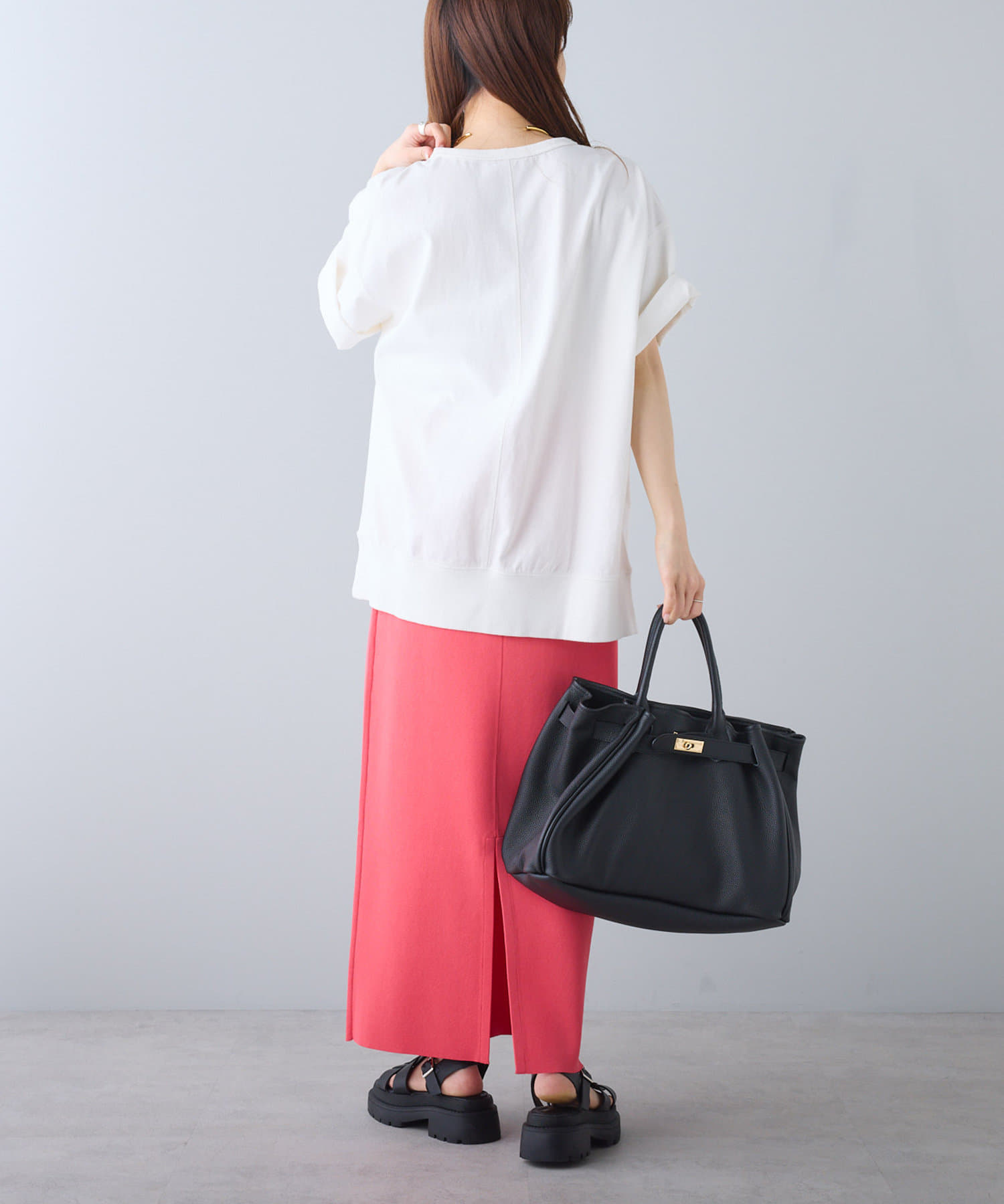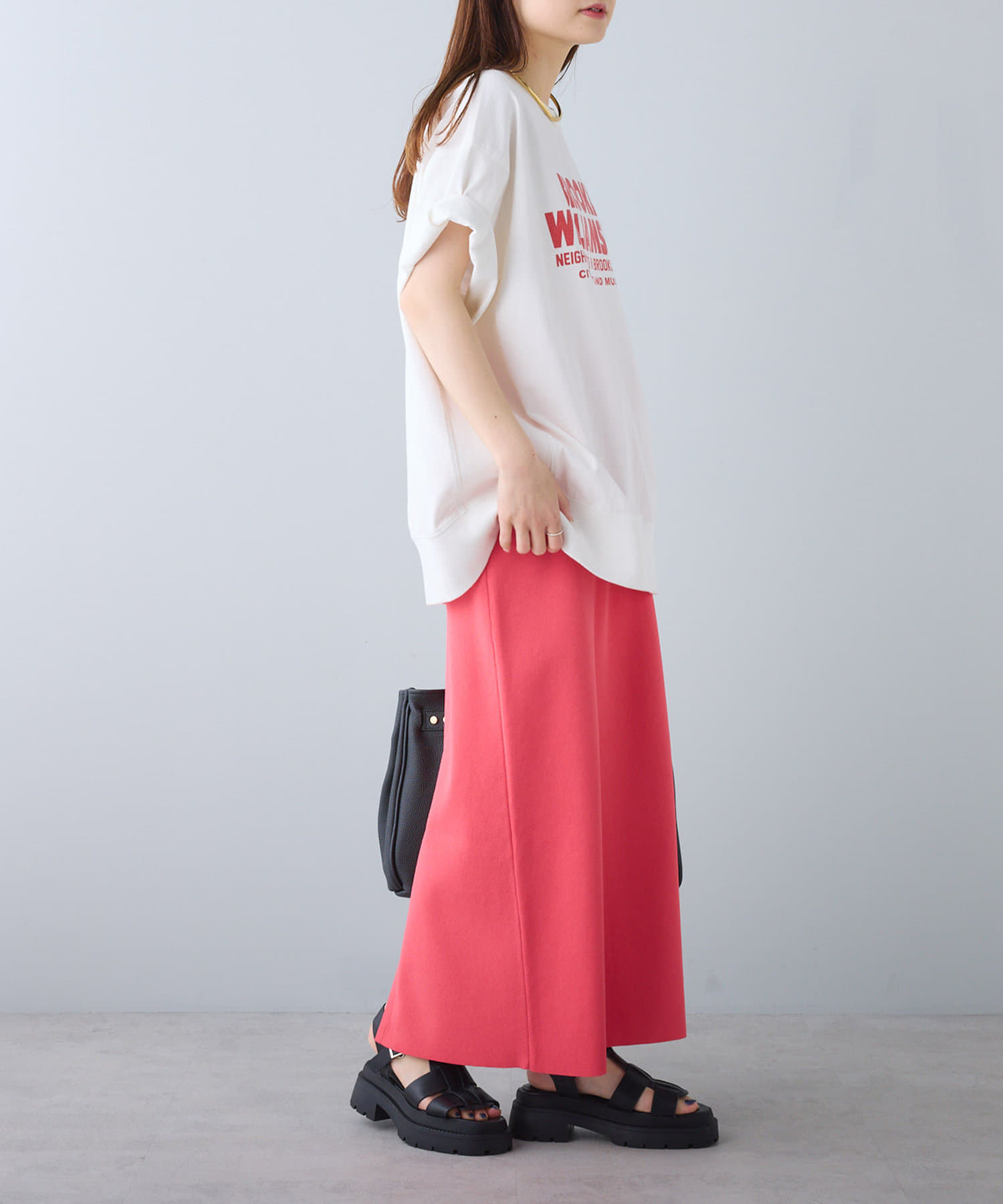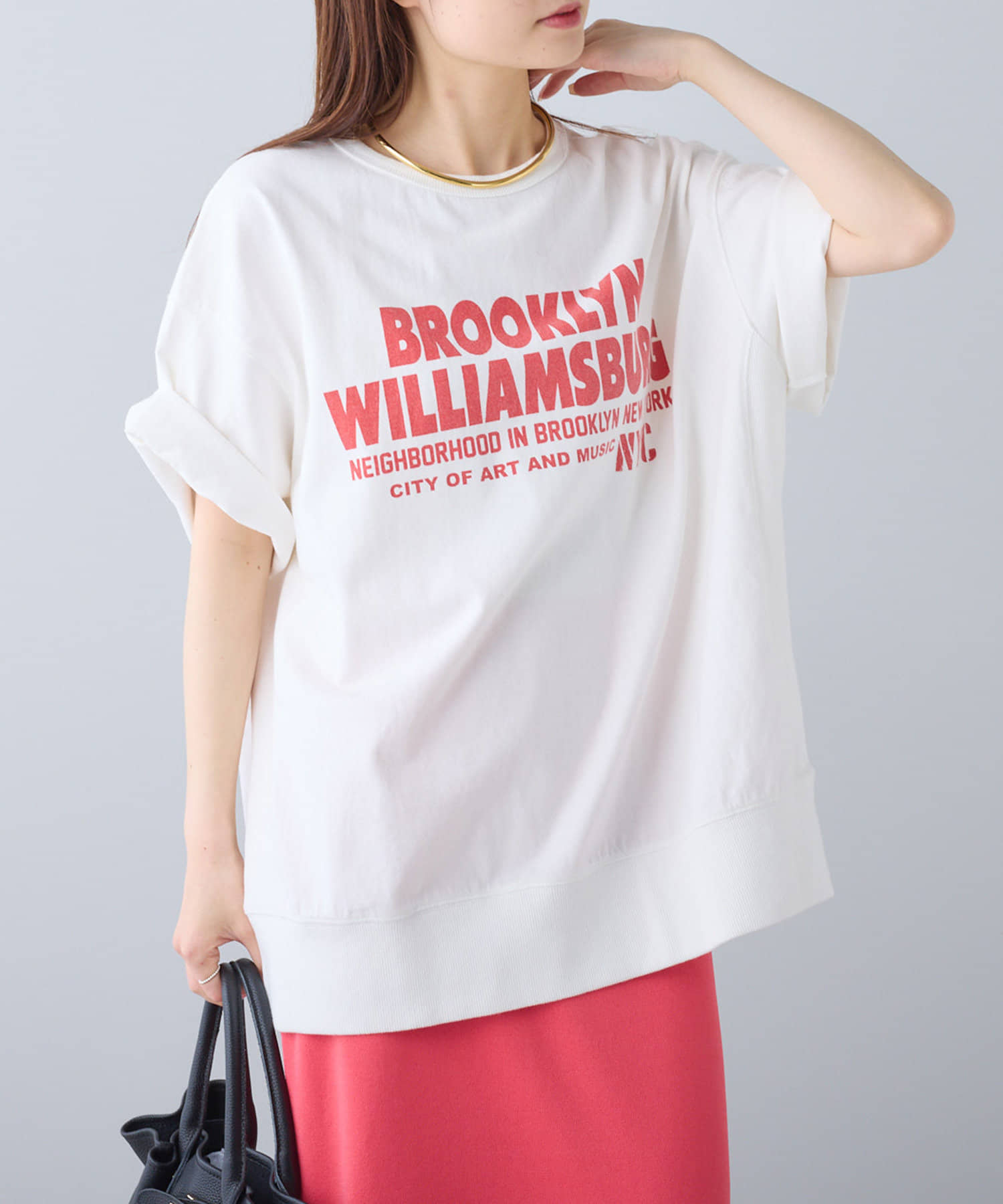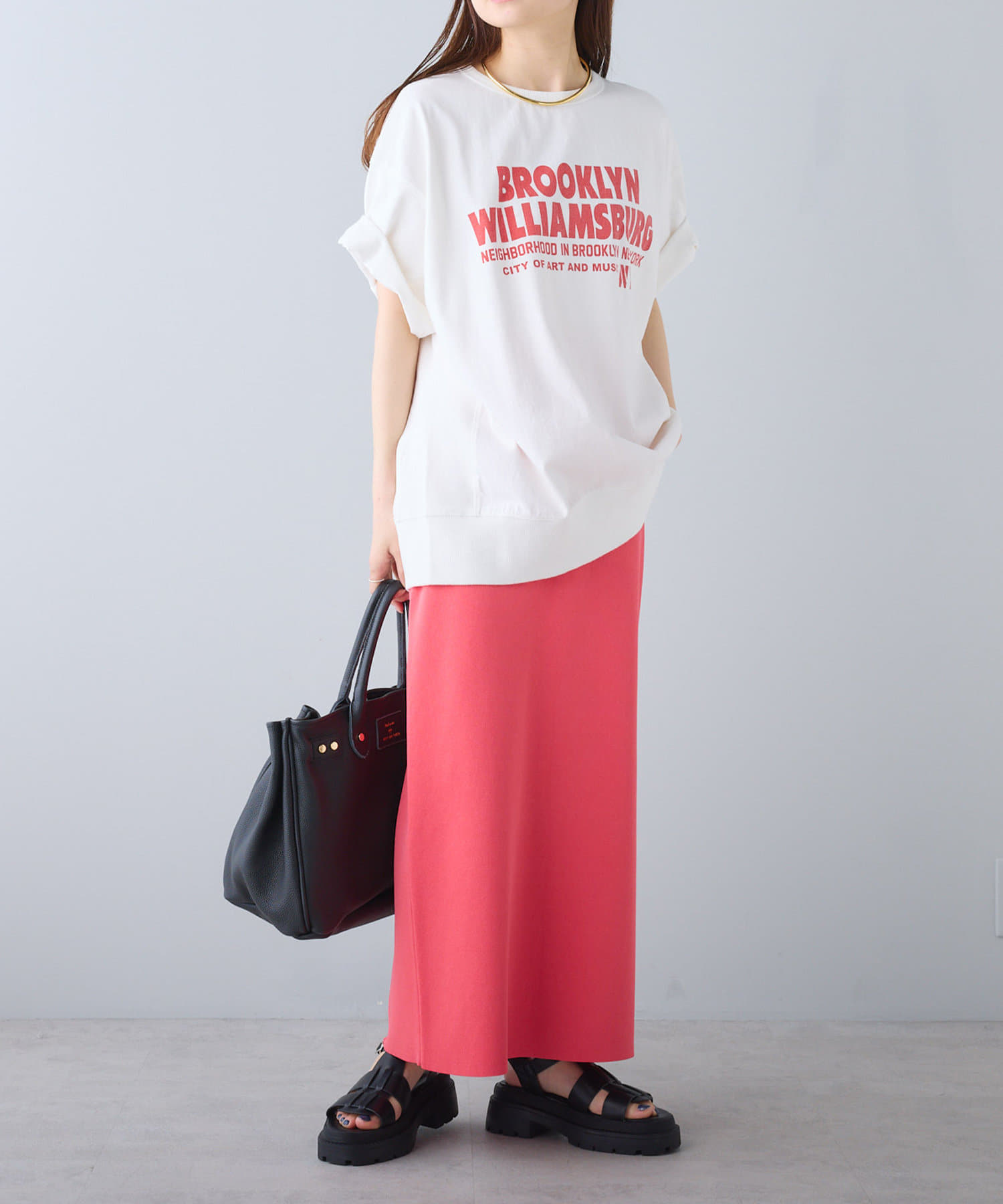 タックインからアウトまで対応するので、ナロースカートやフレアスカート、スラックスパンツまで、幅広いボトムスと好相性。