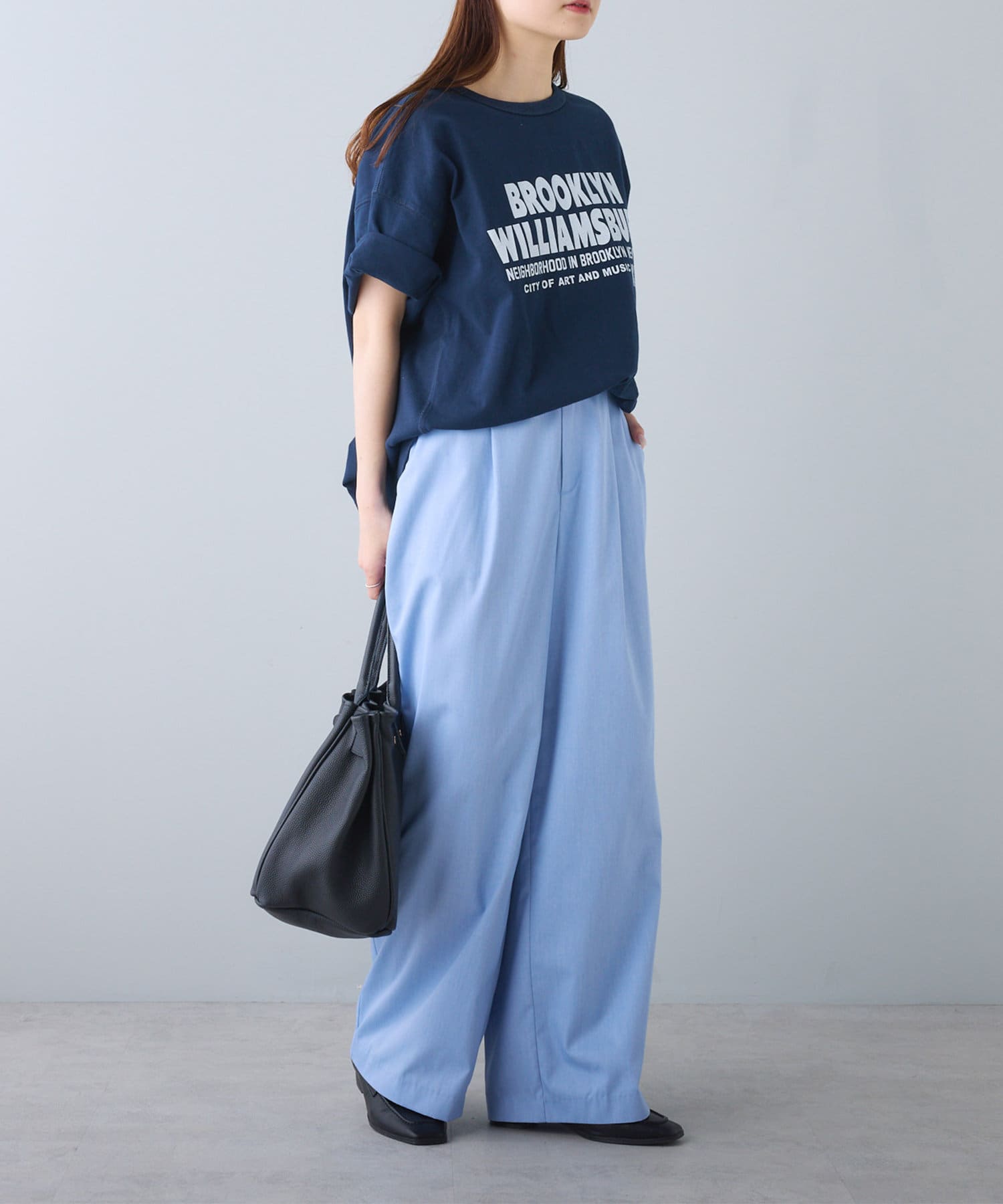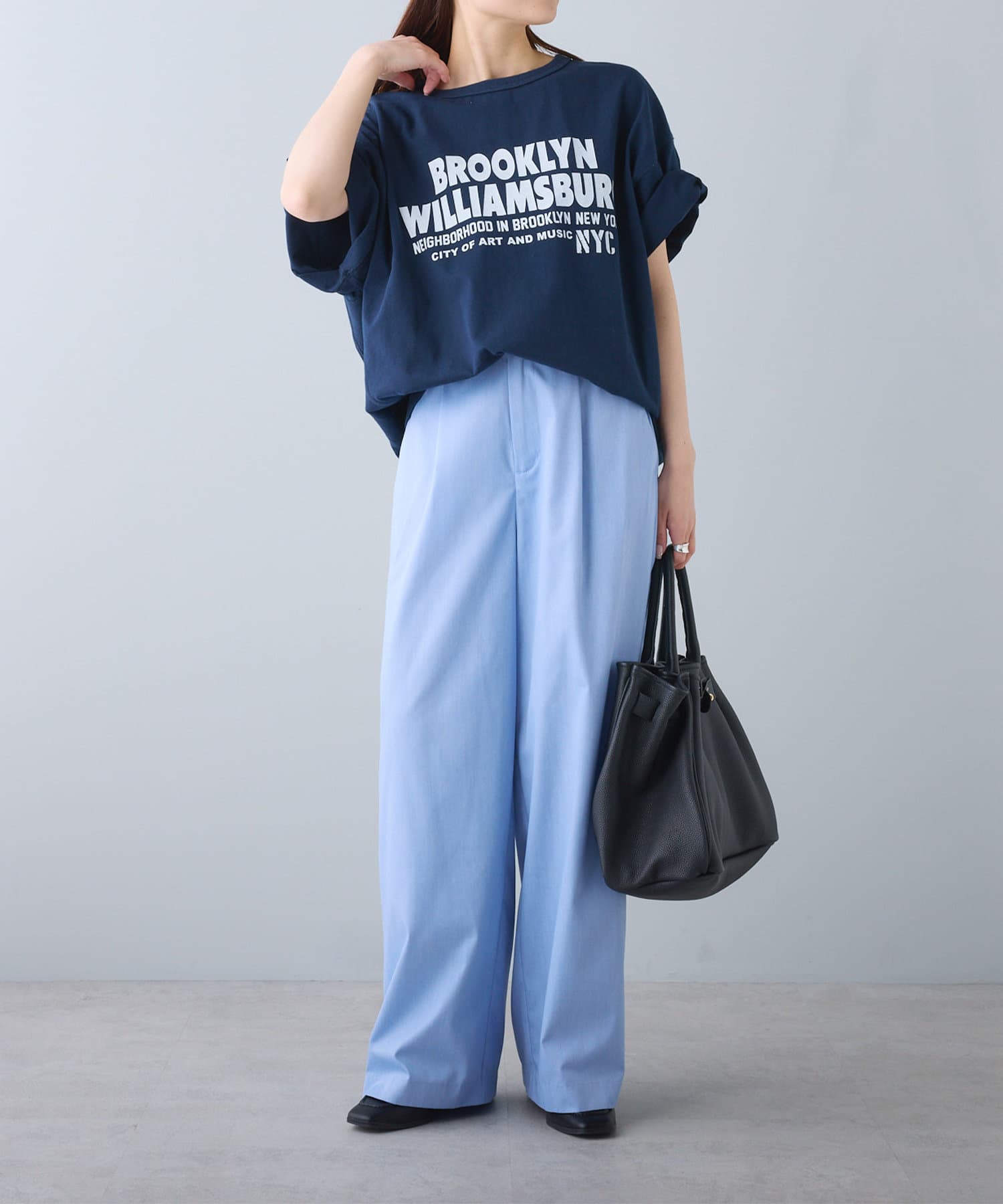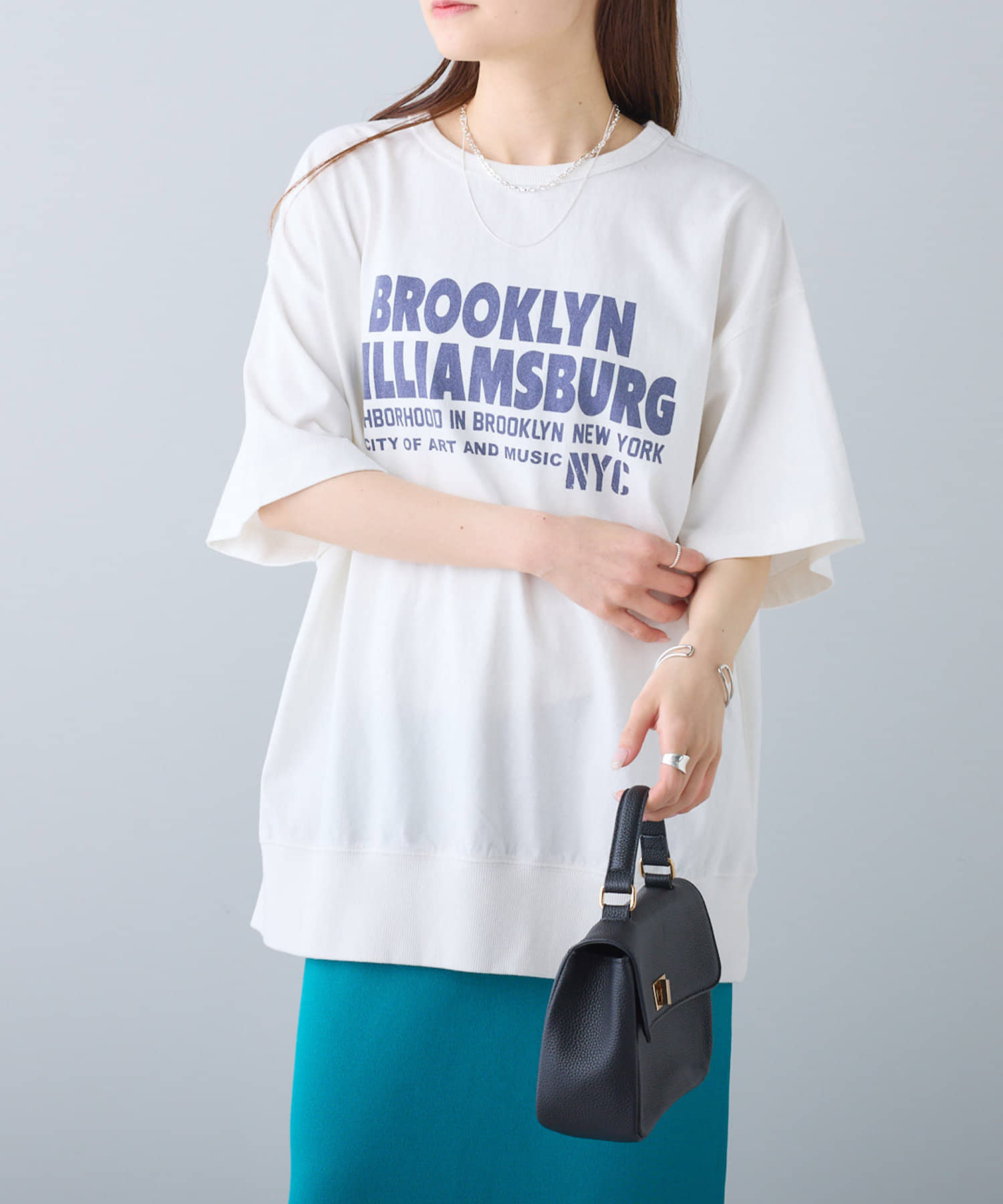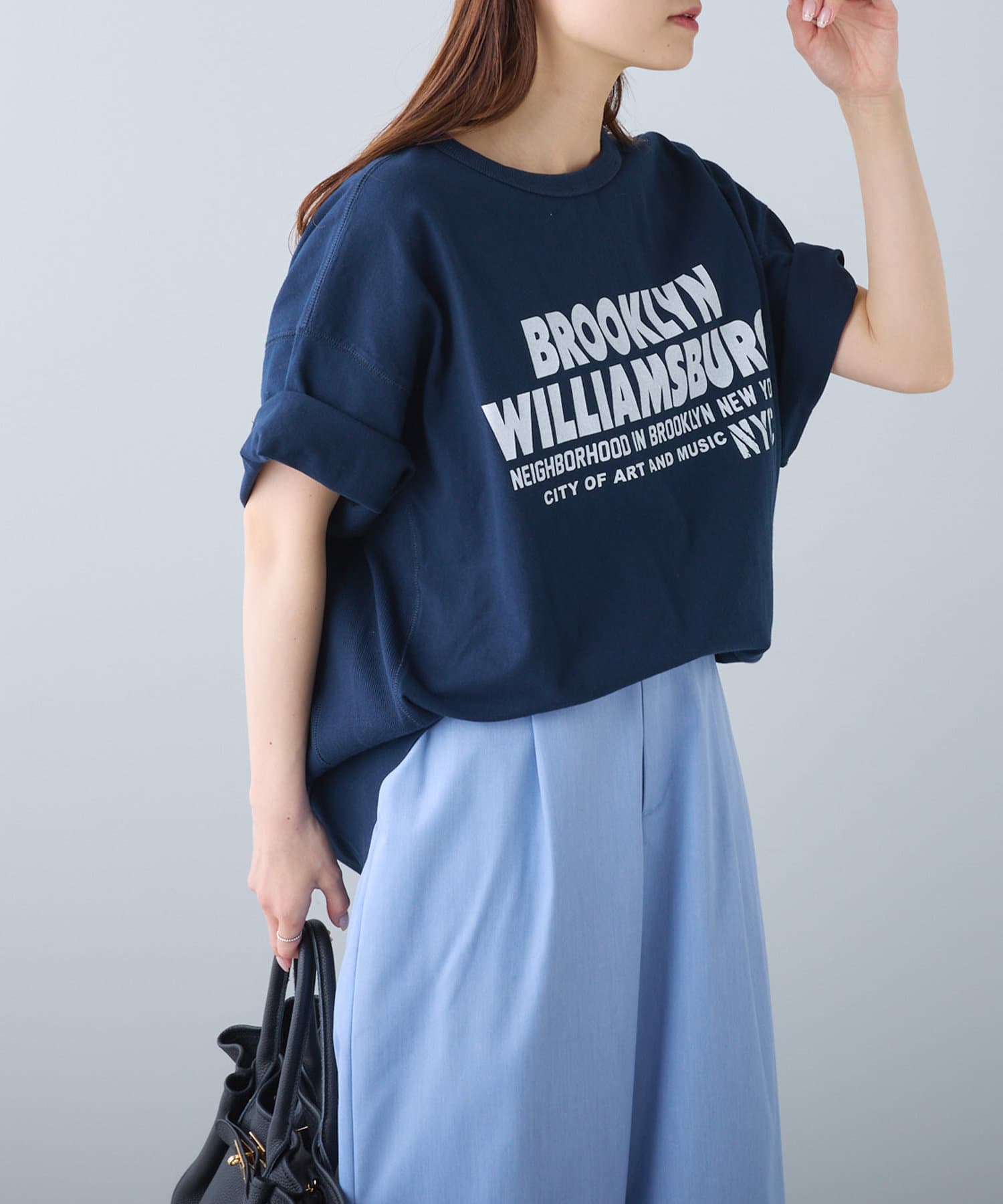タックインからアウトまで対応するので、ナロースカートやフレアスカート、スラックスパンツまで、幅広いボトムスと好相性。