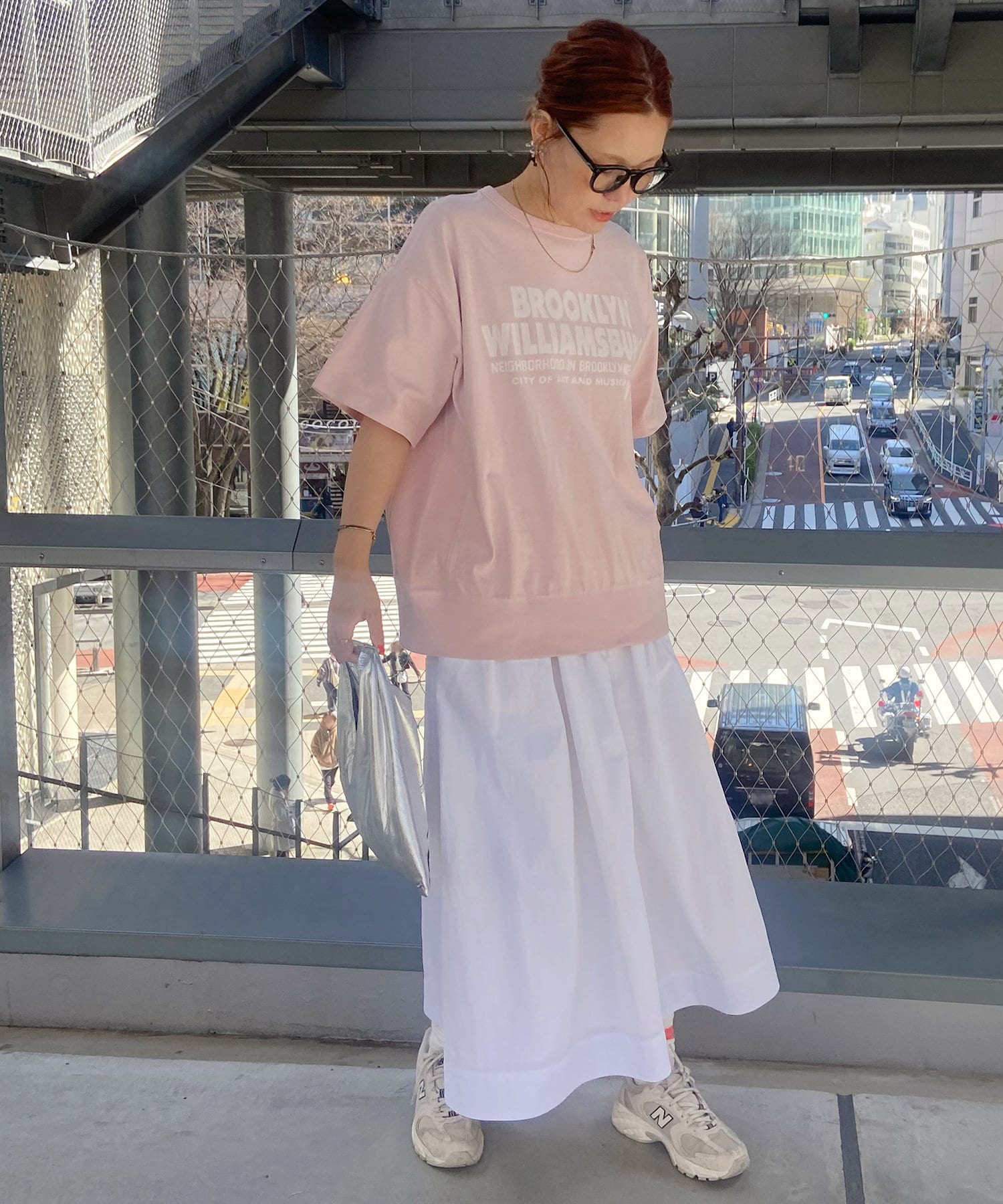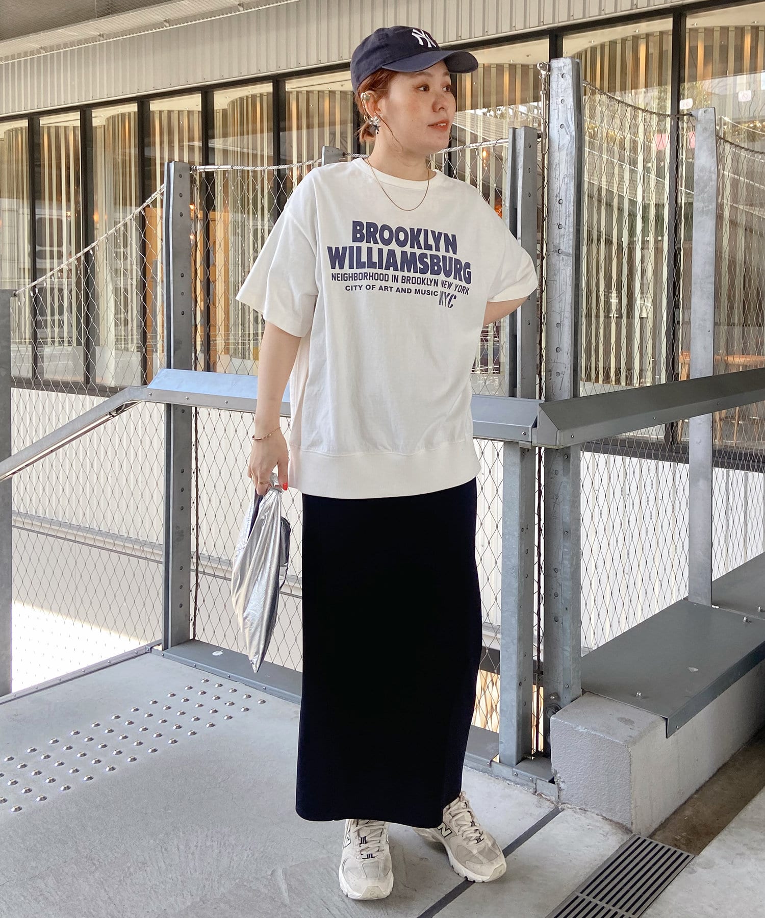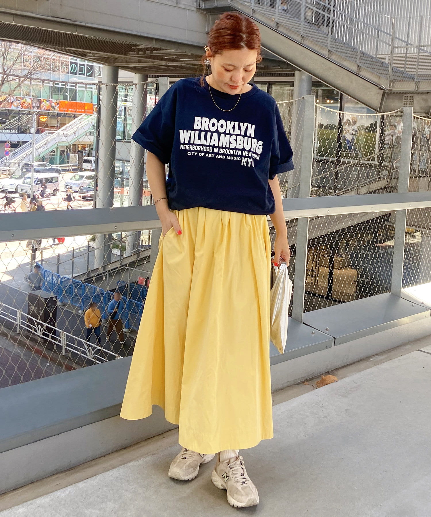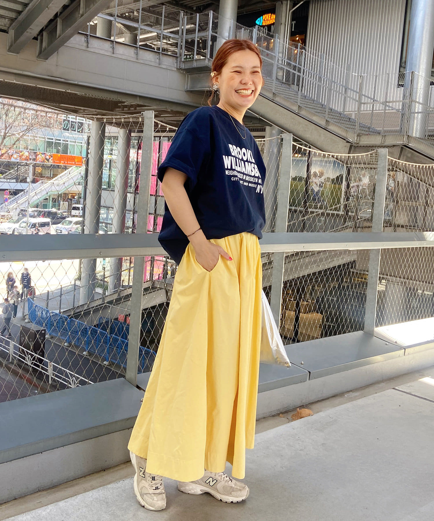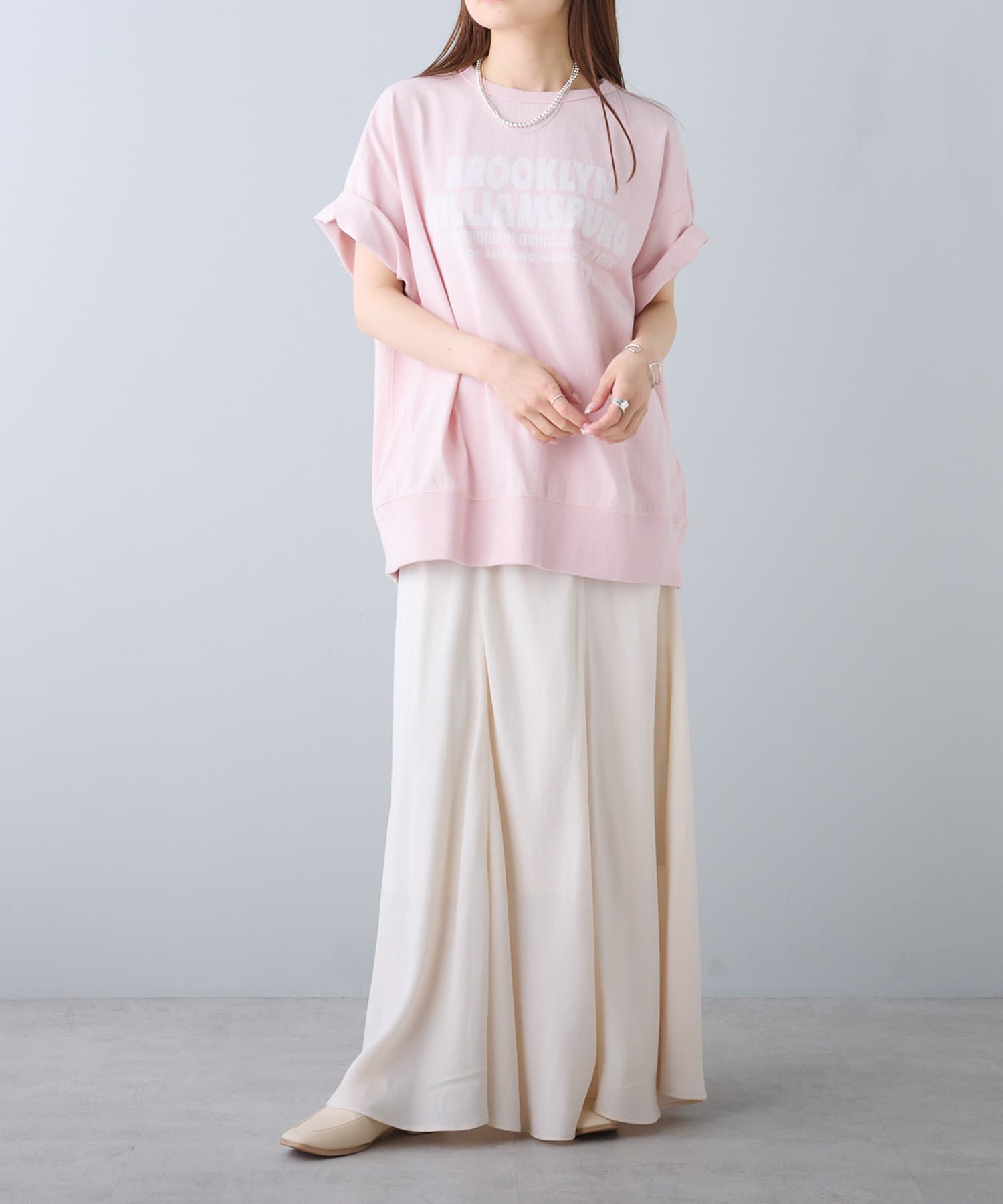 タックインからアウトまで対応するので、ナロースカートやフレアスカート、スラックスパンツまで、幅広いボトムスと好相性。