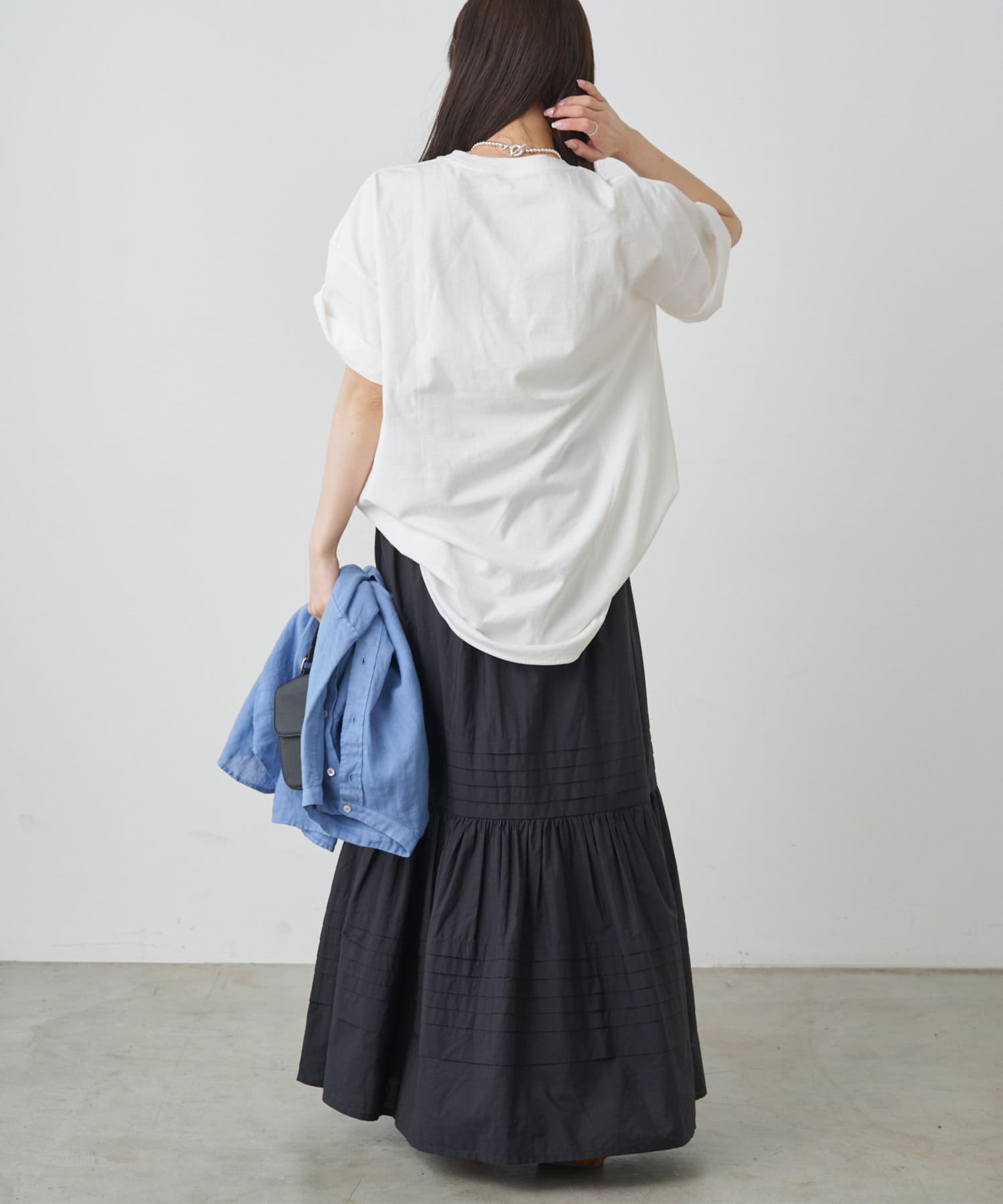 サイズ感:ゆとりのある身幅でラフな着心地。長めの着丈でスカートにもパンツにも合わせやすい1枚です。