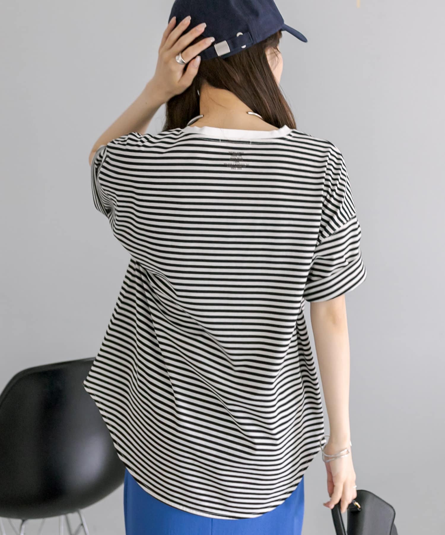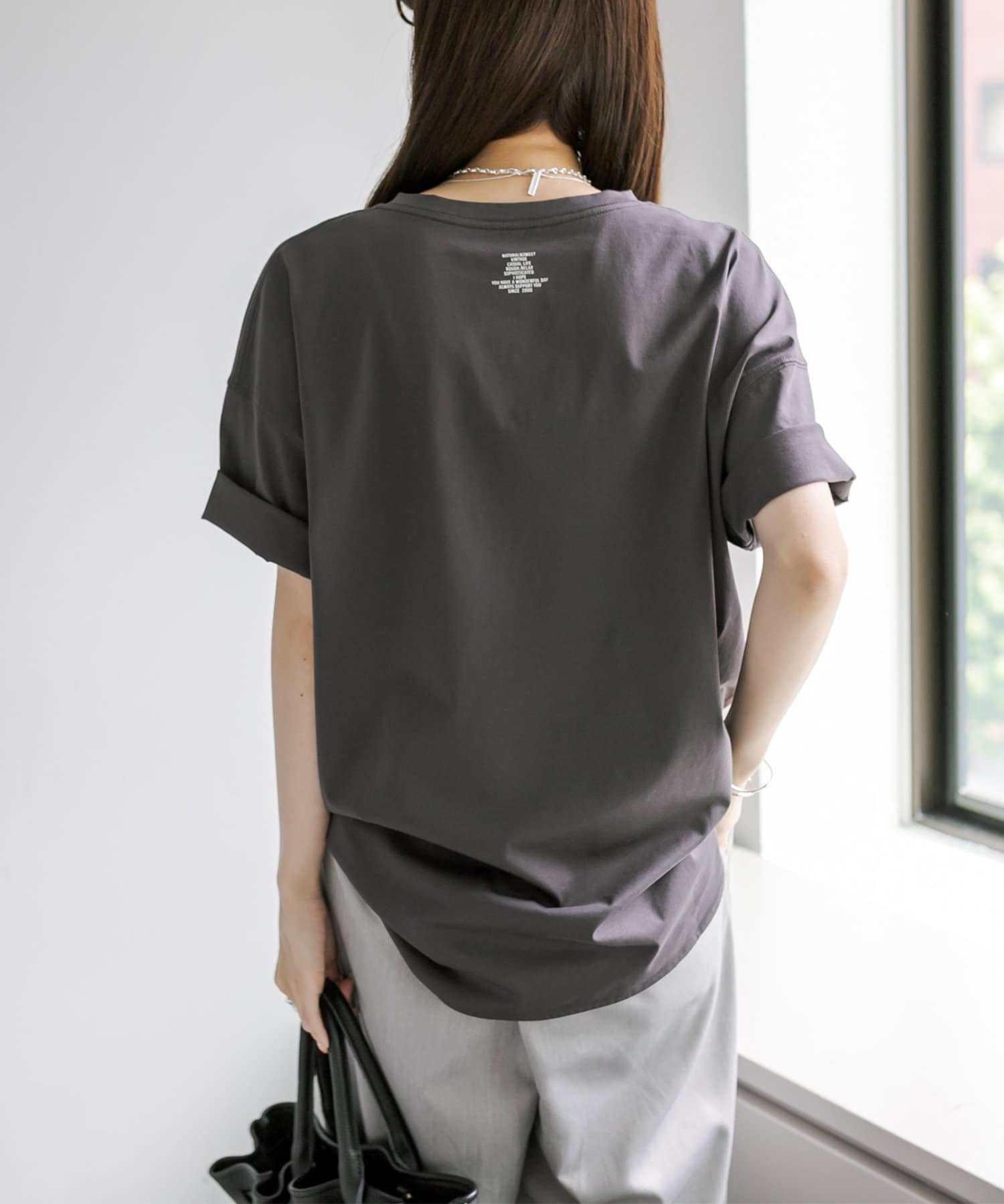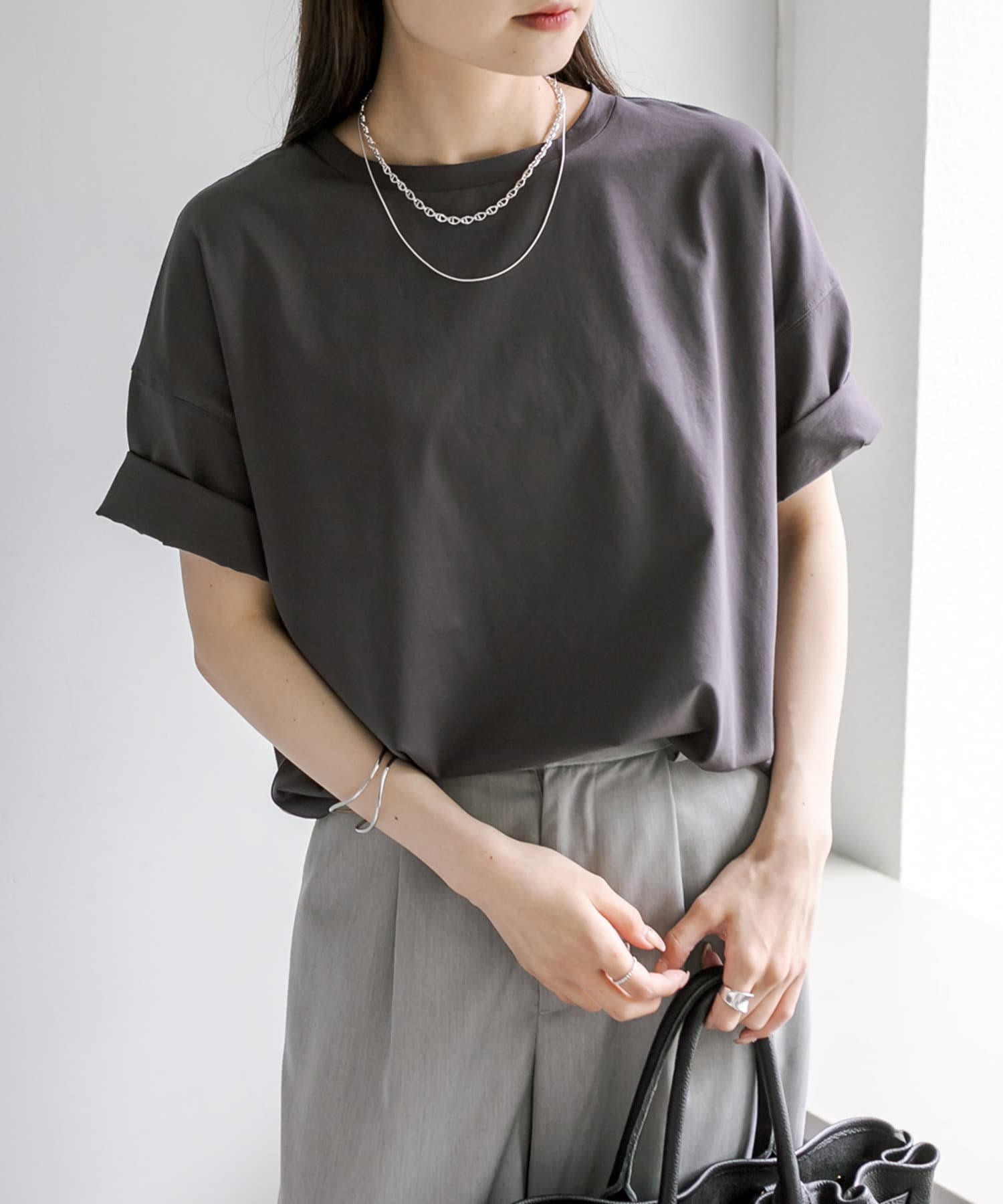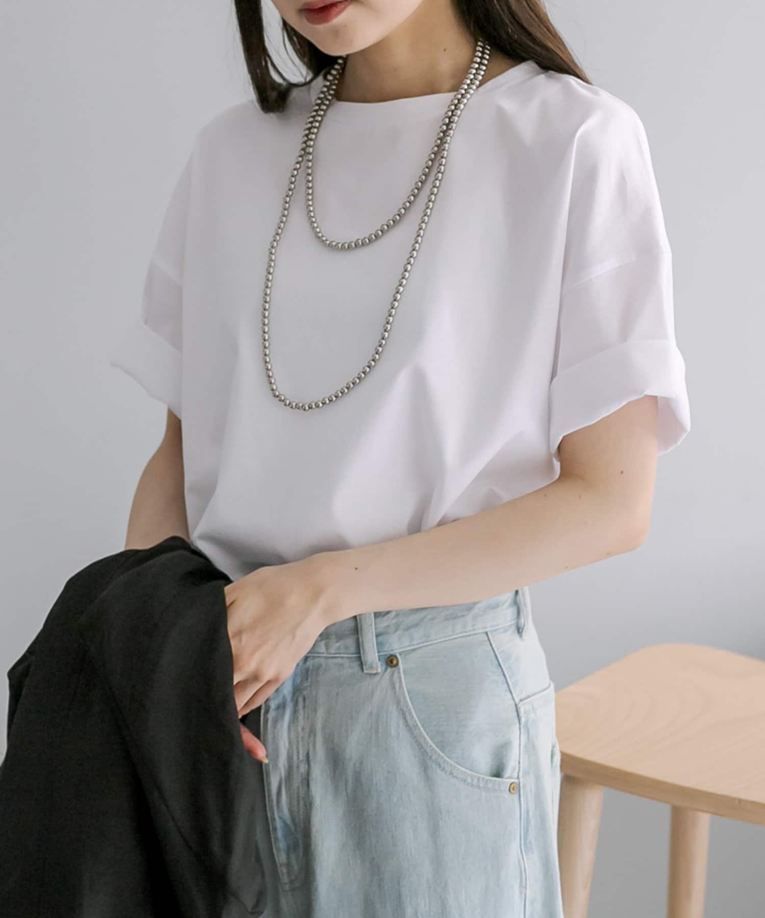 袖丈はハーフスリーブ丈で捲って長さをアレンジすることも可能。