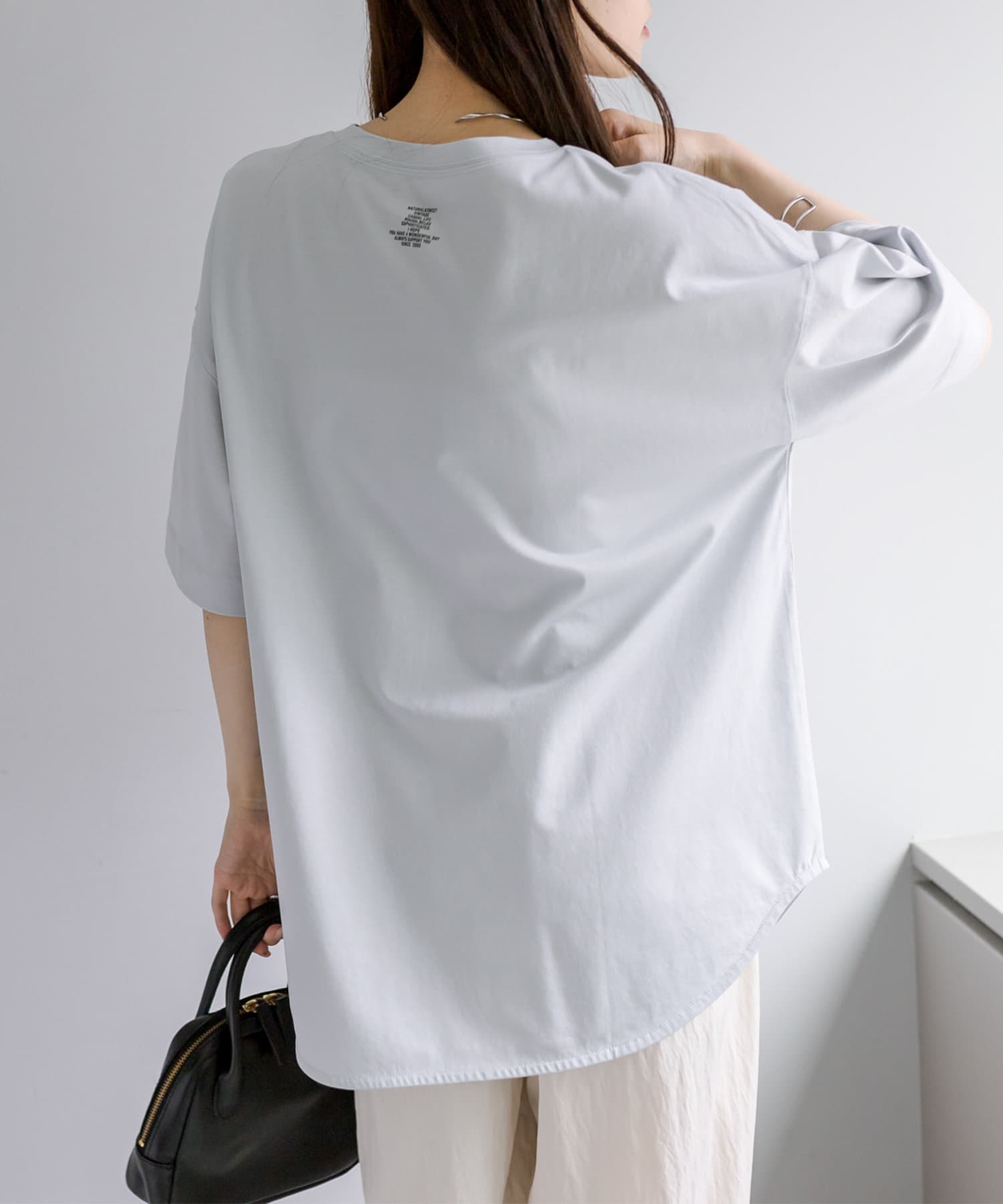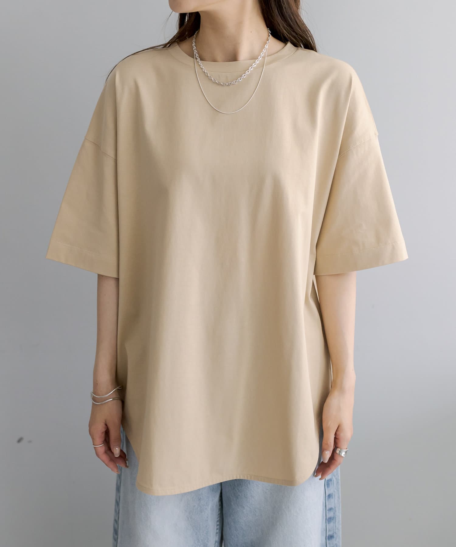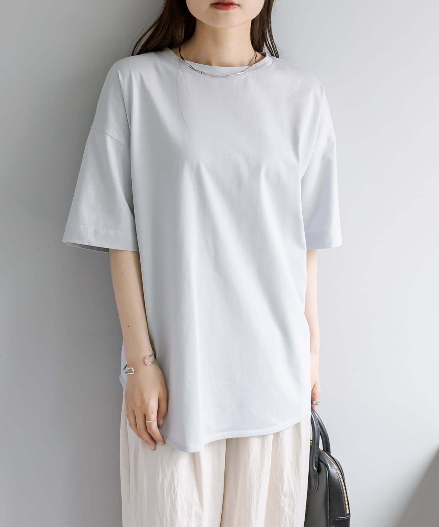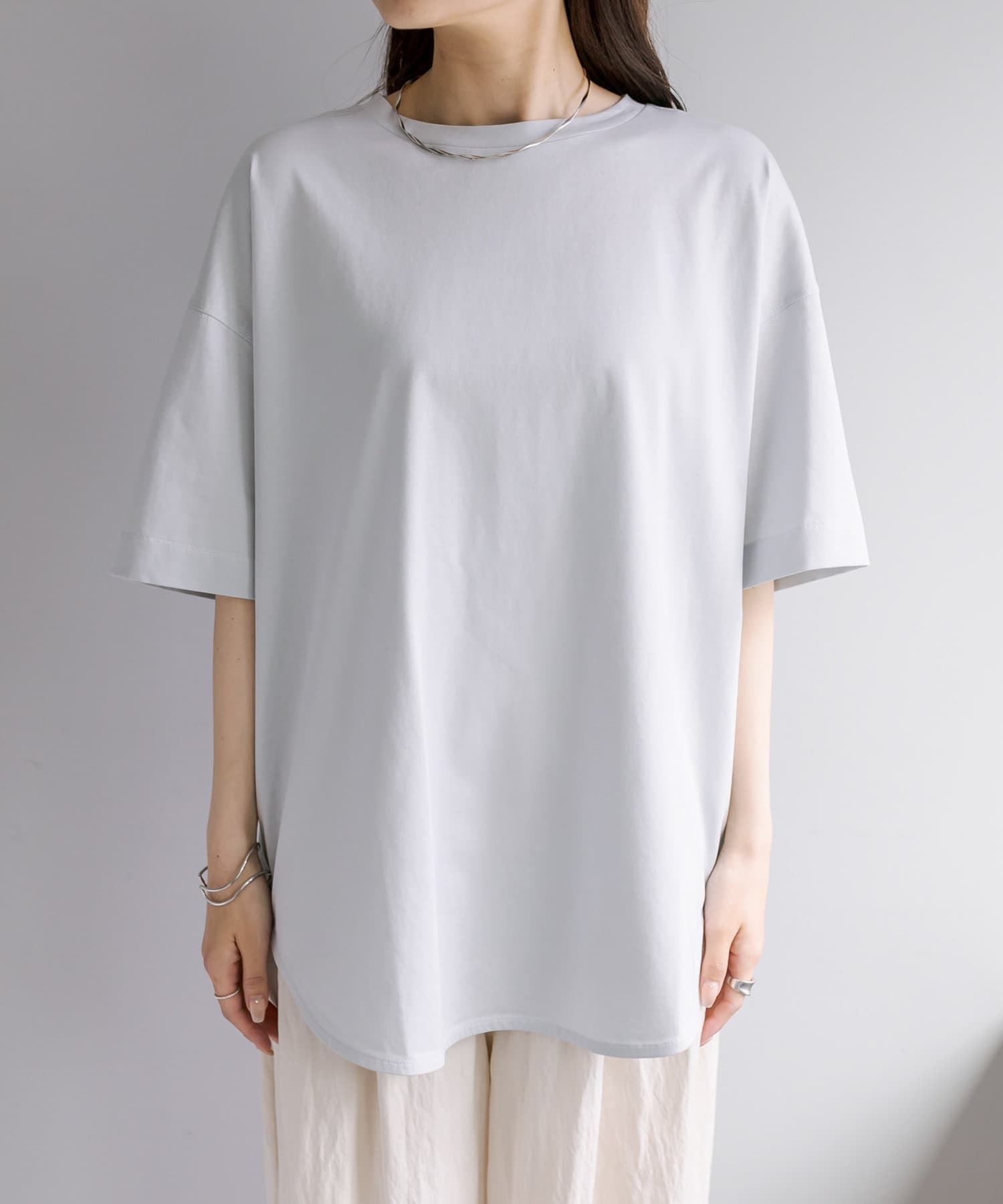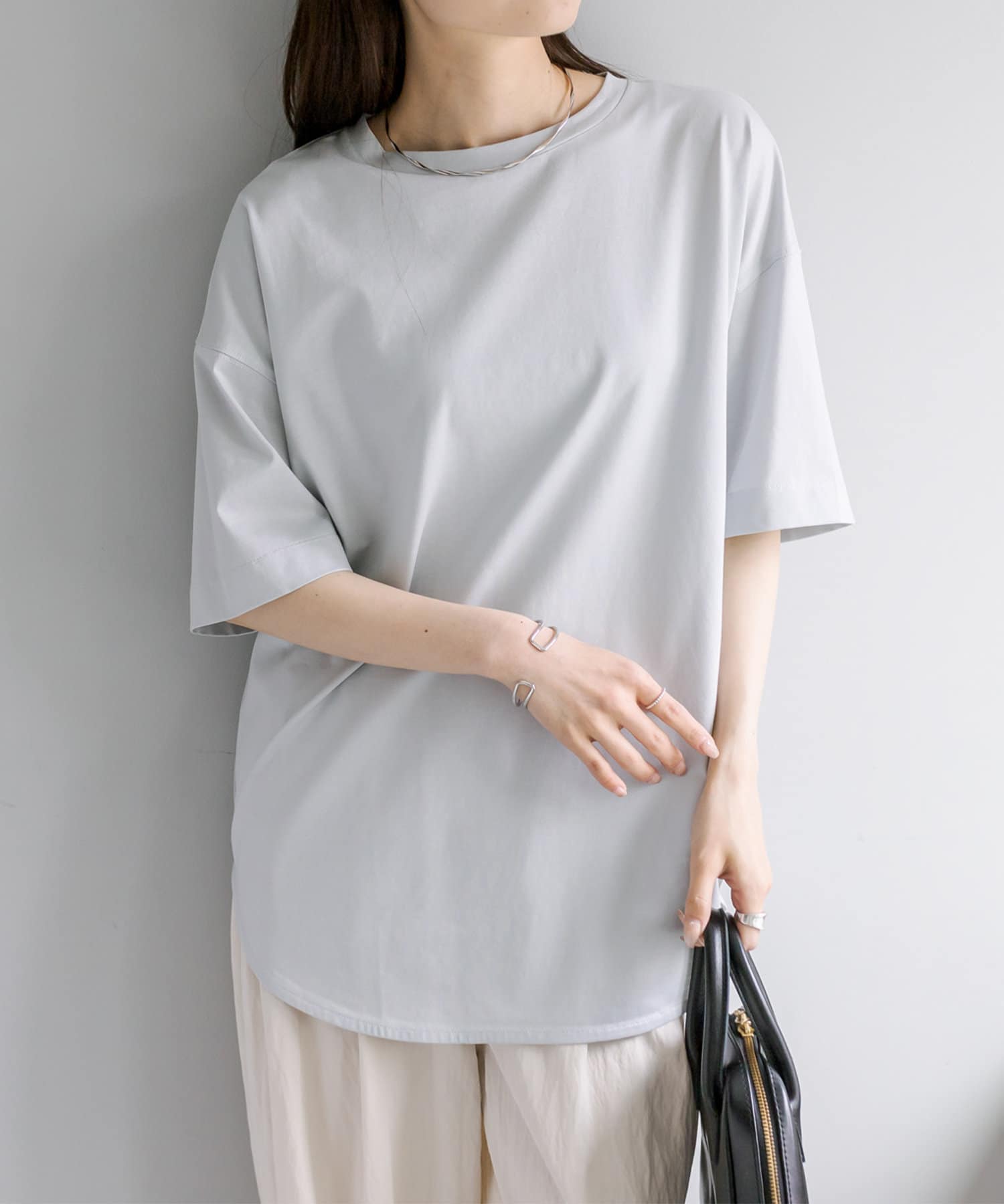 サラッとした生地が肌にベタつかずとても着心地が良かったです。一枚で着てもラウンドした裾がオシャレで着丈も気に入ってるのでもう一枚買う予定です。