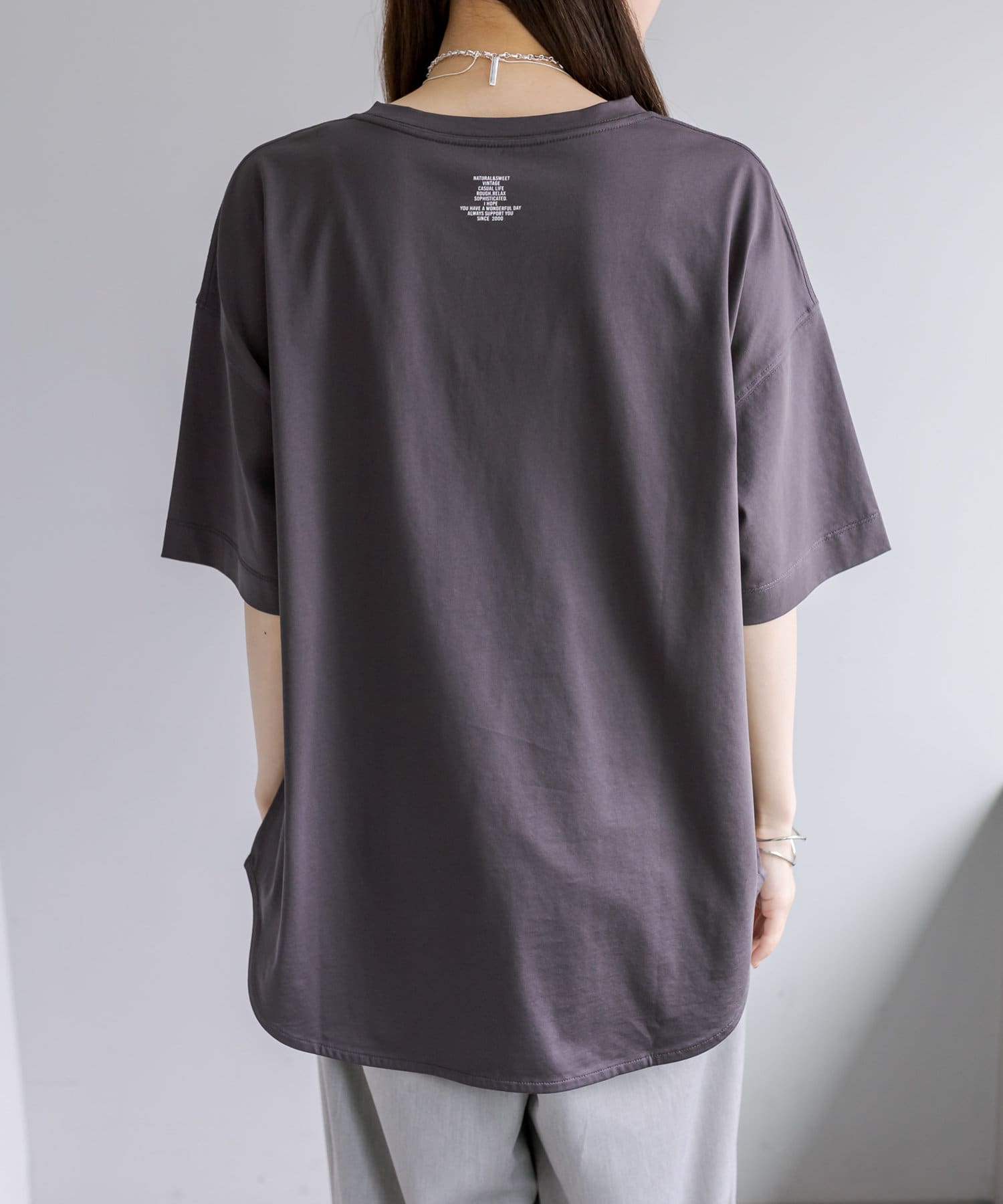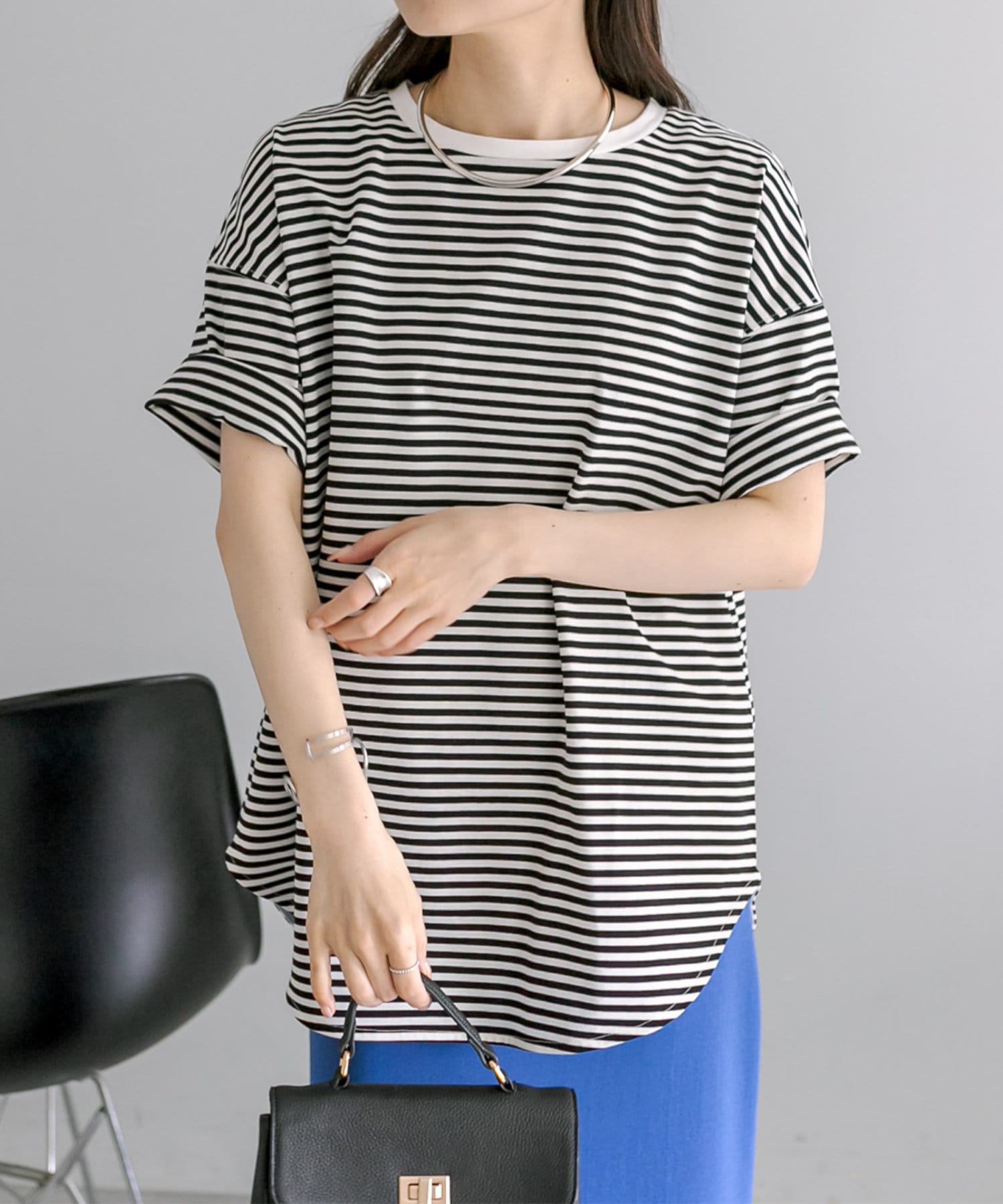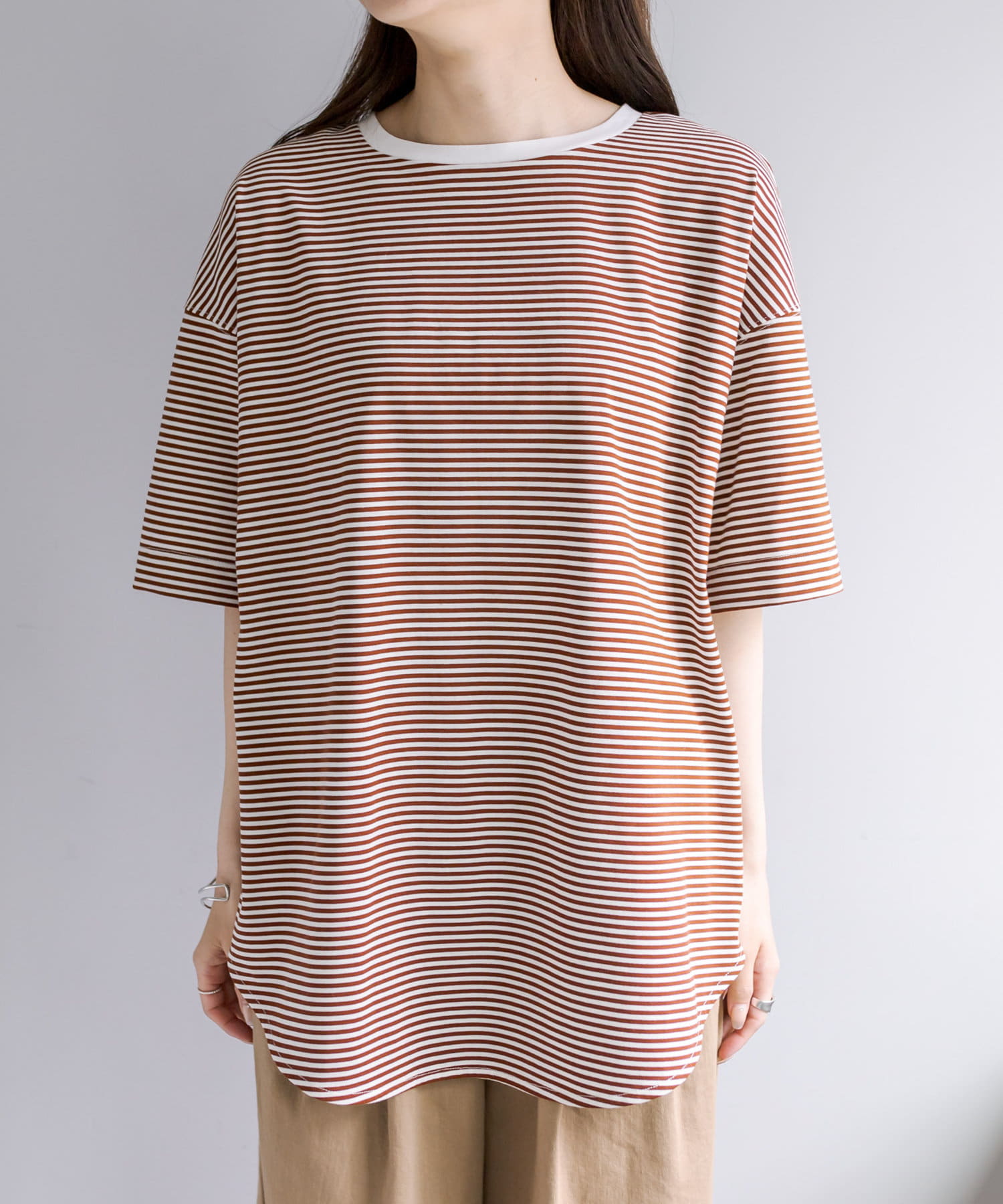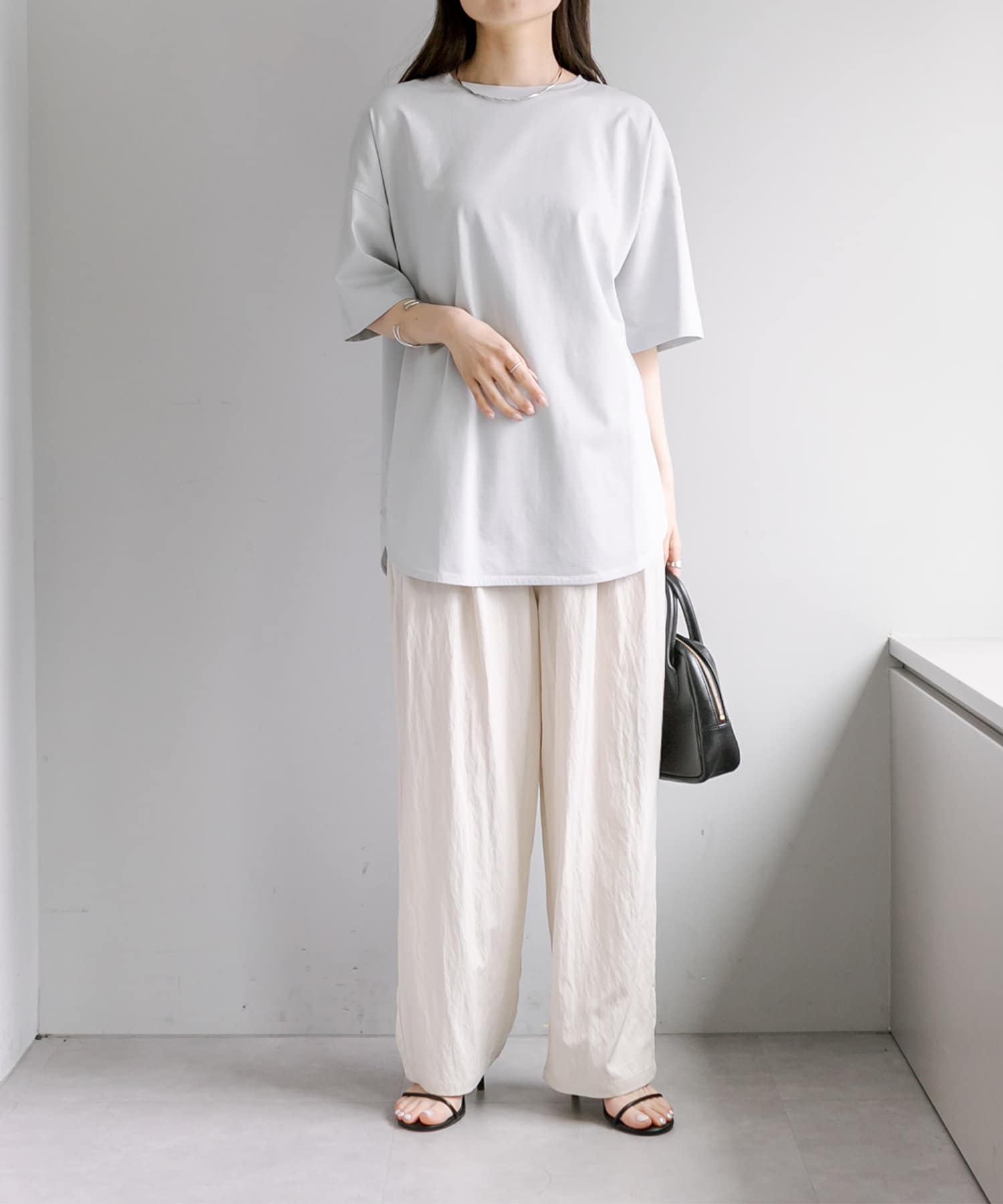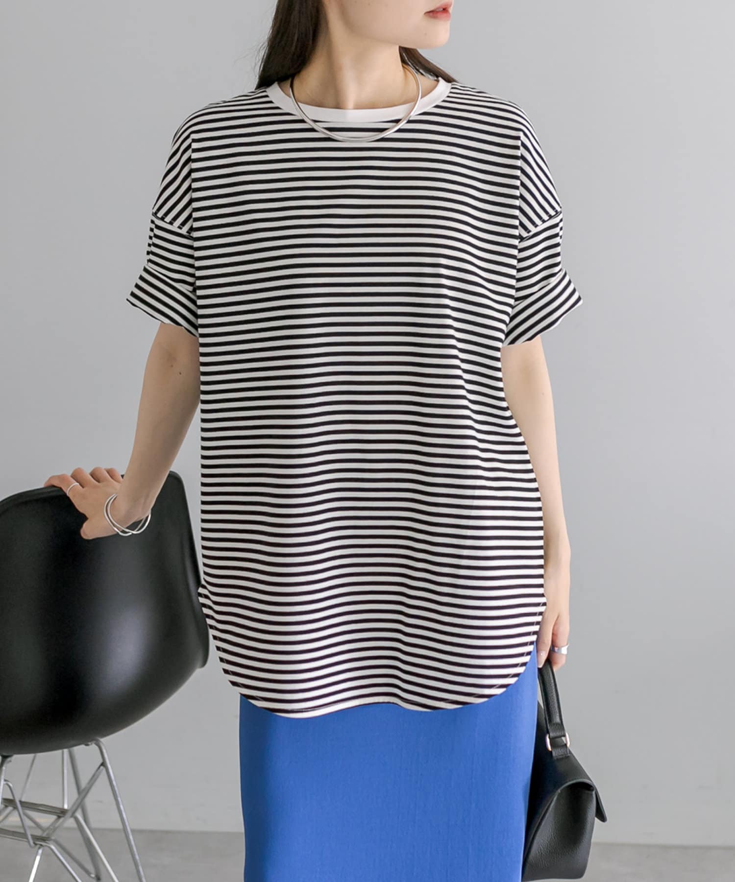 サラッとした生地が肌にベタつかずとても着心地が良かったです。一枚で着てもラウンドした裾がオシャレで着丈も気に入ってるのでもう一枚買う予定です。
