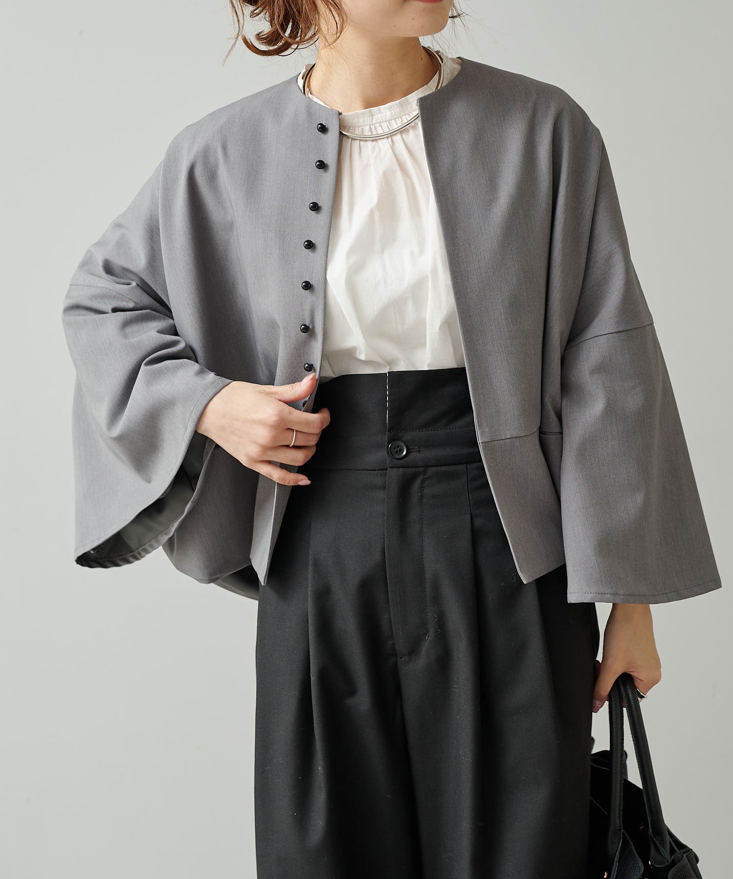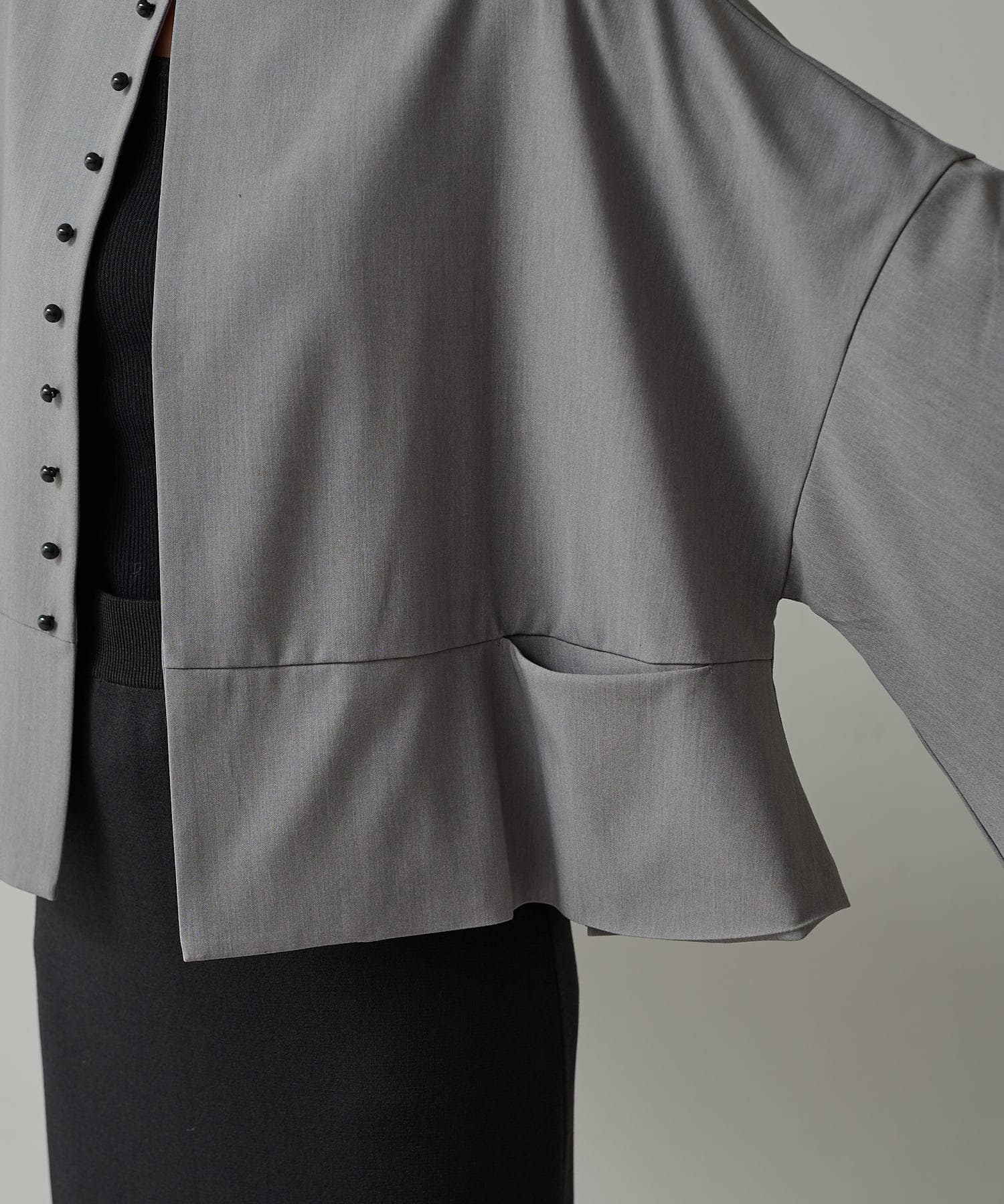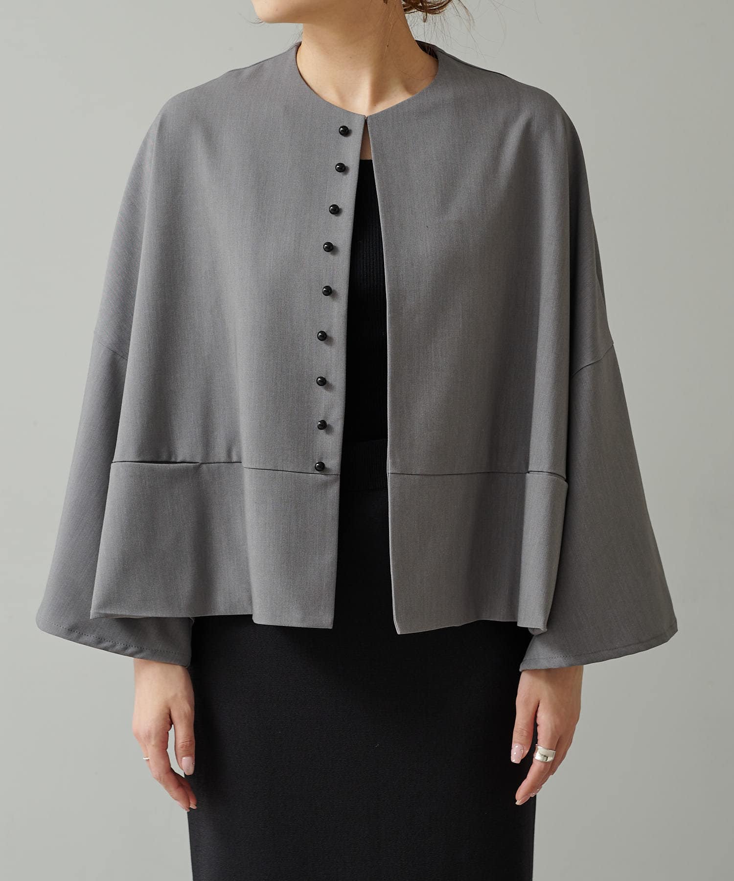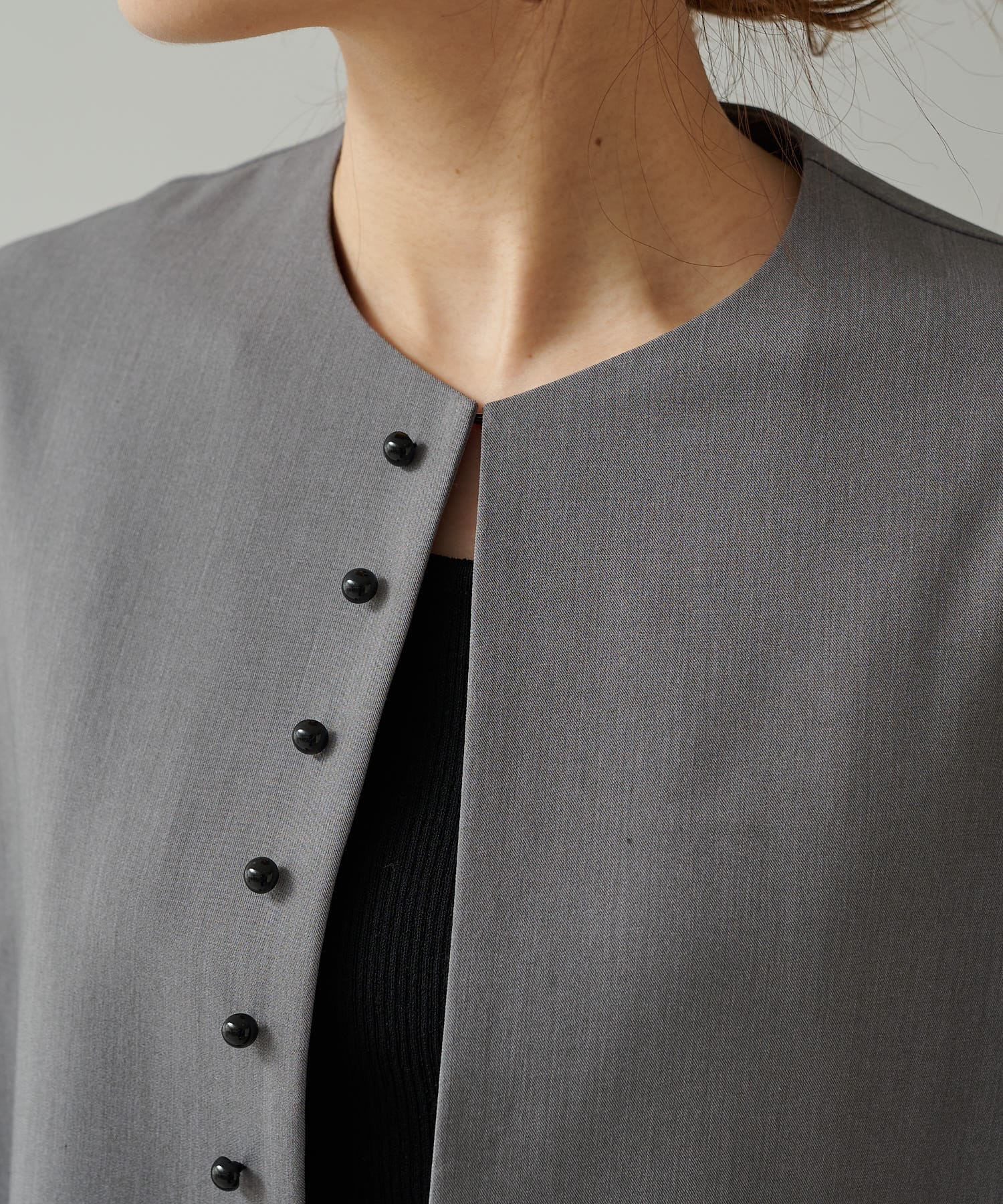 フロントの飾りボタンがアクセントになったノーカラージャケット。