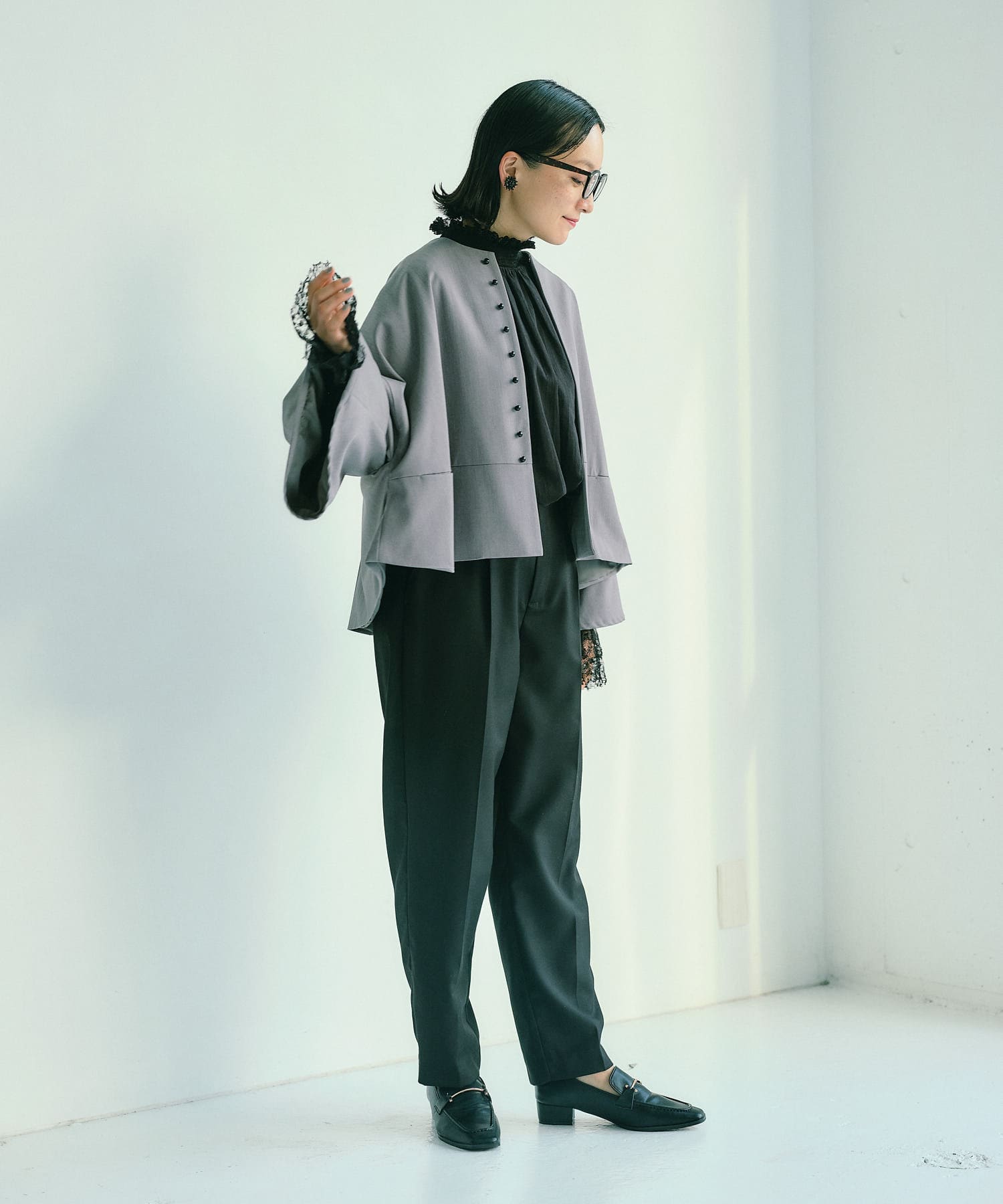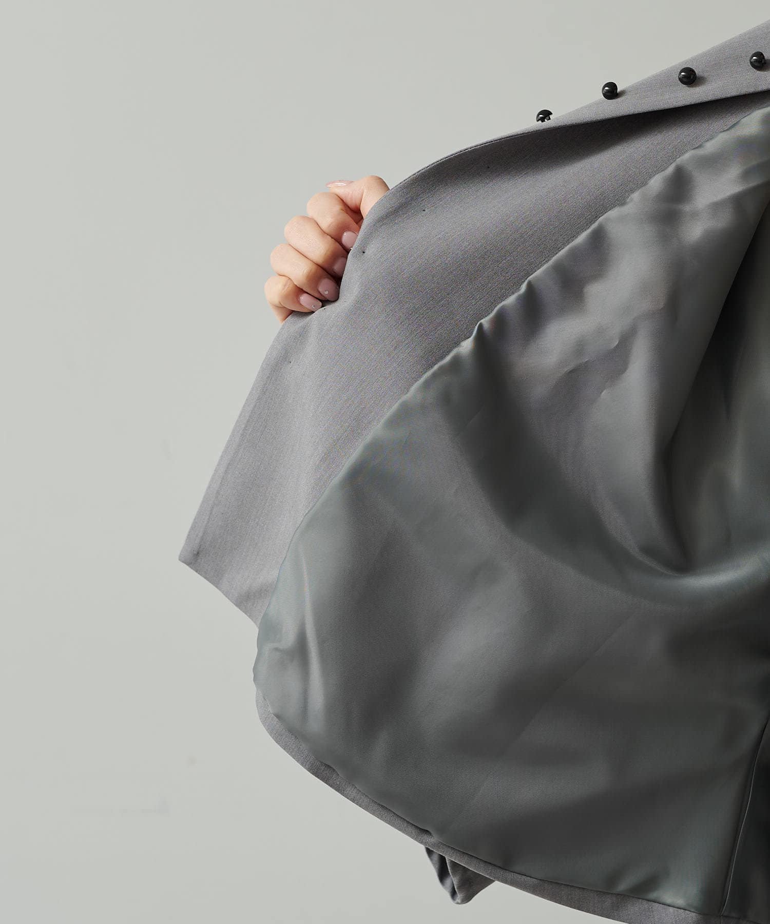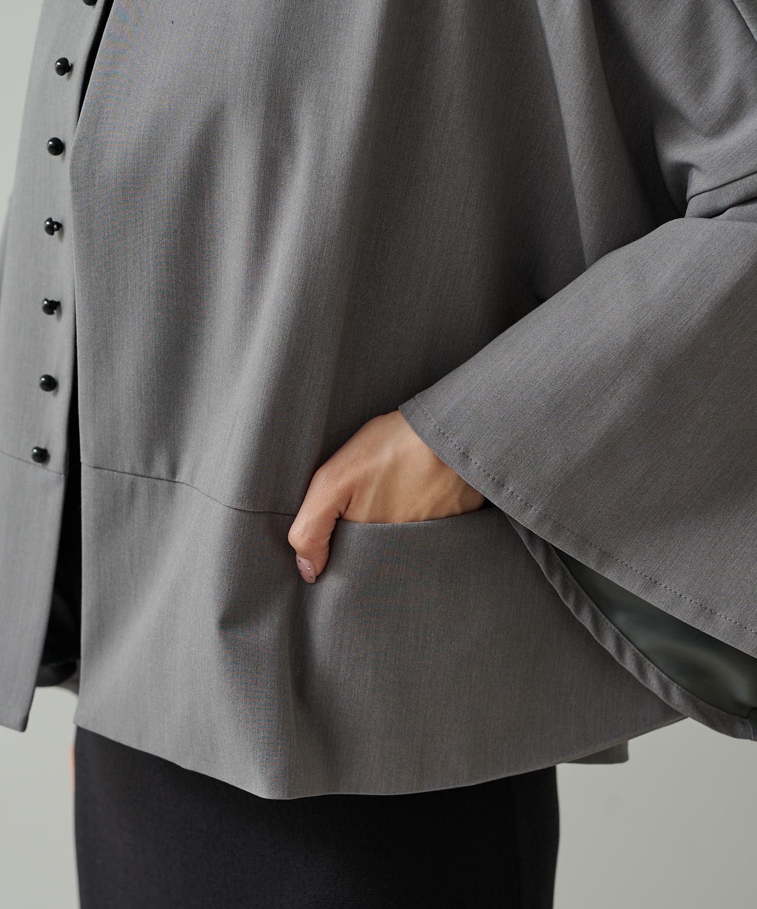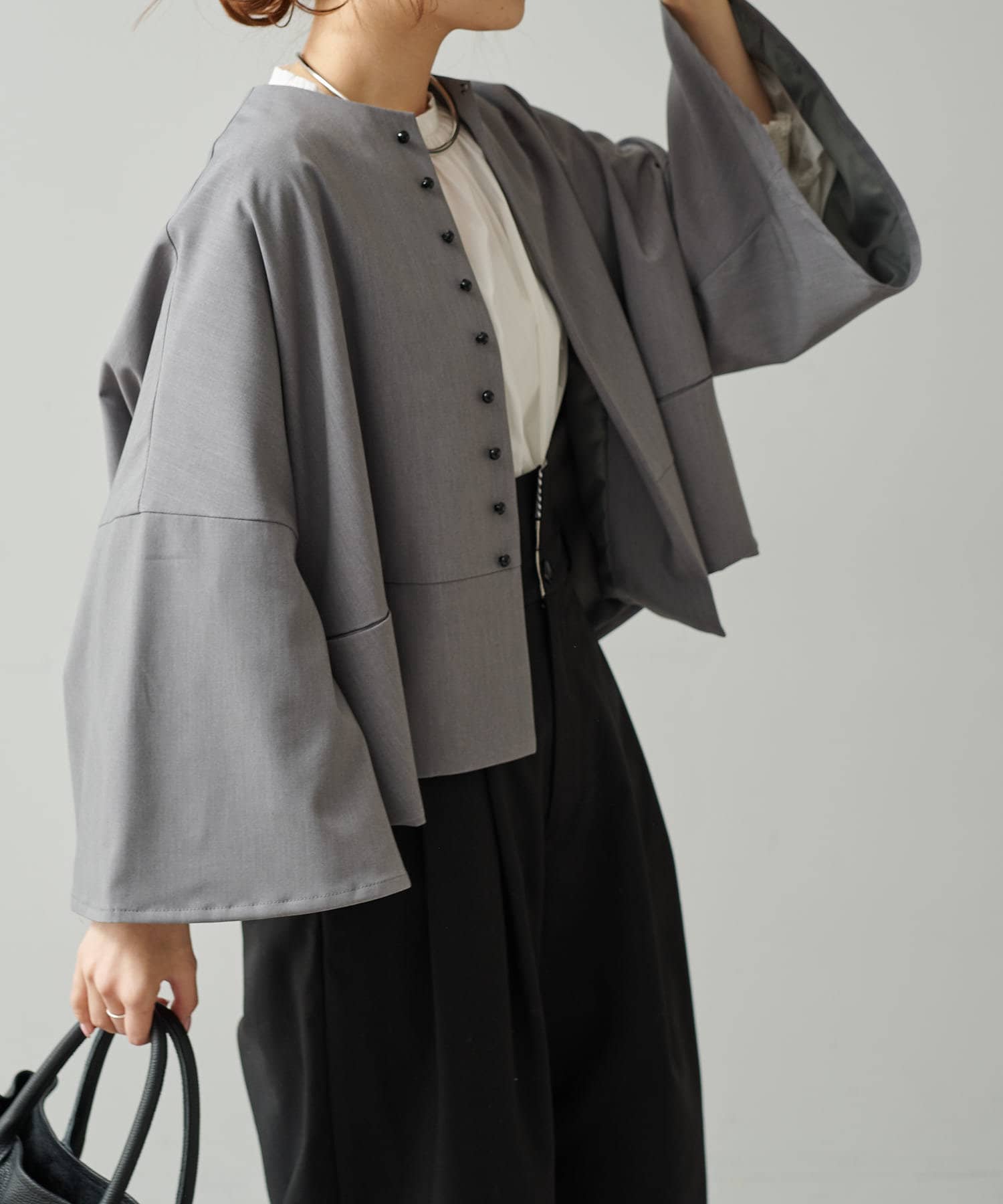 フロントの飾りボタンがアクセントになったノーカラージャケット。