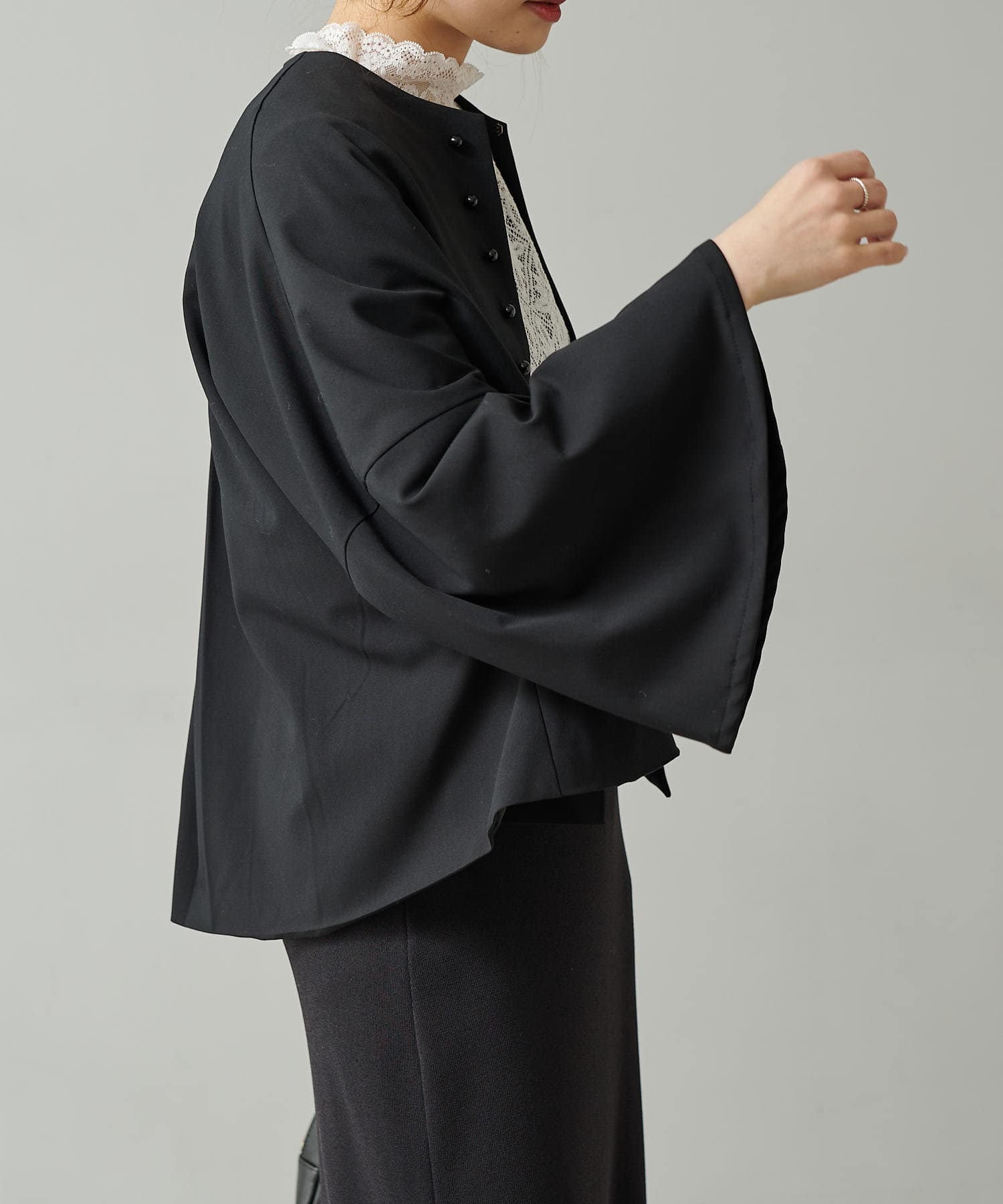 ノーカラーなのでレースが施されたハイネックインナーや