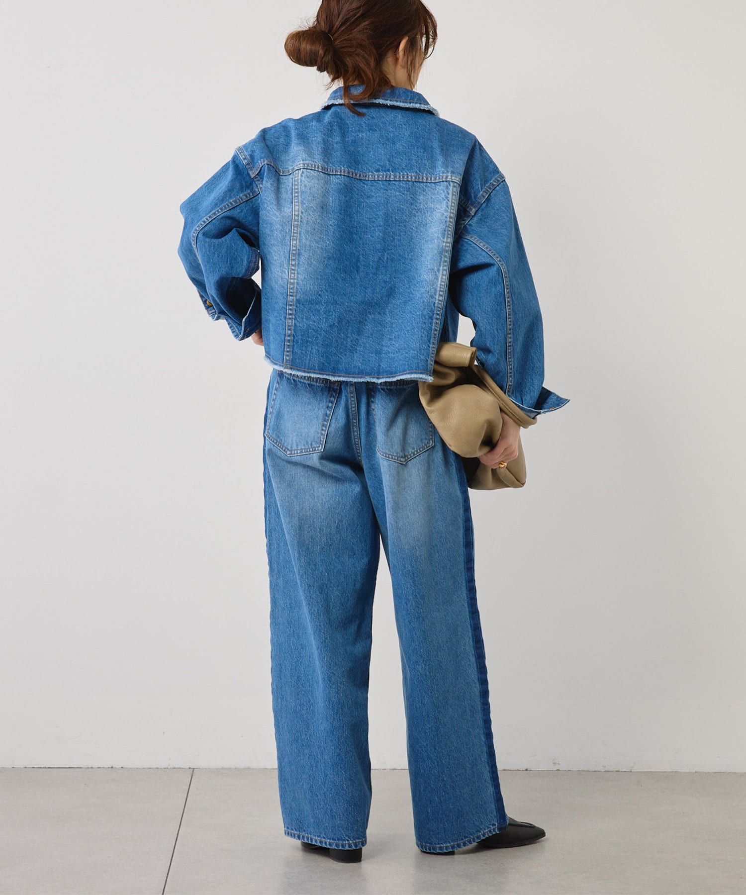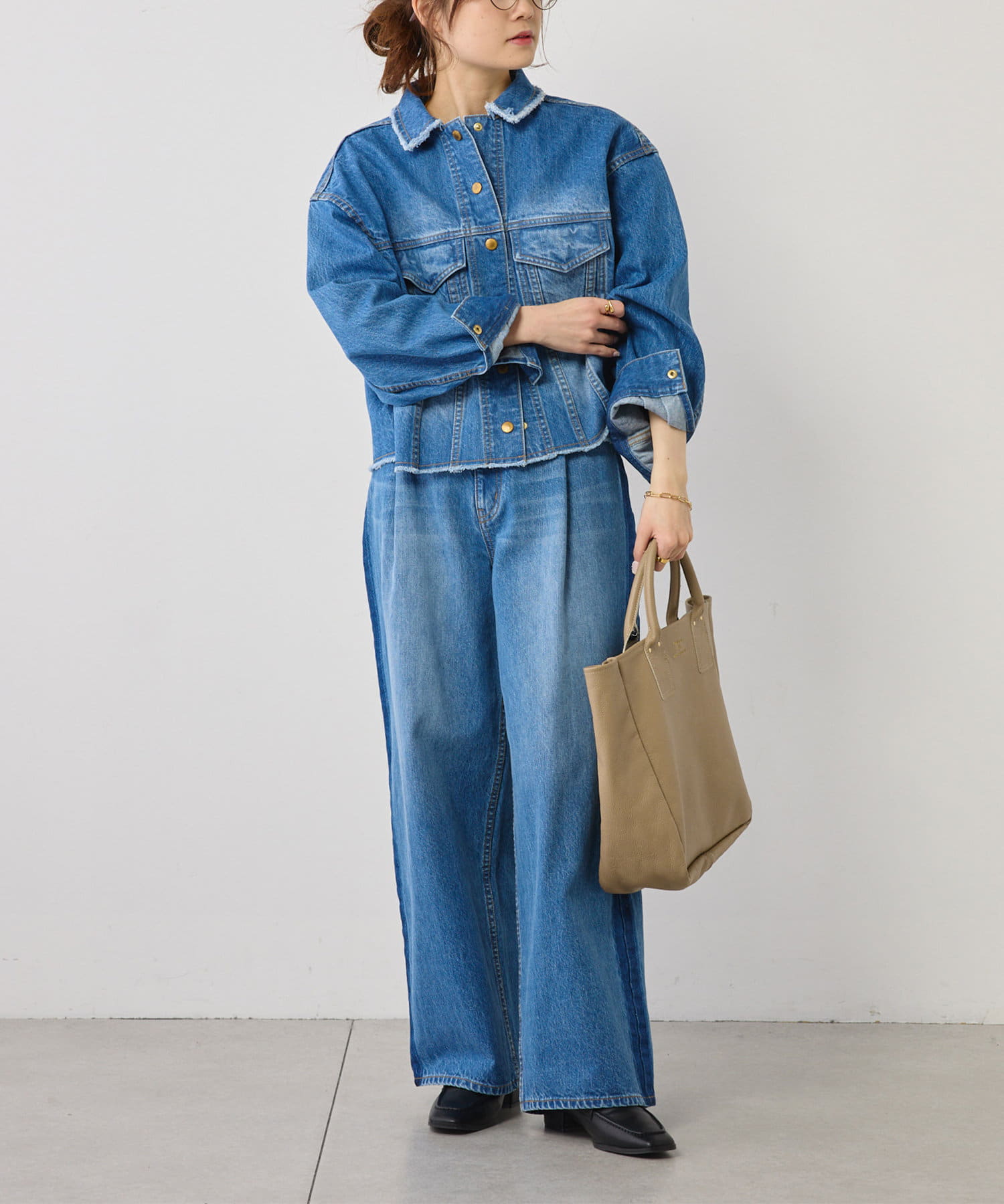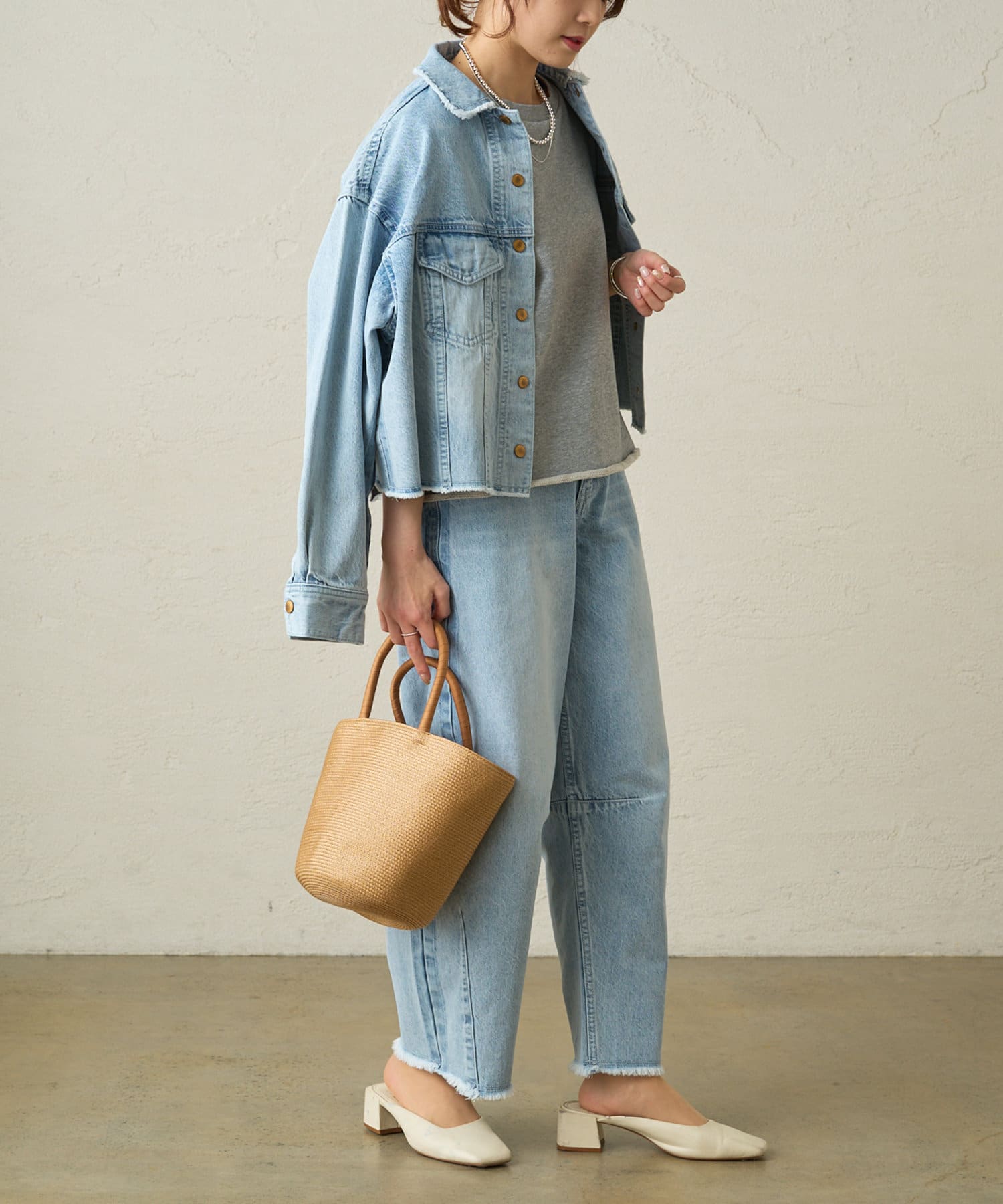 ワンピースやスラックスを合わせたきれいめアイテムとも相性抜群。同色のデニムパンツと合わせたセットアップ風な着こなしもおすすめです。