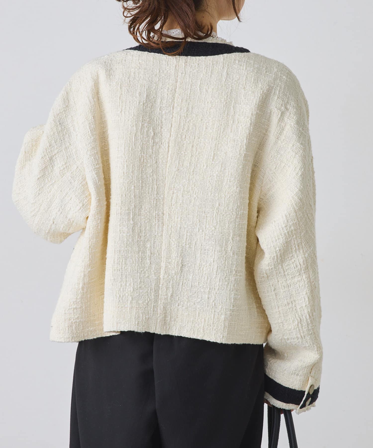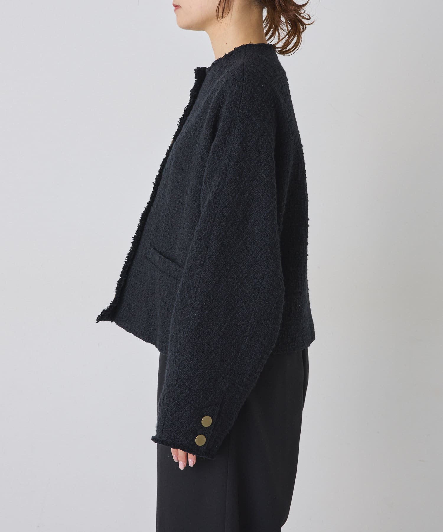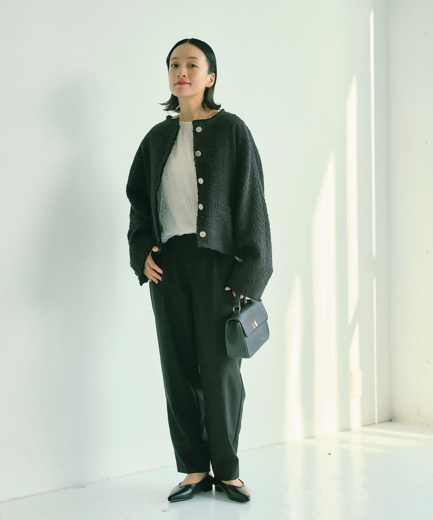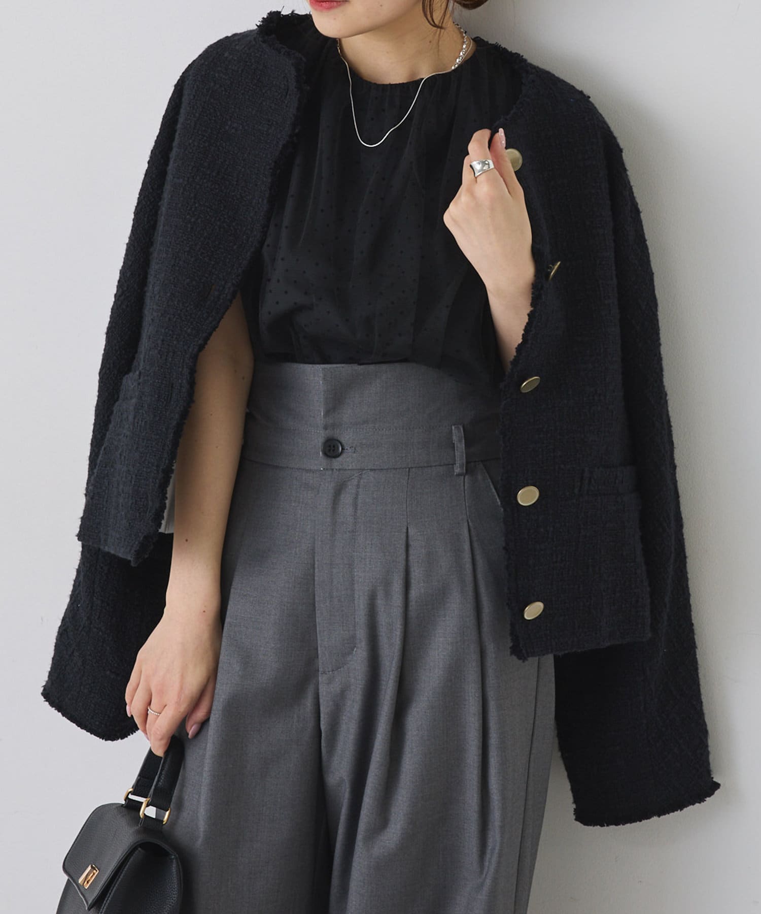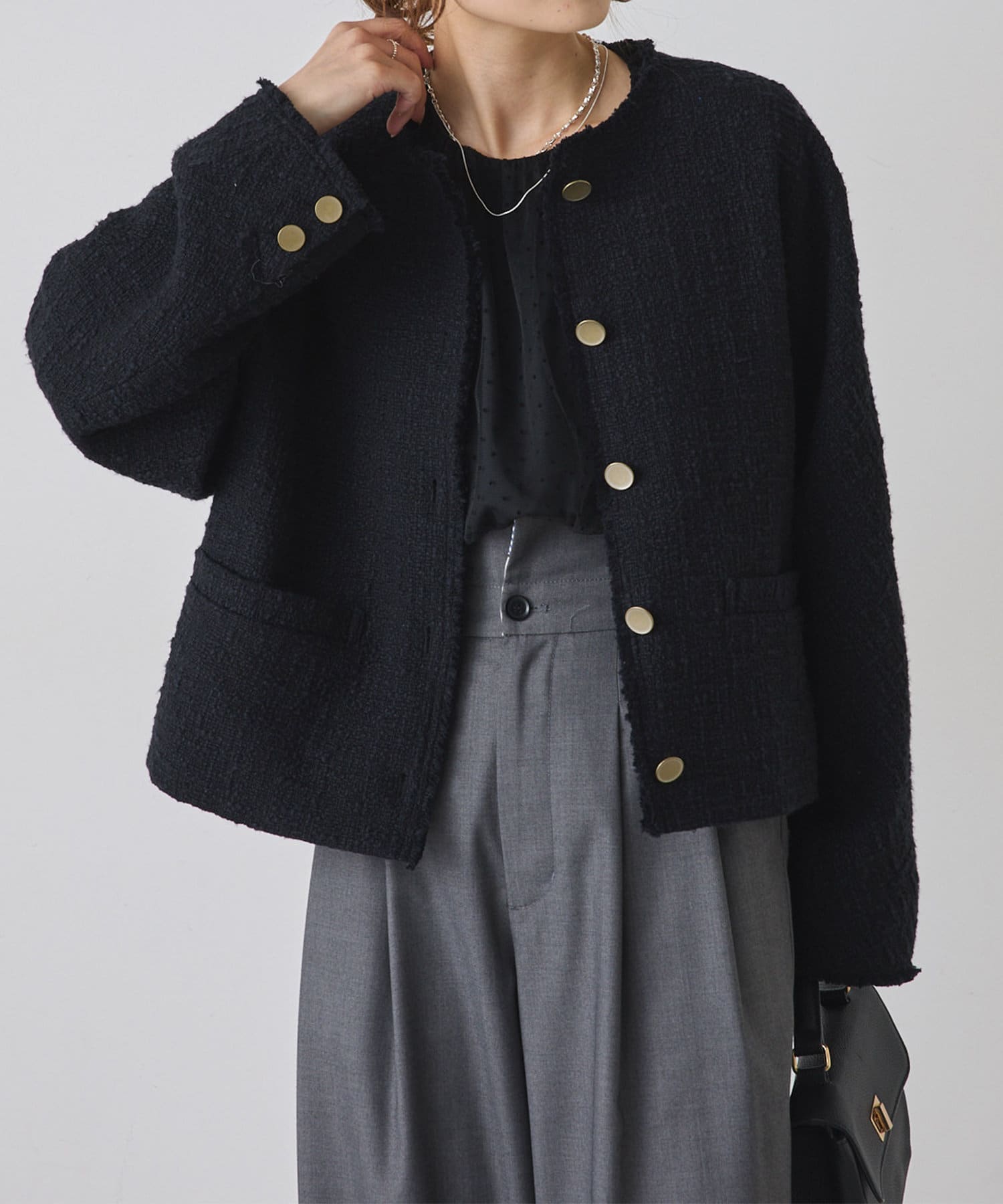 ブラックは単一カラーながらも、ツイードの素材感が華やかさを醸し出しつつ、