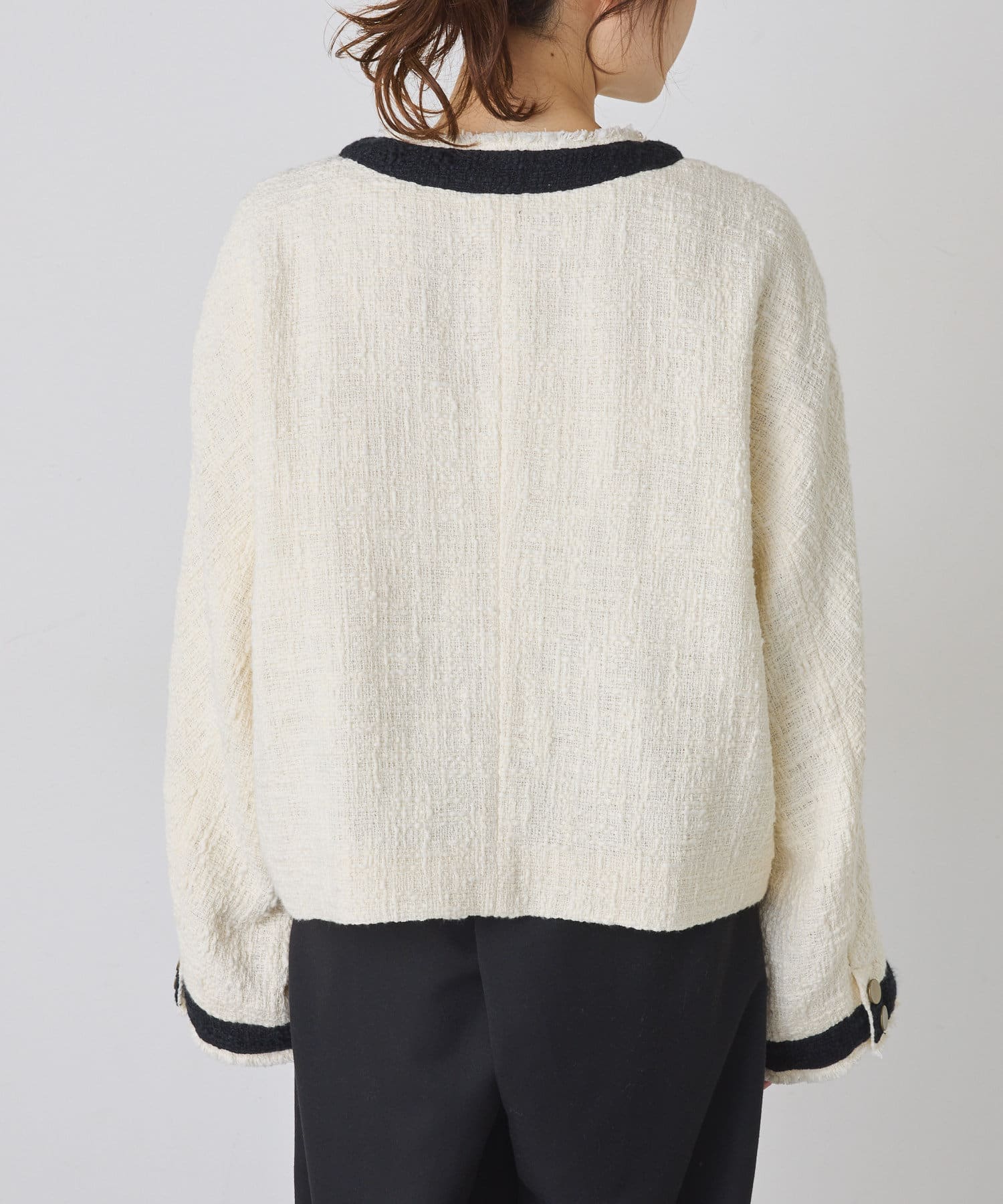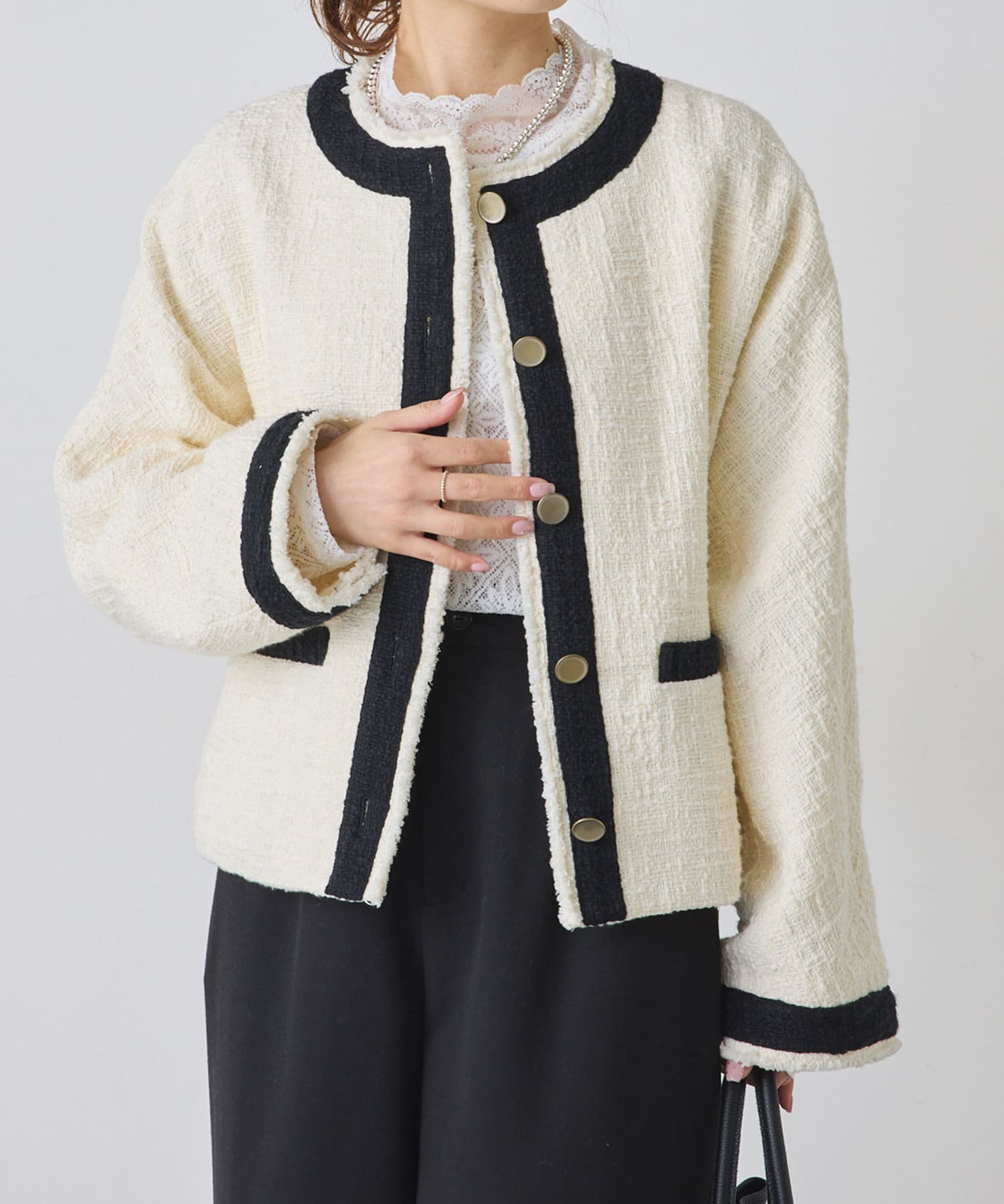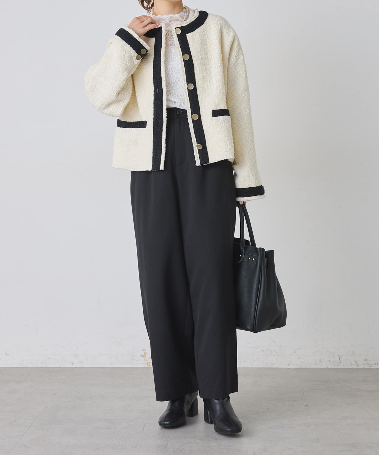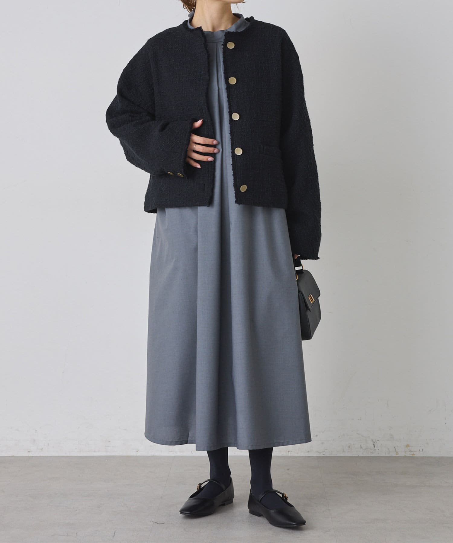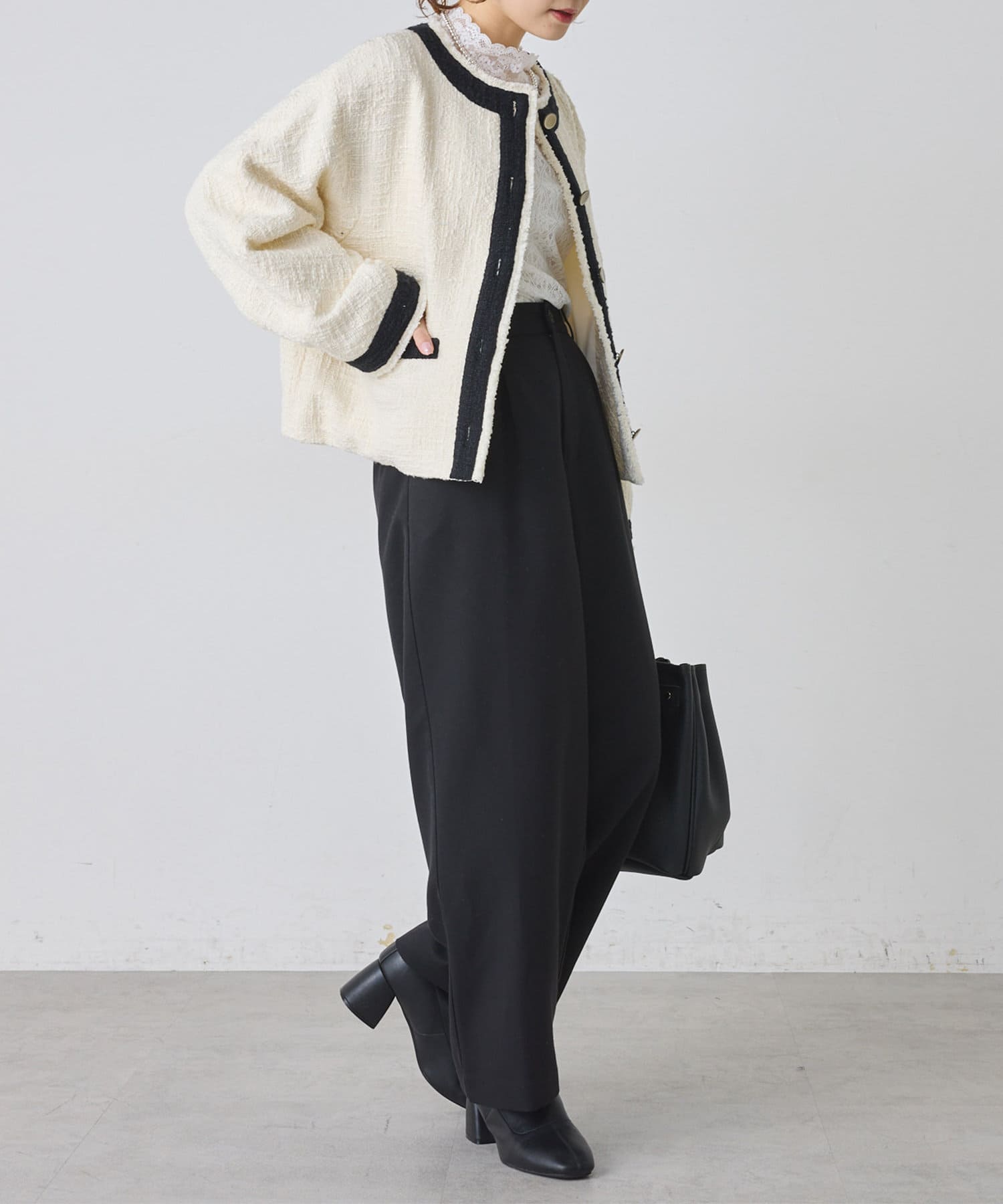 ブラックは単一カラーながらも、ツイードの素材感が華やかさを醸し出しつつ、