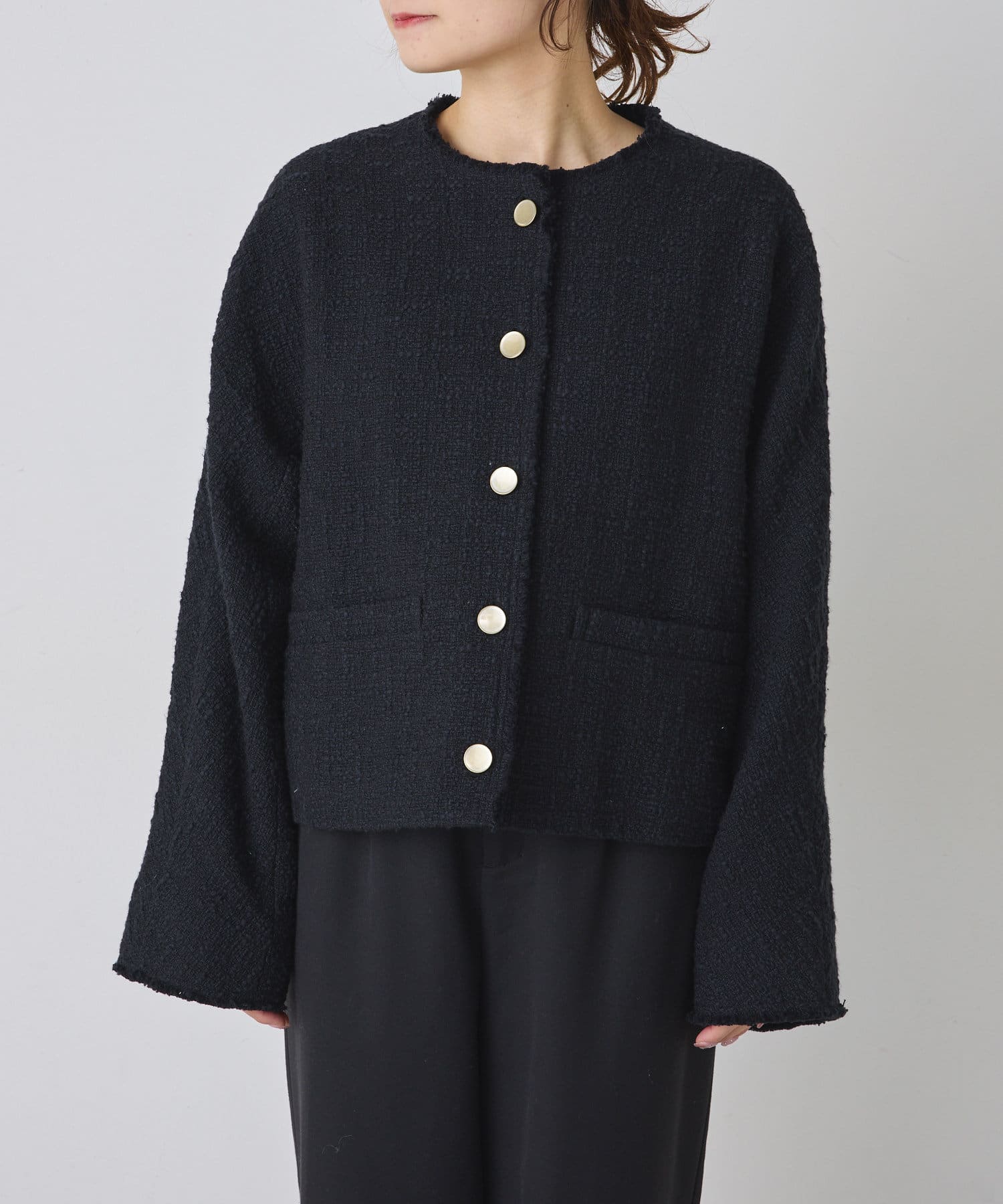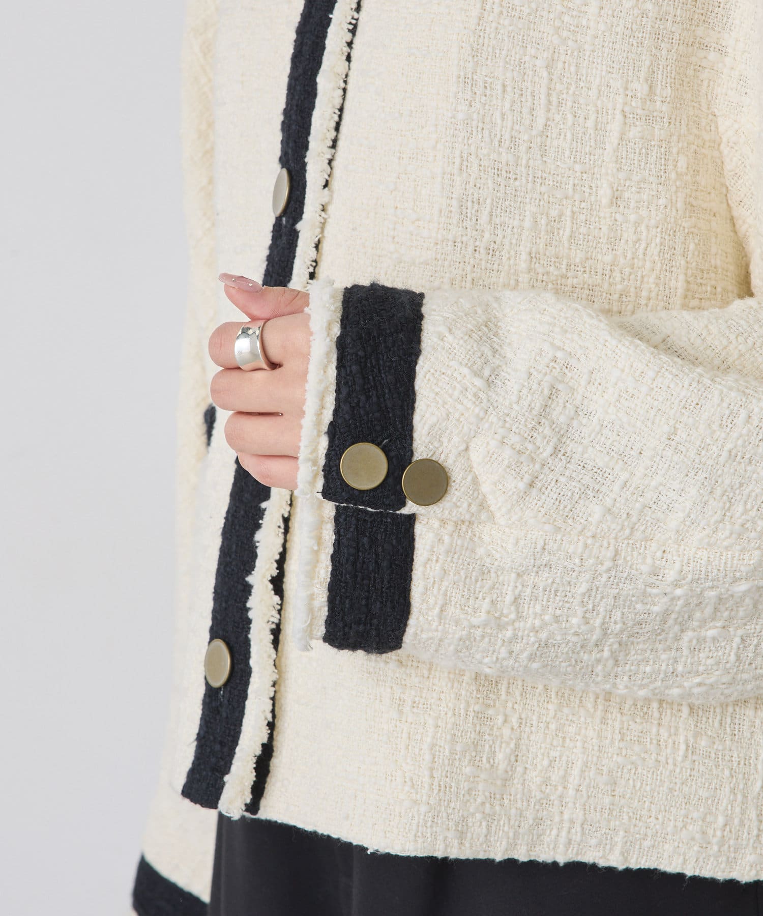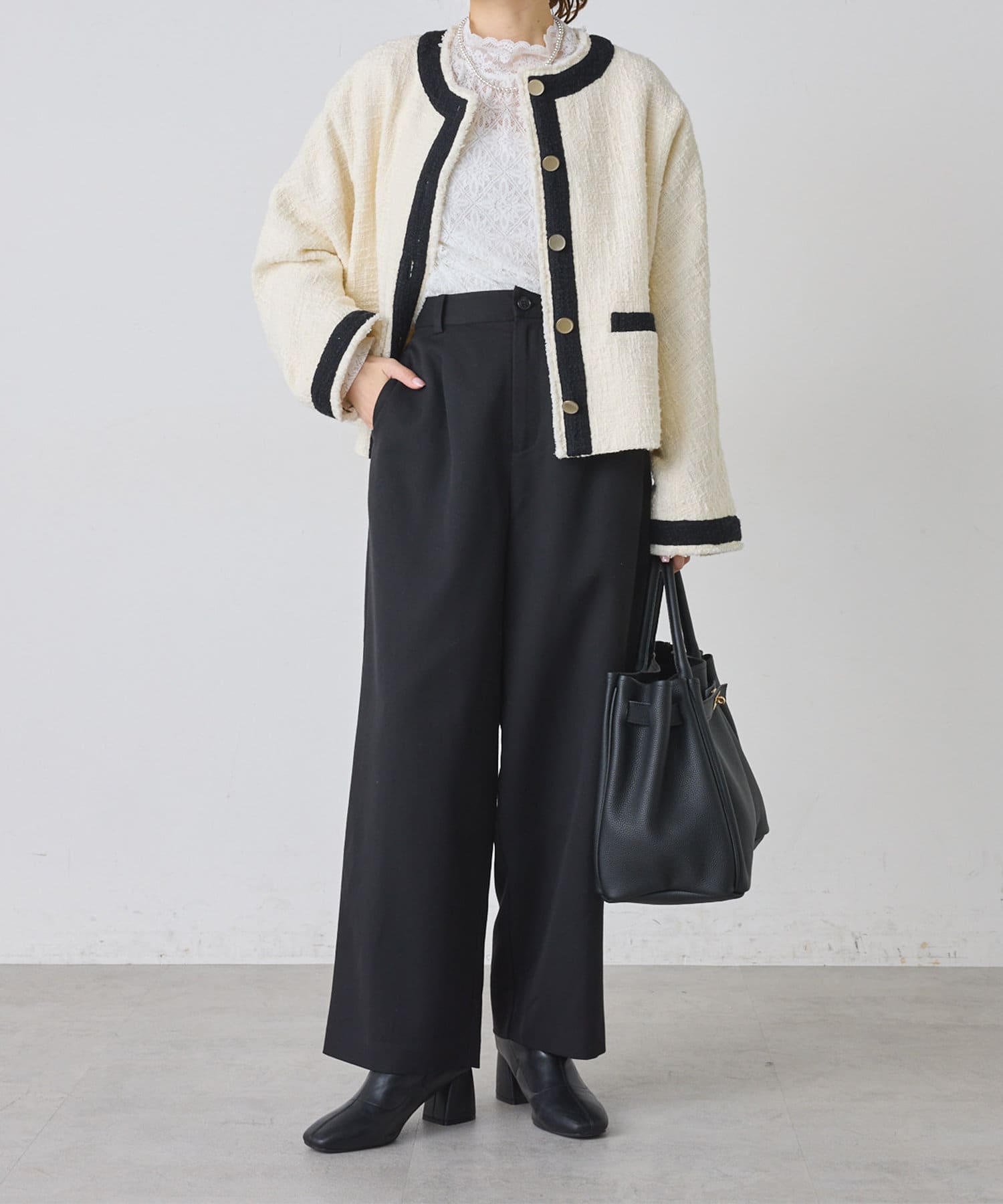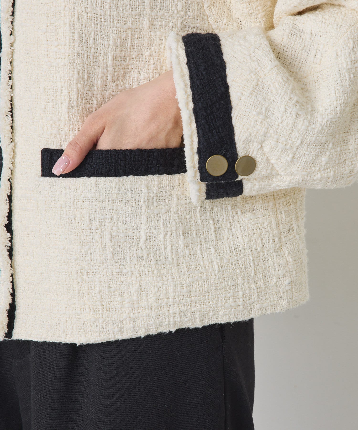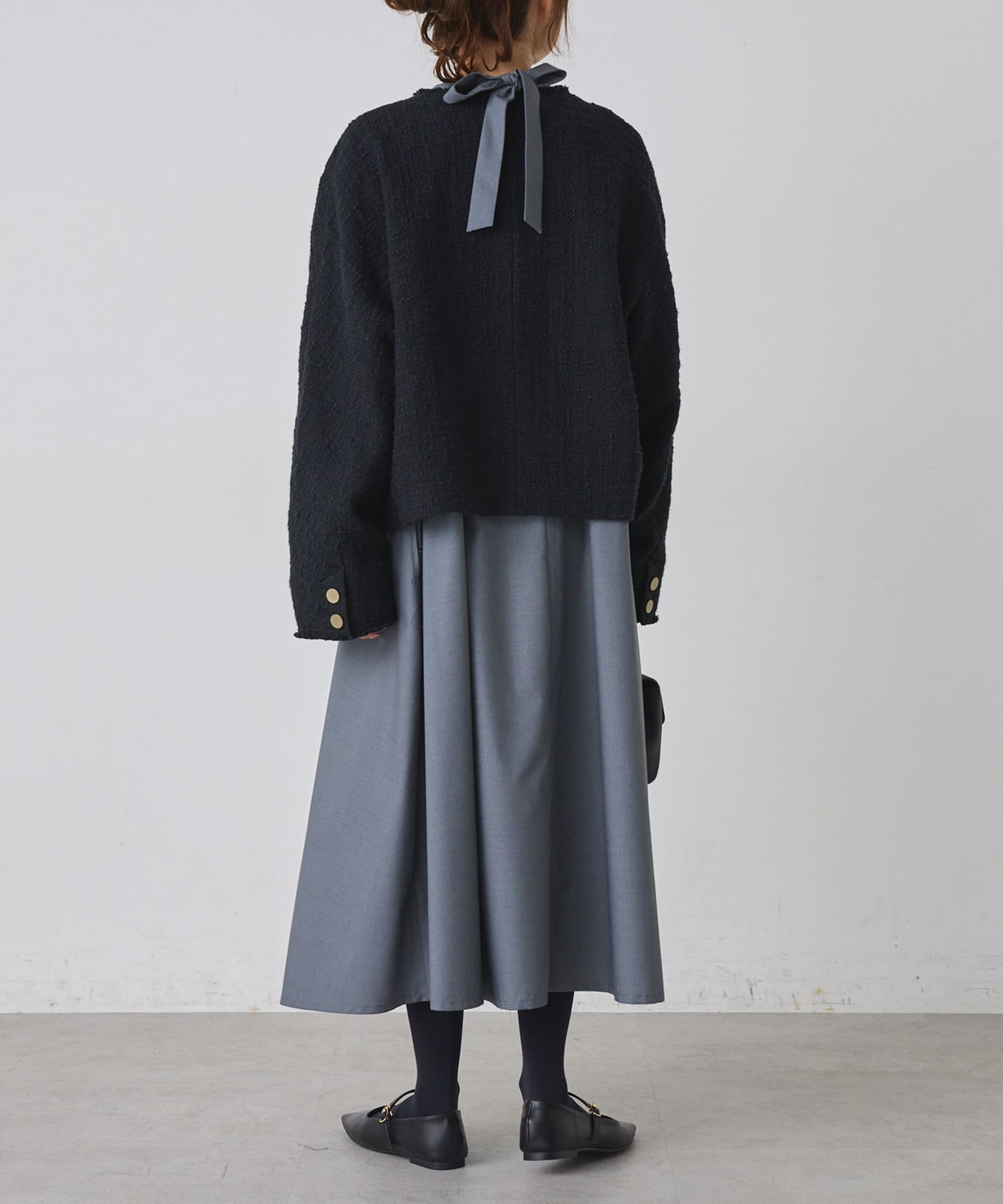 ブラックは単一カラーながらも、ツイードの素材感が華やかさを醸し出しつつ、