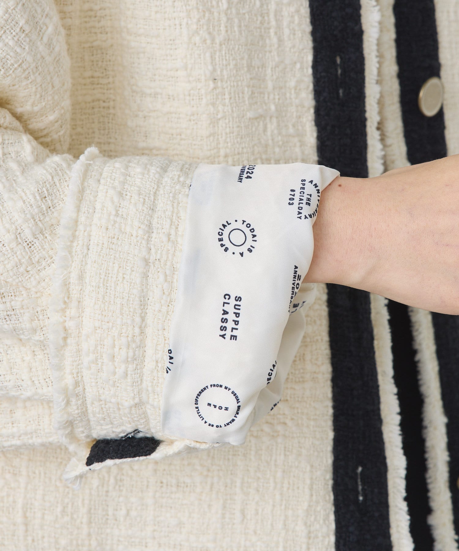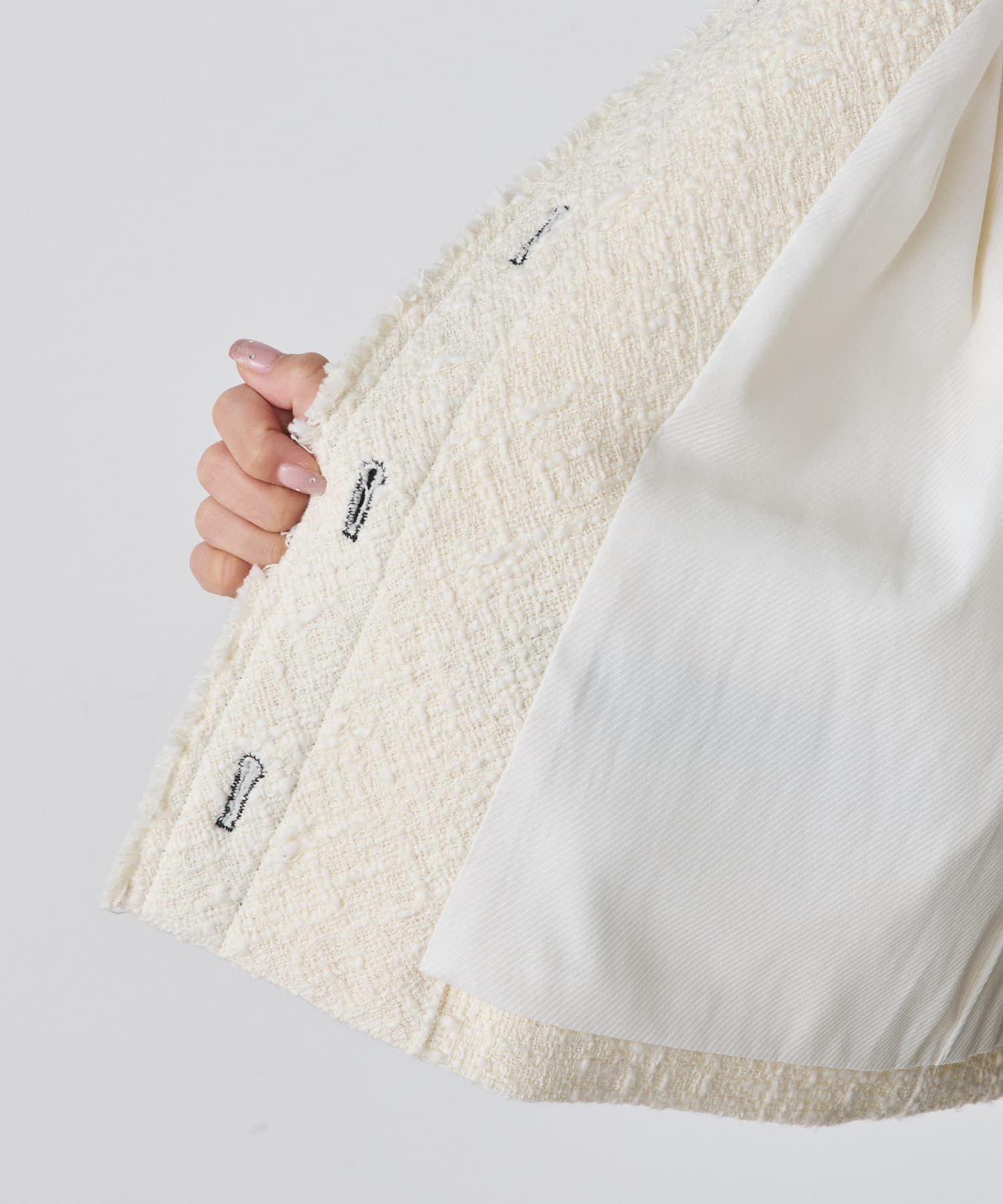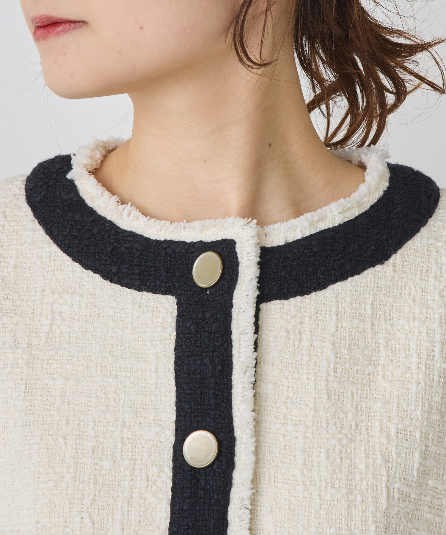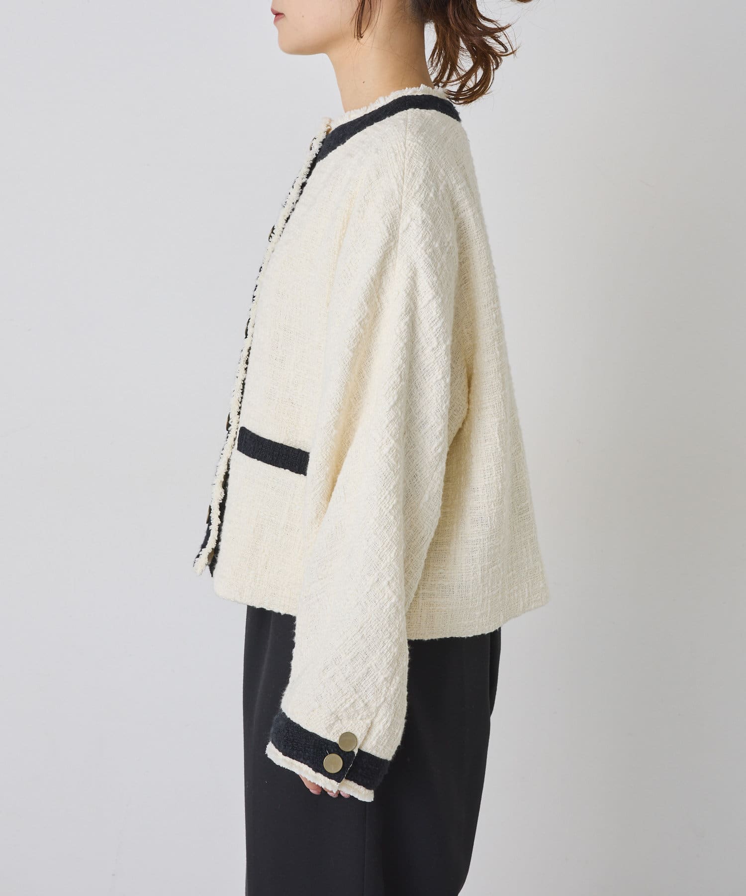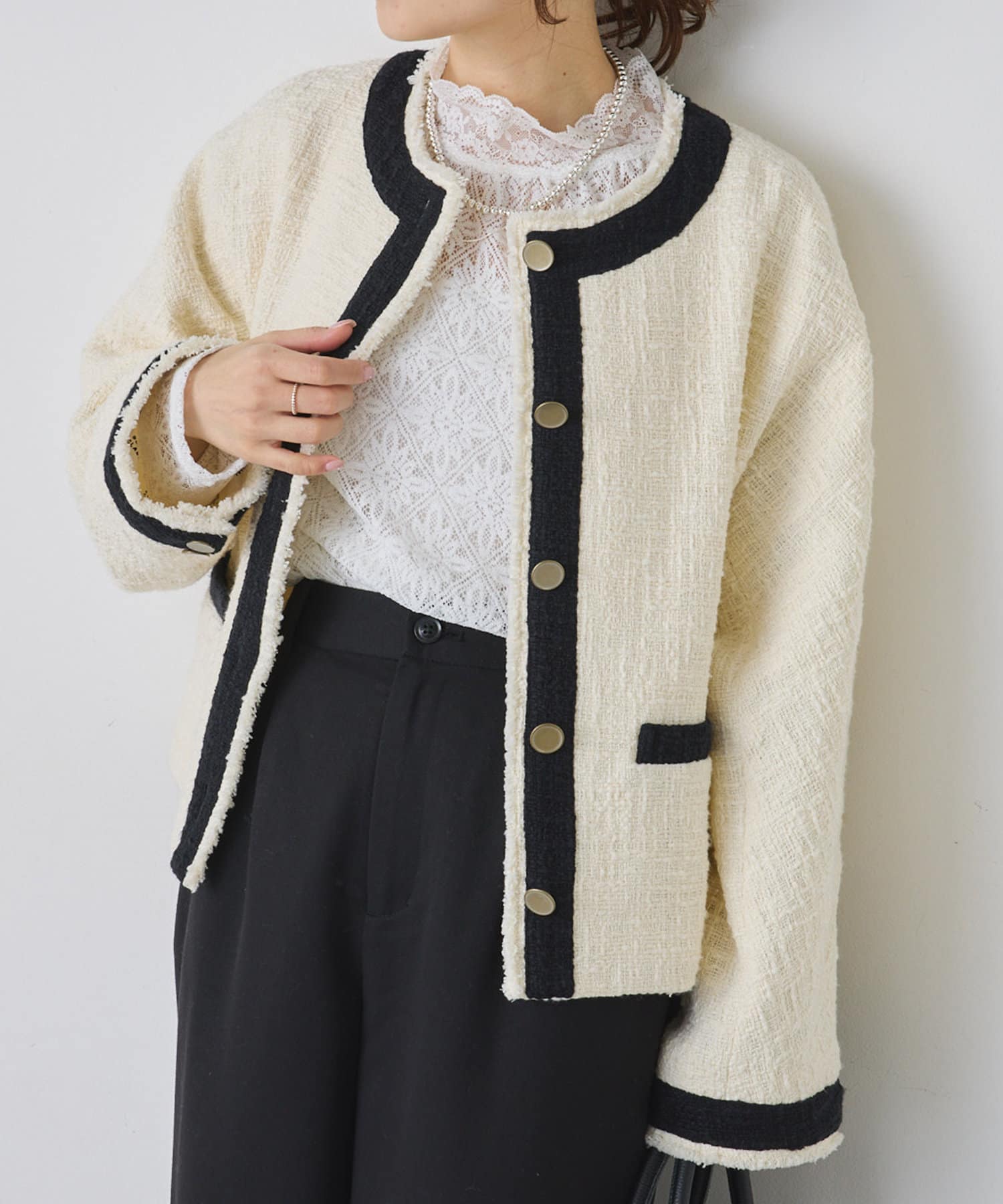 ブラックは単一カラーながらも、ツイードの素材感が華やかさを醸し出しつつ、