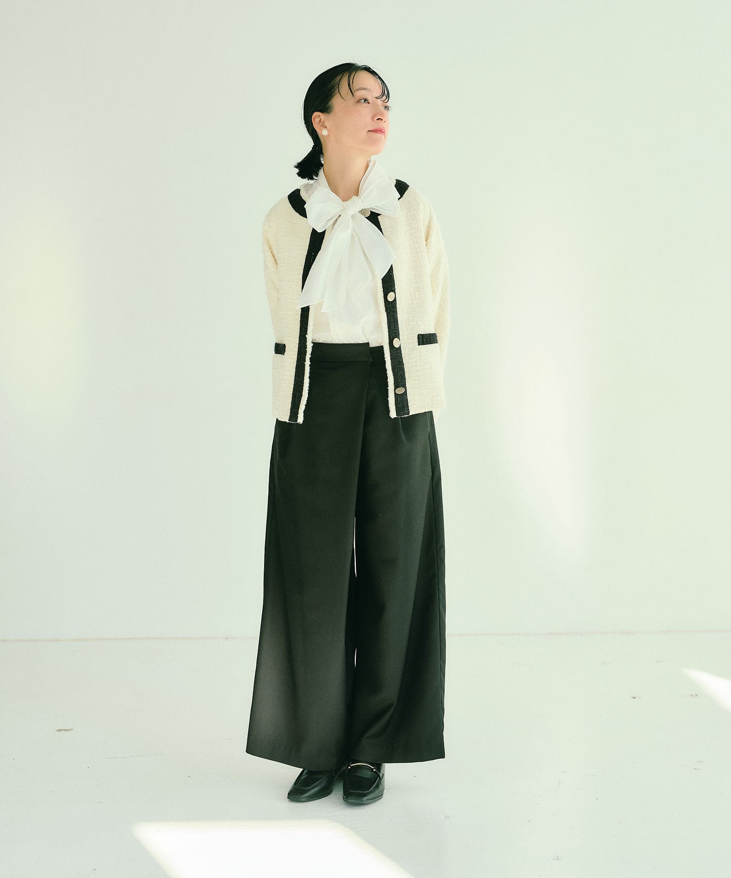 ボウタイリボンブラウスやシャツを合わせていただくとオケージョンなどフォーマルなシーンに活躍してくれます。