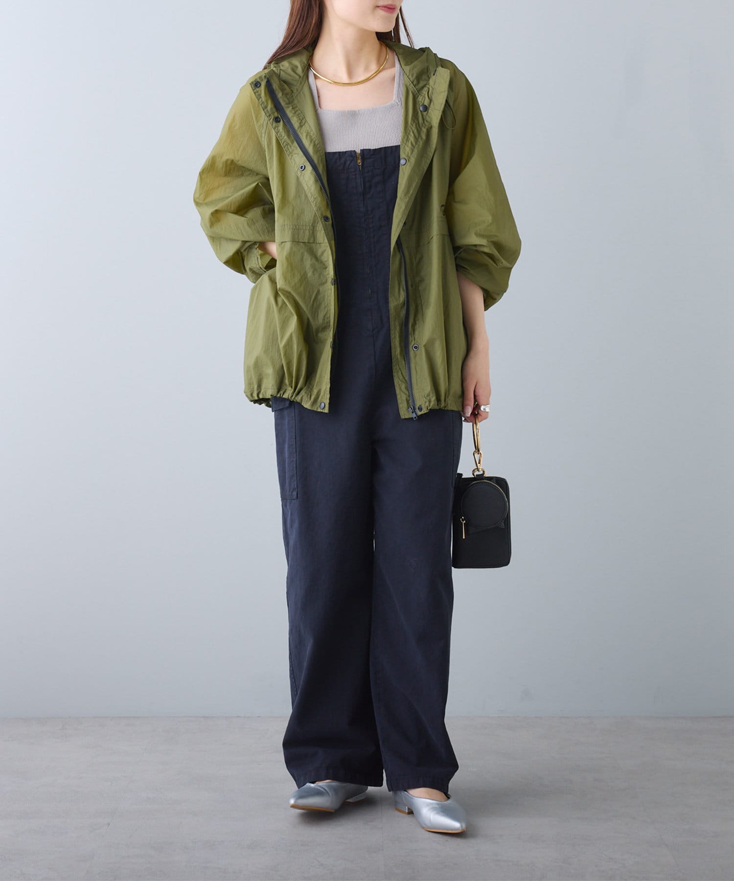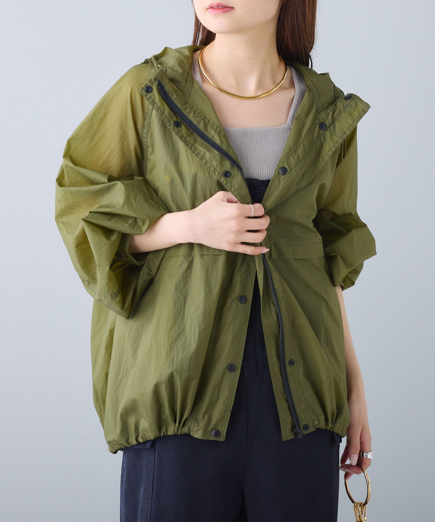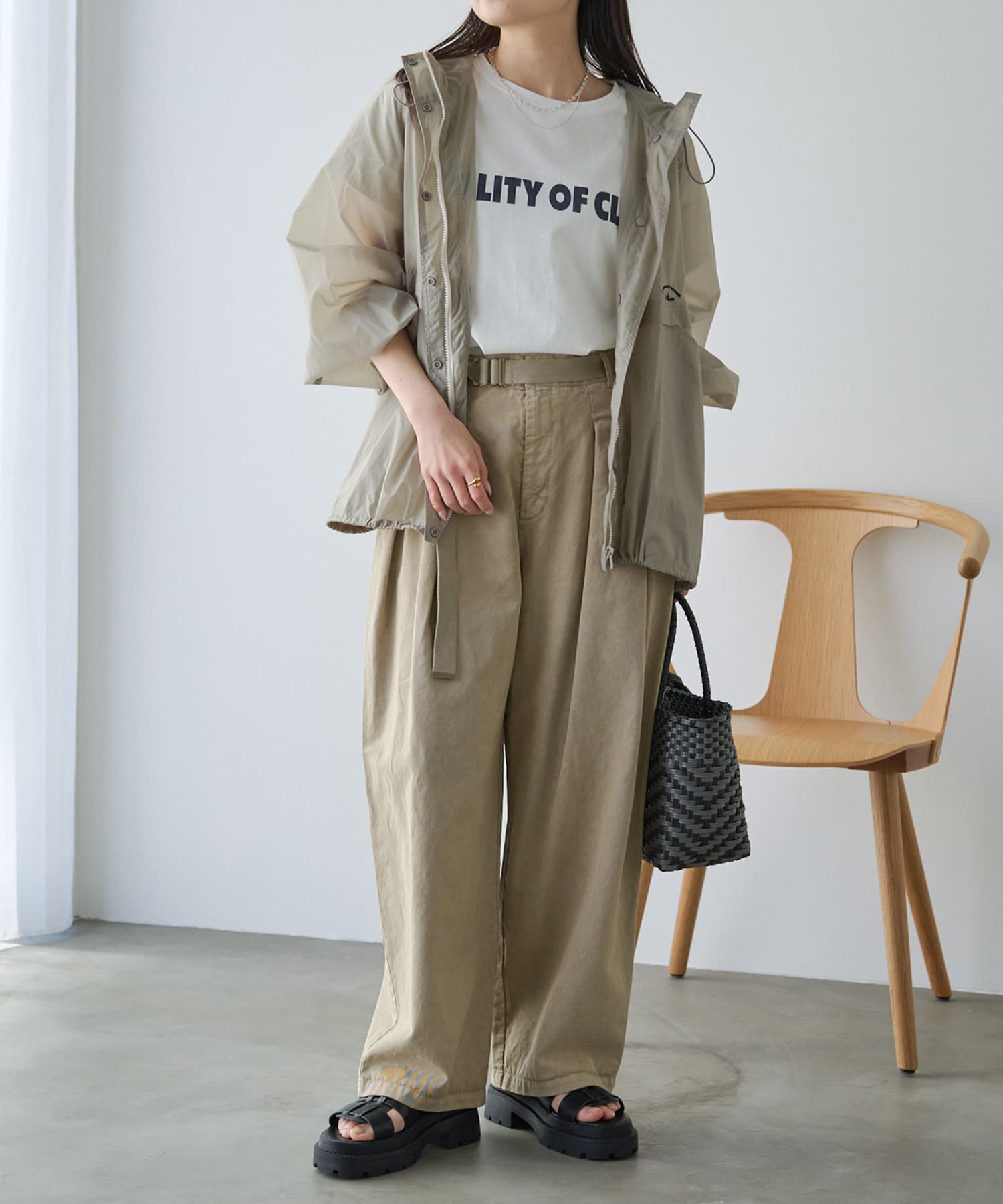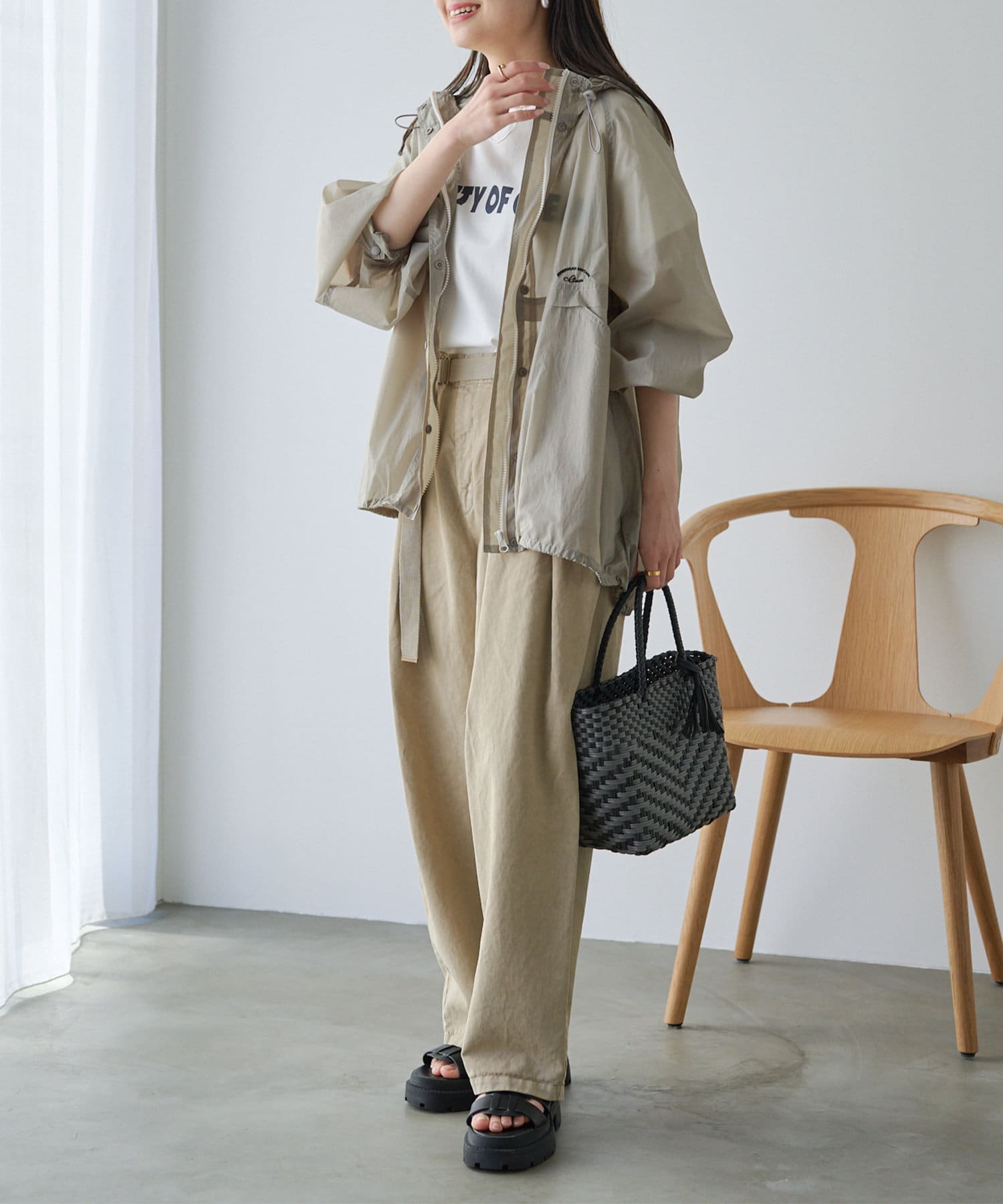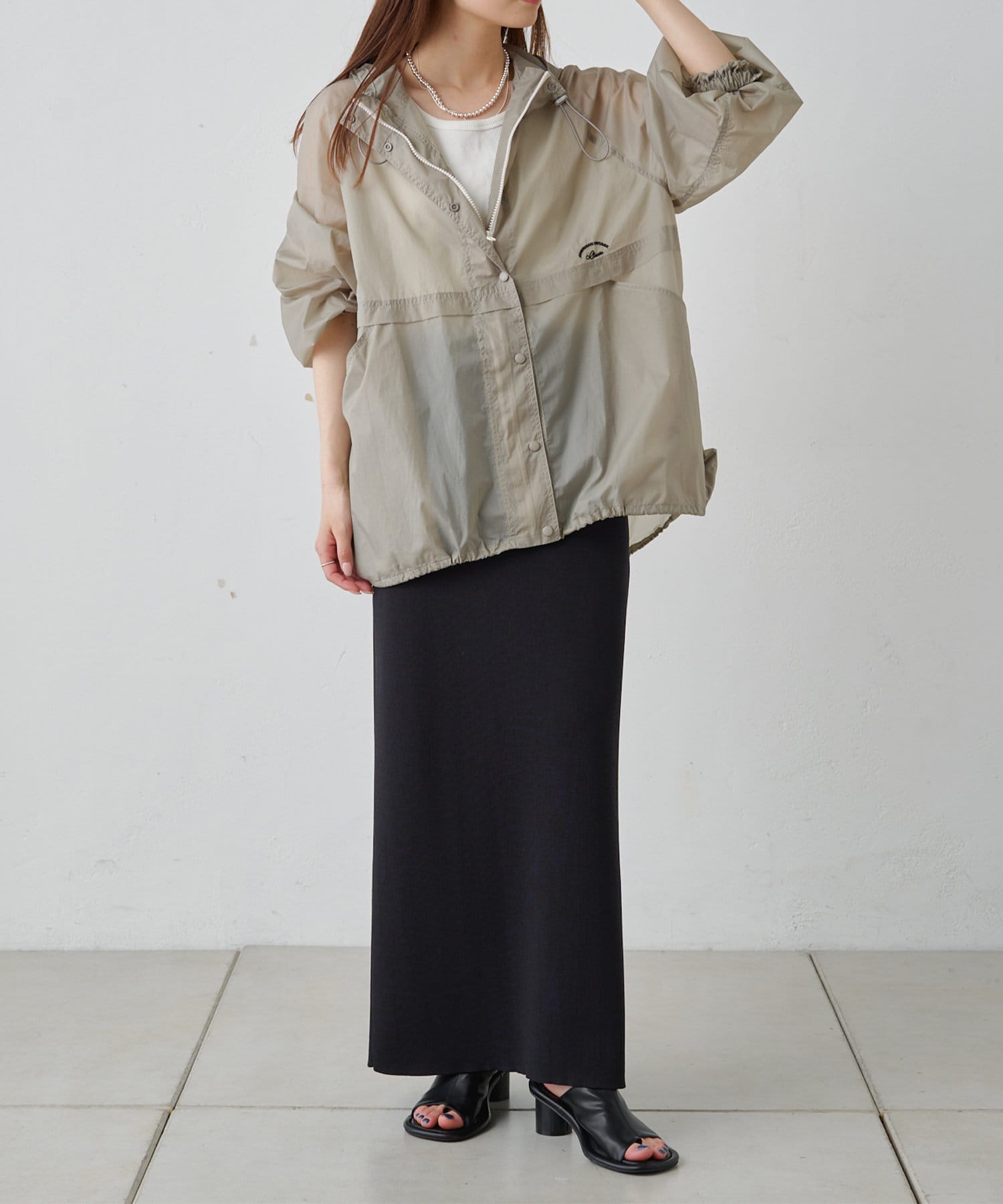 撥水機能付きの透け感のあるシアー素材。くたっとした柔らかな素材感で身体に程よく馴染みます。