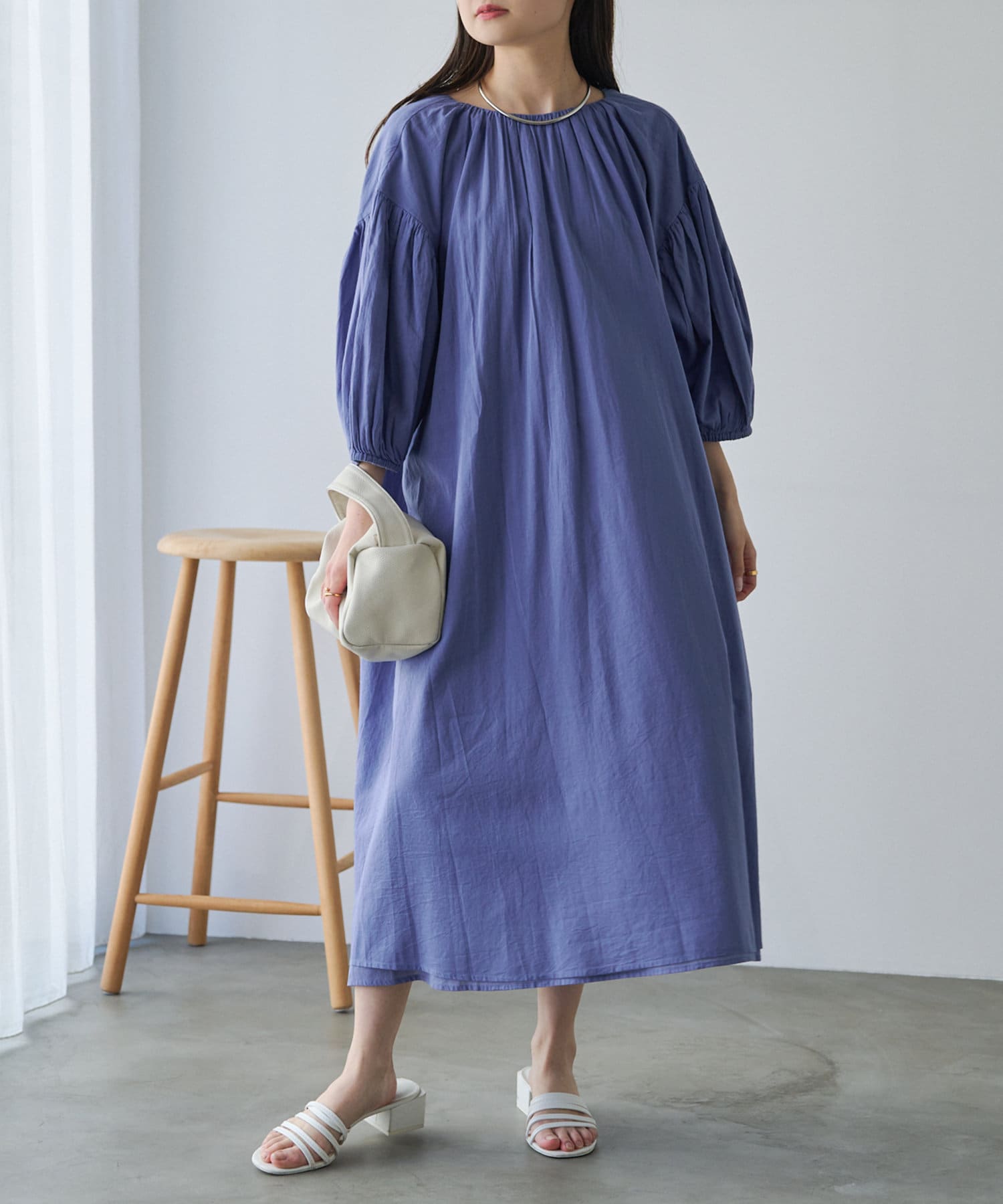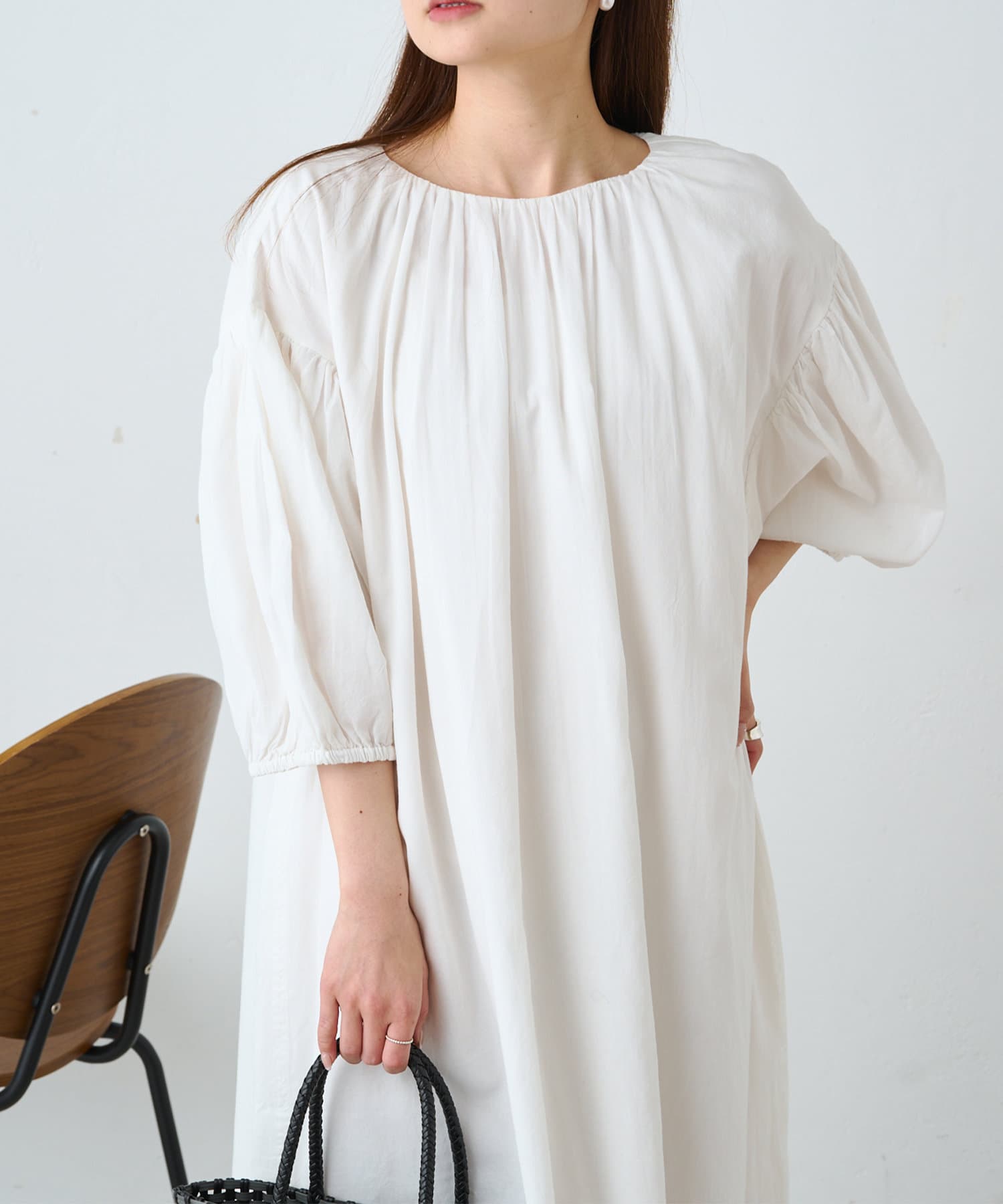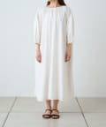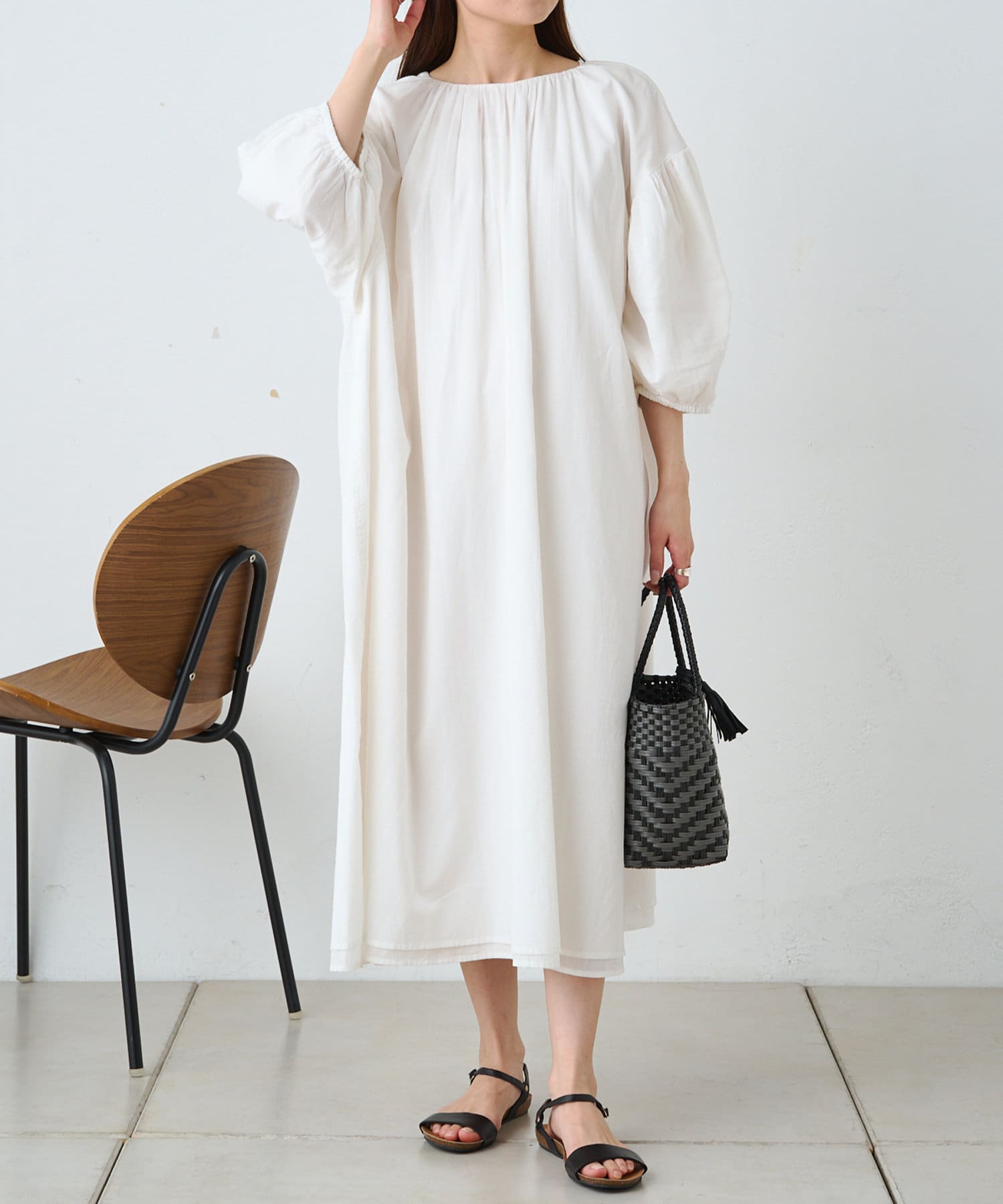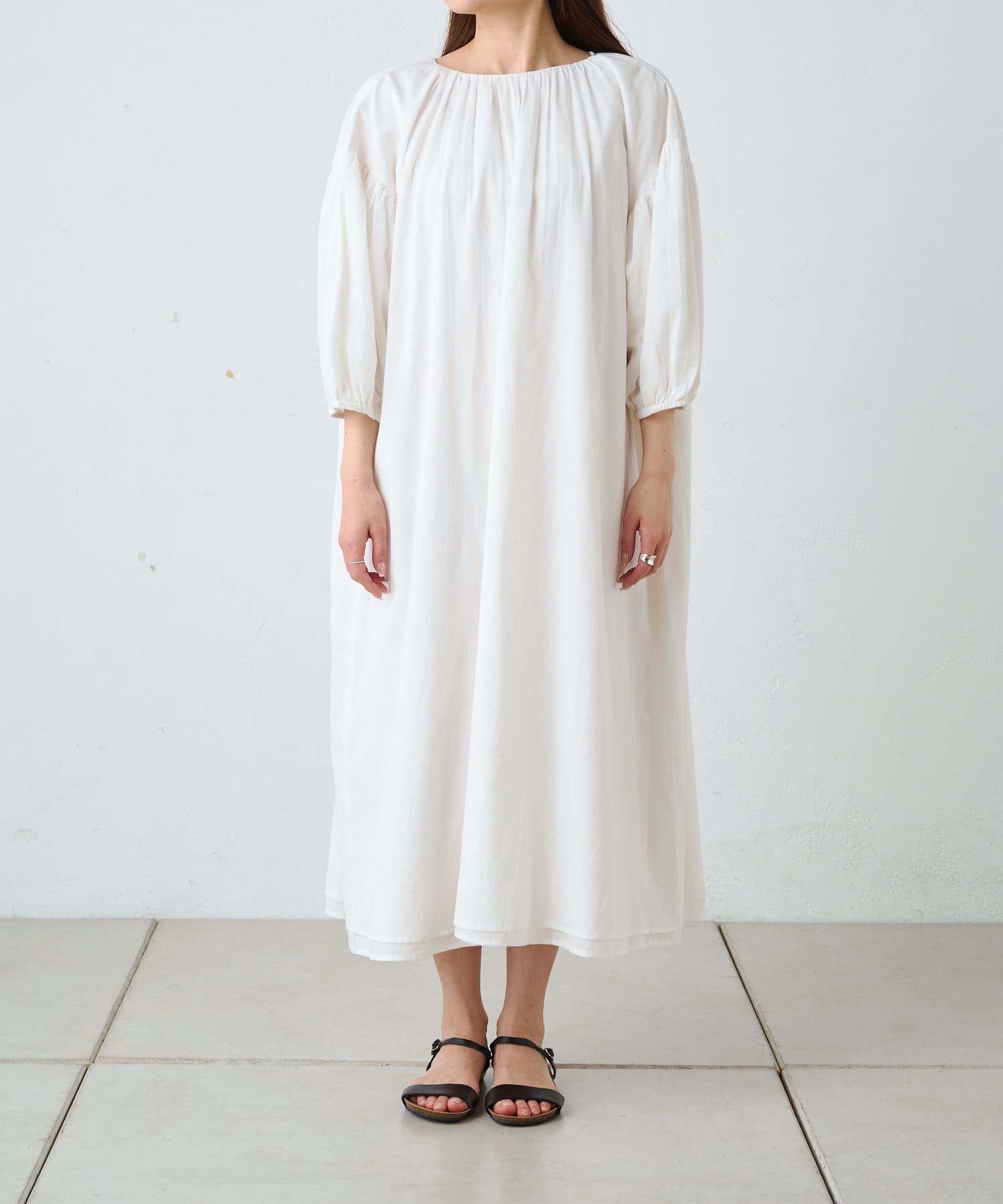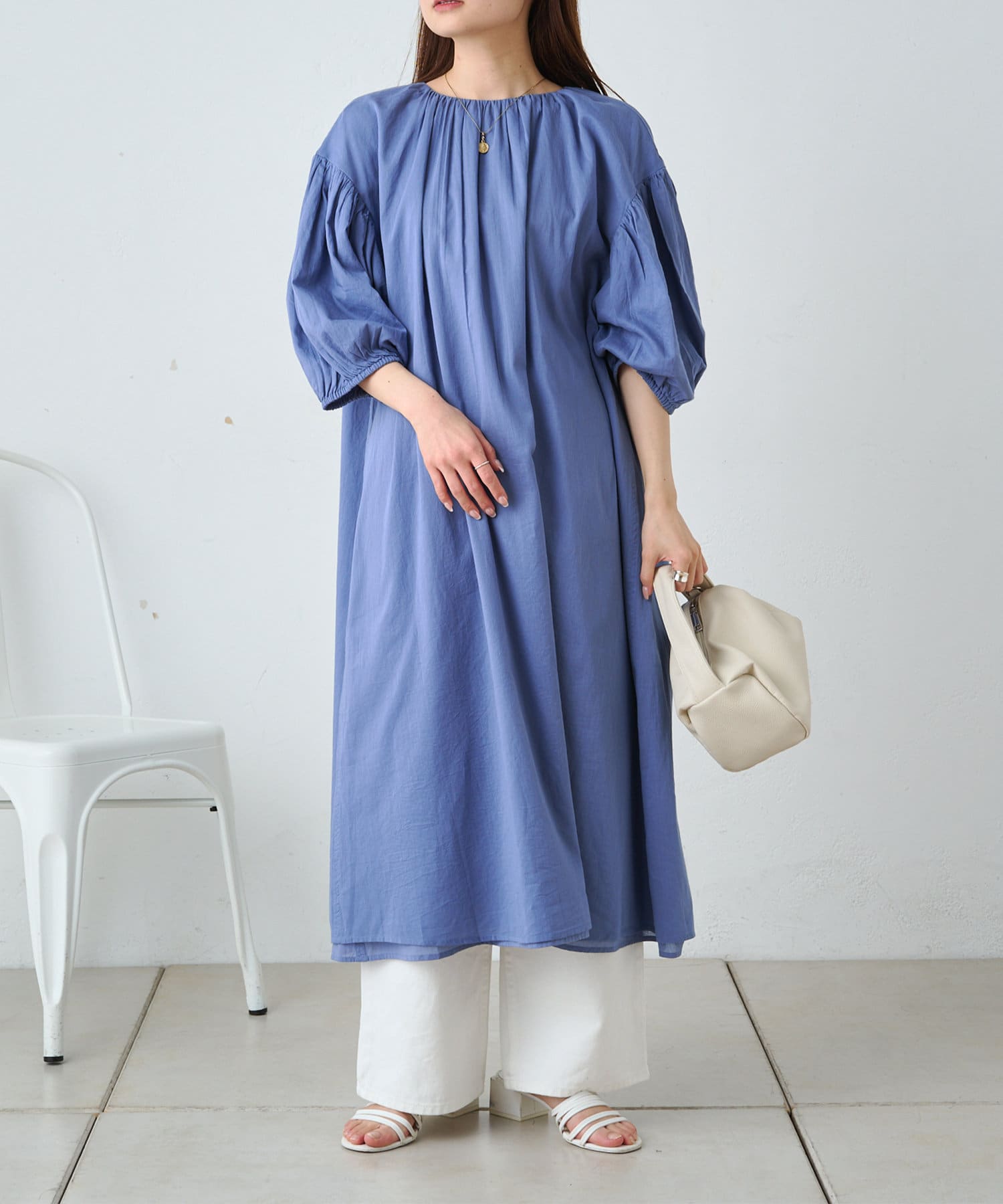 ギャザーをたっぷり入れることでボディラインを拾わないゆとりを持たせながら、ストレートシルエットですっきりと着こなせるワンピースに仕上げました。