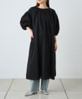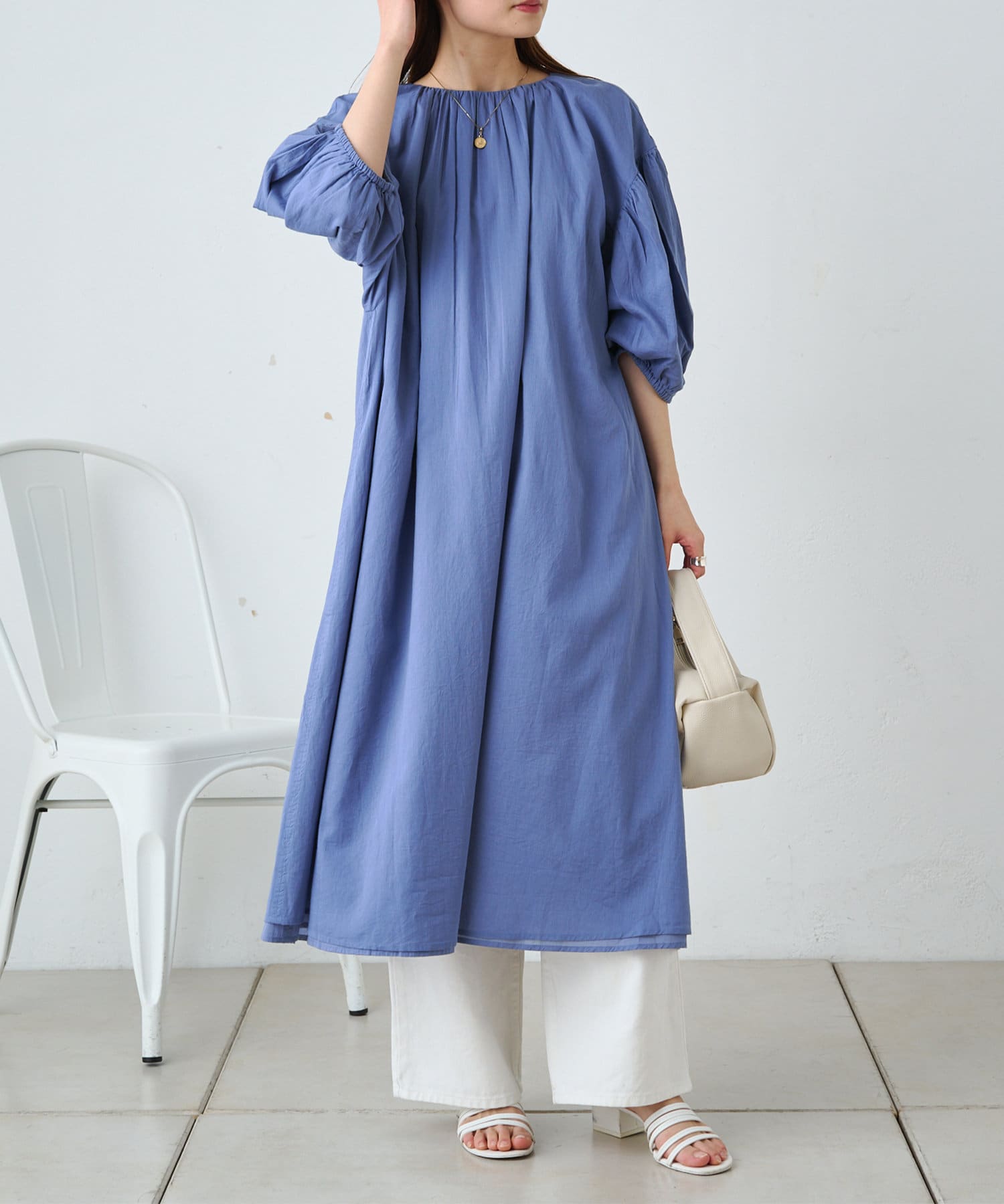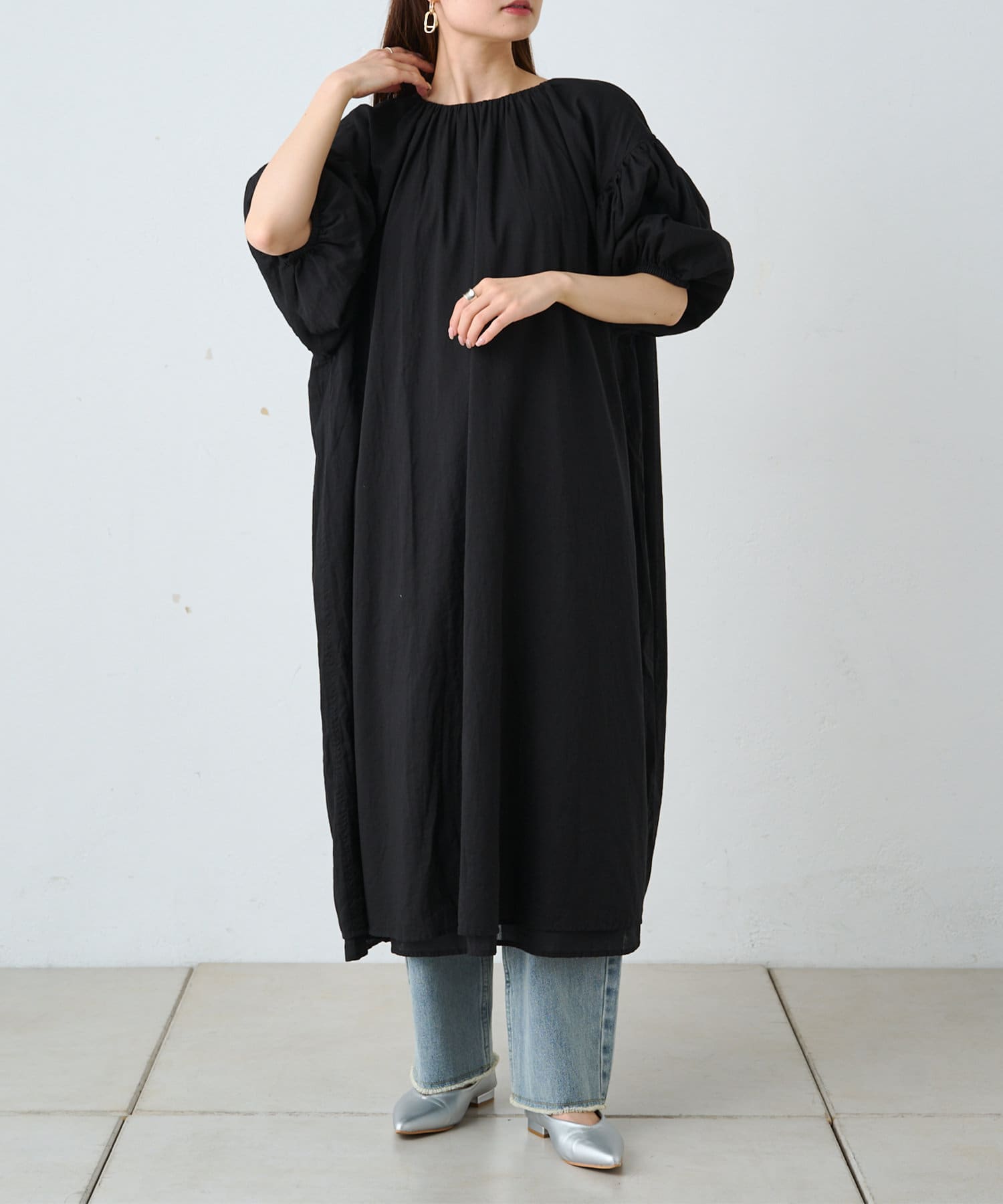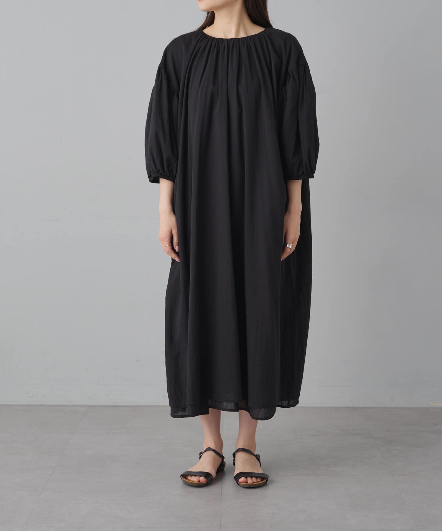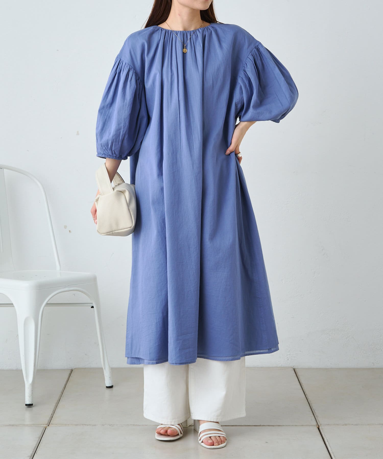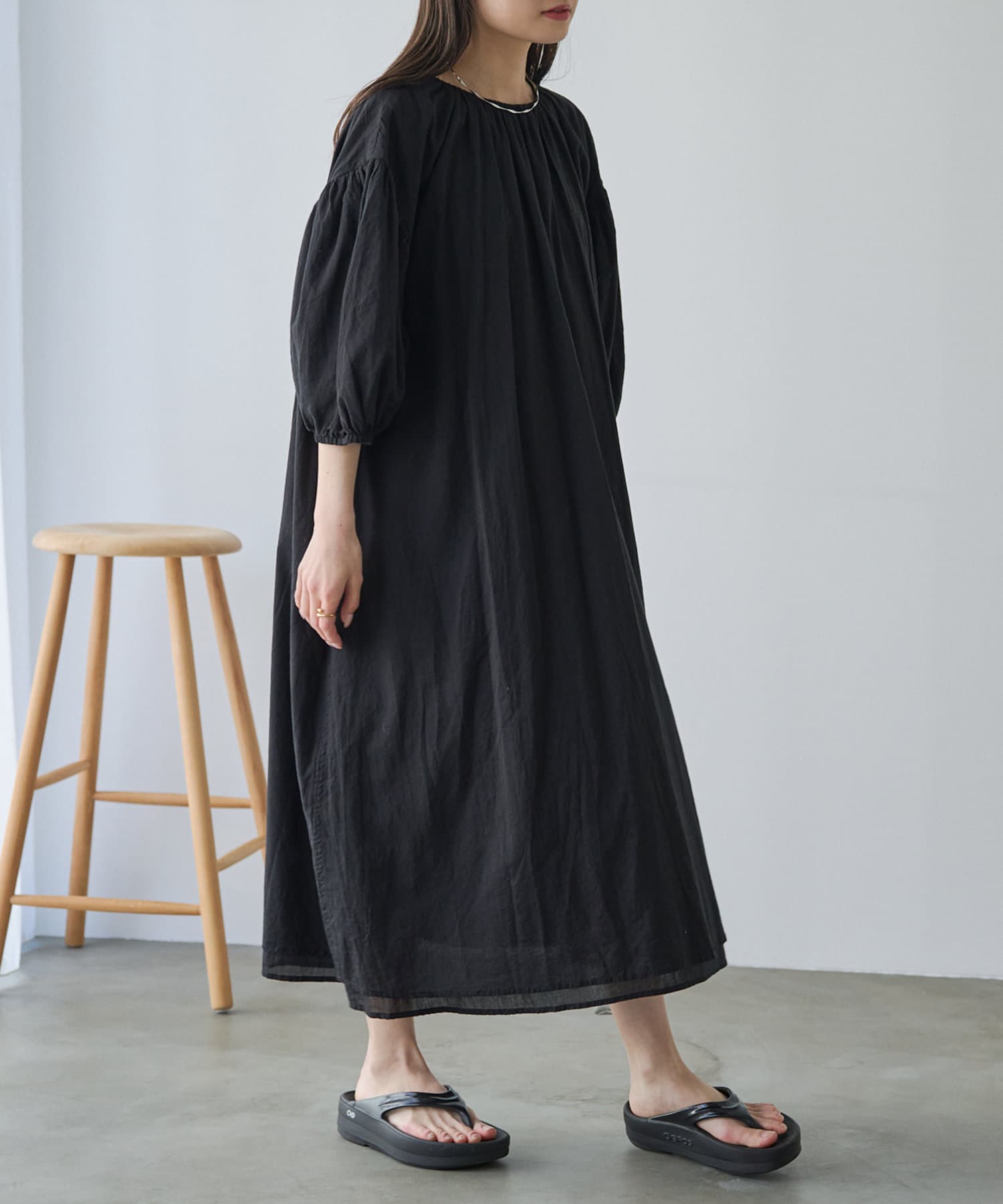 ギャザーをたっぷり入れることでボディラインを拾わないゆとりを持たせながら、ストレートシルエットですっきりと着こなせるワンピースに仕上げました。