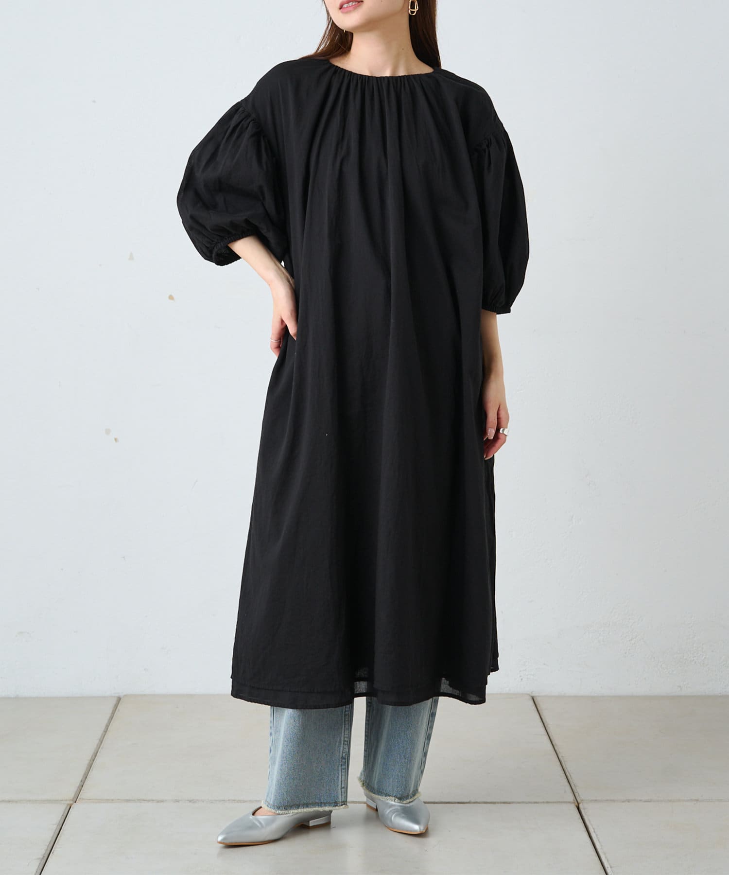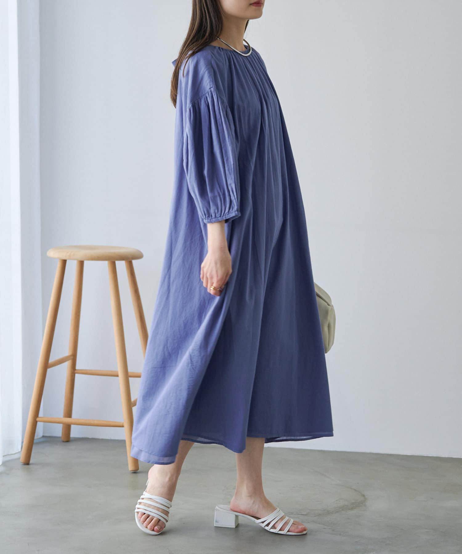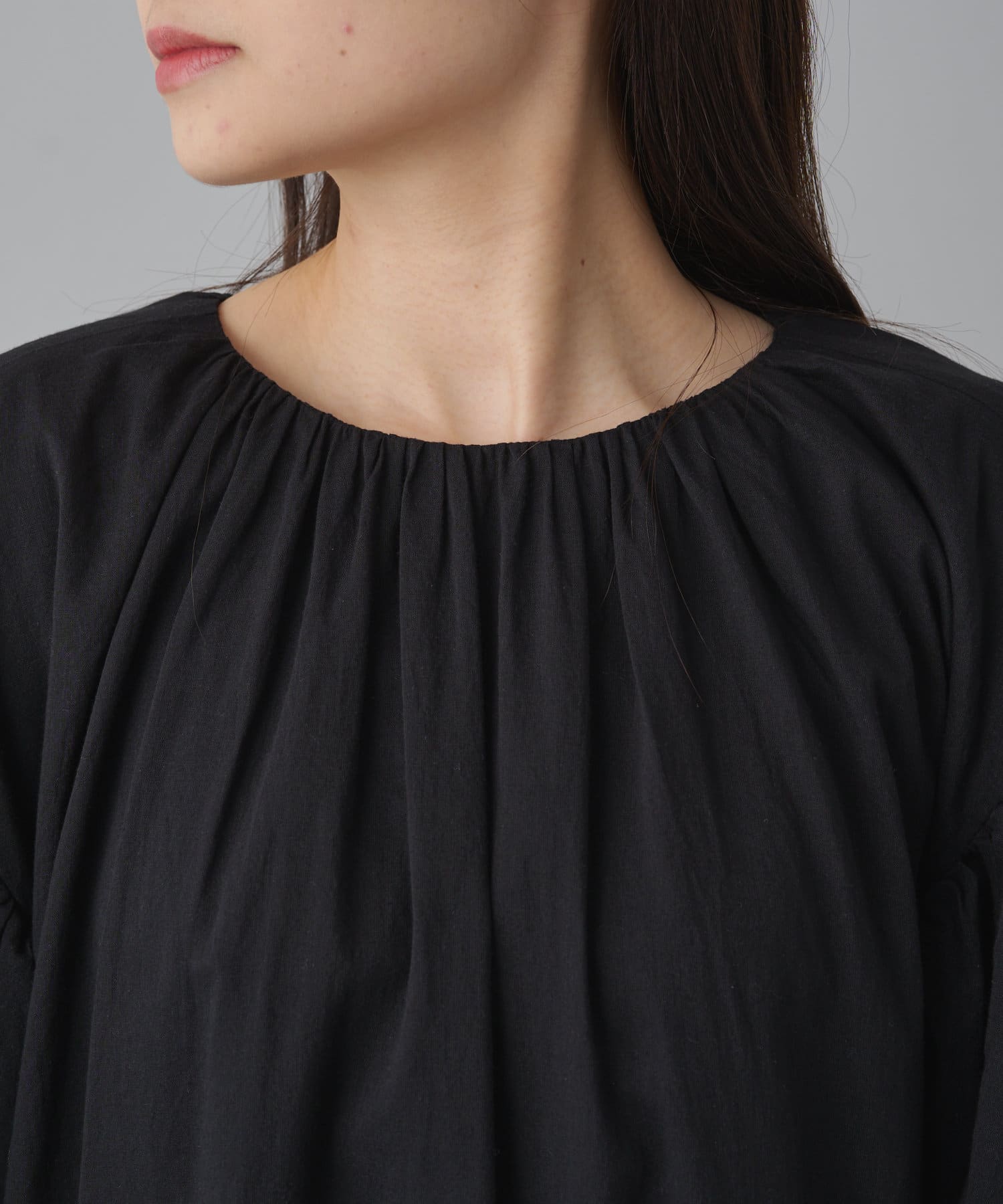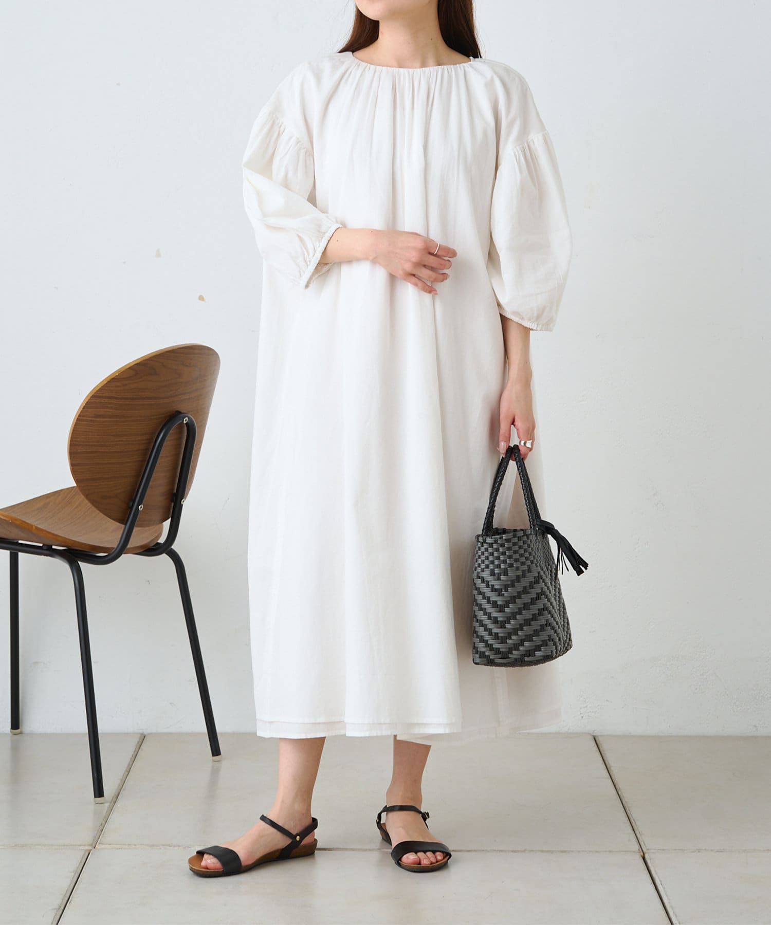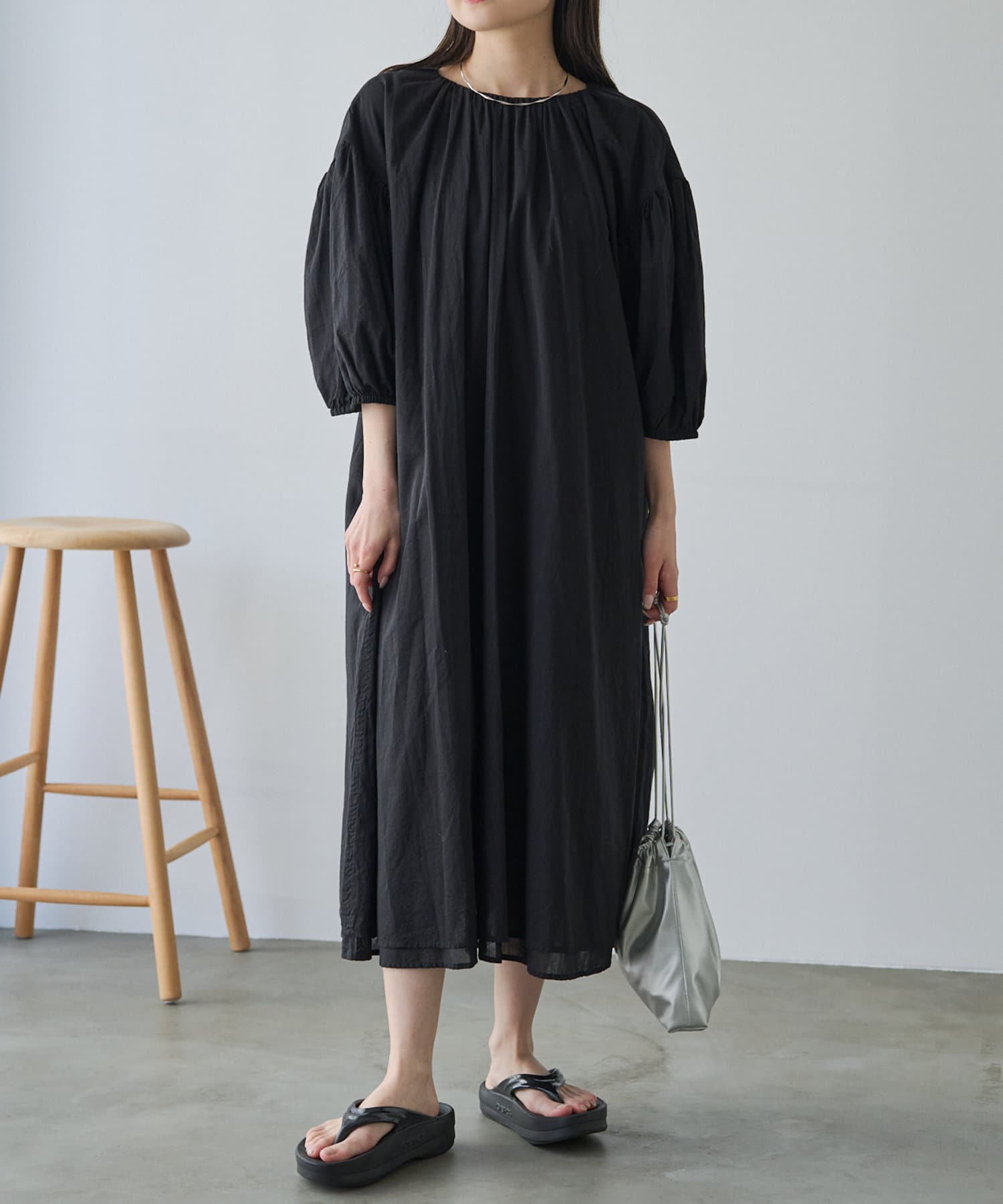 ギャザーをたっぷり入れることでボディラインを拾わないゆとりを持たせながら、ストレートシルエットですっきりと着こなせるワンピースに仕上げました。