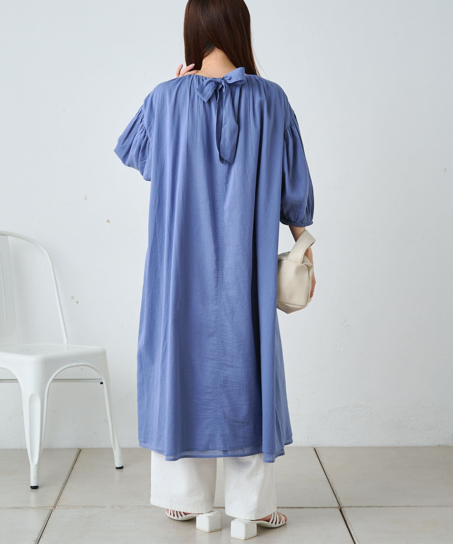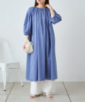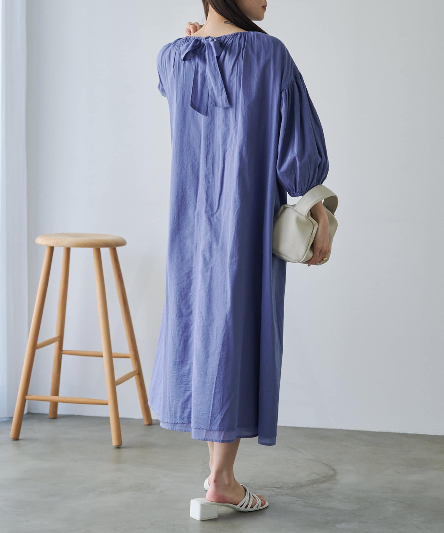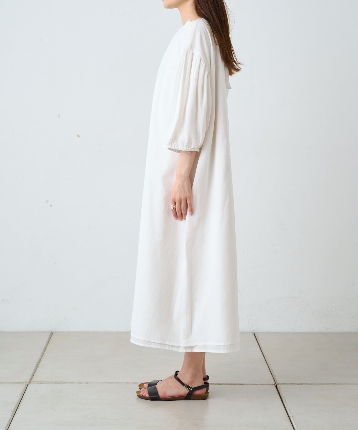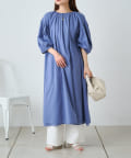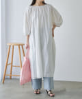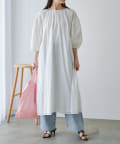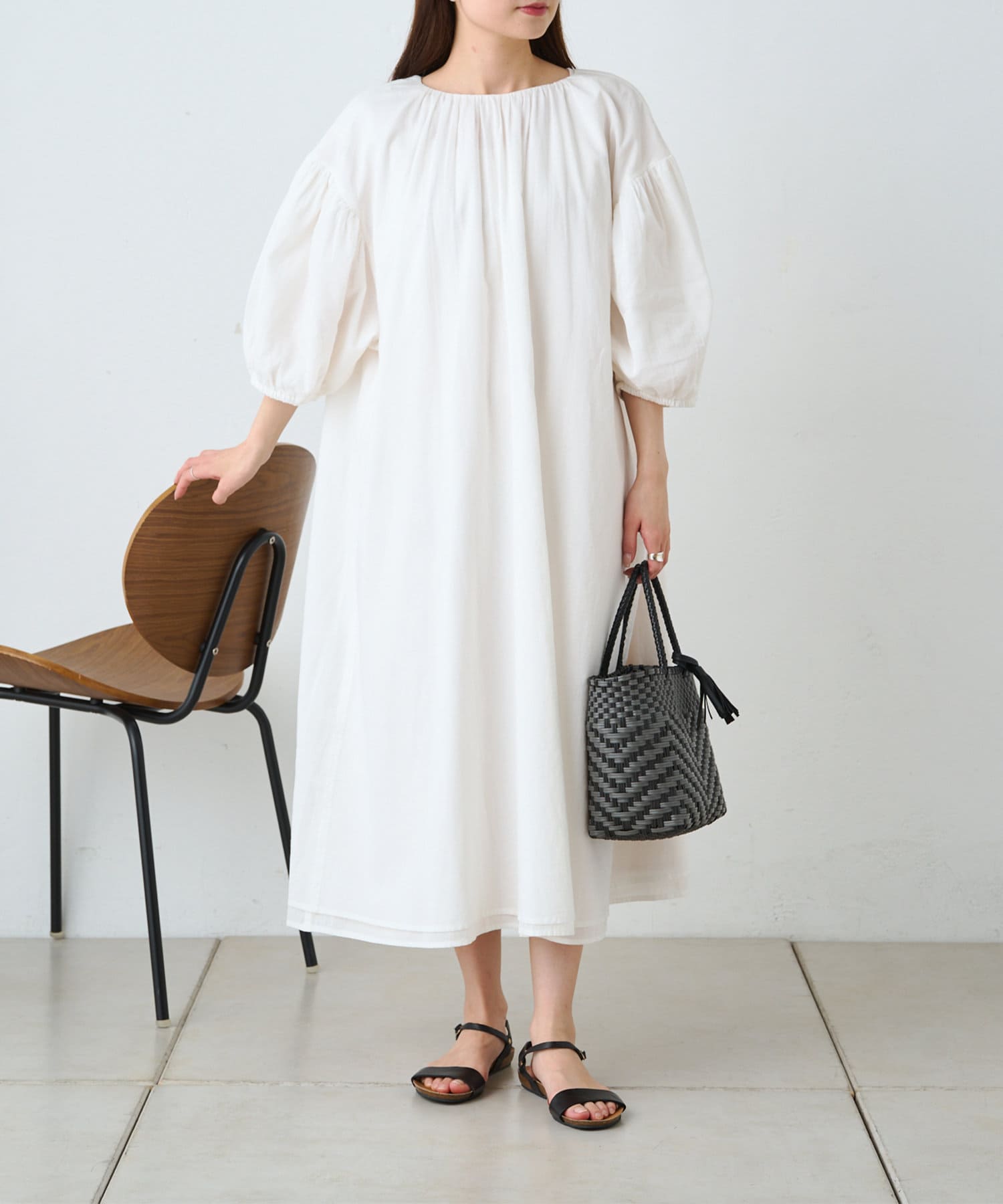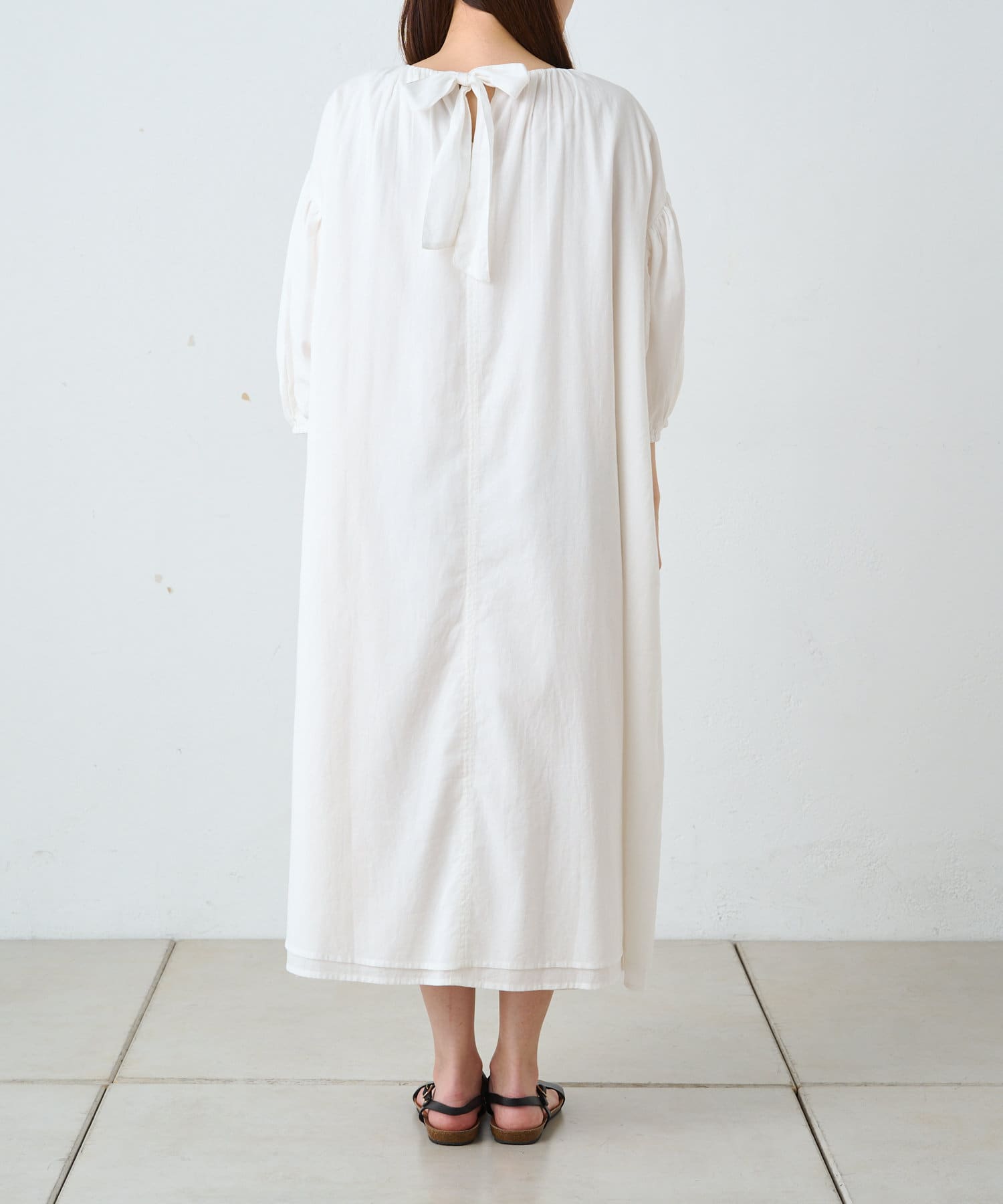 ギャザーをたっぷり入れることでボディラインを拾わないゆとりを持たせながら、ストレートシルエットですっきりと着こなせるワンピースに仕上げました。