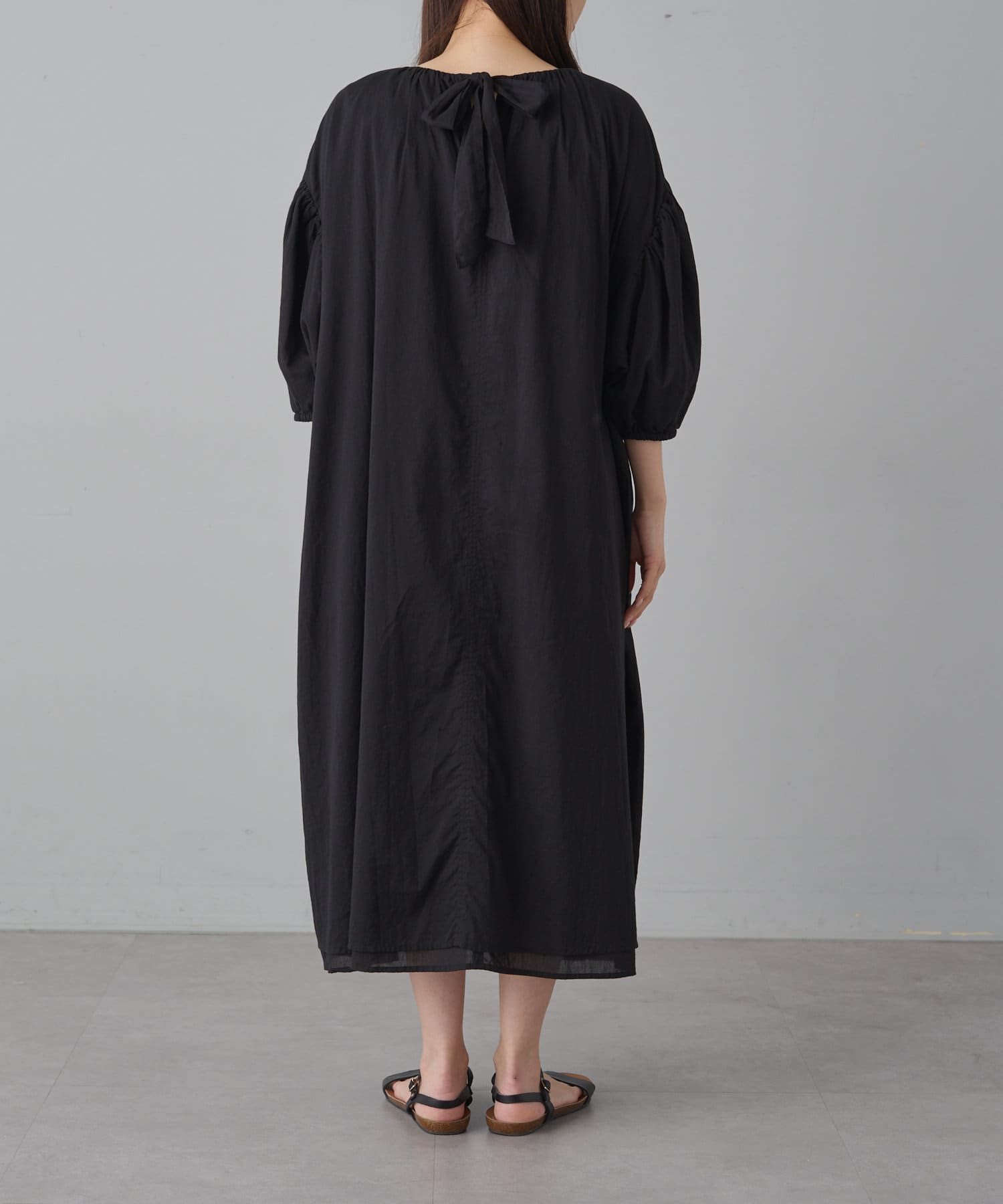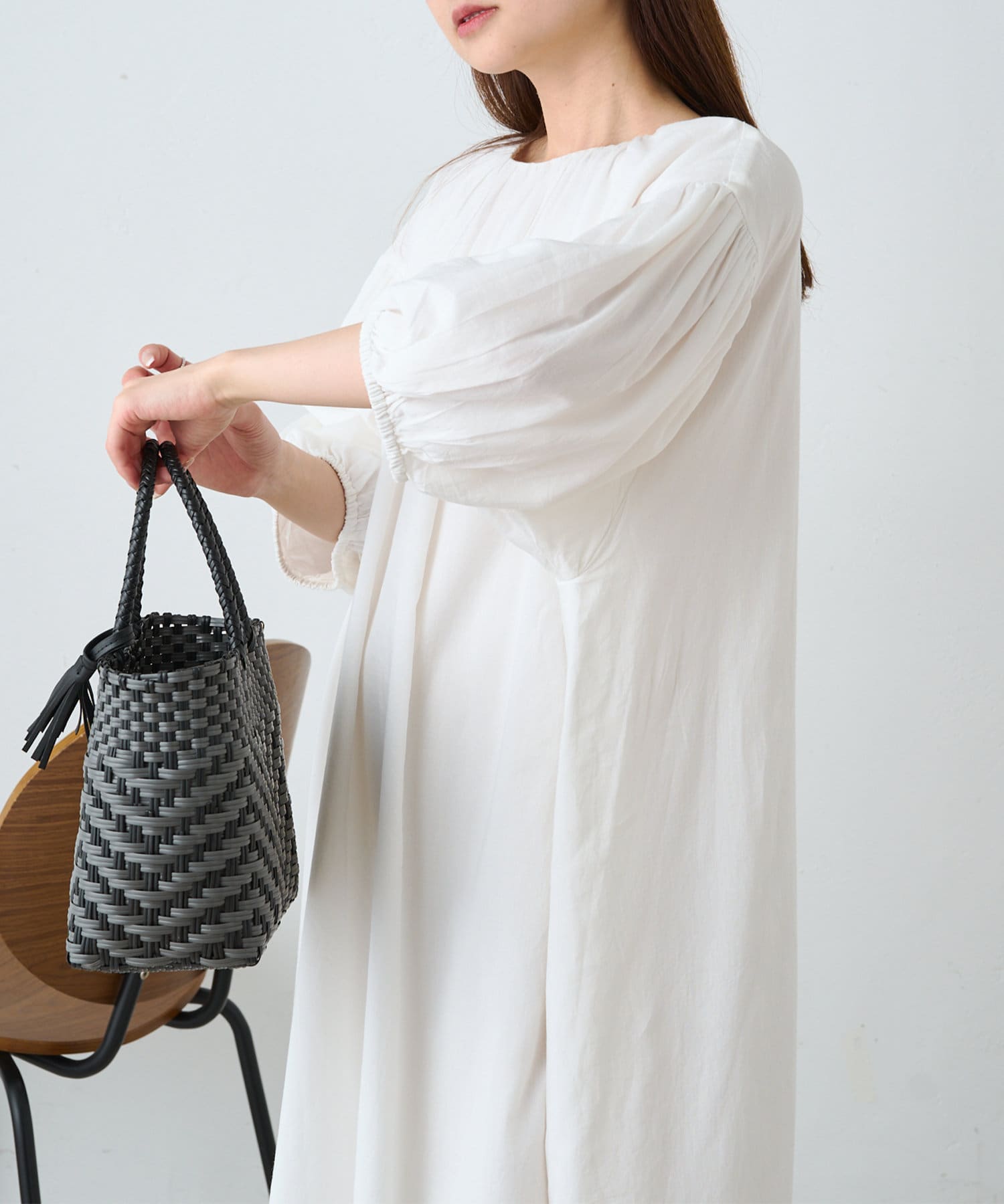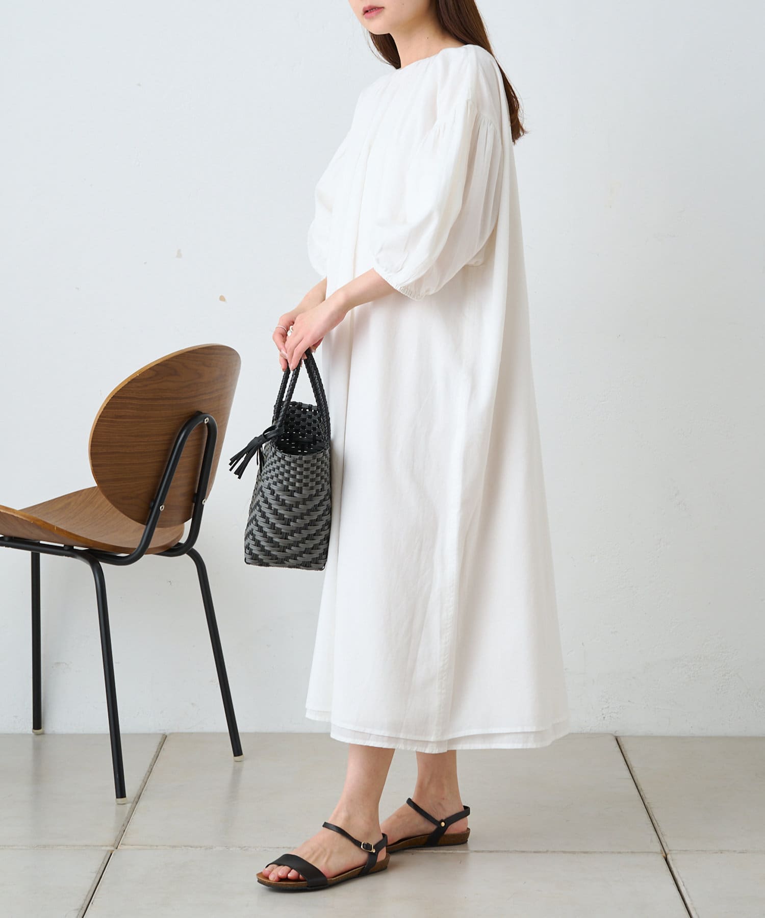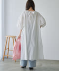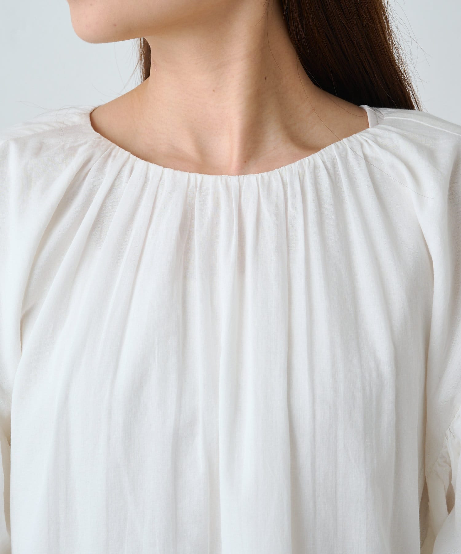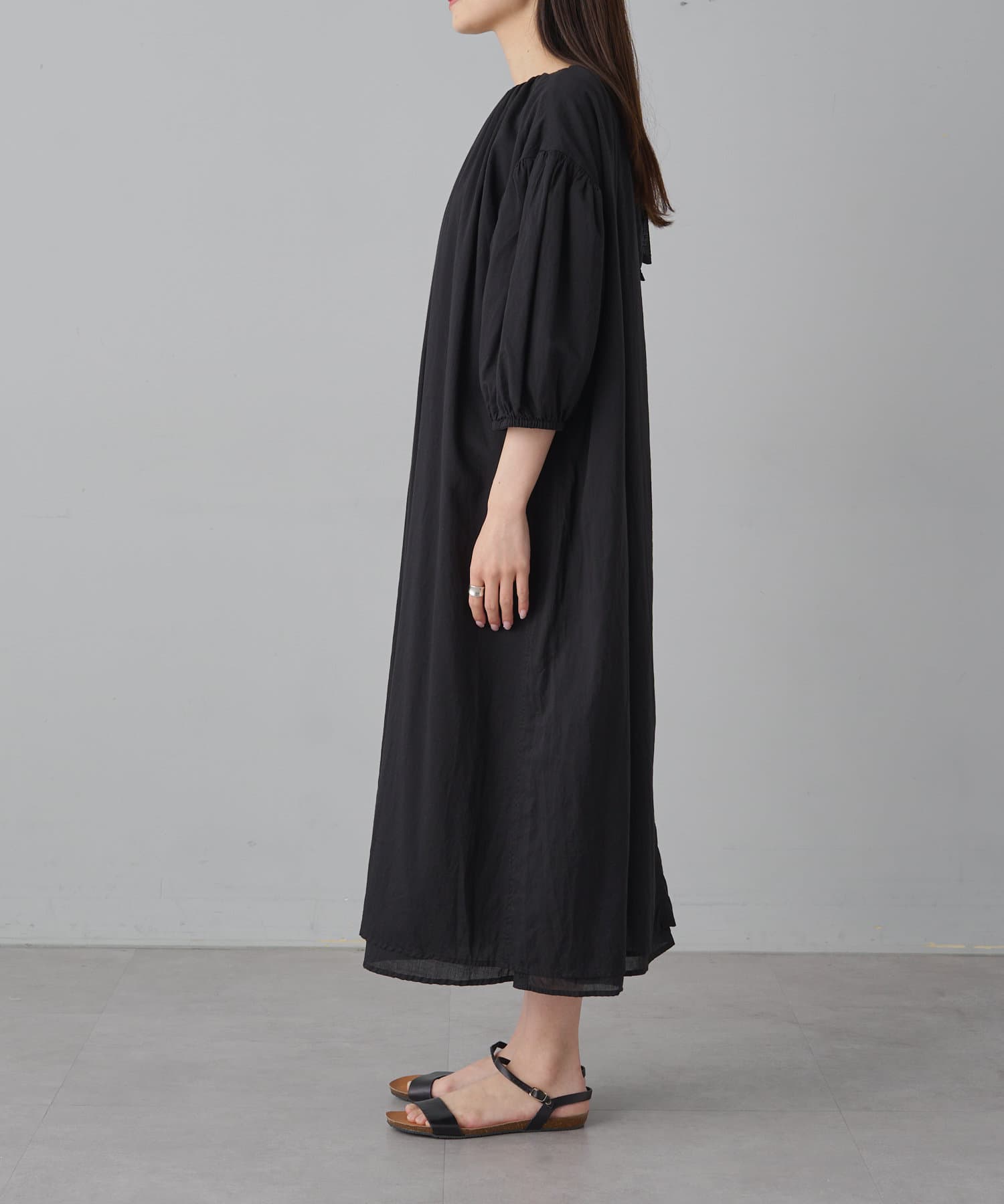 ギャザーをたっぷり入れることでボディラインを拾わないゆとりを持たせながら、ストレートシルエットですっきりと着こなせるワンピースに仕上げました。