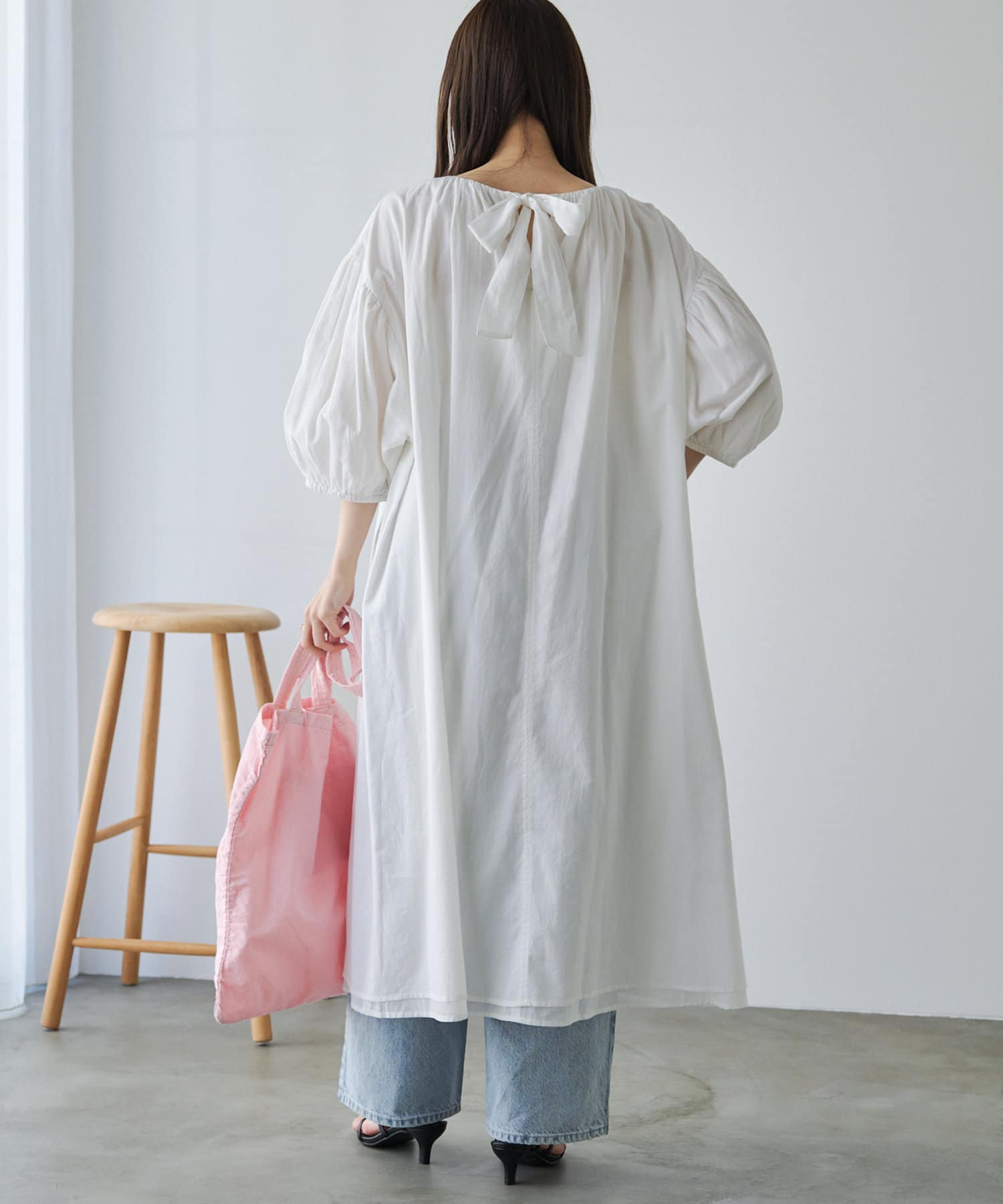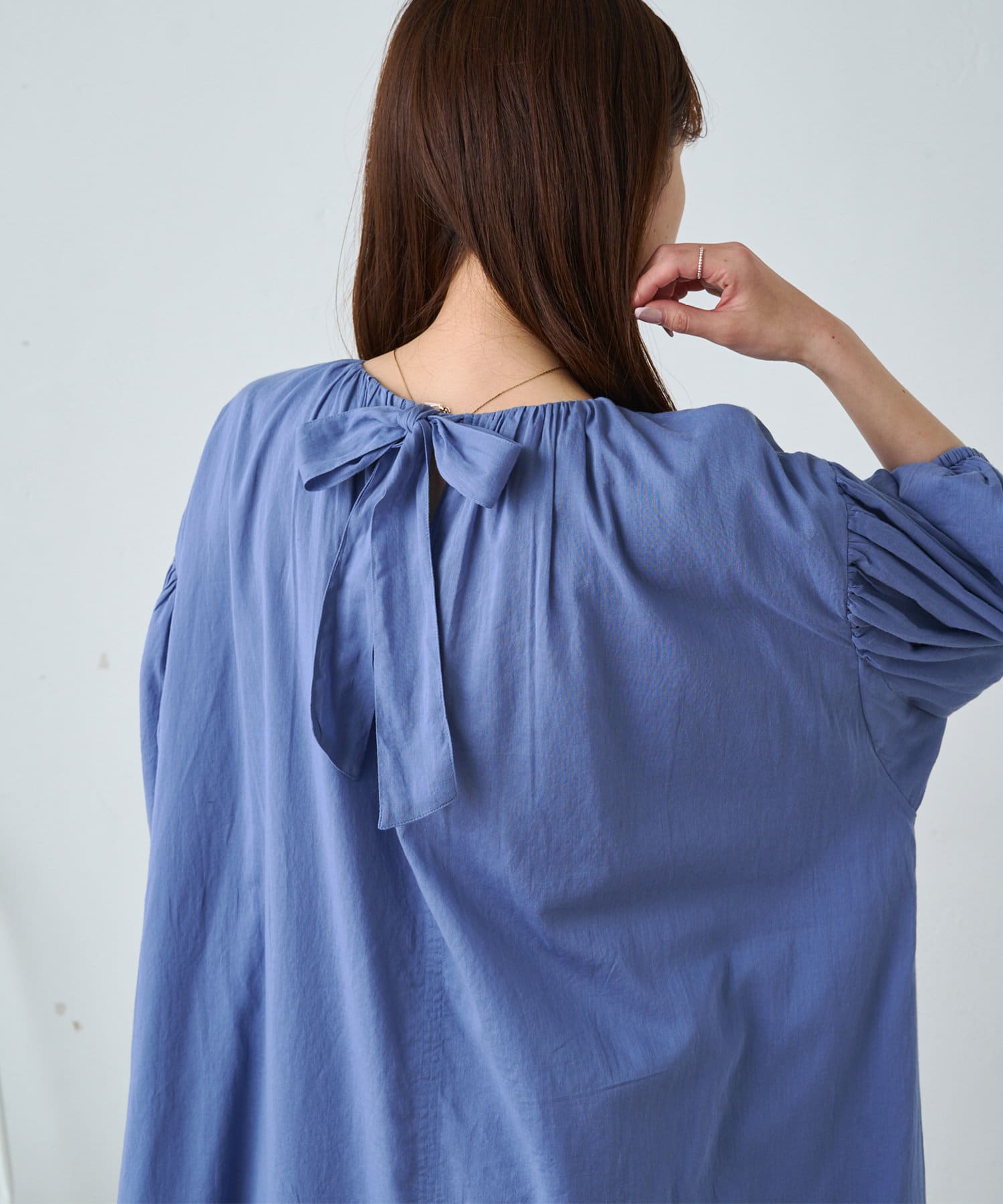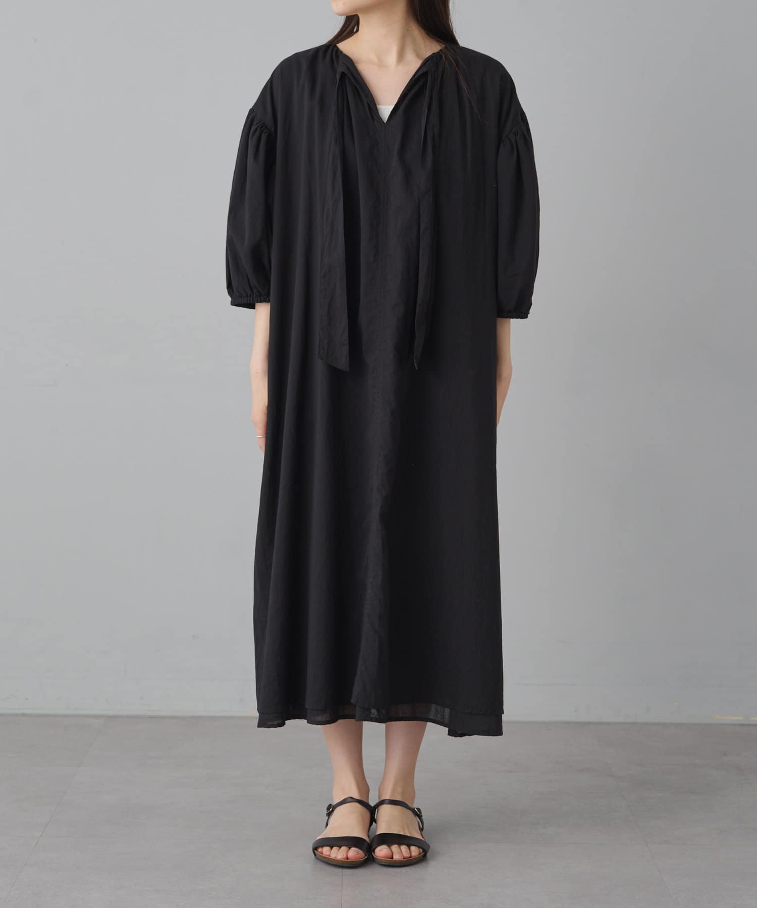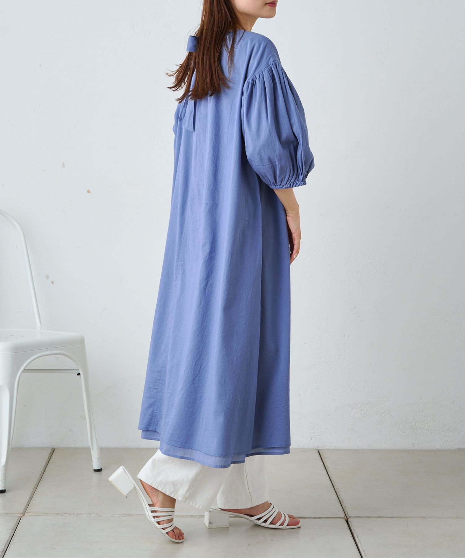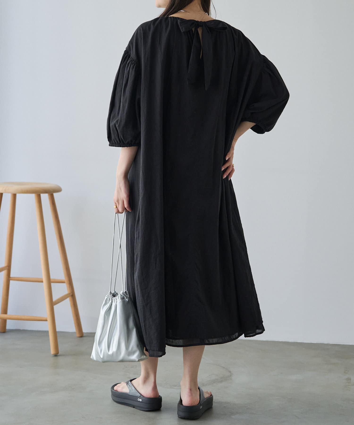 ギャザーをたっぷり入れることでボディラインを拾わないゆとりを持たせながら、ストレートシルエットですっきりと着こなせるワンピースに仕上げました。