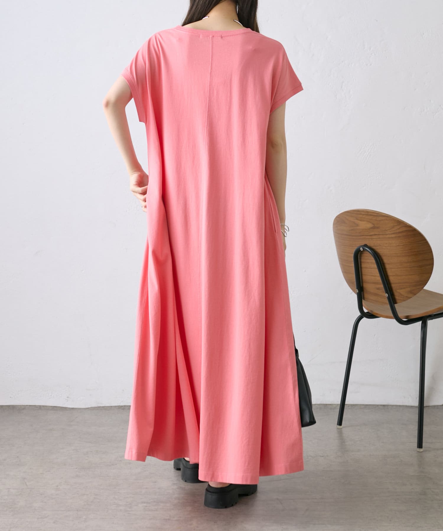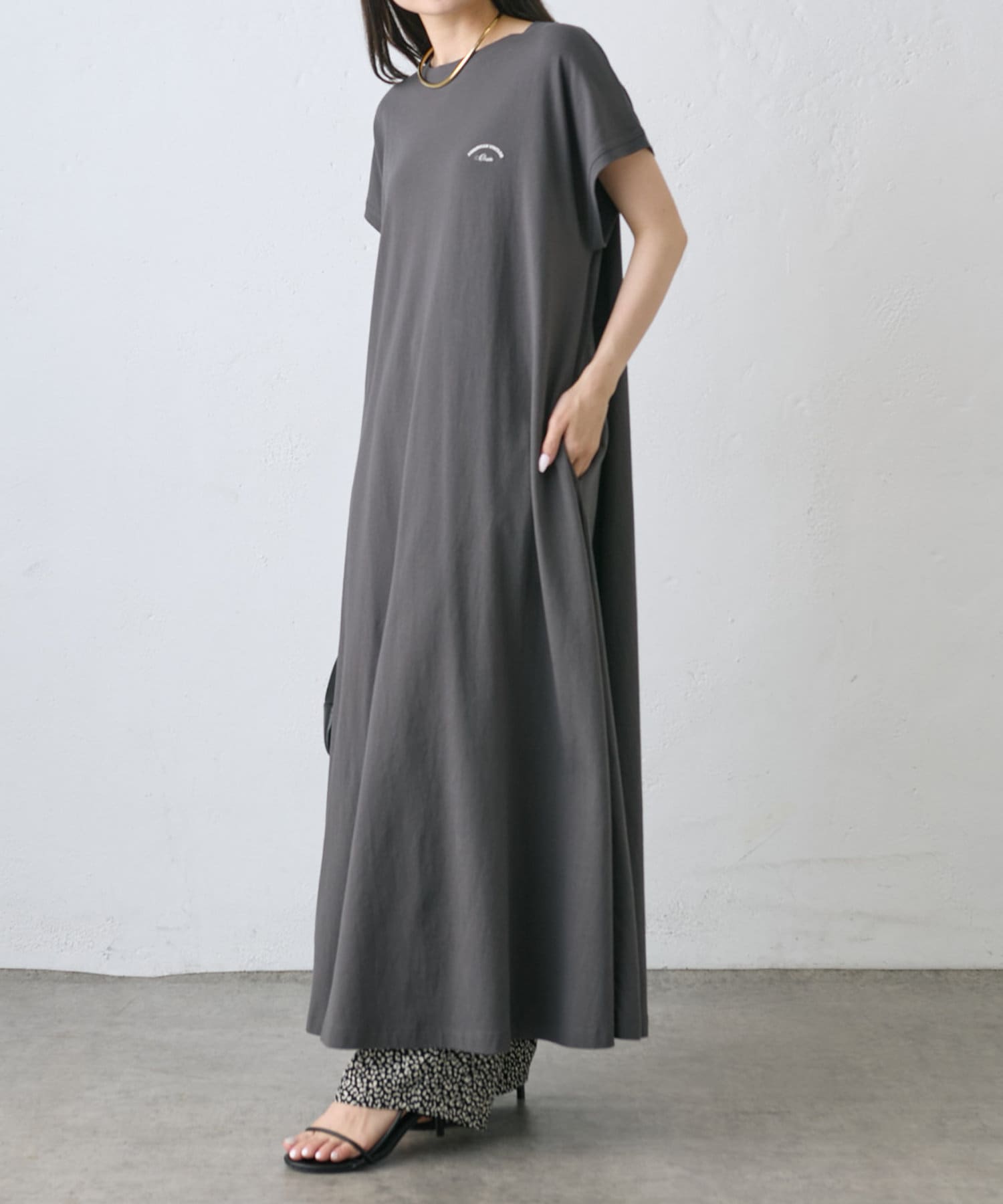 縦長に見えるロング丈と動くとAラインに広がるシルエットが大人の華やかさを演出。袖の切り返しのないフレンチスリーブが、二の腕をきれいに見せてくれます。