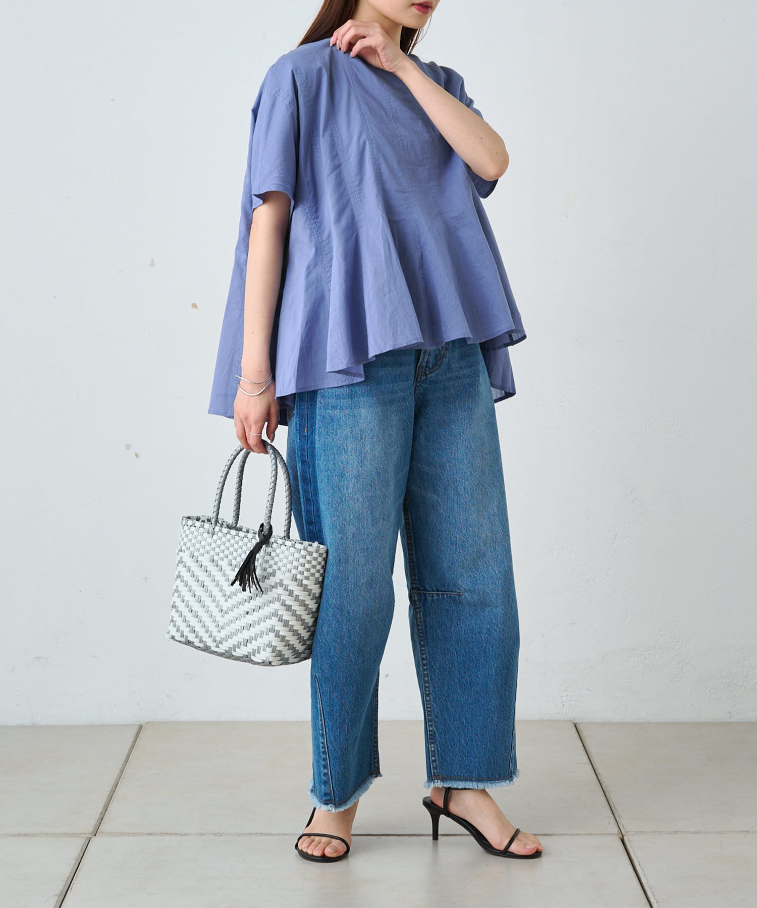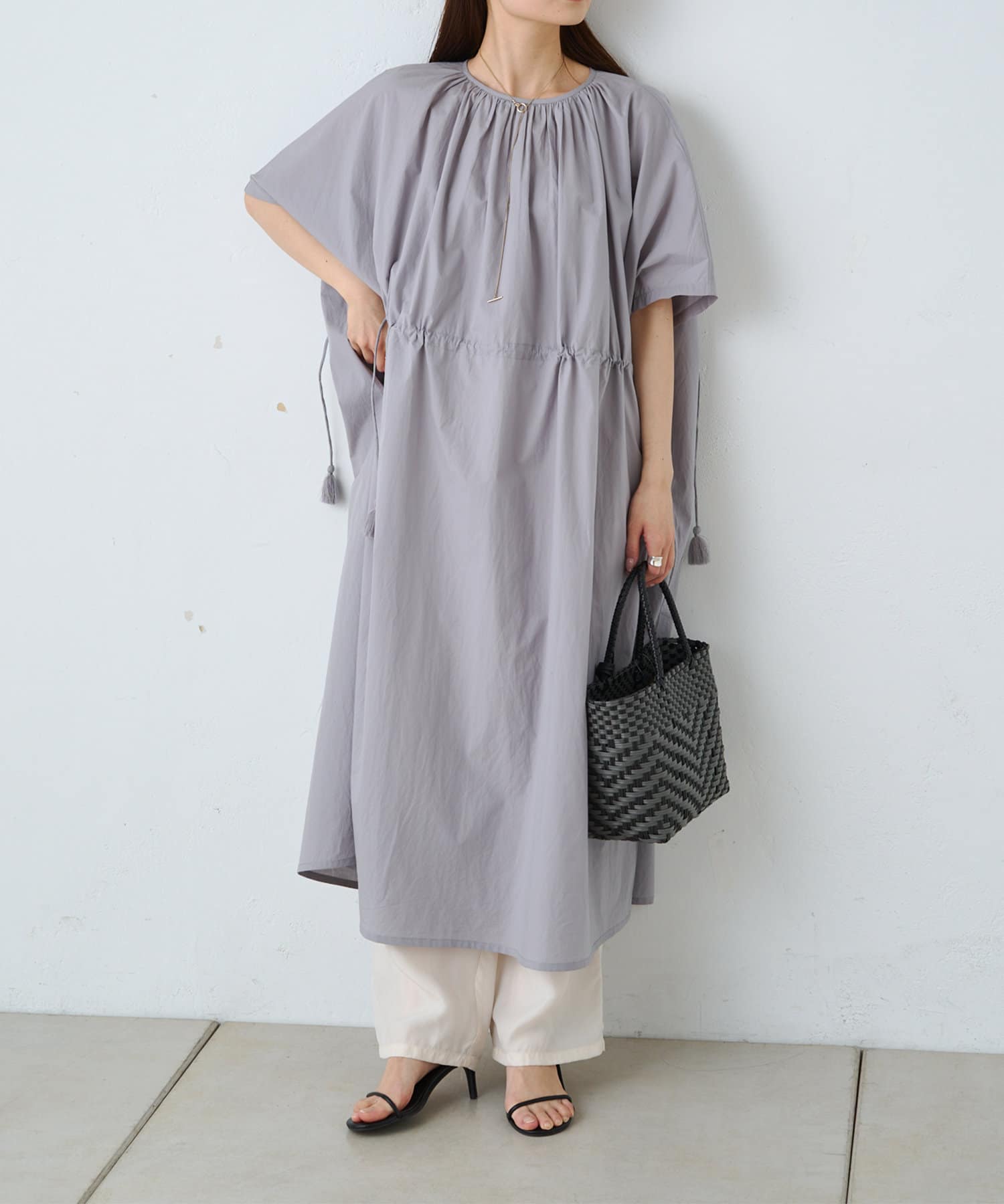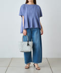 手編みの柄がコーディネートのポイントになり、夏のお出かけにぴったりです。
