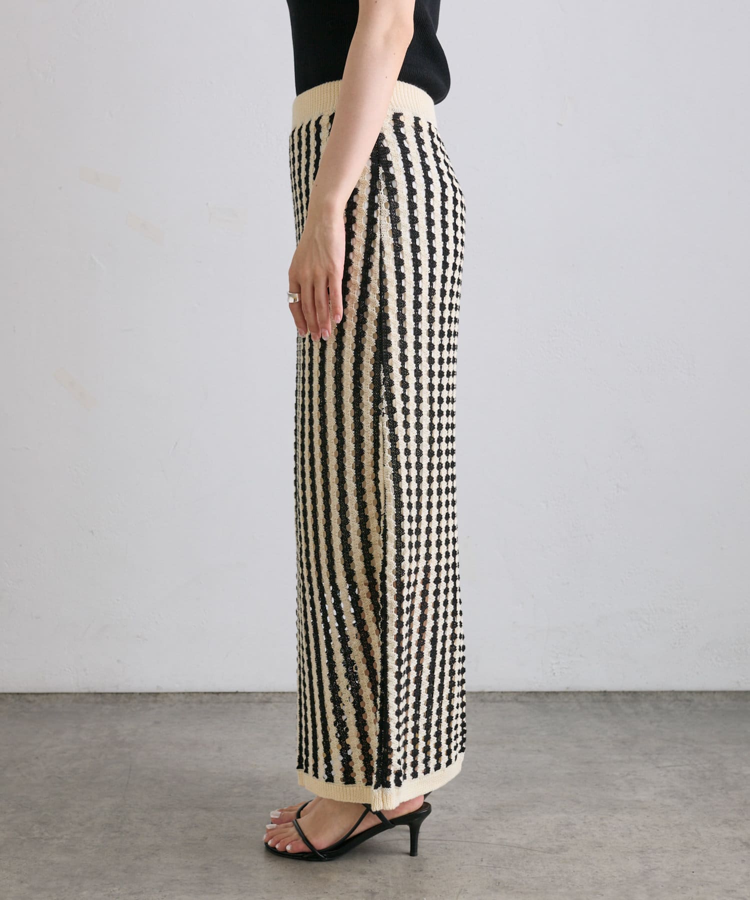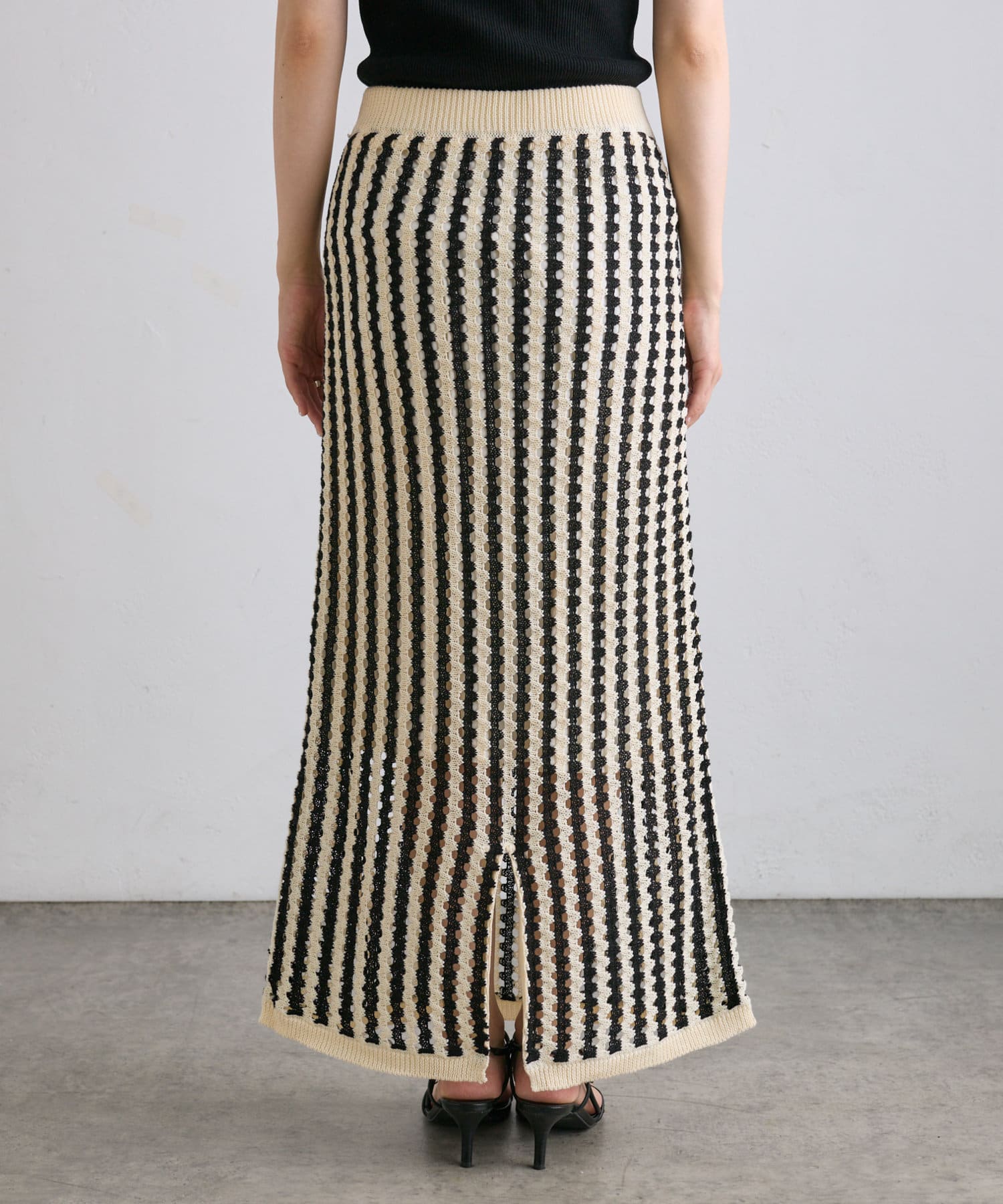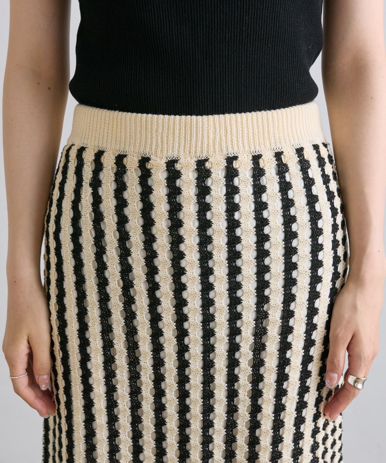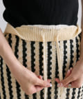 透かし編みと配色のストライプが目をひくニットジャガードスカート。