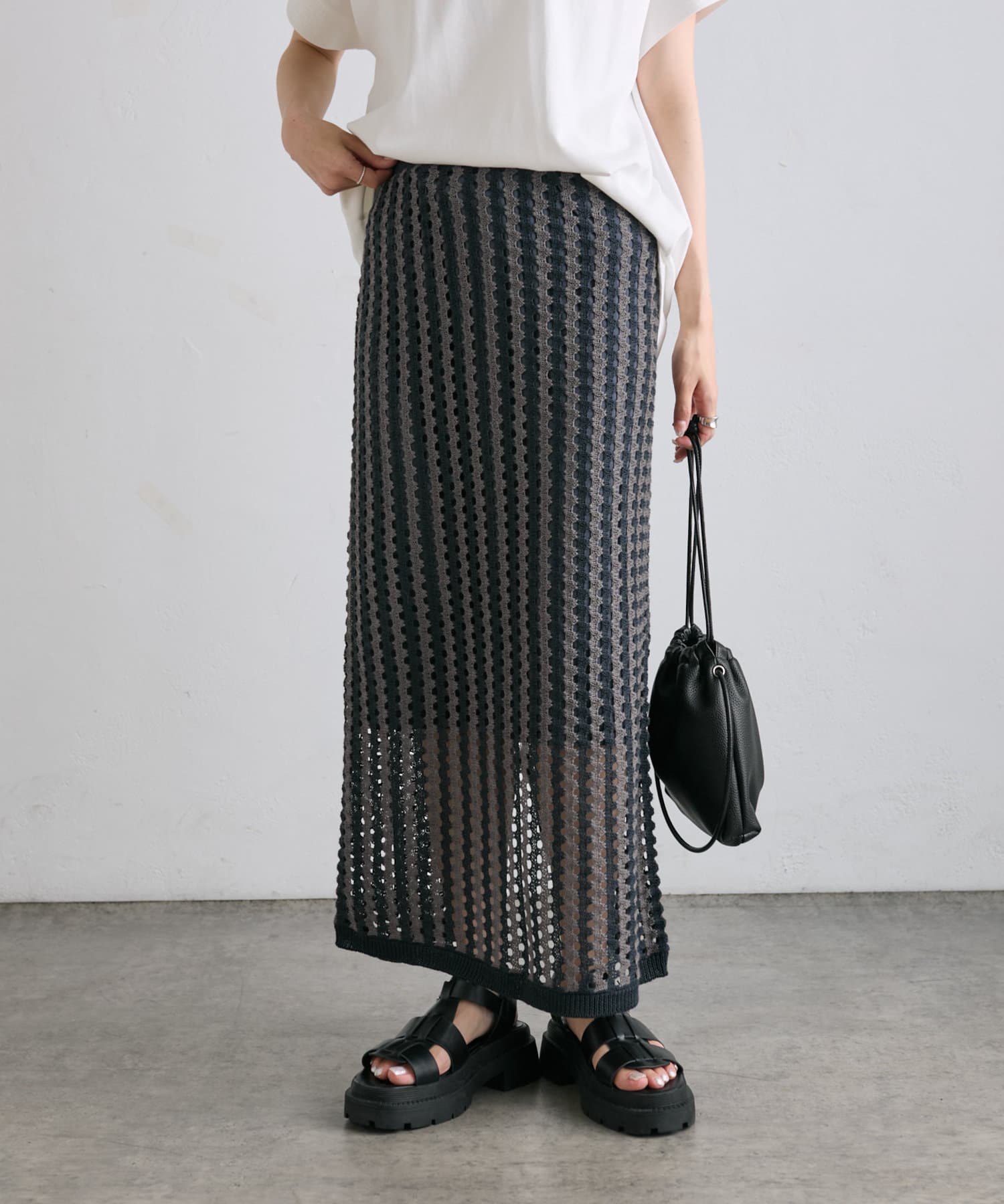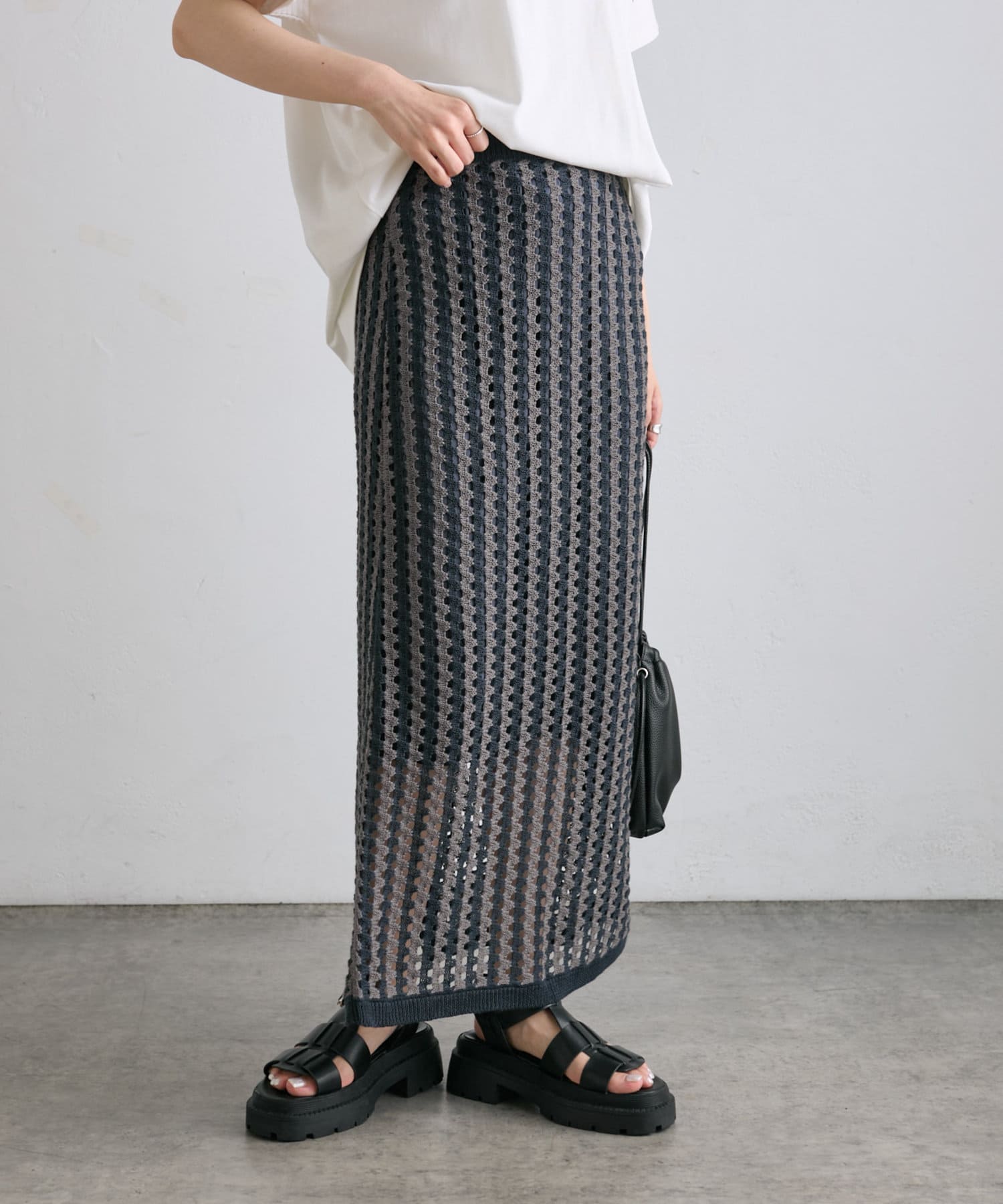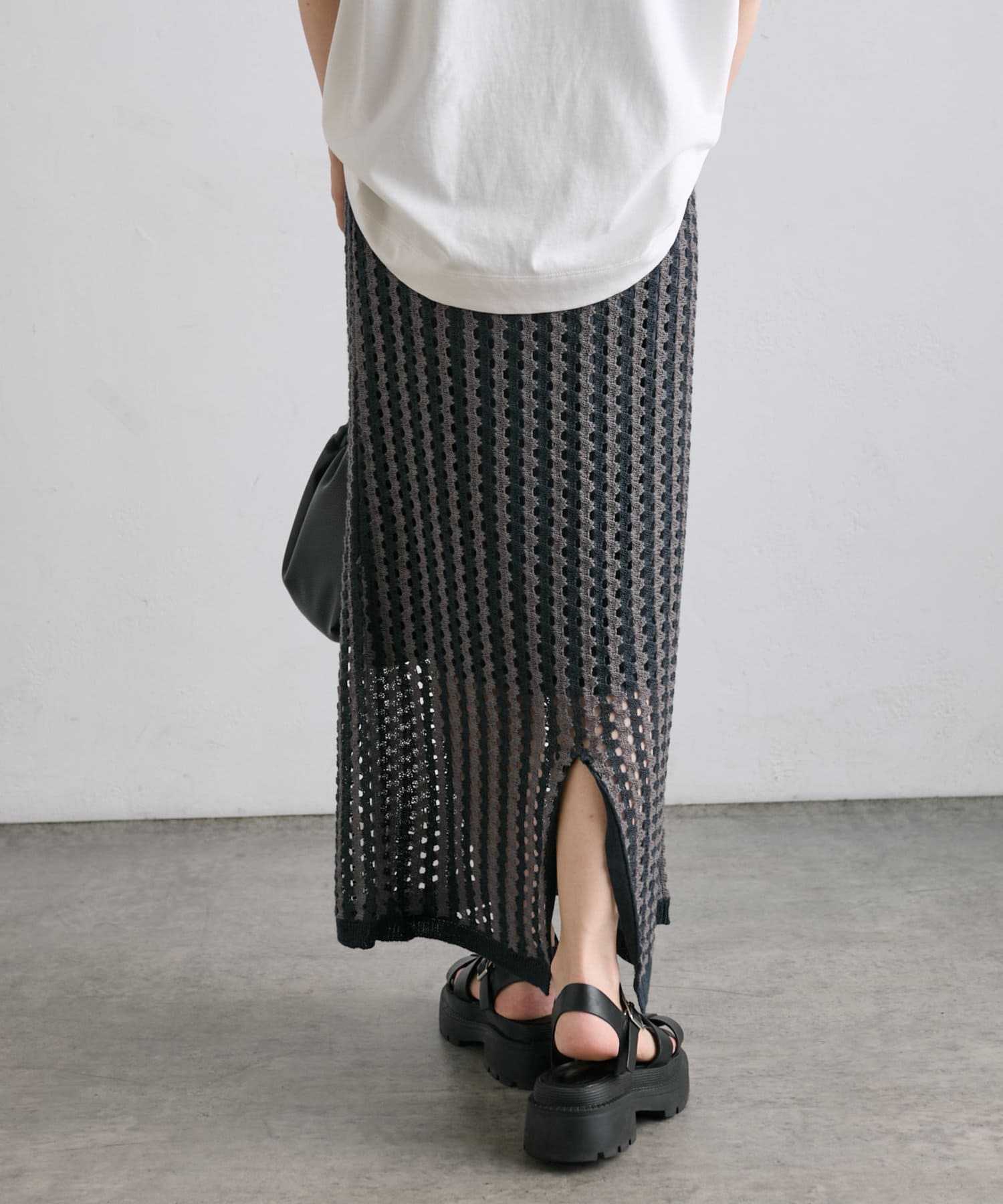透かし編みと配色のストライプが目をひくニットジャガードスカート。
