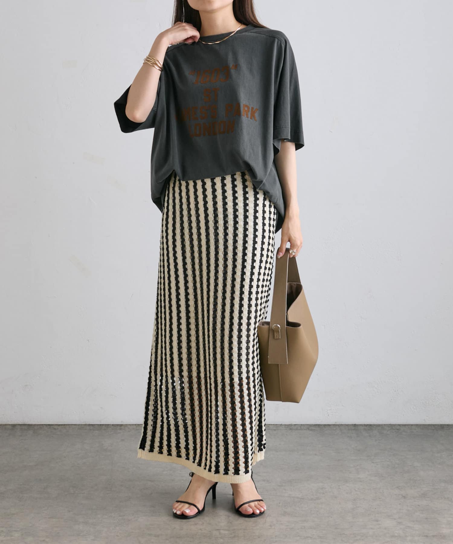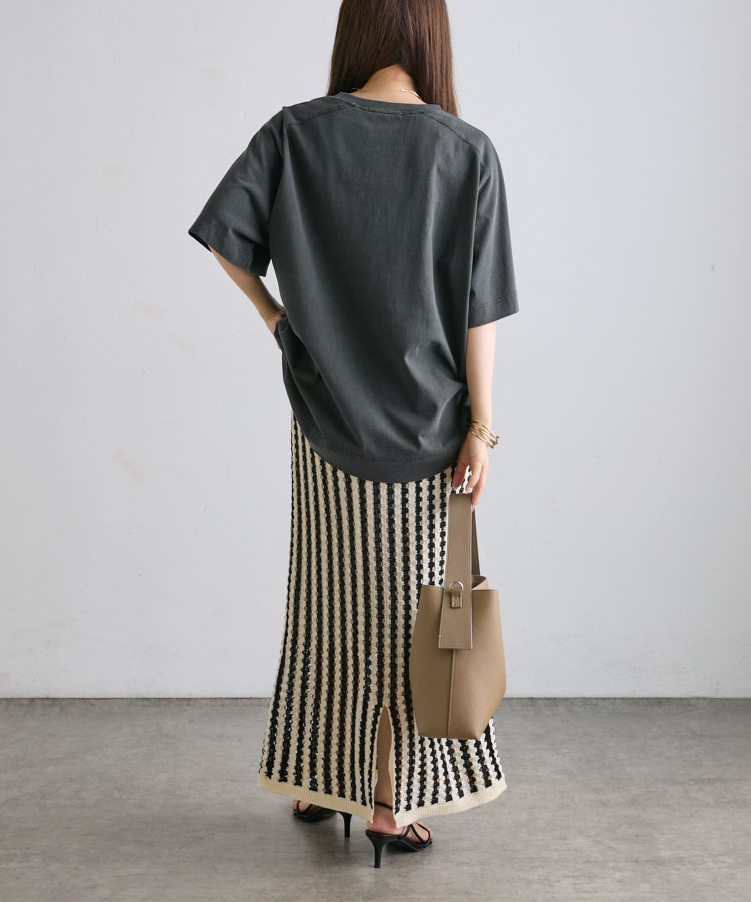 シンプルなニットやスウェット合わせでスタイリングが完成します。