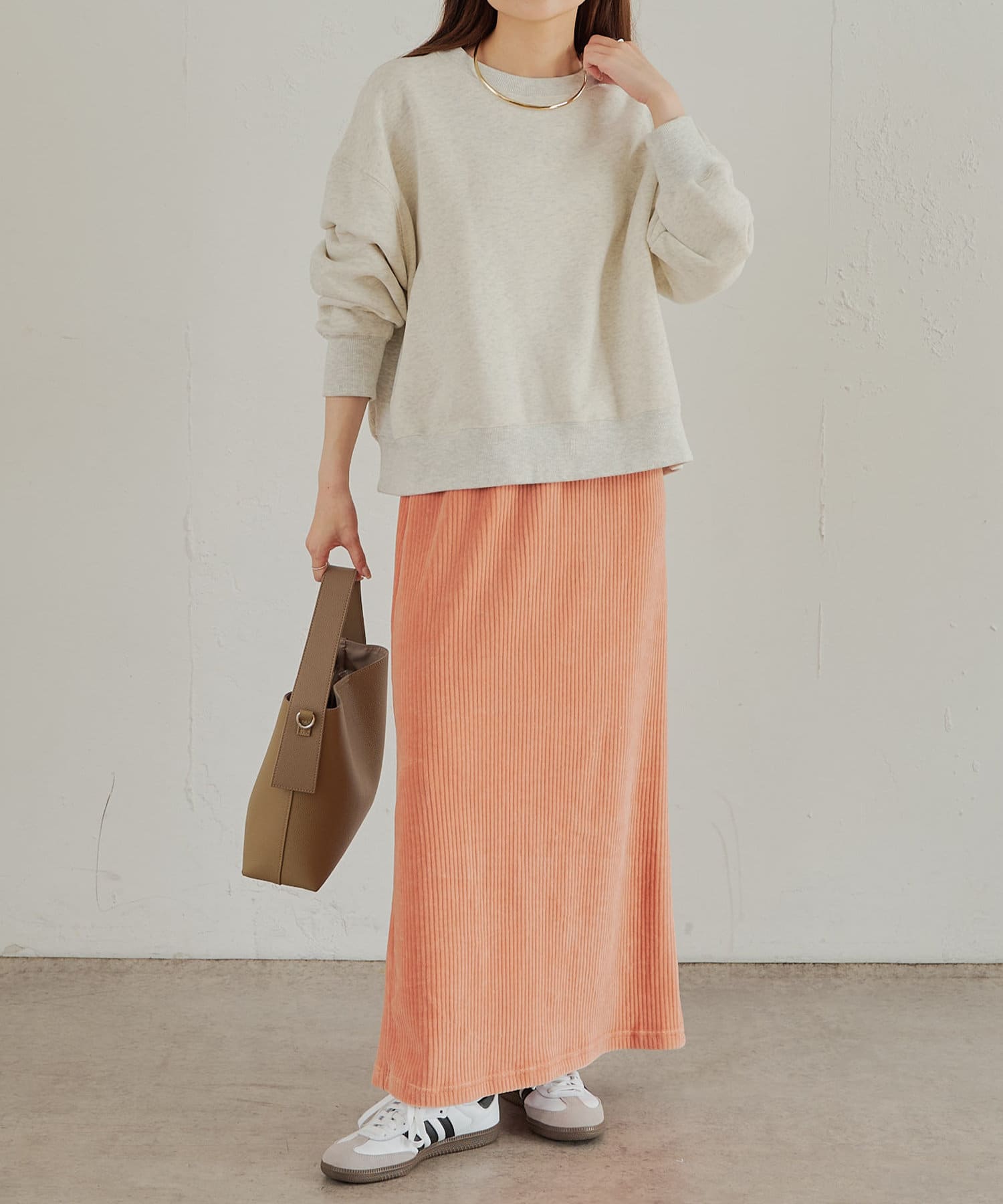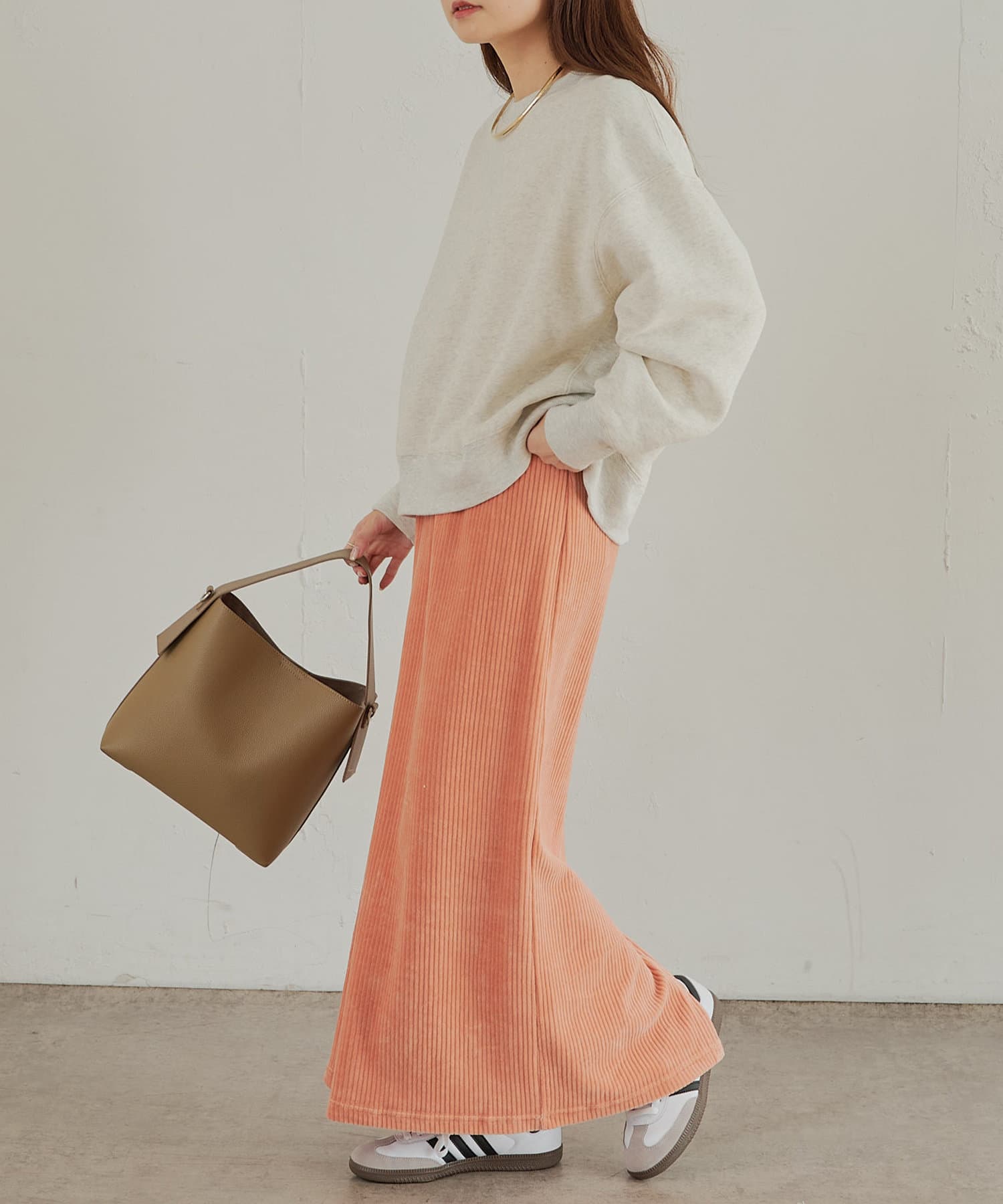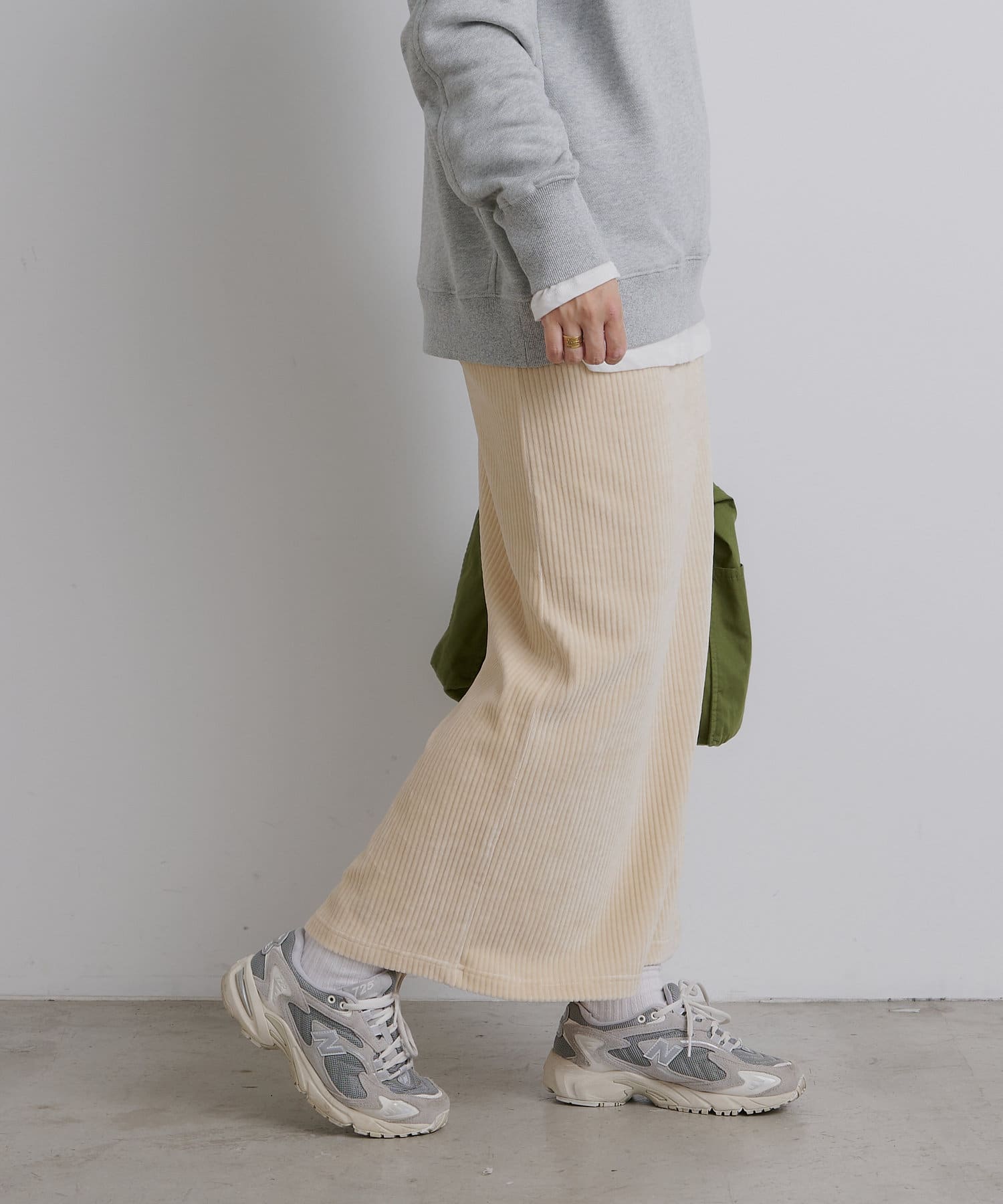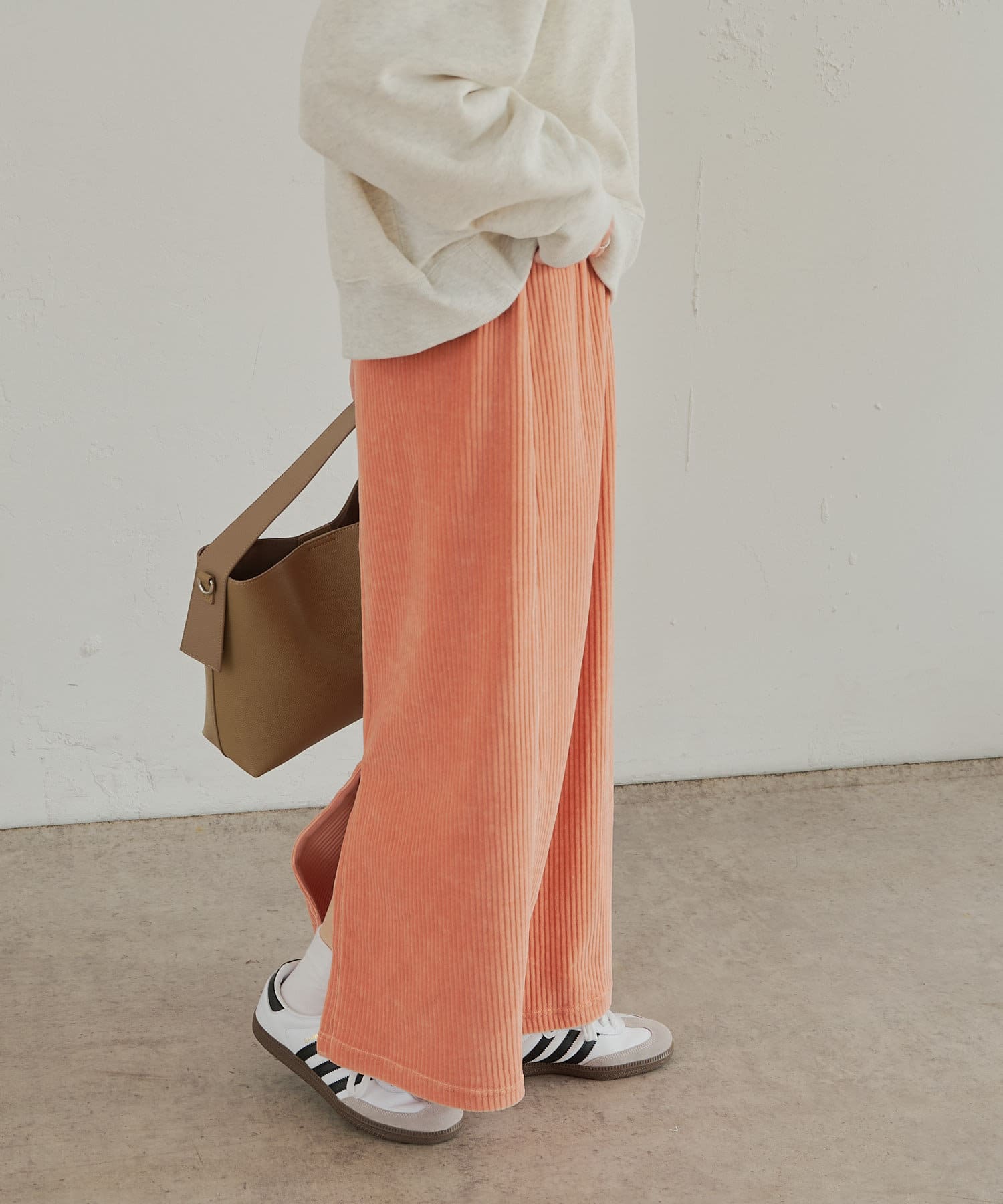 サイズ感:スニーカーやローヒールの靴でも綺麗に穿ける丈感です。とてもストレッチ性が高く、柔らかいコールテン素材です。