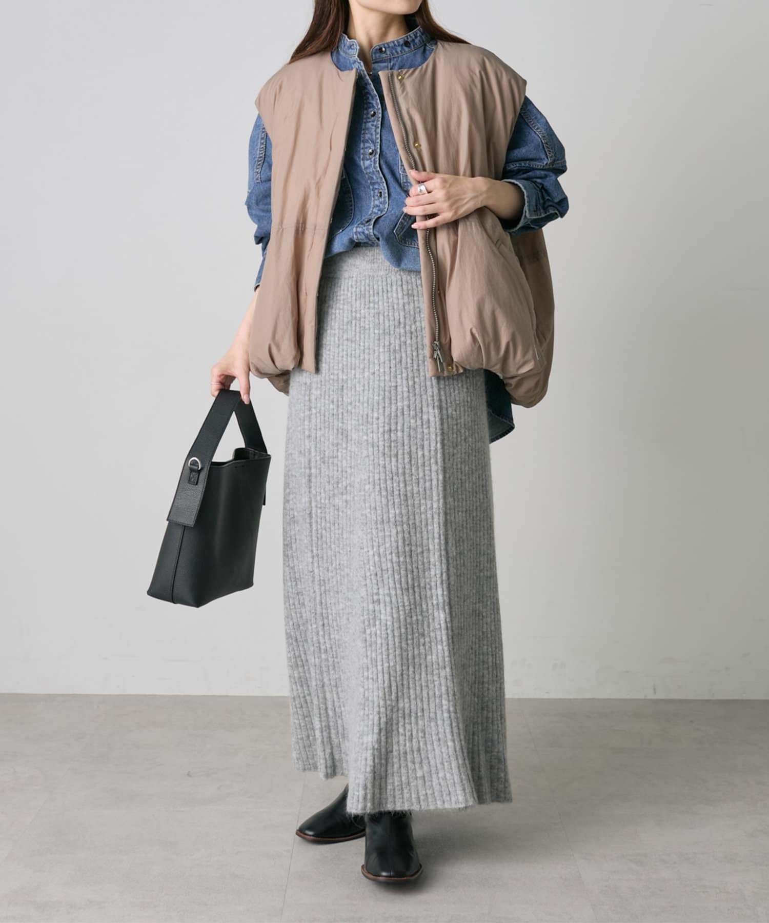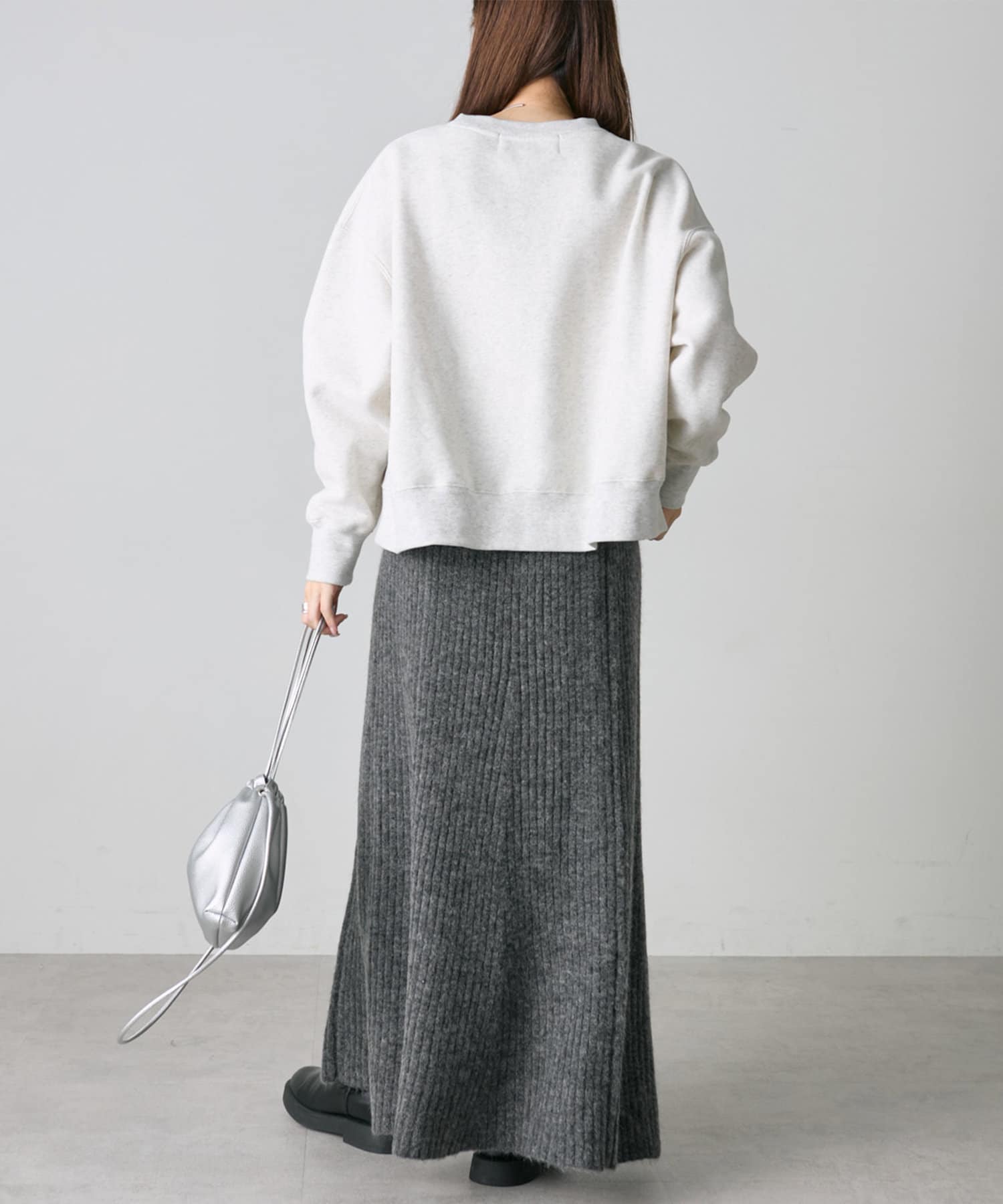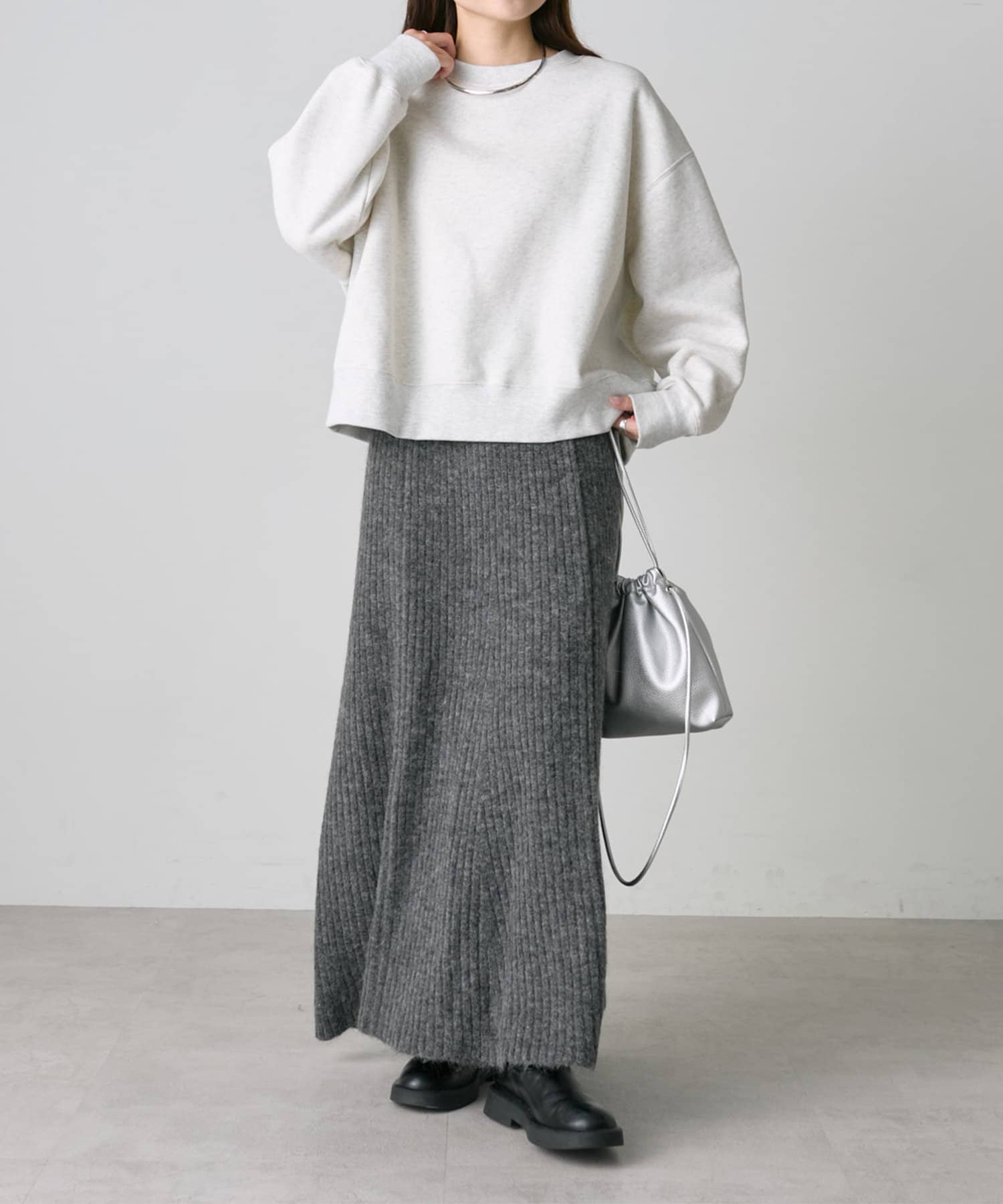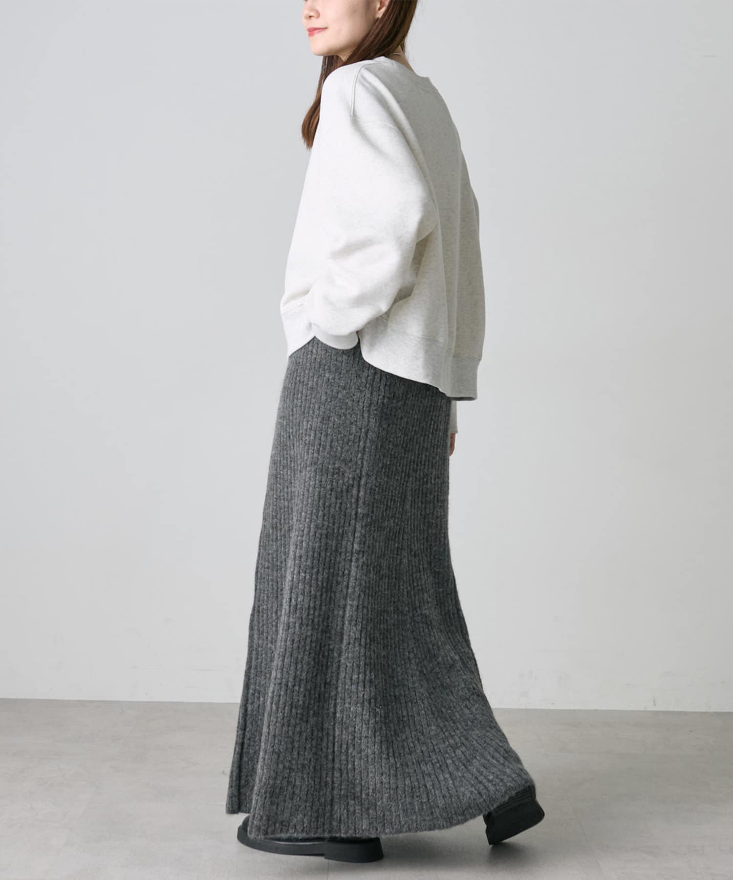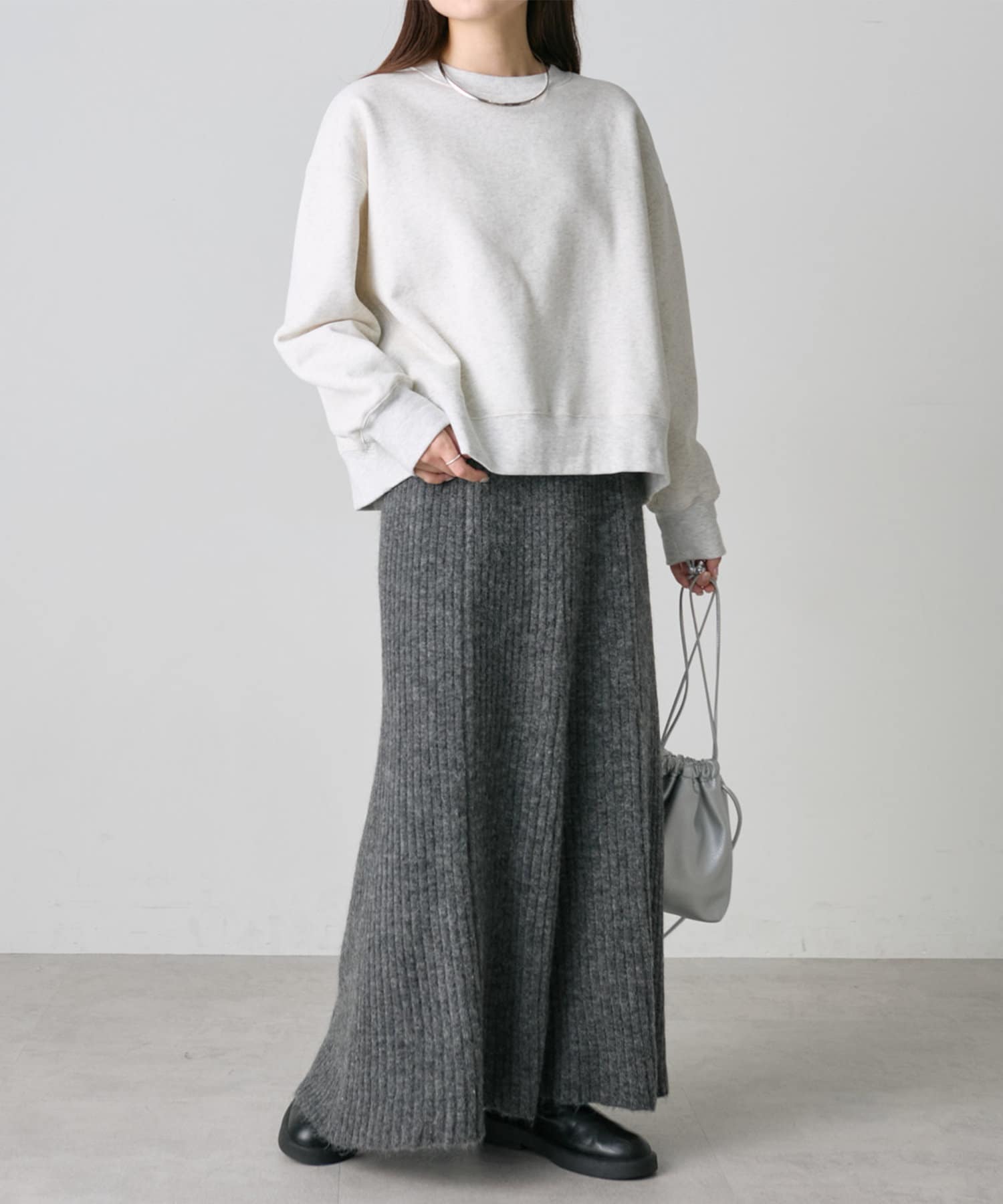 オーバーサイズのニットやスウェットを合わせた抜け感あるルックもおすすめです。