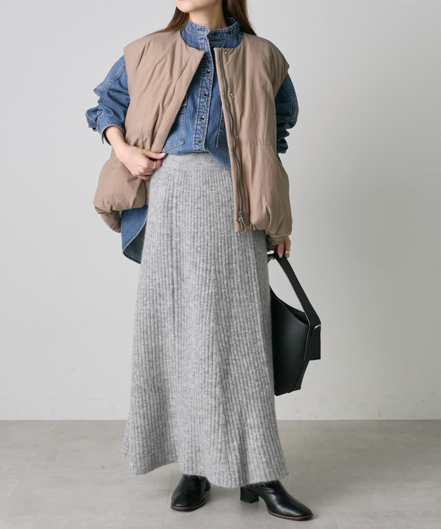 腰回りがすっきりとしたフレアシルエットは、トップスのシルエットを選ばず着回し力が高いのが魅力。