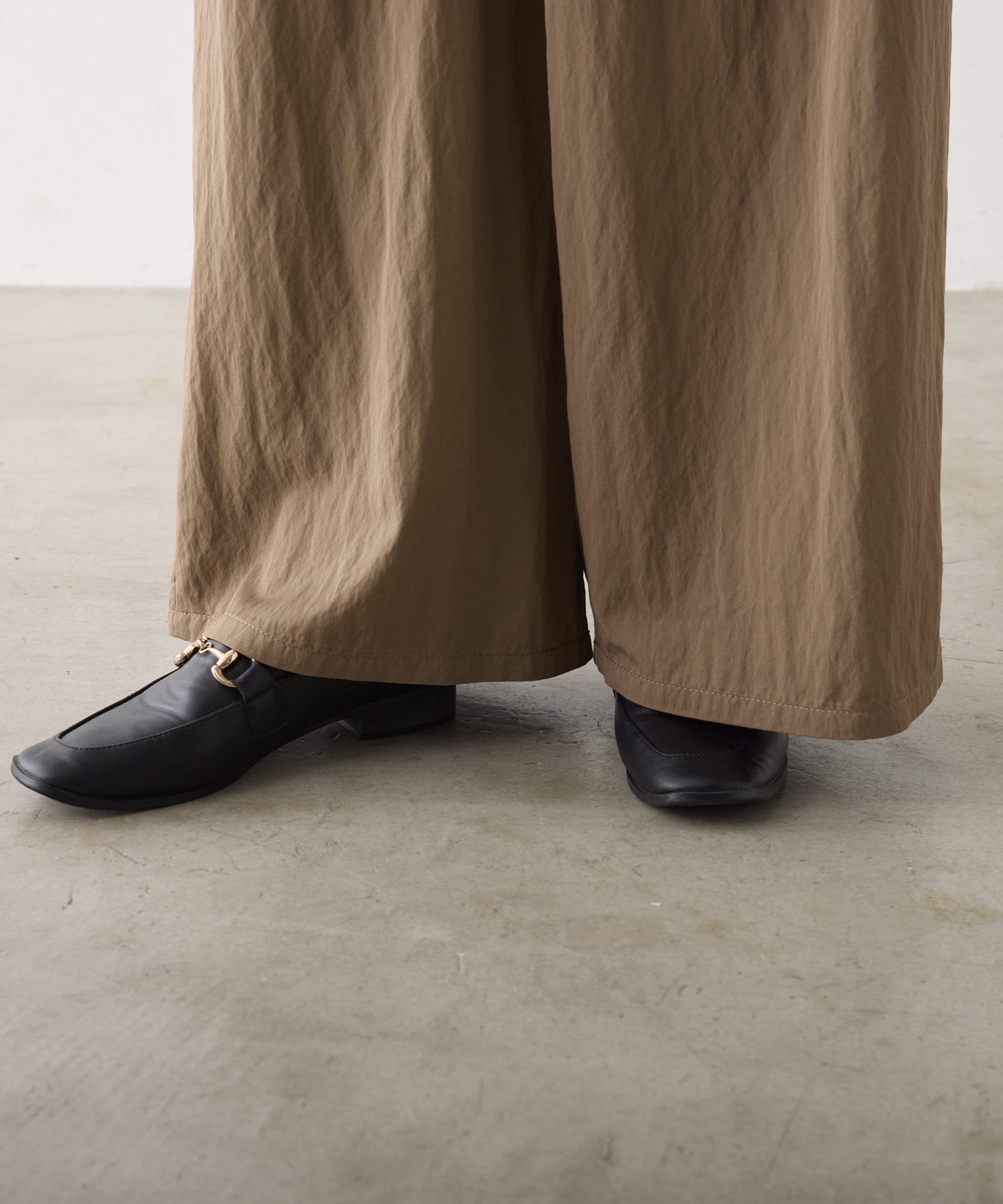 ゆとりのあるワイドストレートのシルエットで下半身のラインを拾わないのが嬉しいポイント。