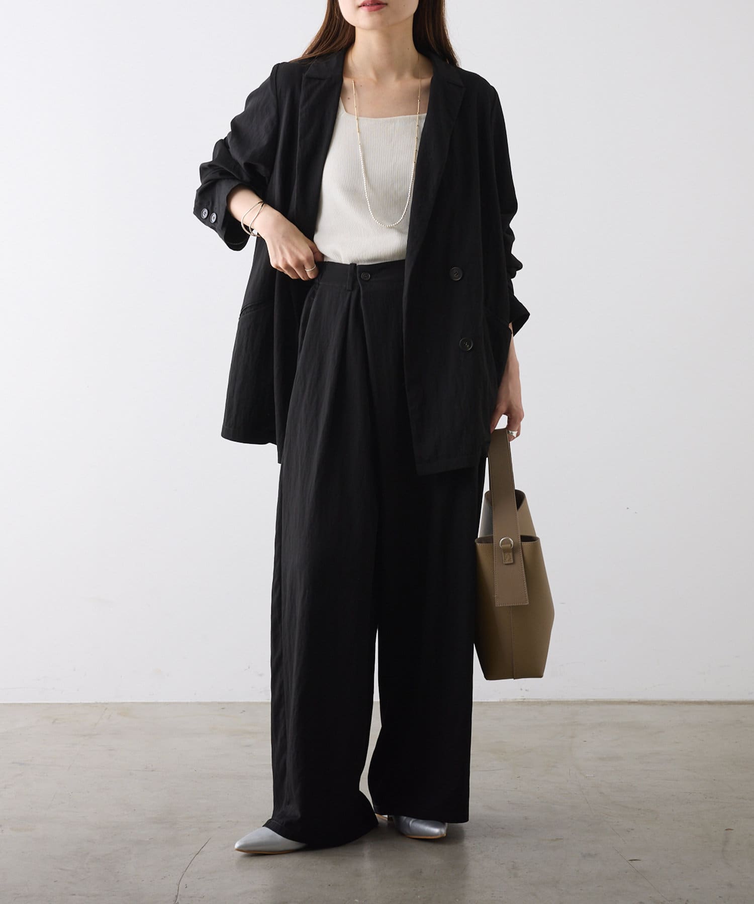 同素材のダブルテーラードジャケットを合わせたスタイリングもおすすめ。