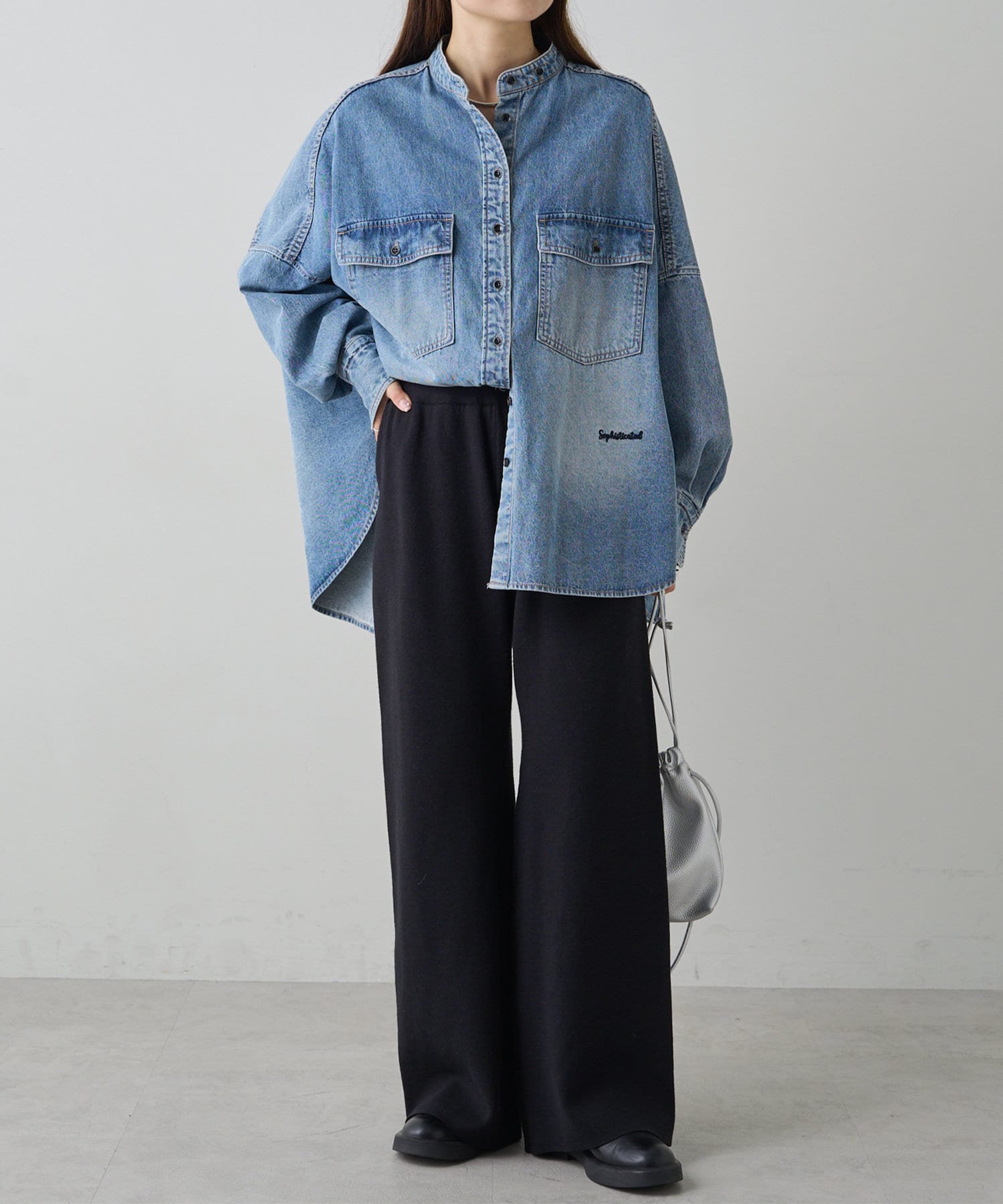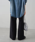ゆとりを持ったストレートシルエットと伸縮性のある裏地の効果で、ボディラインを拾わずに着用可能。