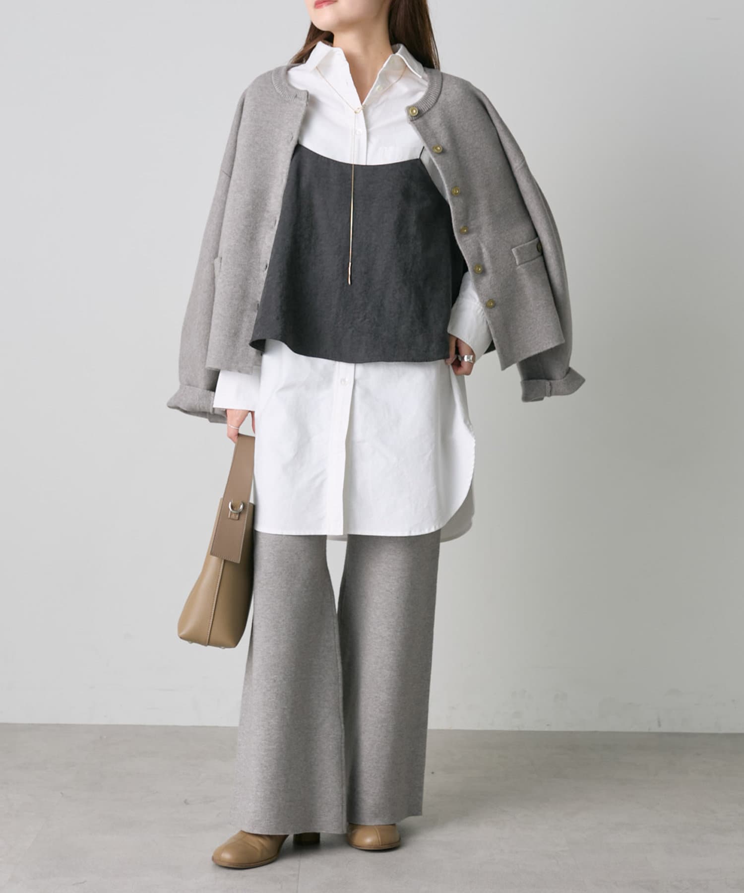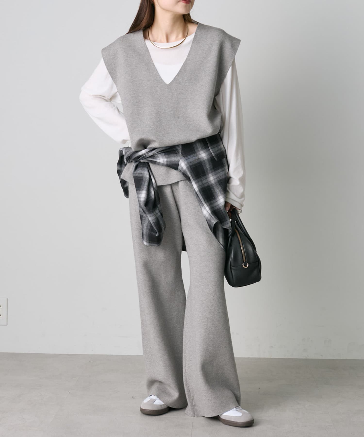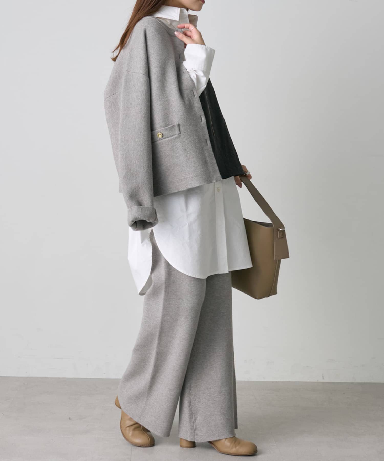 同素材のシリーズのベストやカーディガンを合わせると、セットアップで着用して頂けます。