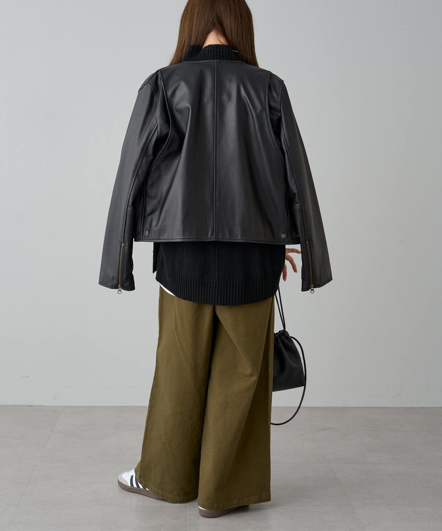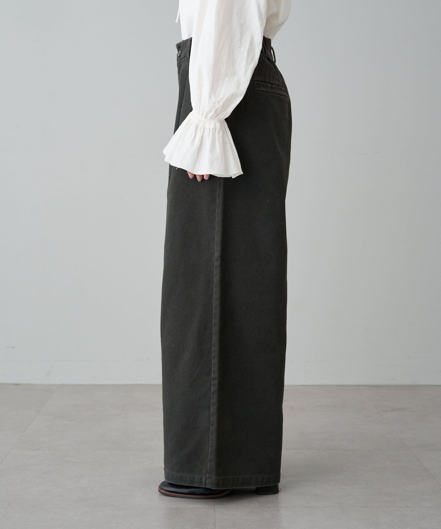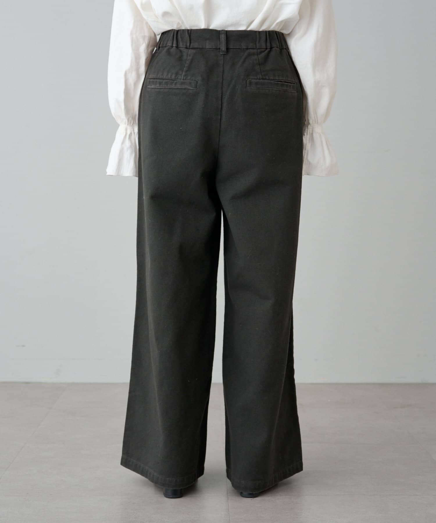 フロントにタックが入っており、程よくゆとりのあるストレートシルエットで、脚のラインをカバーしつつこなれ感のあるスタイリングが完成します。