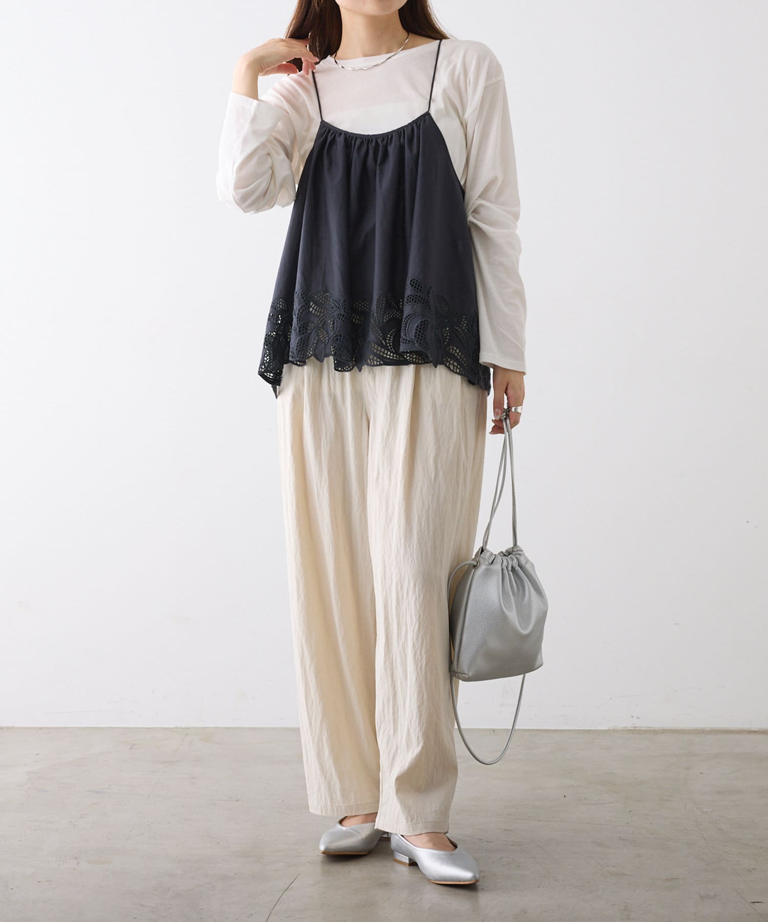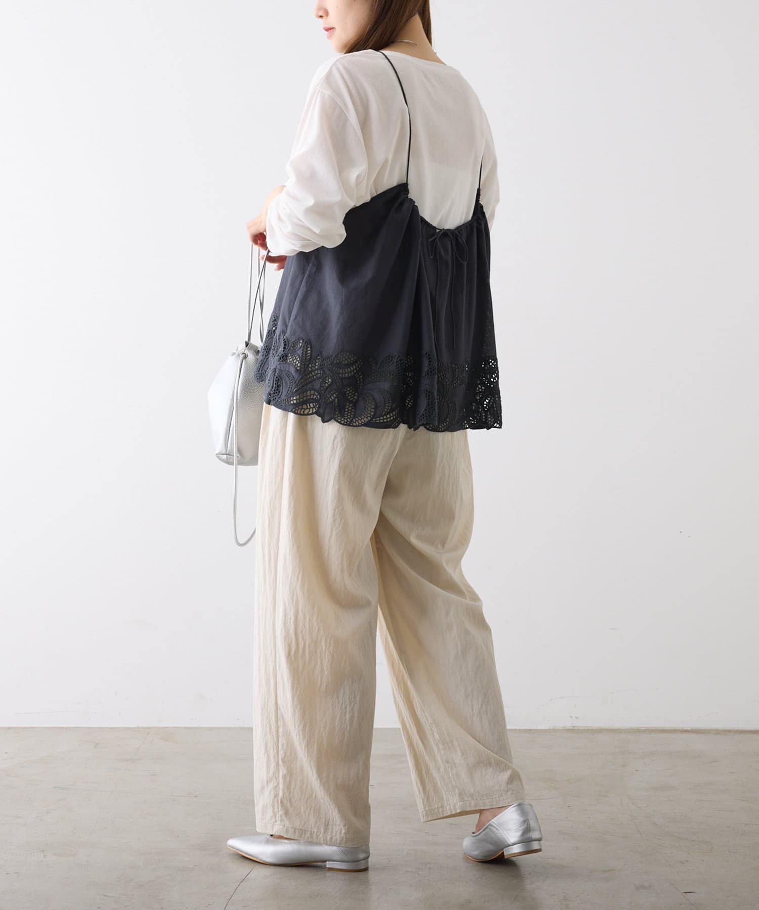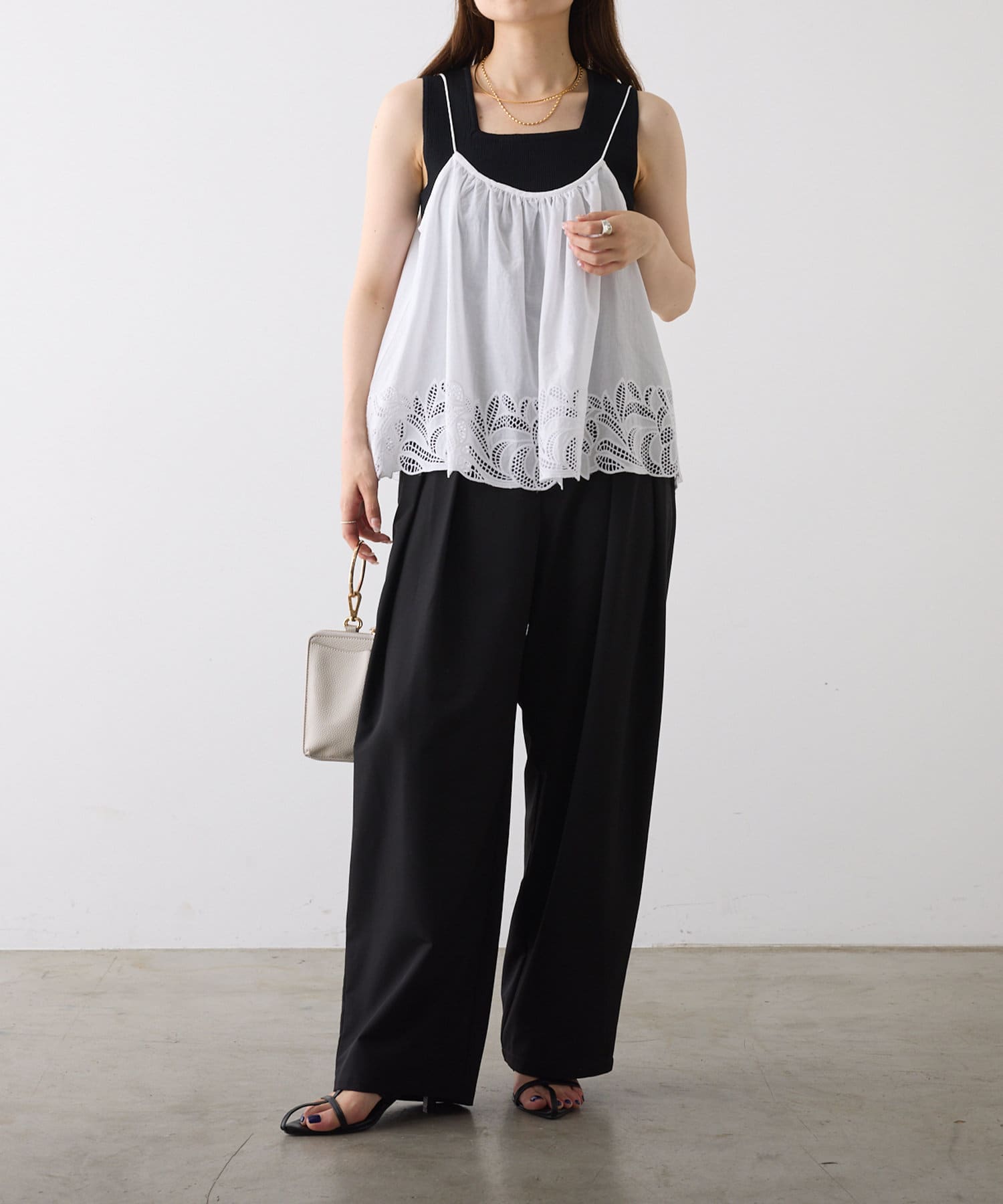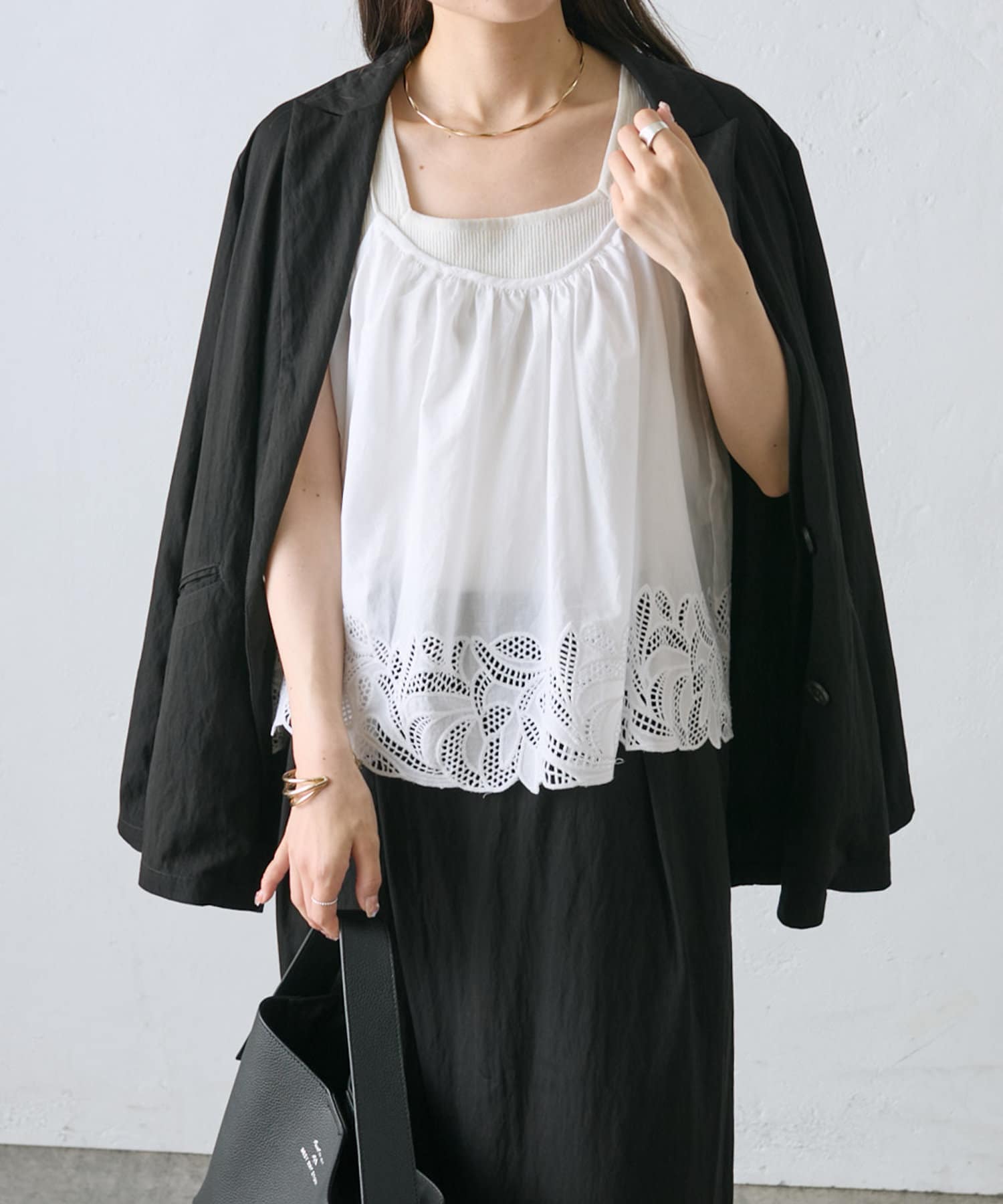 スクエアネックタンクトップや、キャミソールインナーを合わせて