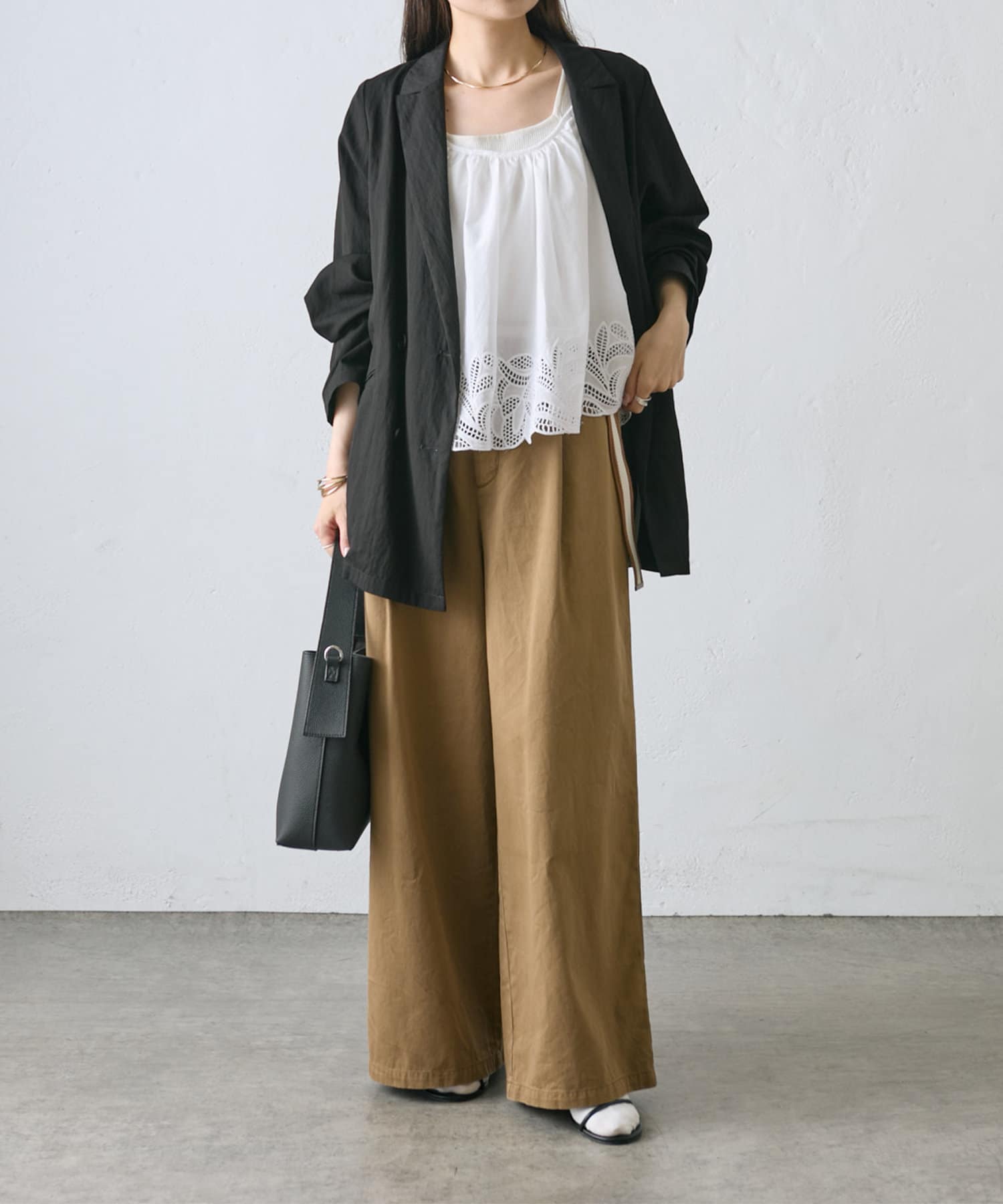 布帛素材なので、インナーにはカットソーやニット素材のアイテムが好相性。