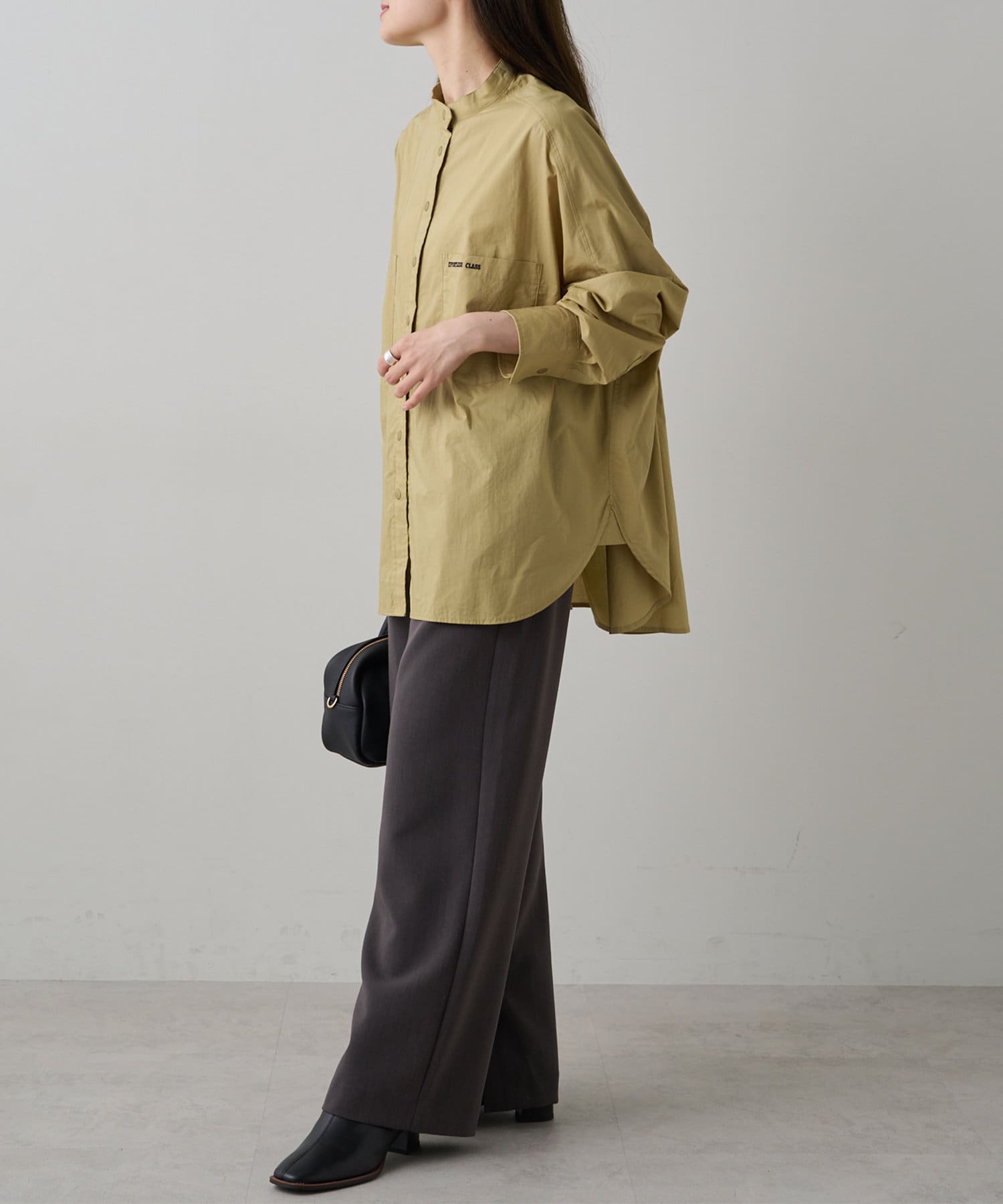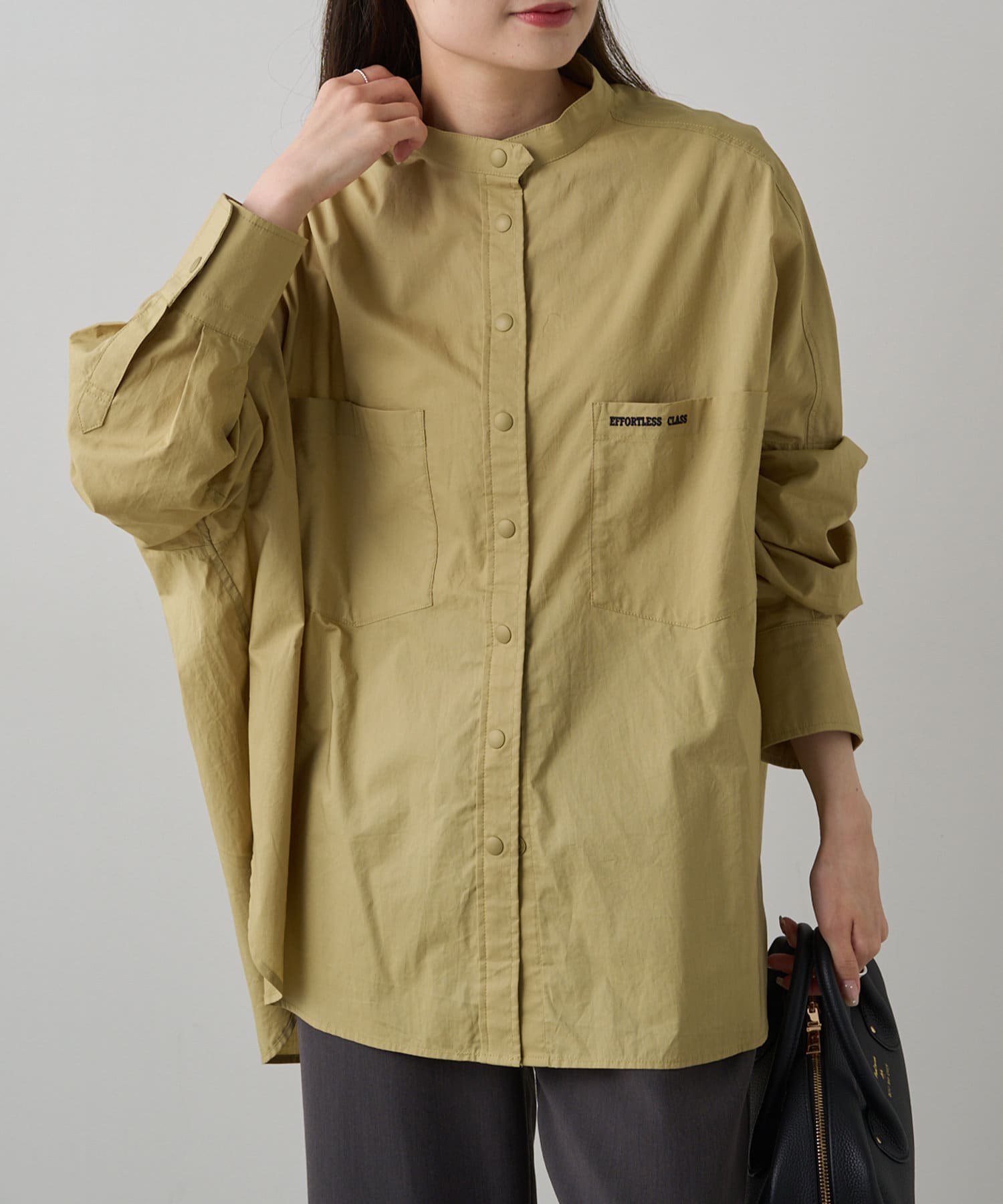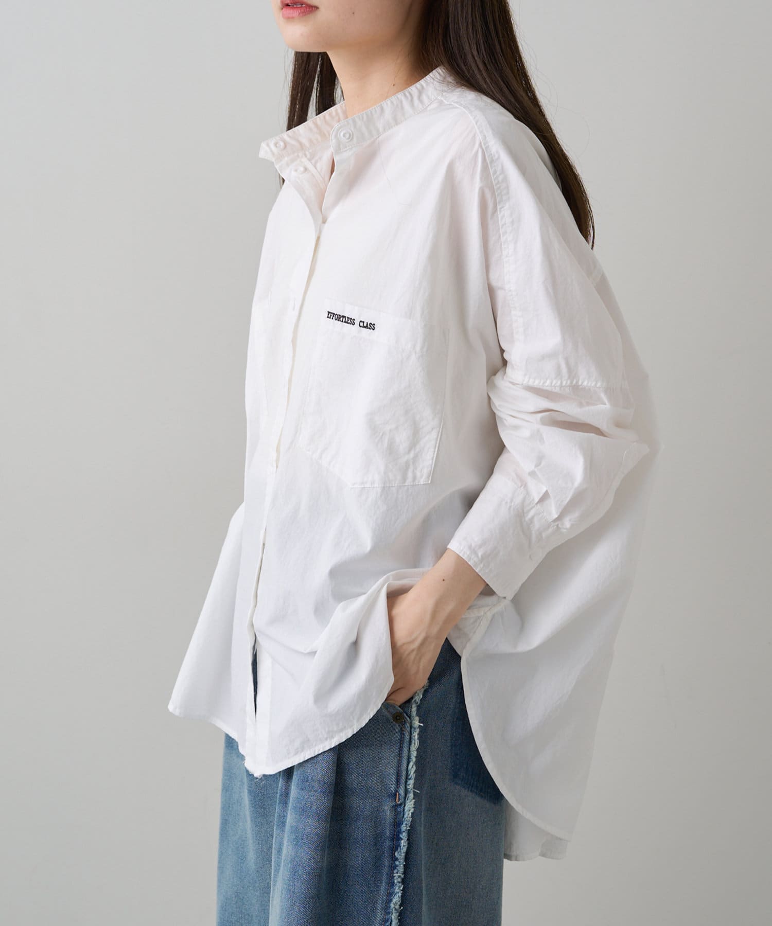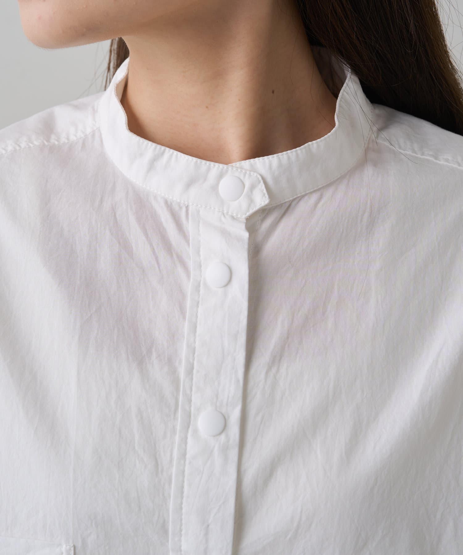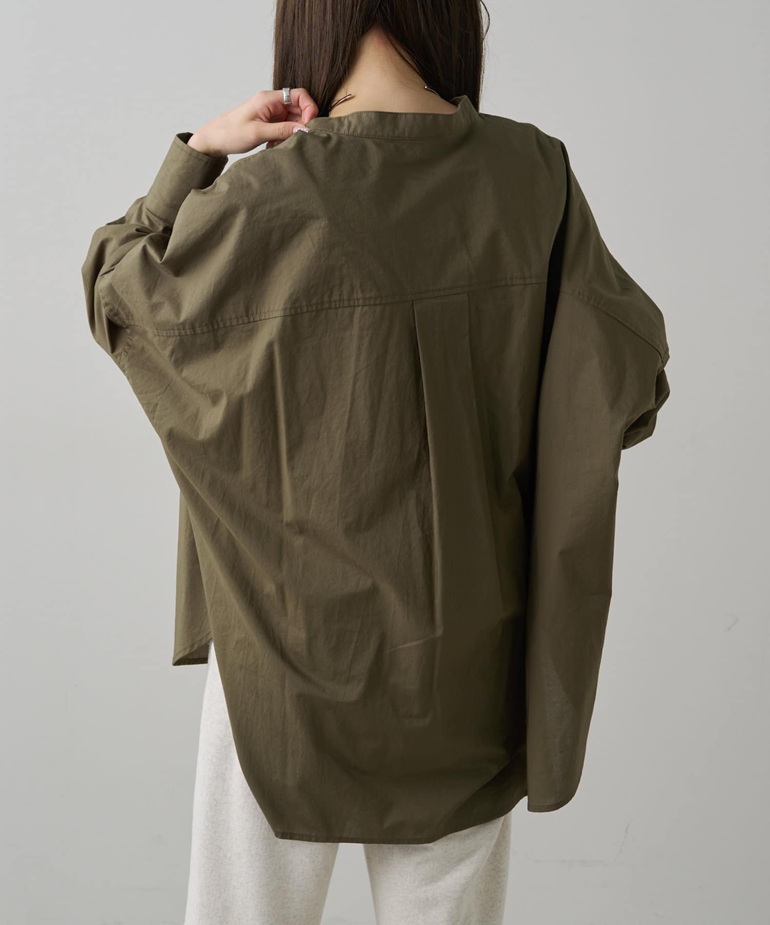 INスタイルもOUTスタイルも決まりやすいバンドカラーシャツ。