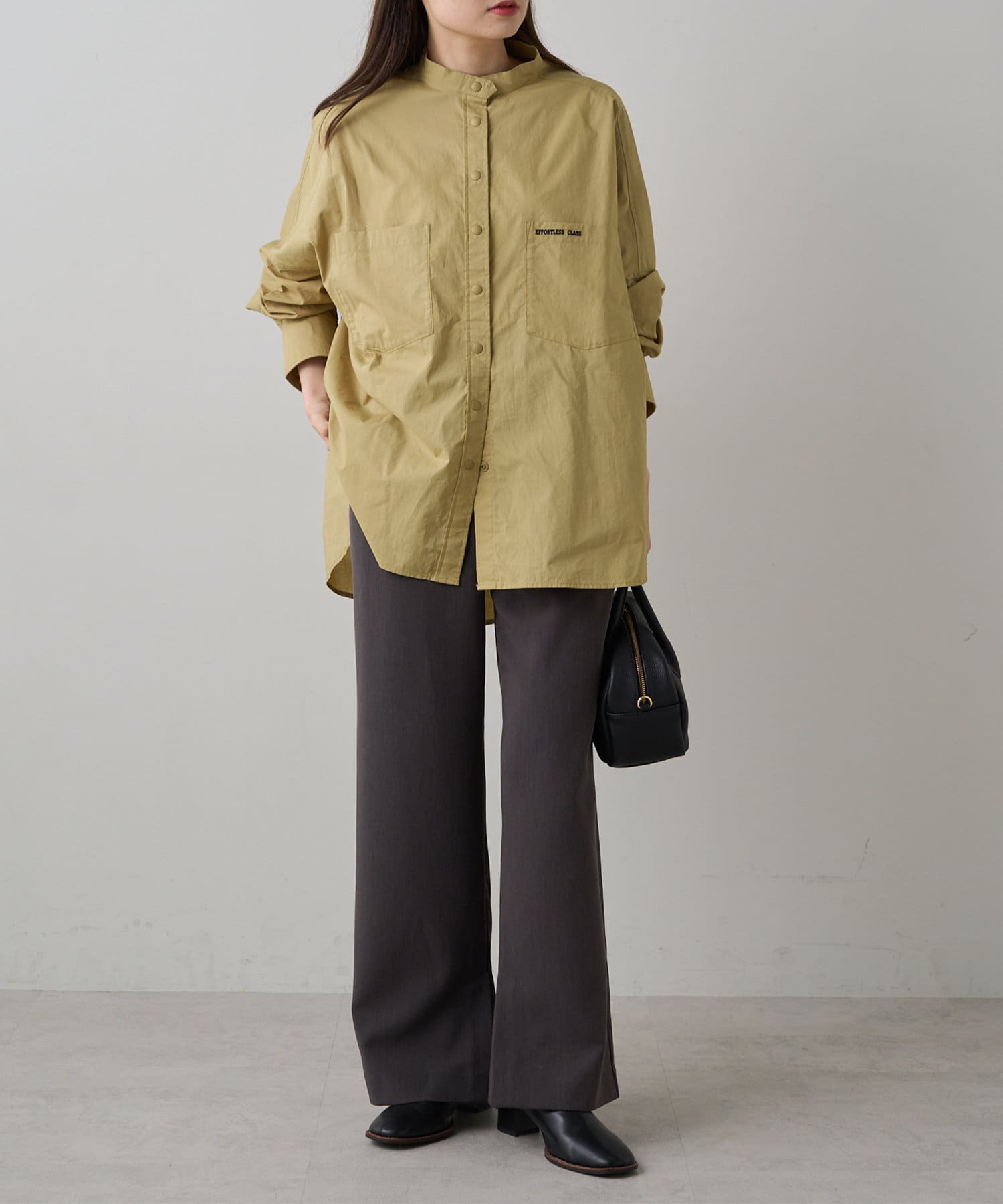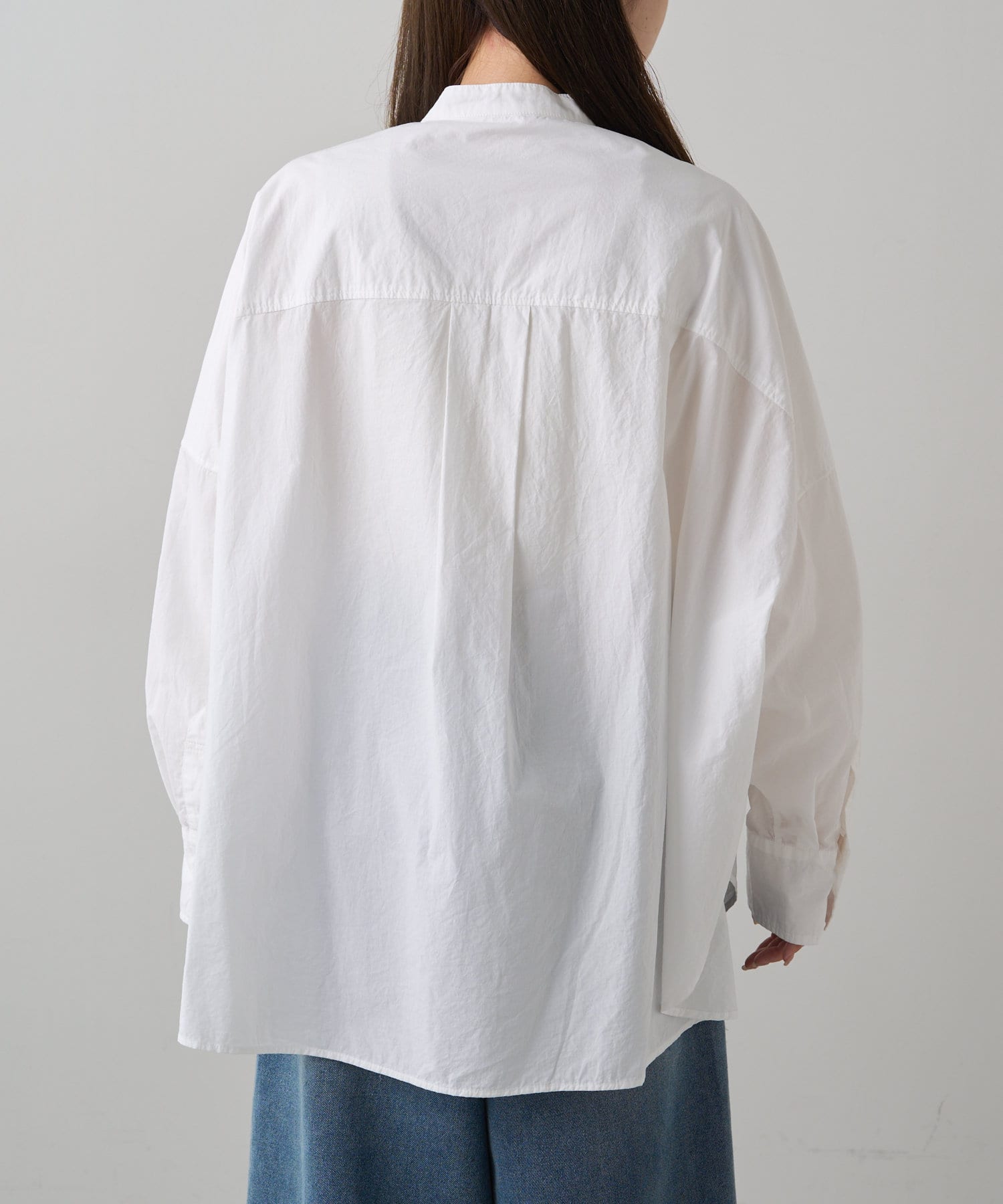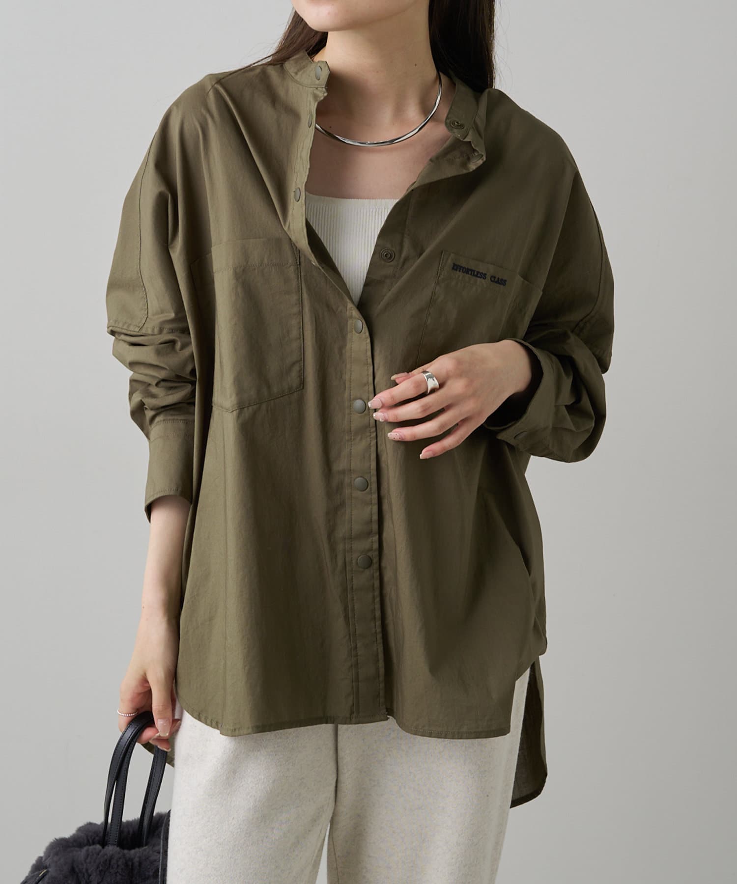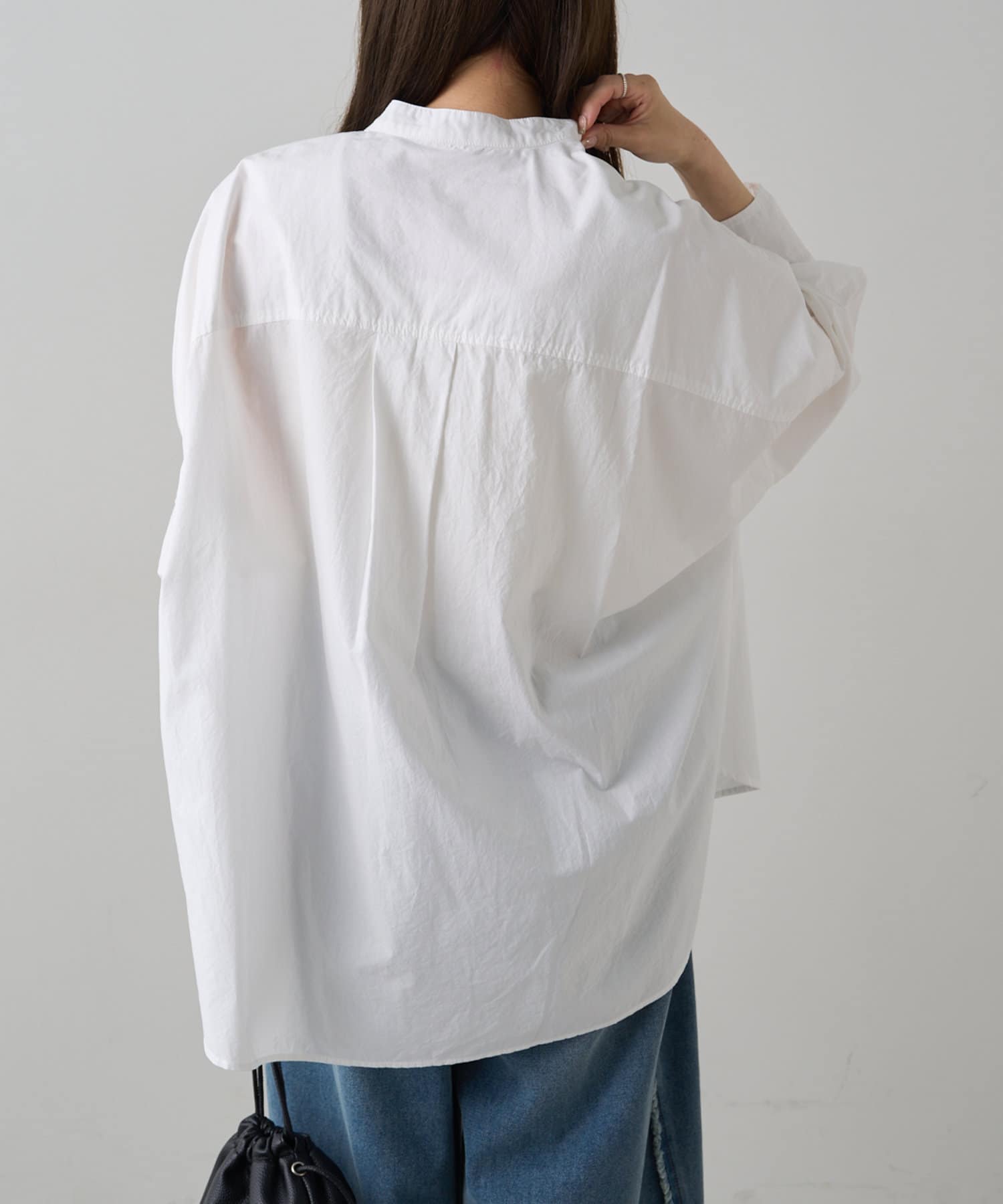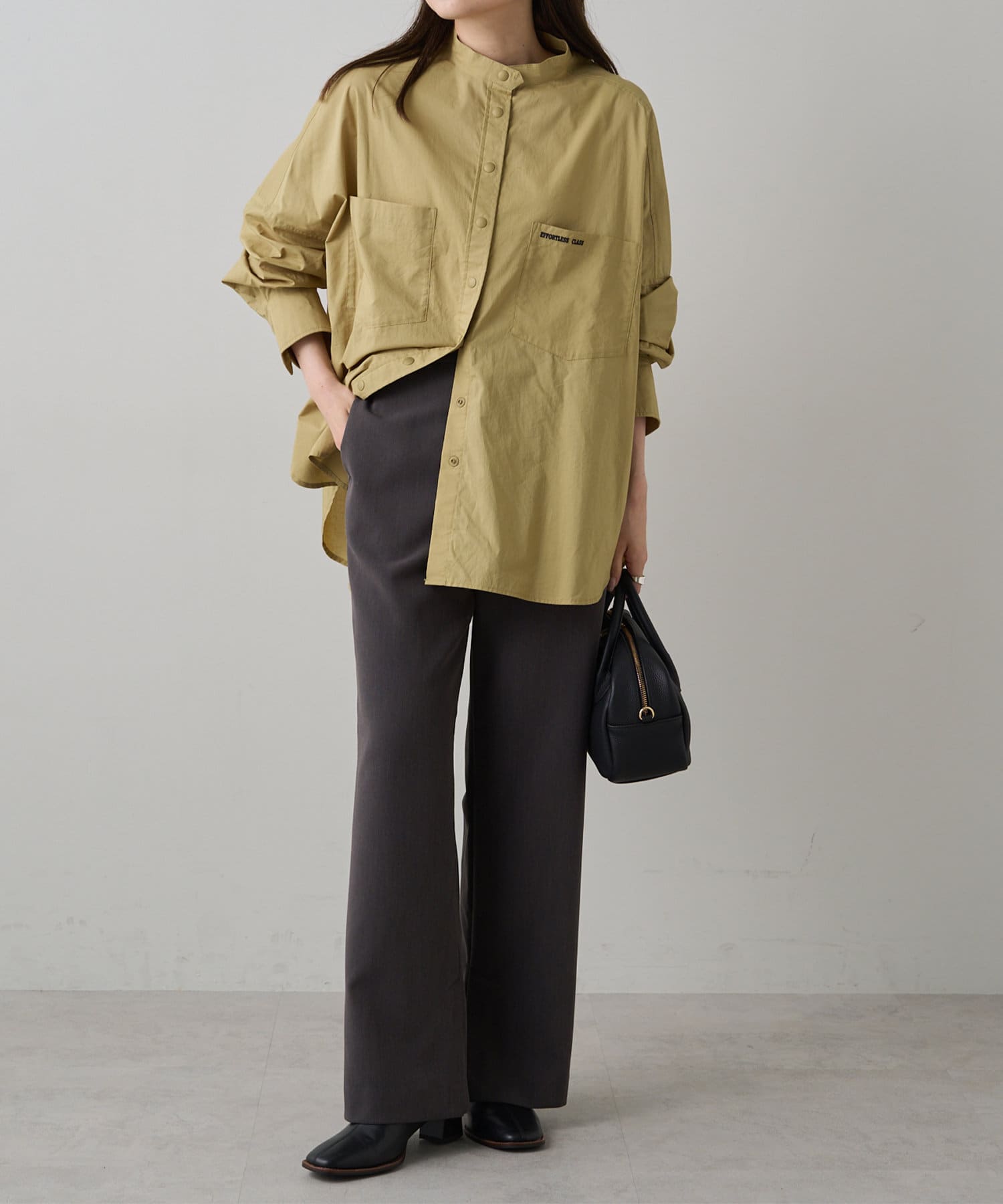 INスタイルもOUTスタイルも決まりやすいバンドカラーシャツ。