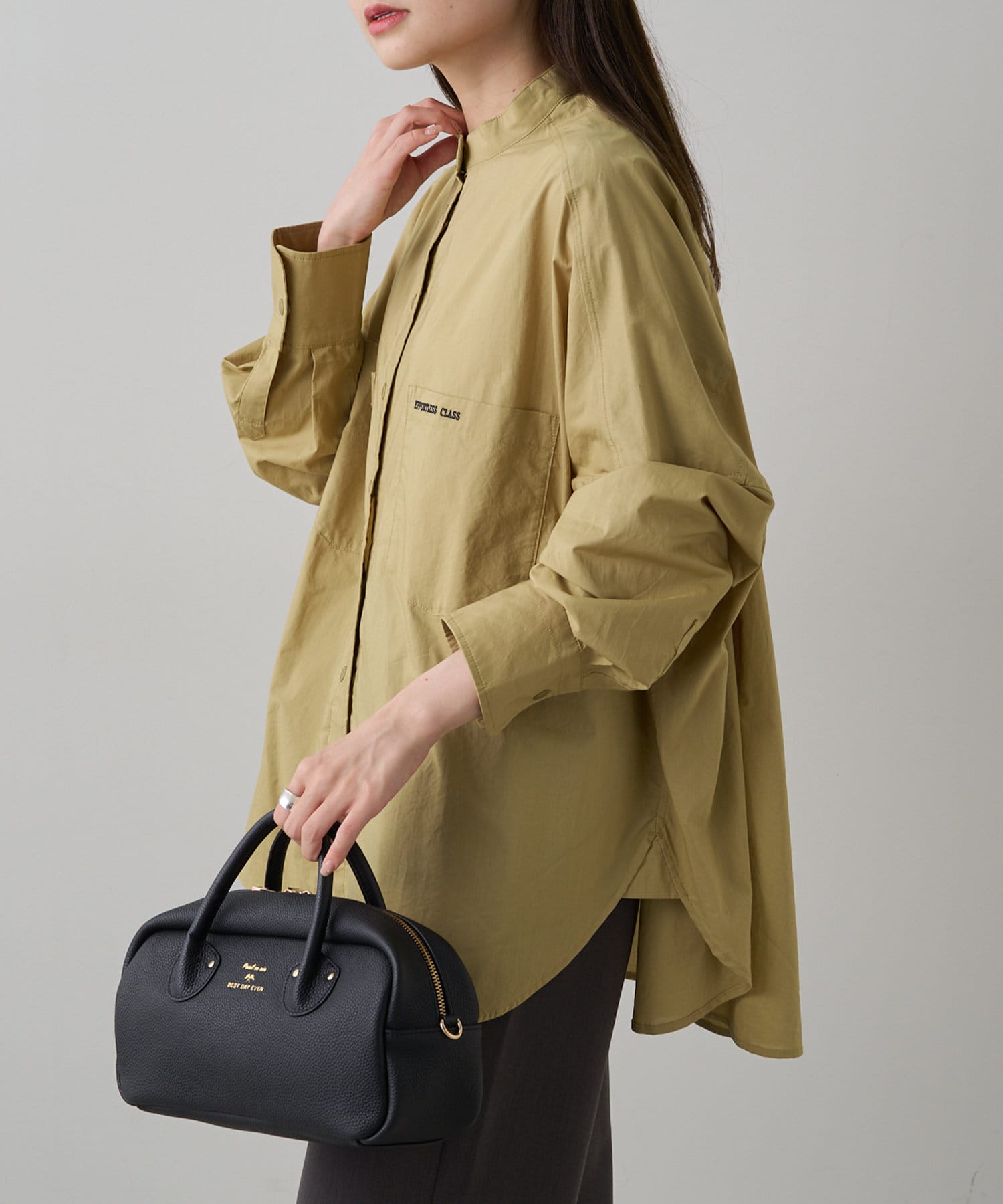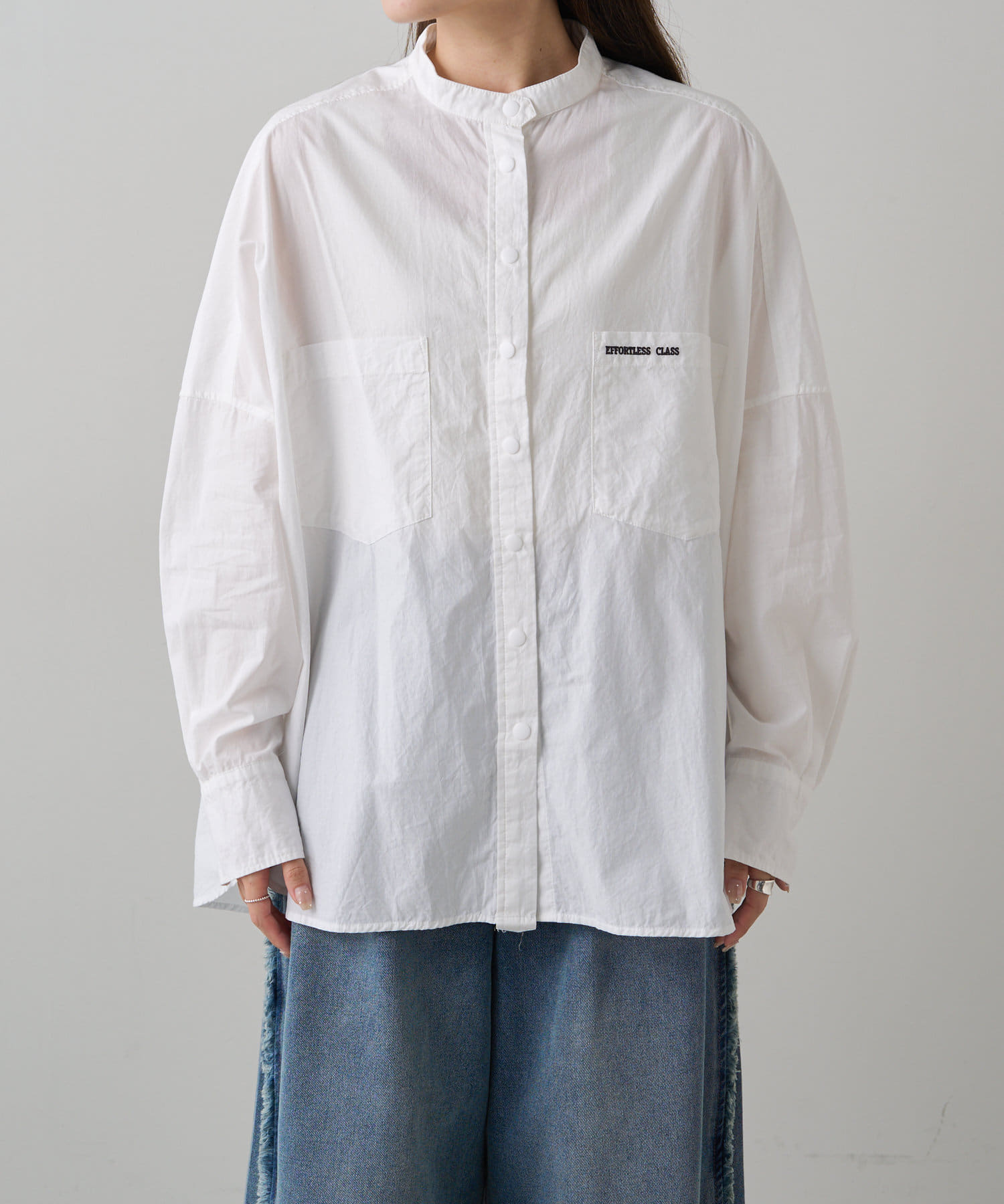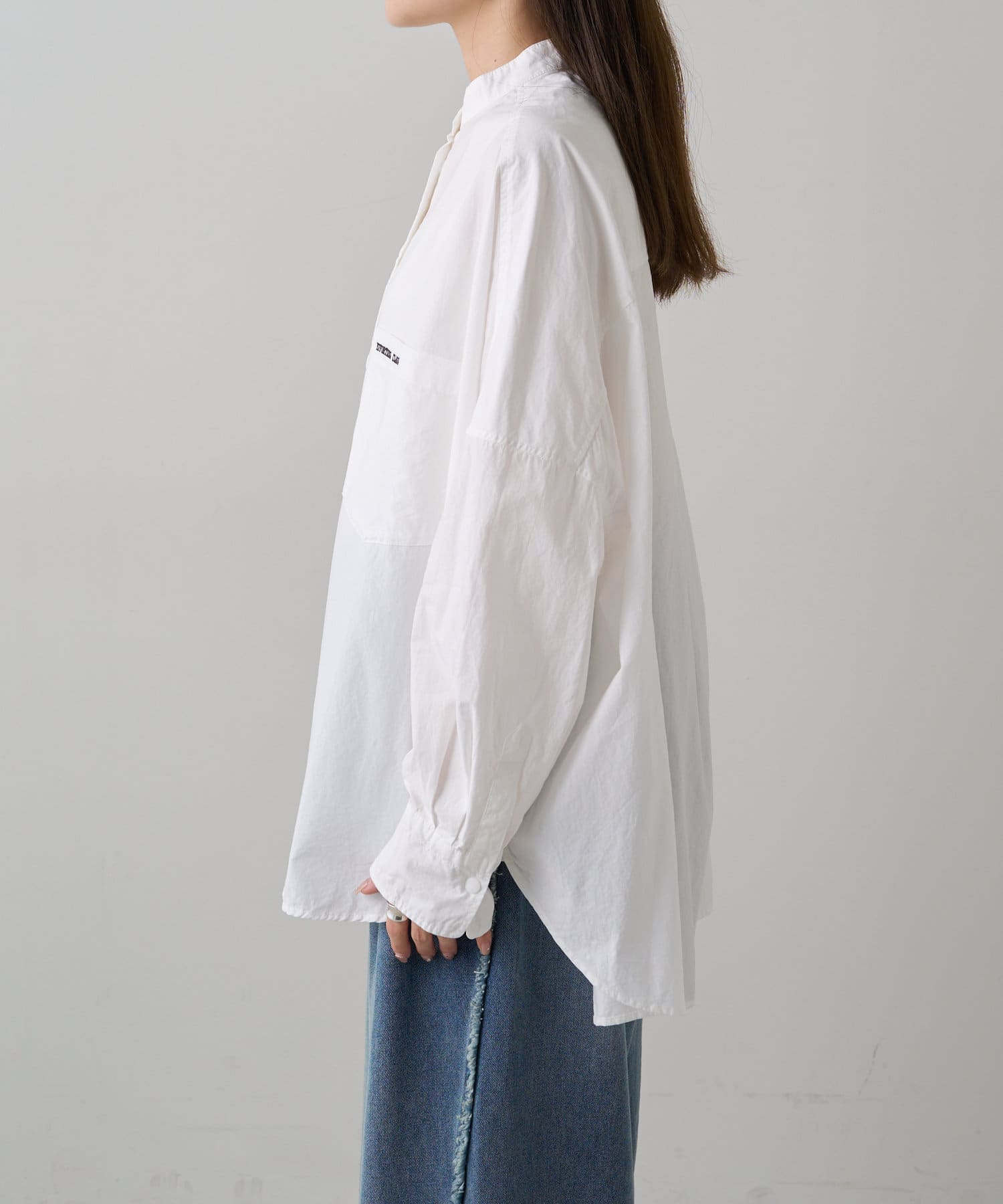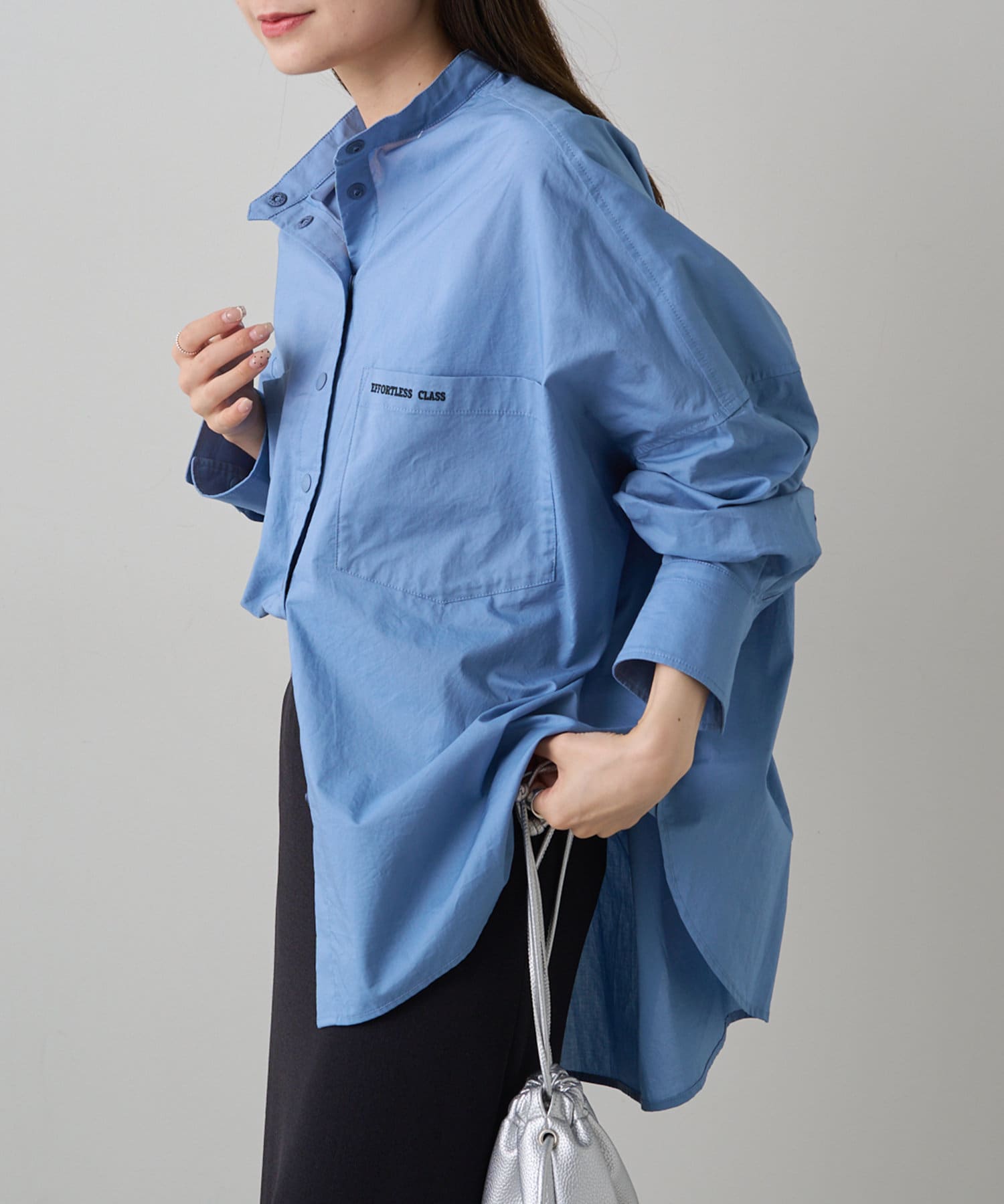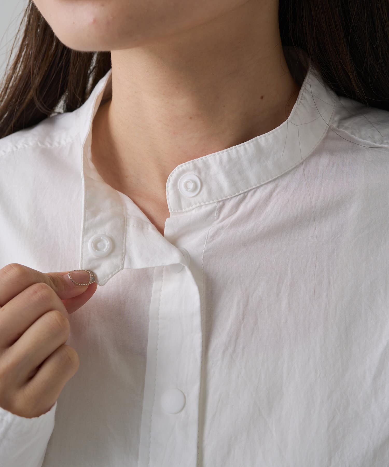 INスタイルもOUTスタイルも決まりやすいバンドカラーシャツ。