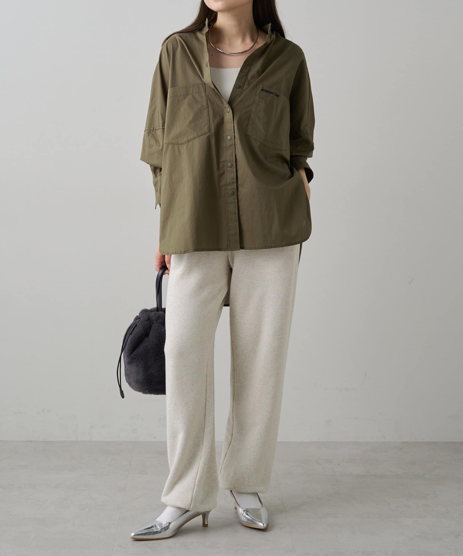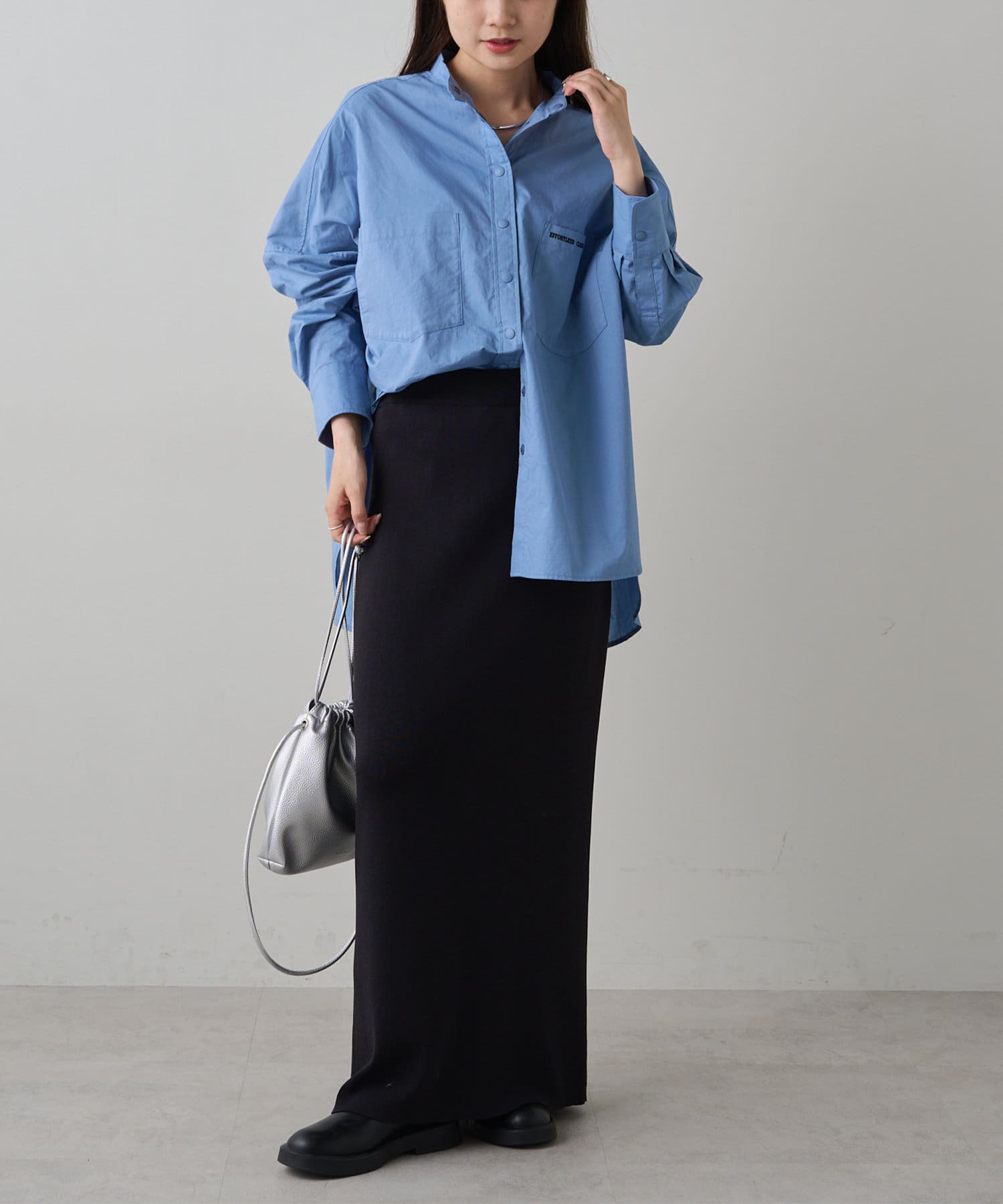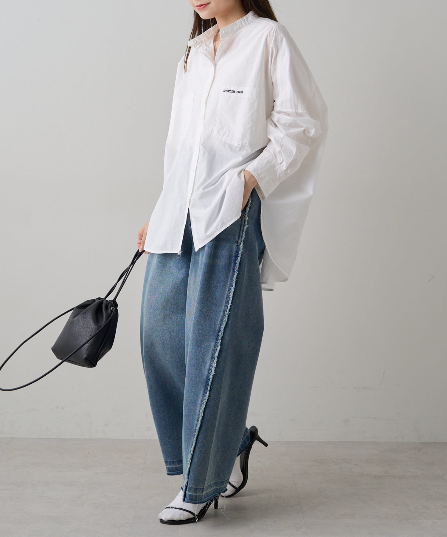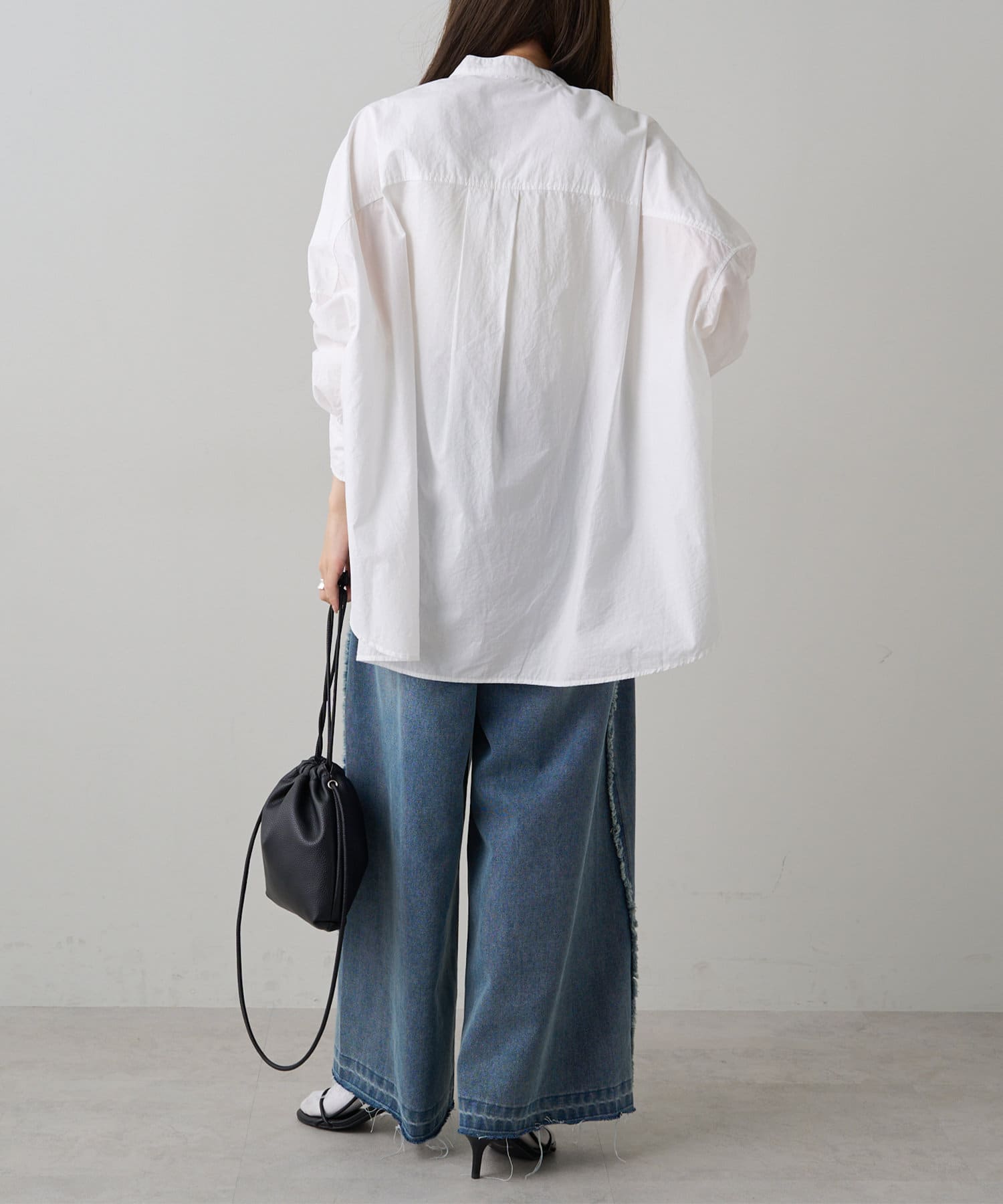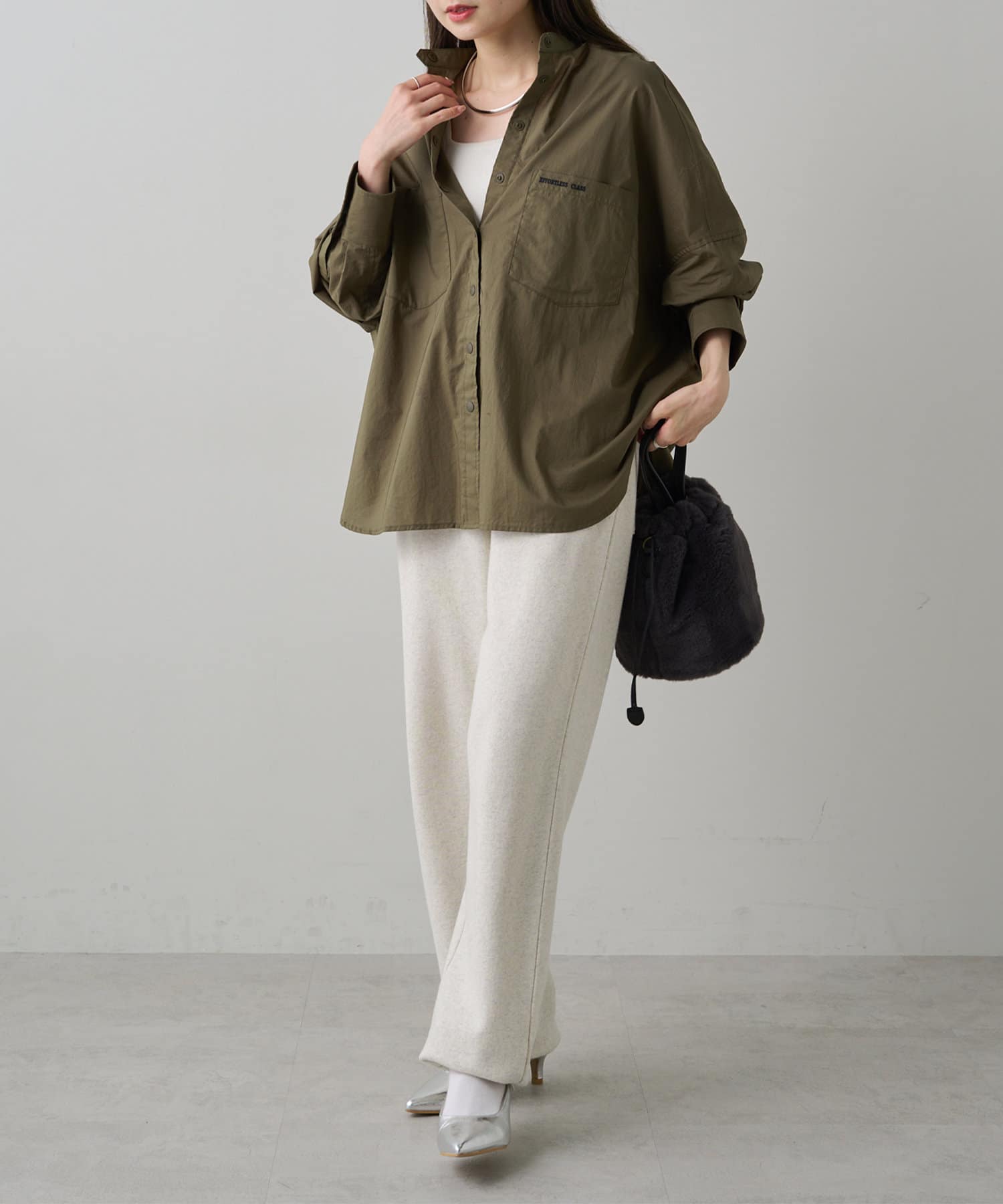 INスタイルもOUTスタイルも決まりやすいバンドカラーシャツ。