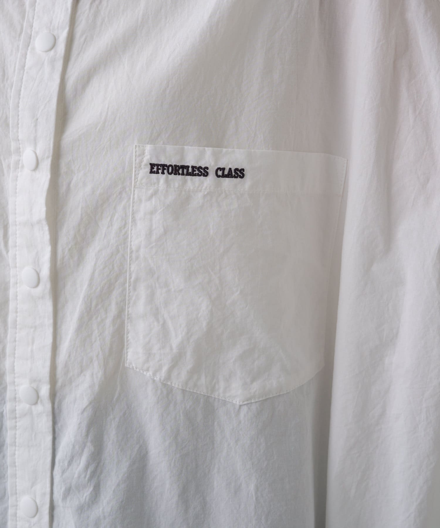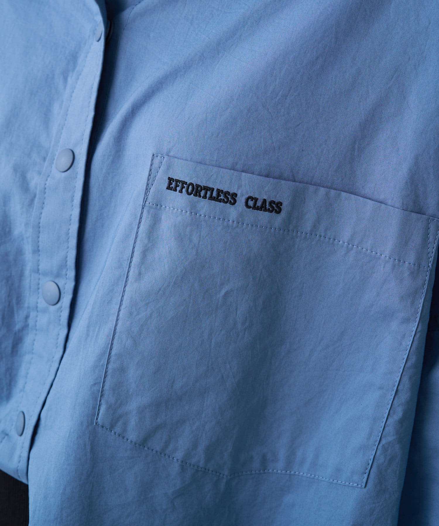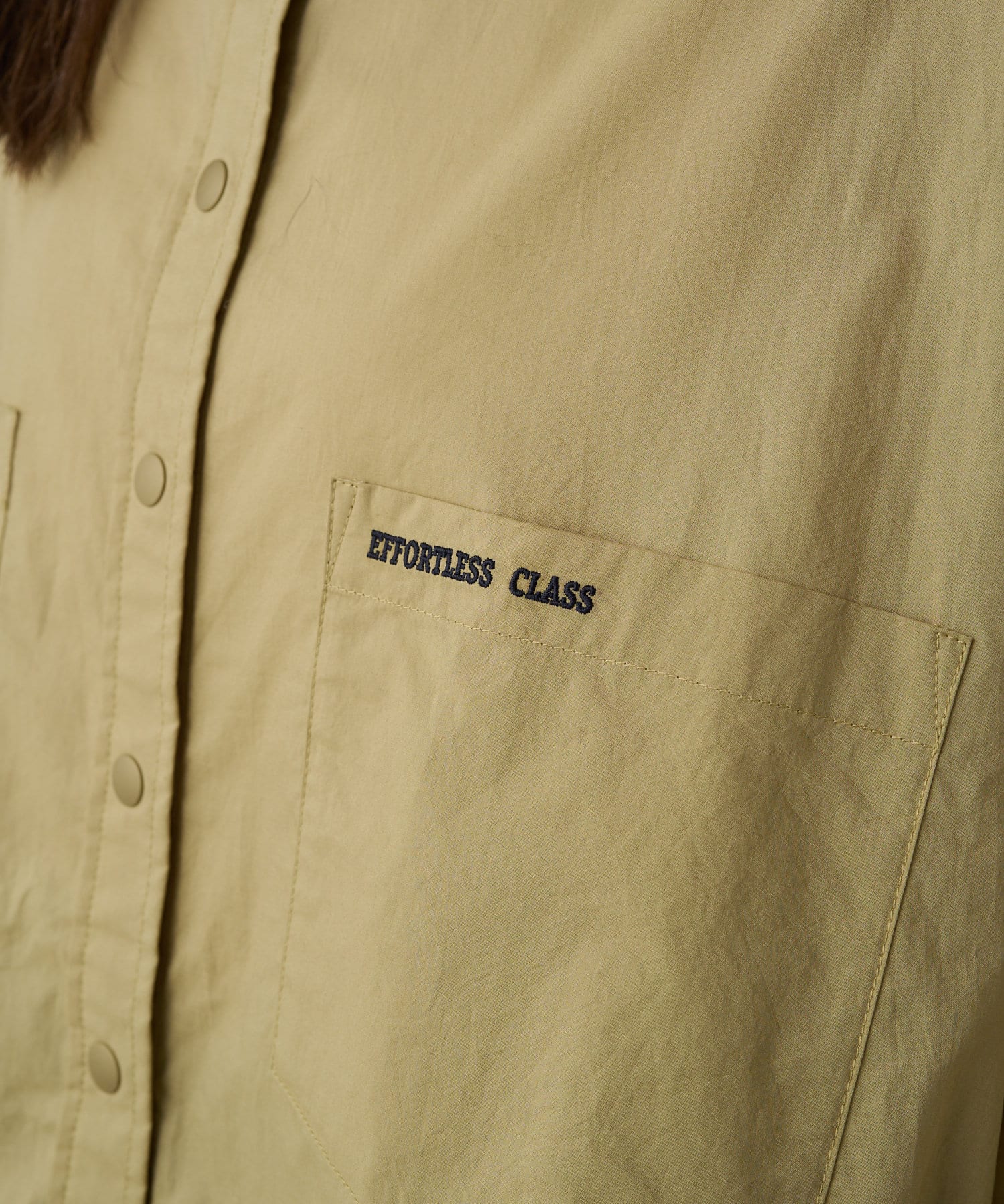 胸元のパッチポケットとロゴ刺繍がミリタリーテイストなアクセントをプラス。