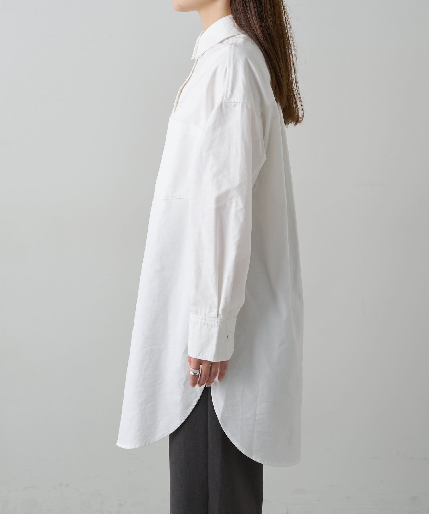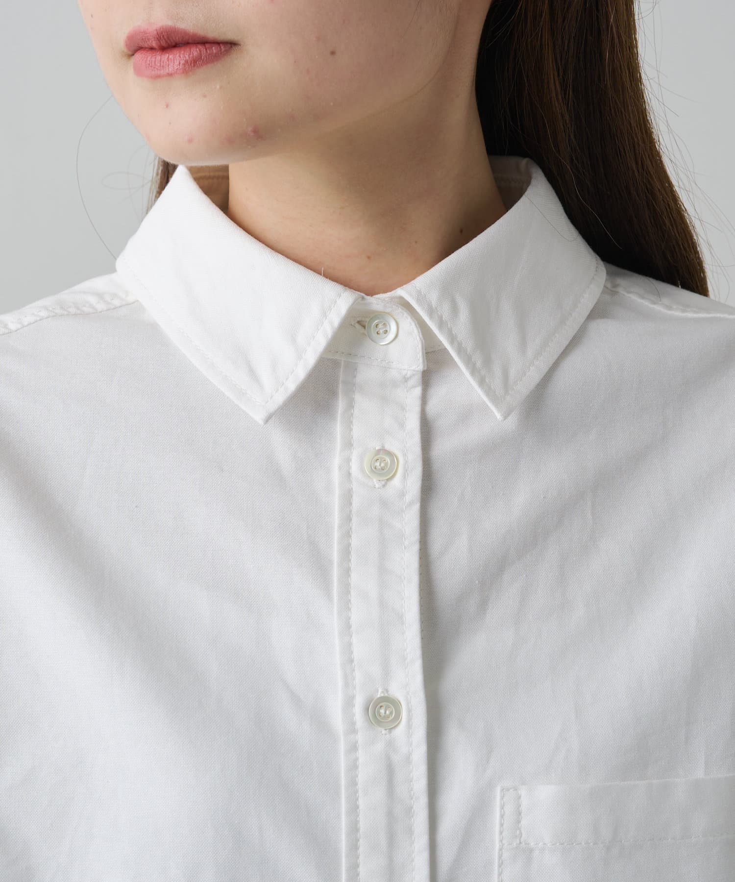 トラッドな雰囲気のベーシックなシャツを、旬のバランスに落とし込みました。